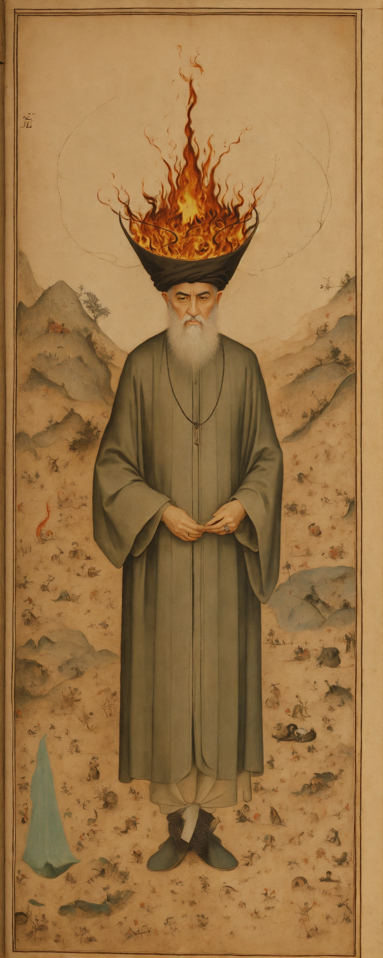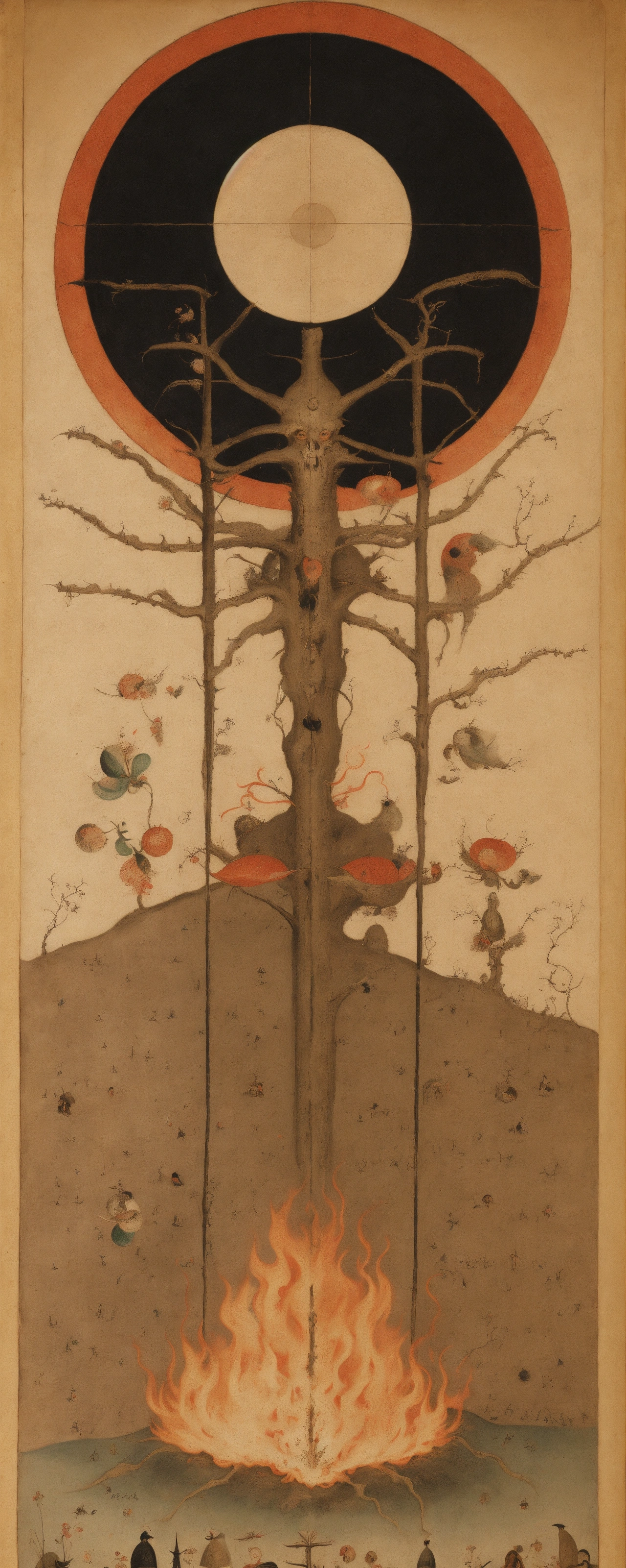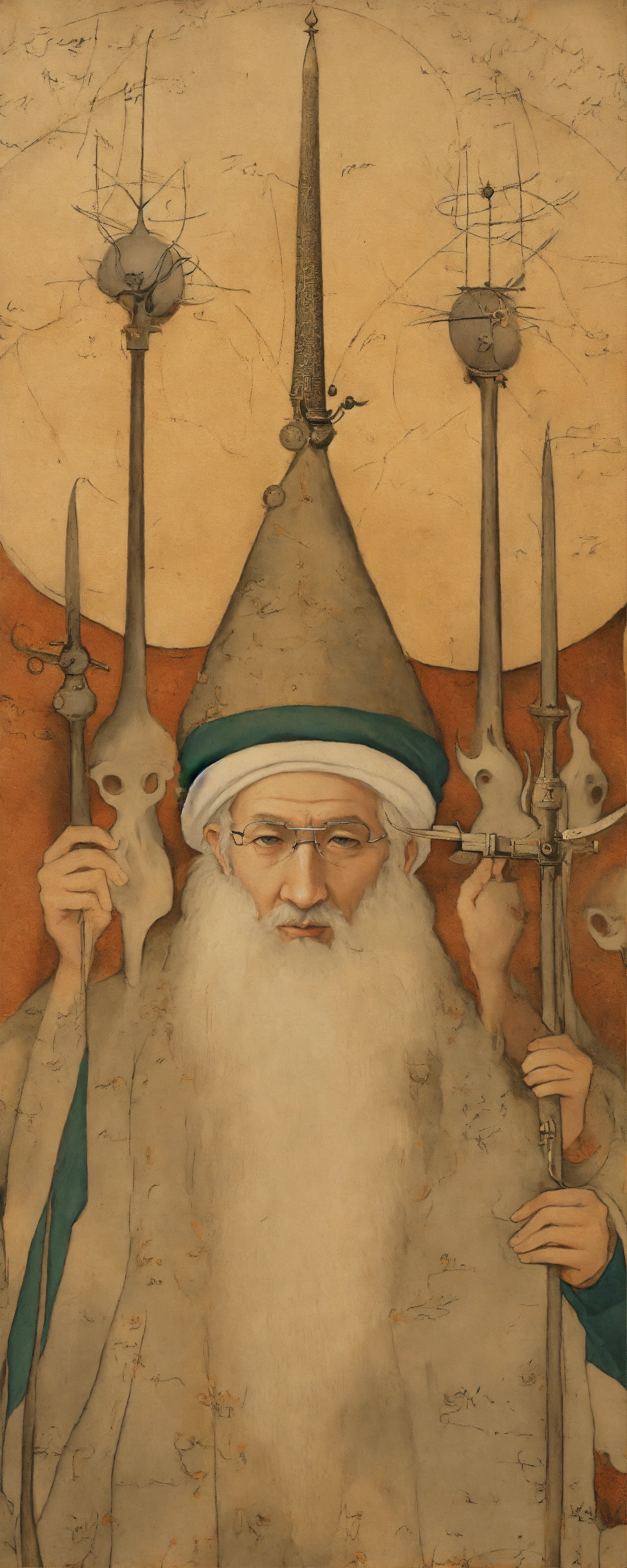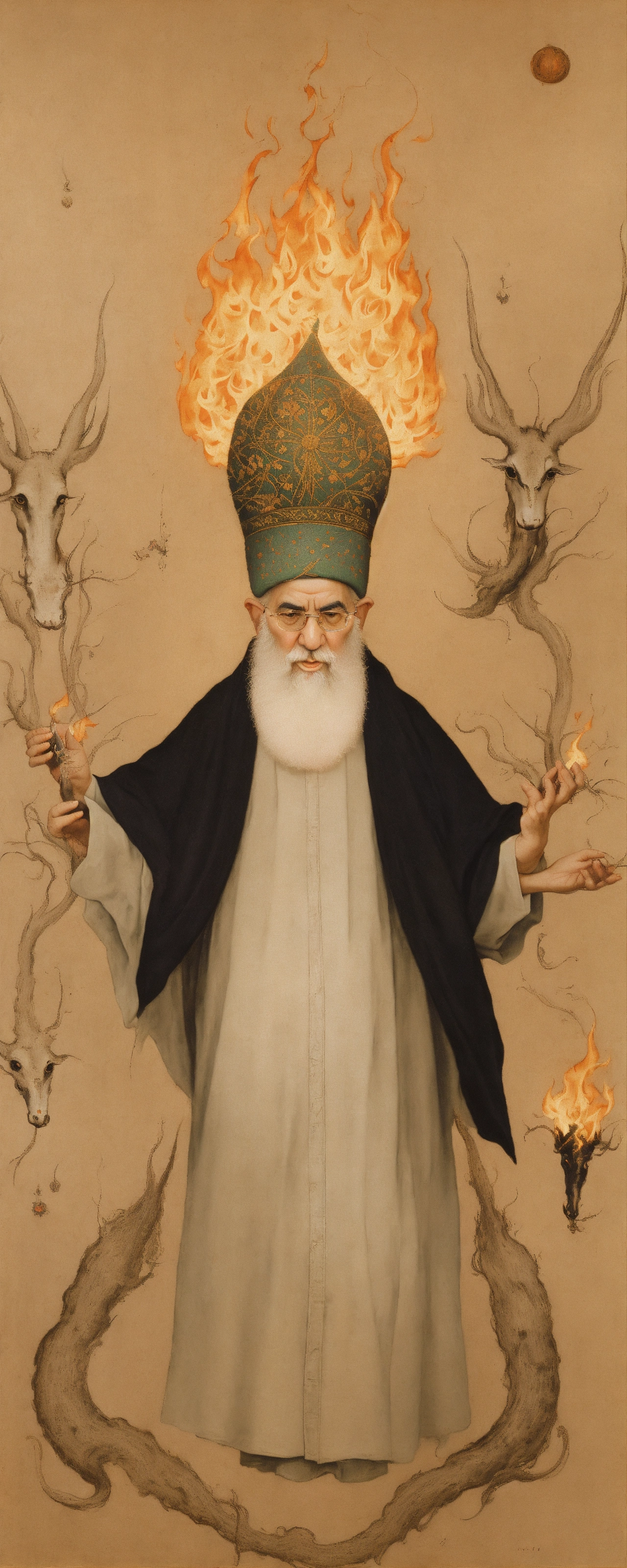 "a closeup portrait of scary ayatollah khamenei has seven hands and he's in the dark, hell is putting people on fire in voynich manuscript" by hieronymus bosch, 32k, minimalistic, the minimum object around, quiet and silent colors, on vintage paper"