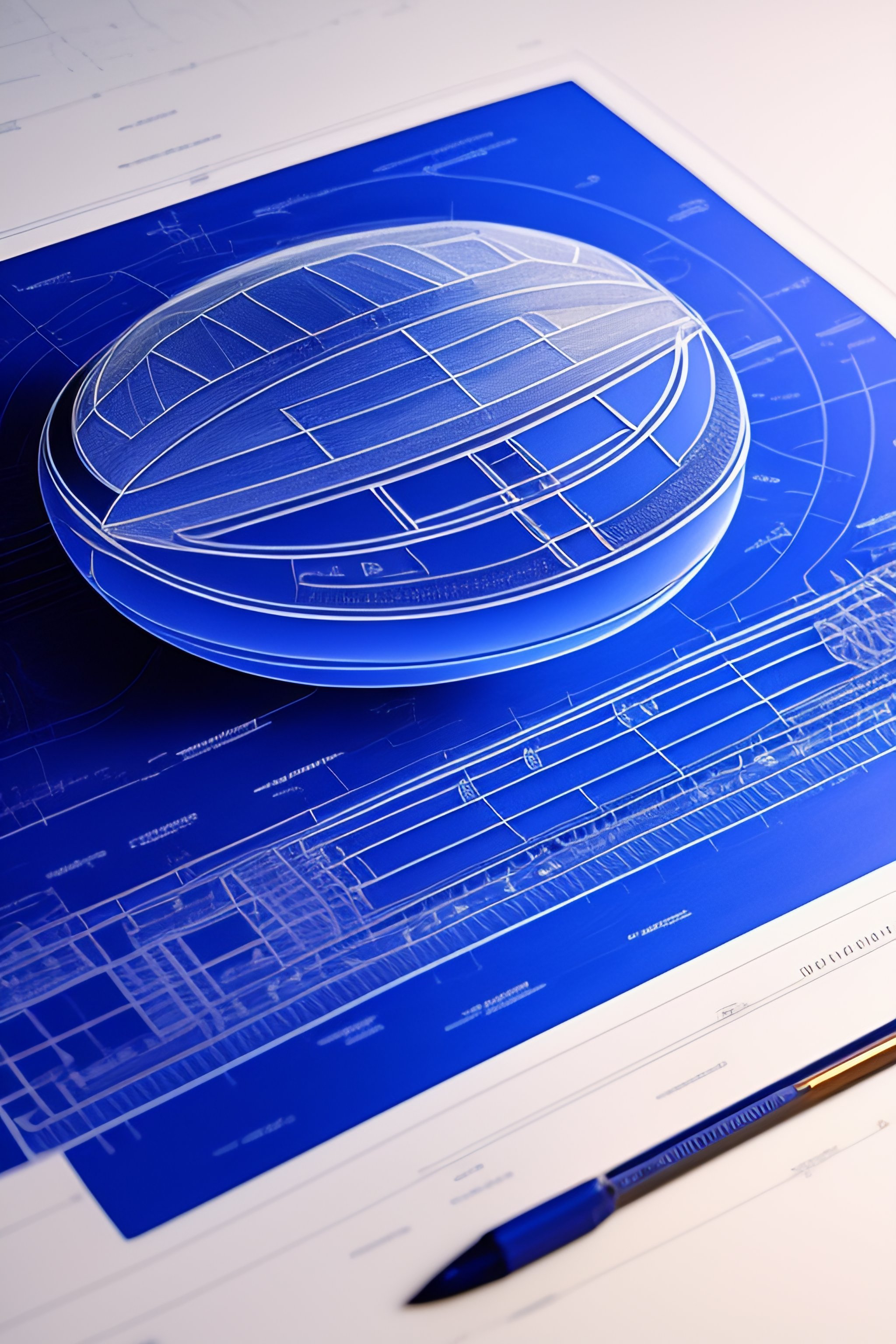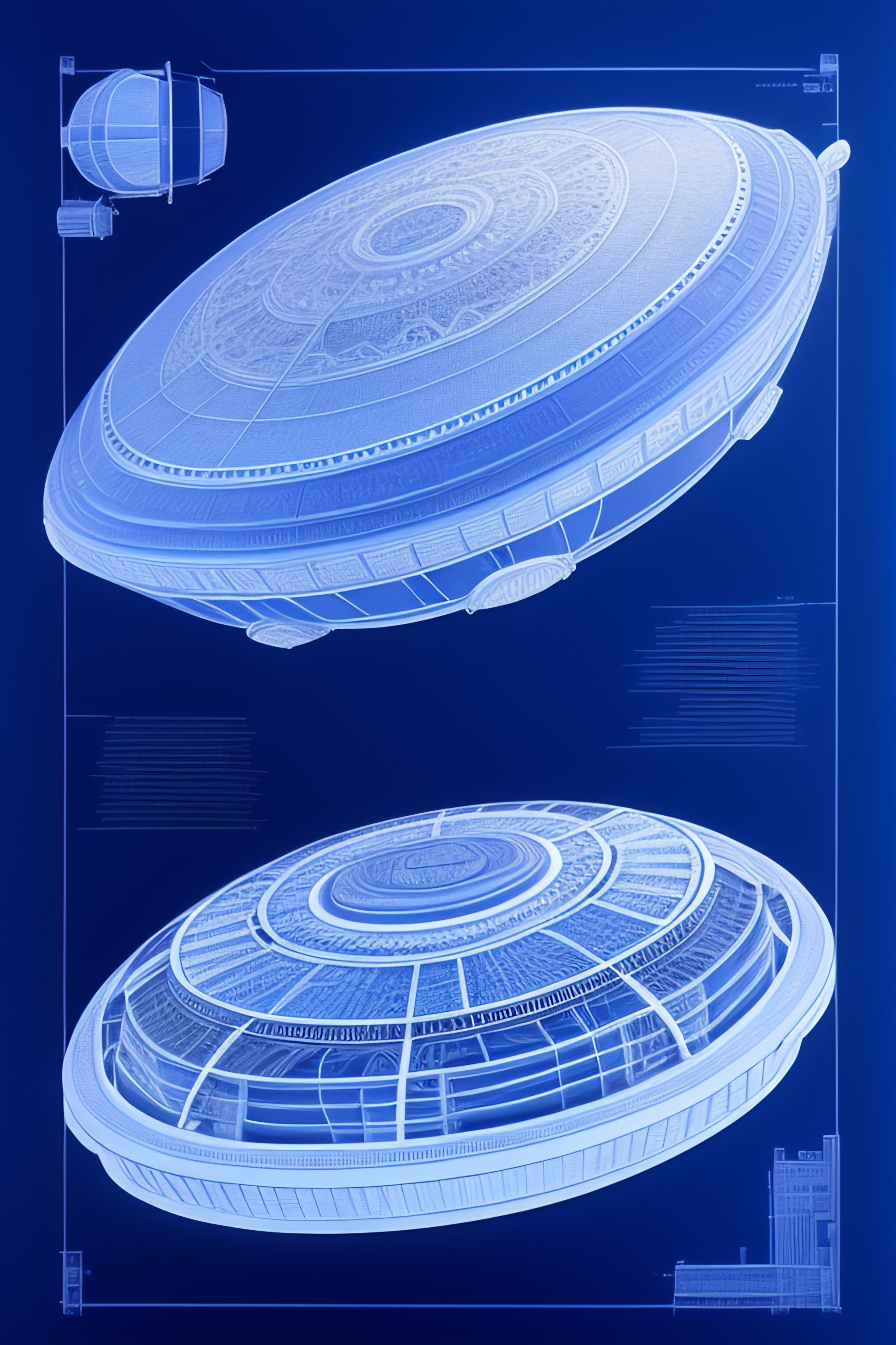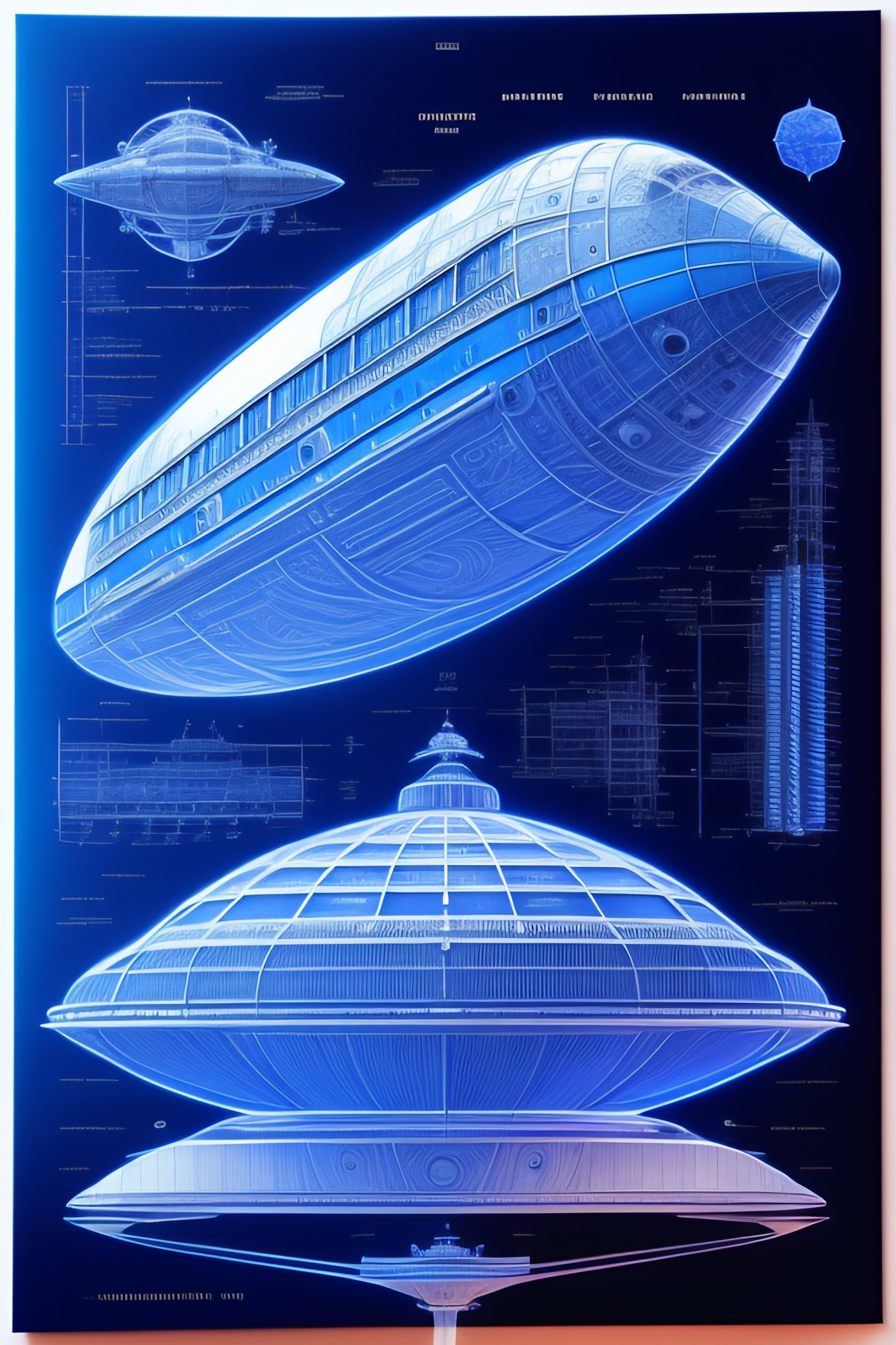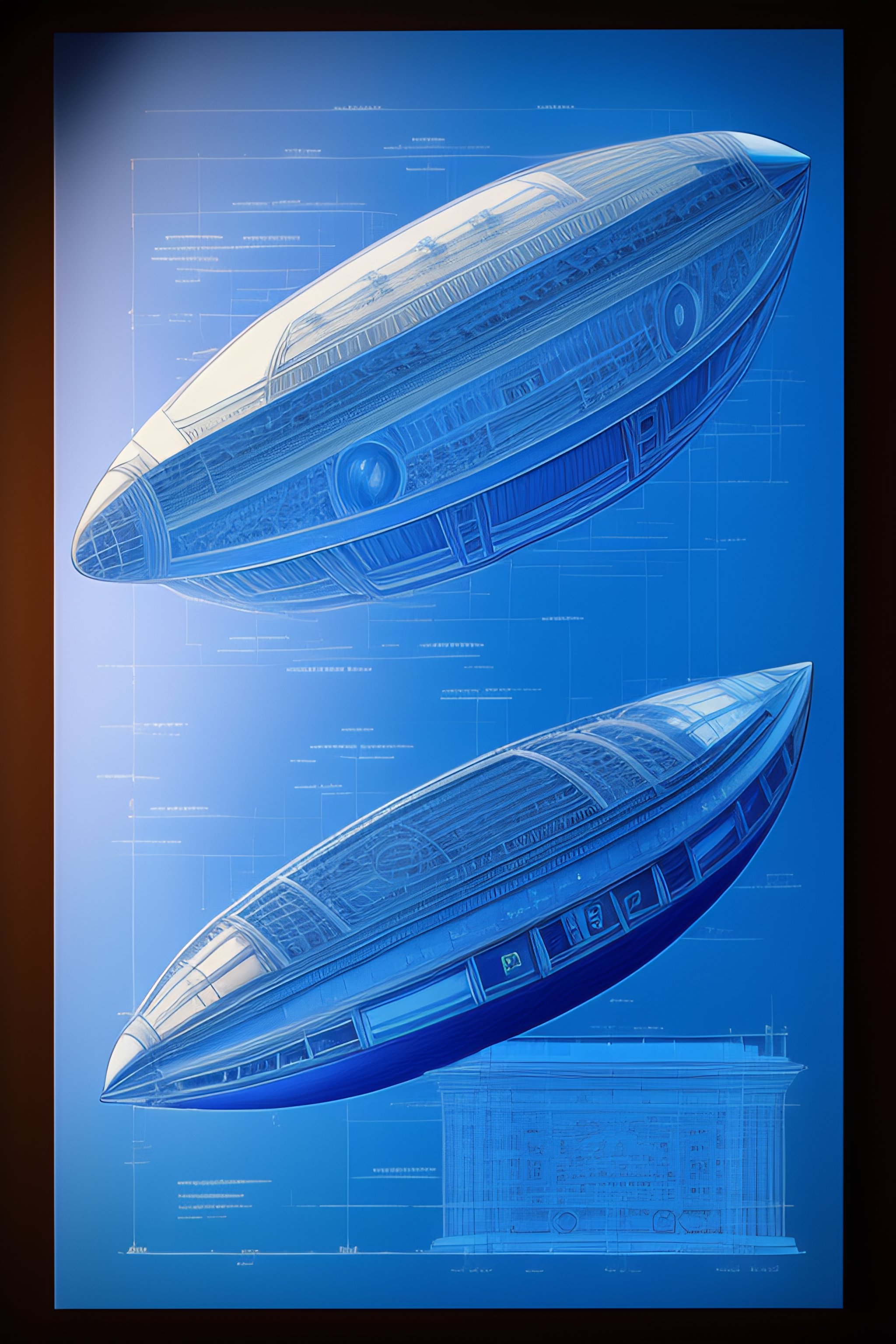 Blueprint of spaceship, technical drawing on blue paper, intricate detail, centered with clean background, studio lighting, 8 k