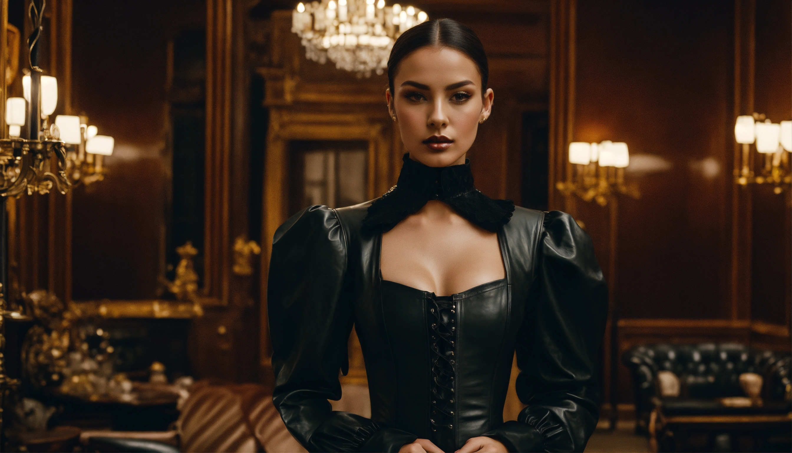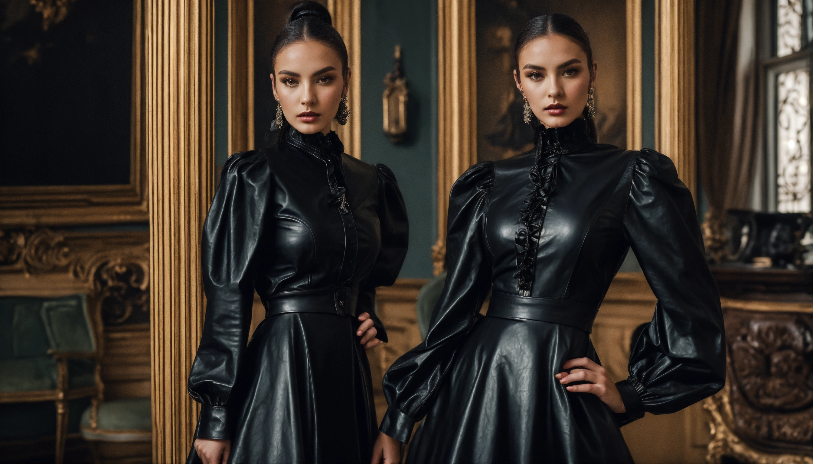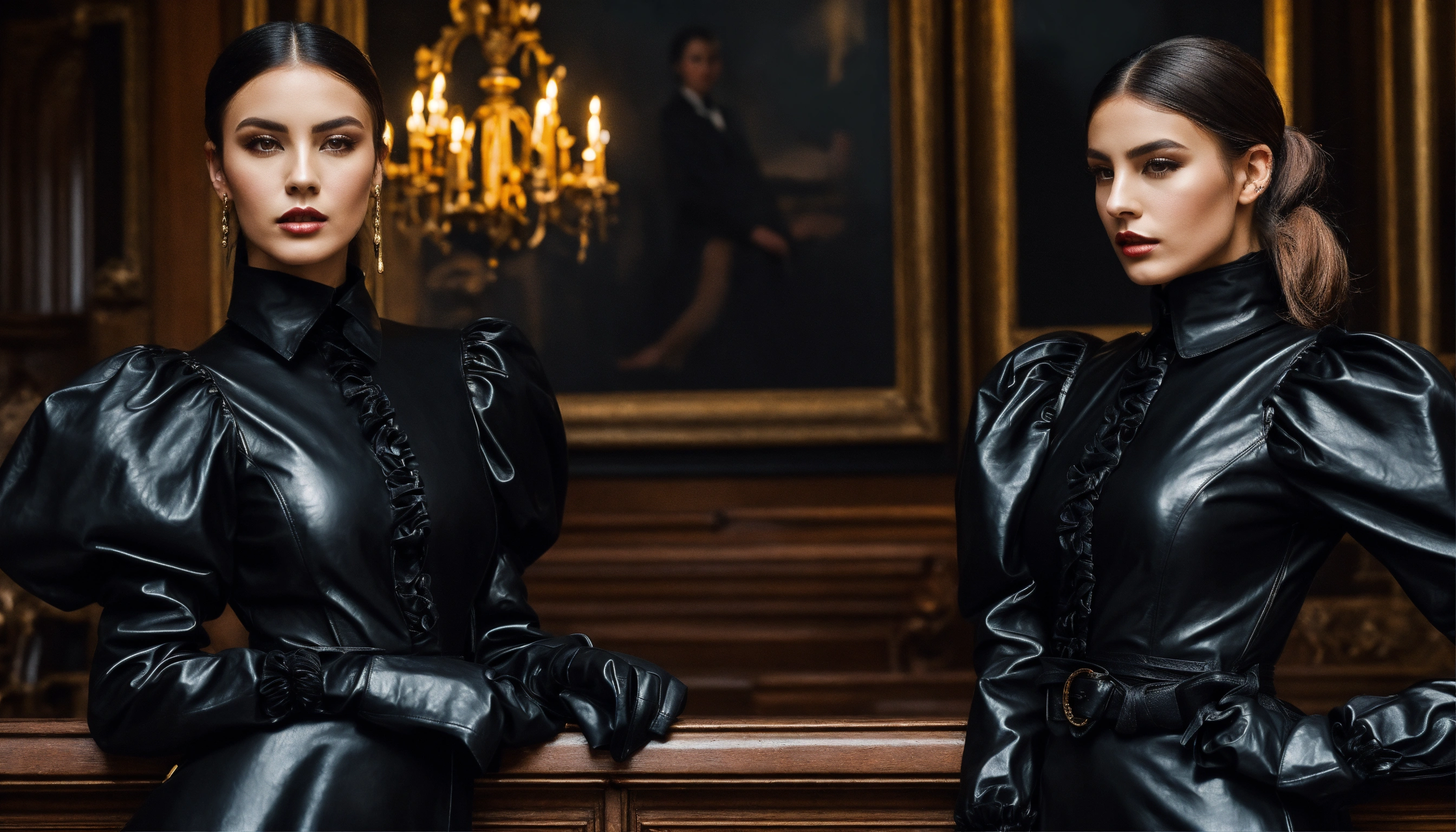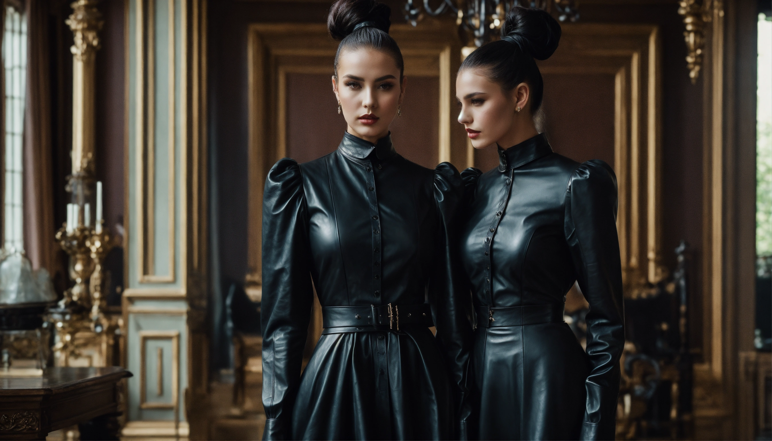 Two stunning arrogant seductress women fashion model, strict victorian black leather governess shirt dress big long puff sleeves, leather shirt collar, black straight high ponytail, mansion room