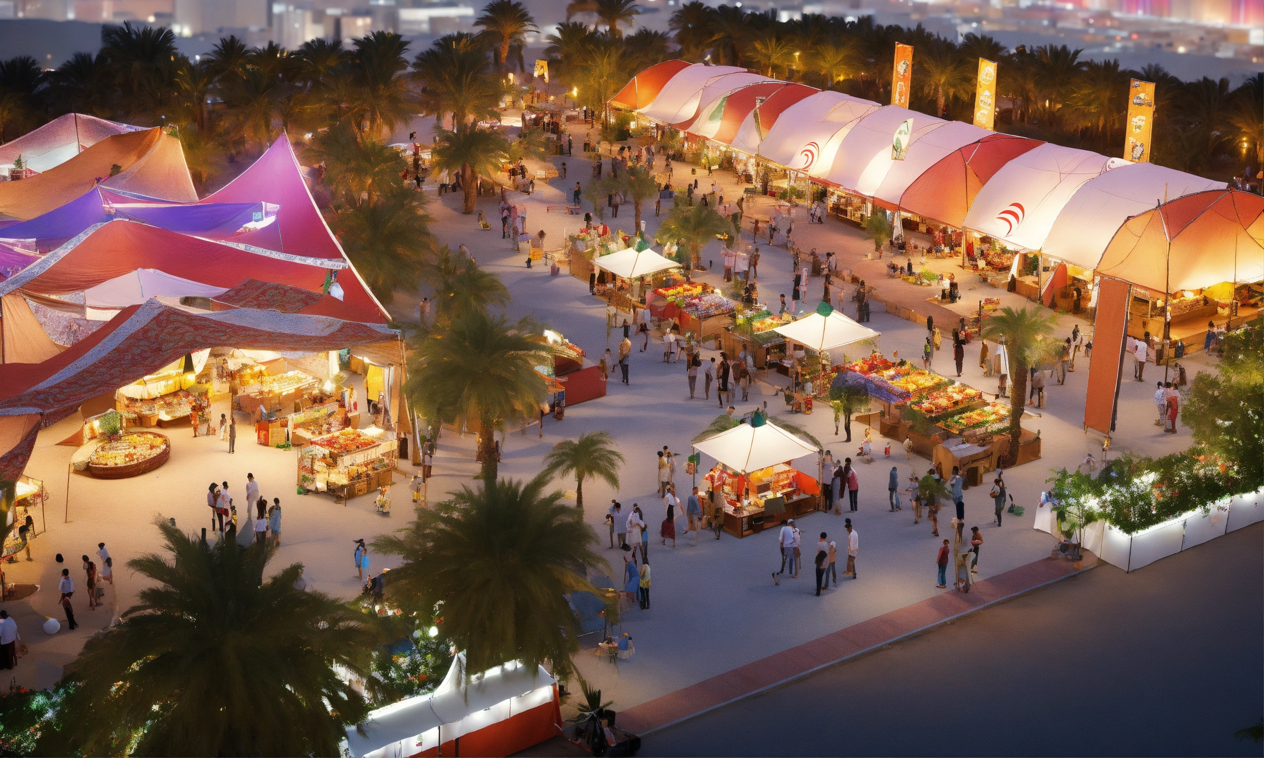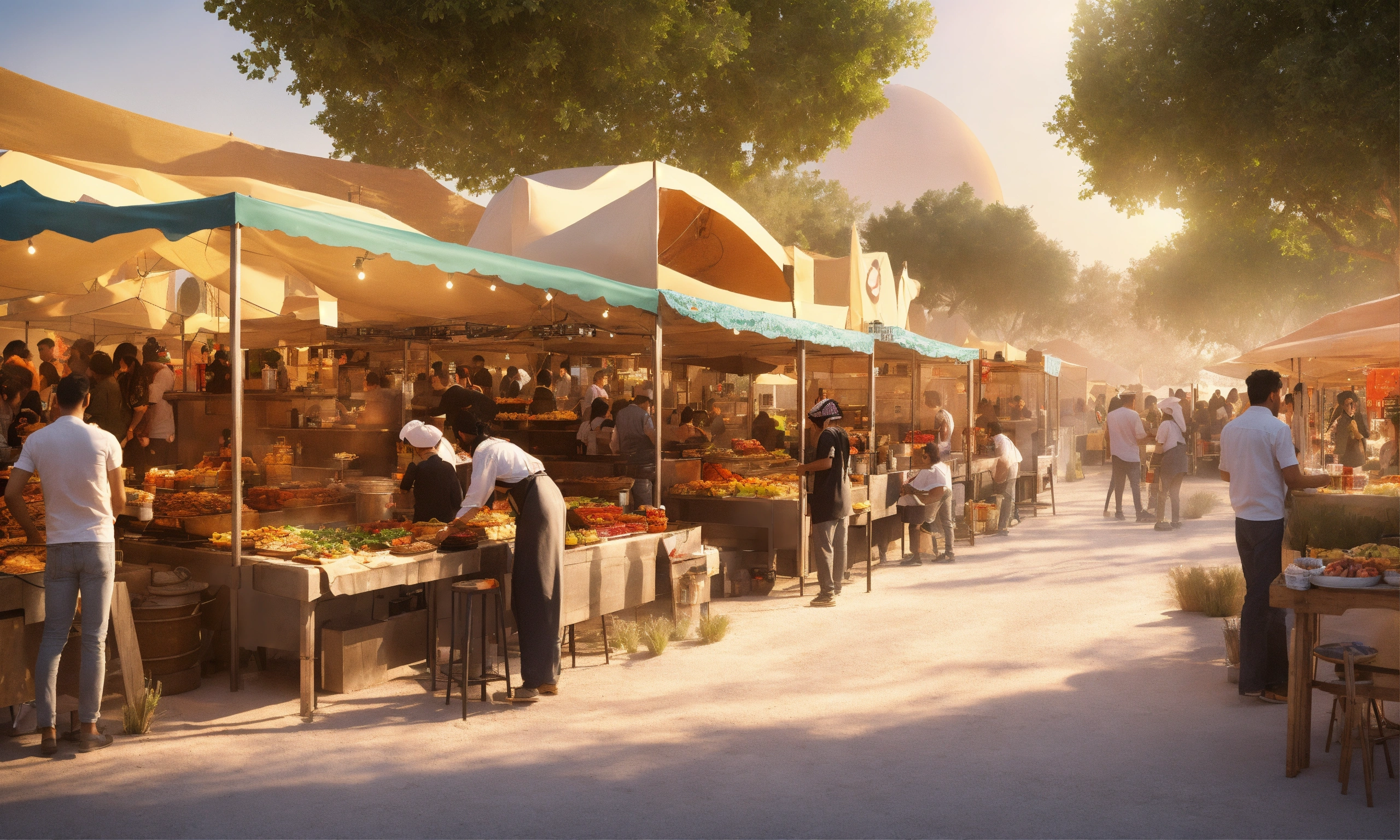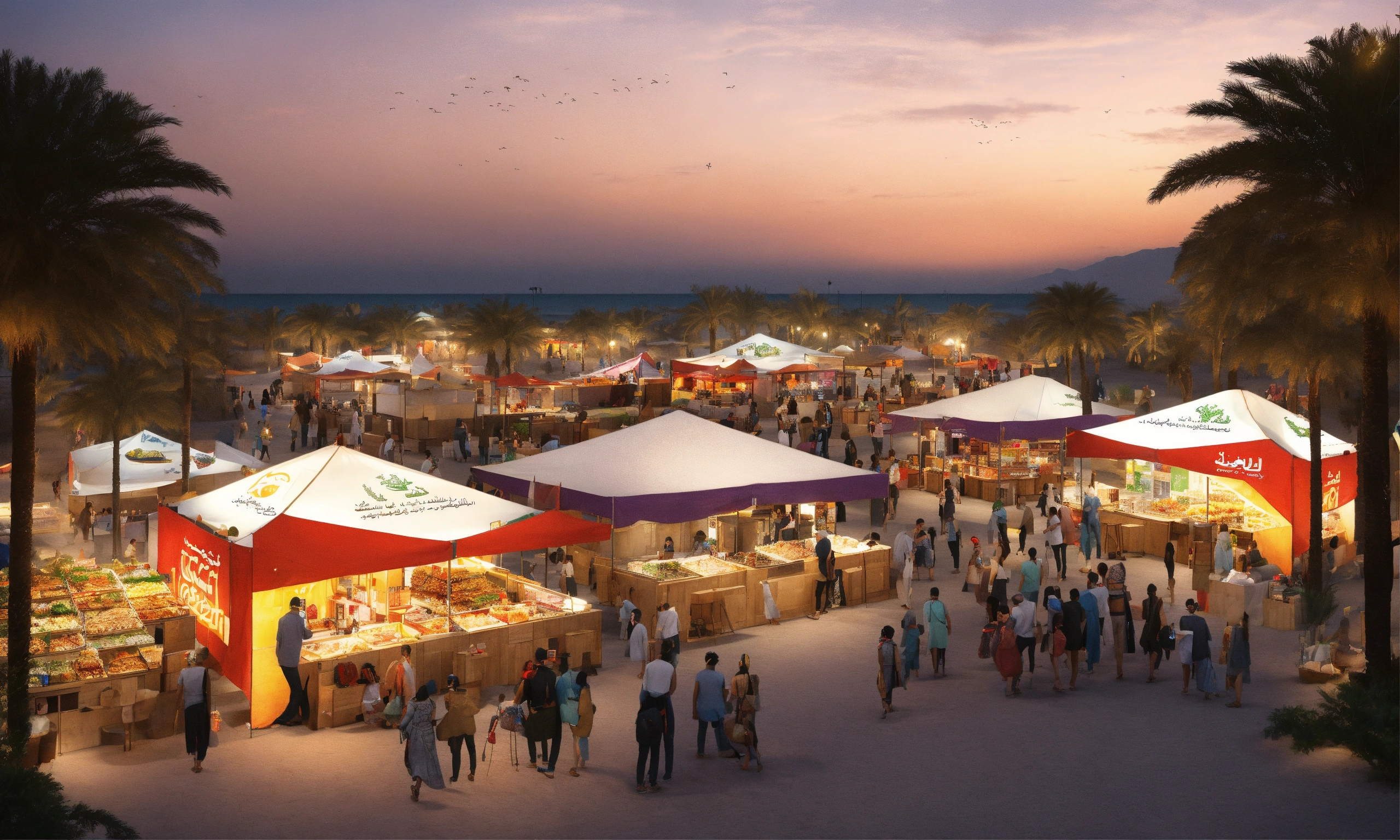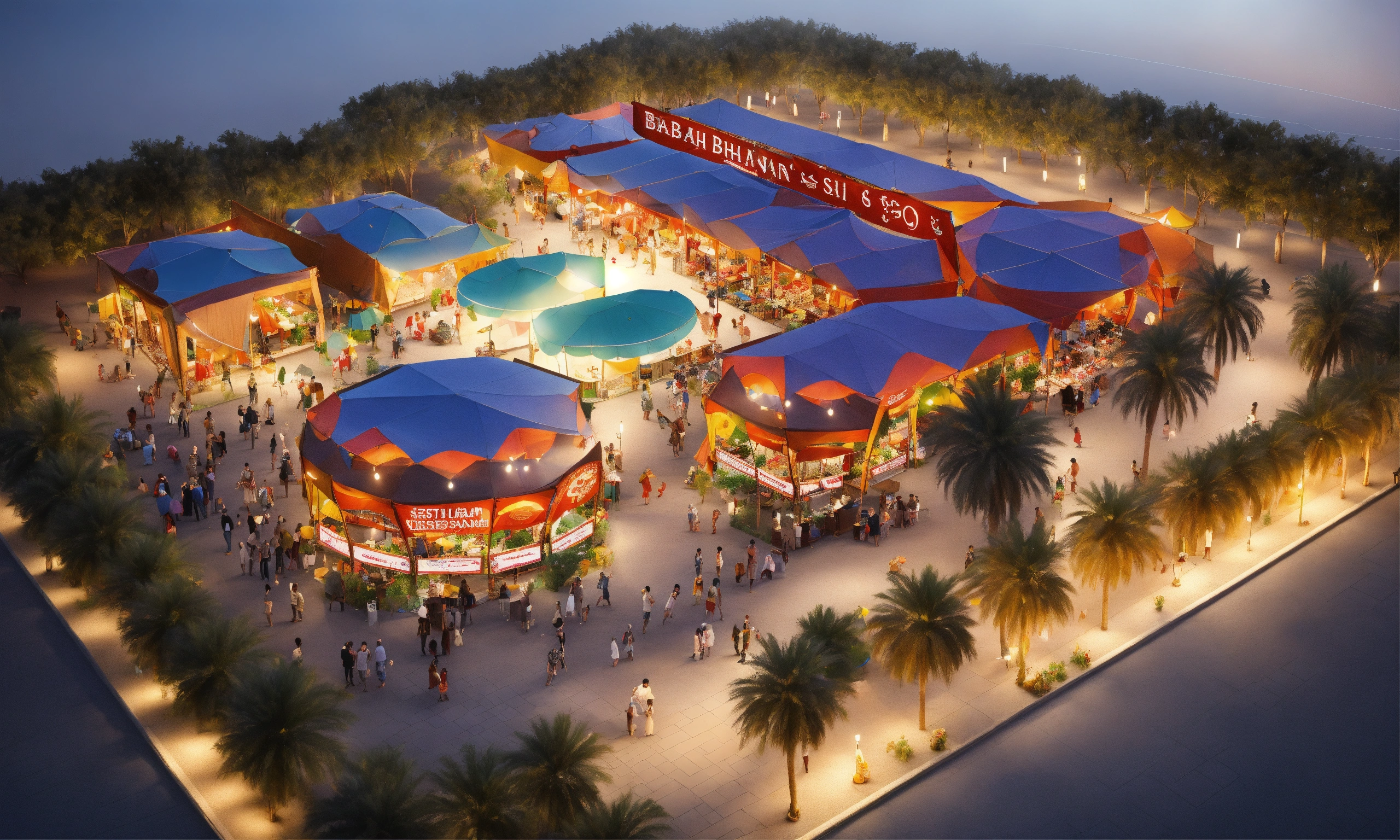 Produce a comprehensive floor plan image for the 'bahrain oasis street food festival a culinary and cultural journey.' desert environment, this plan should feature key elements such as the layout of traditional bahraini street food stalls, tent-shaped food kiosks, the main stage, kids' area, entrance arch, and the themed wayfinding system, providing an overall visual representation of the festival's design and organization.