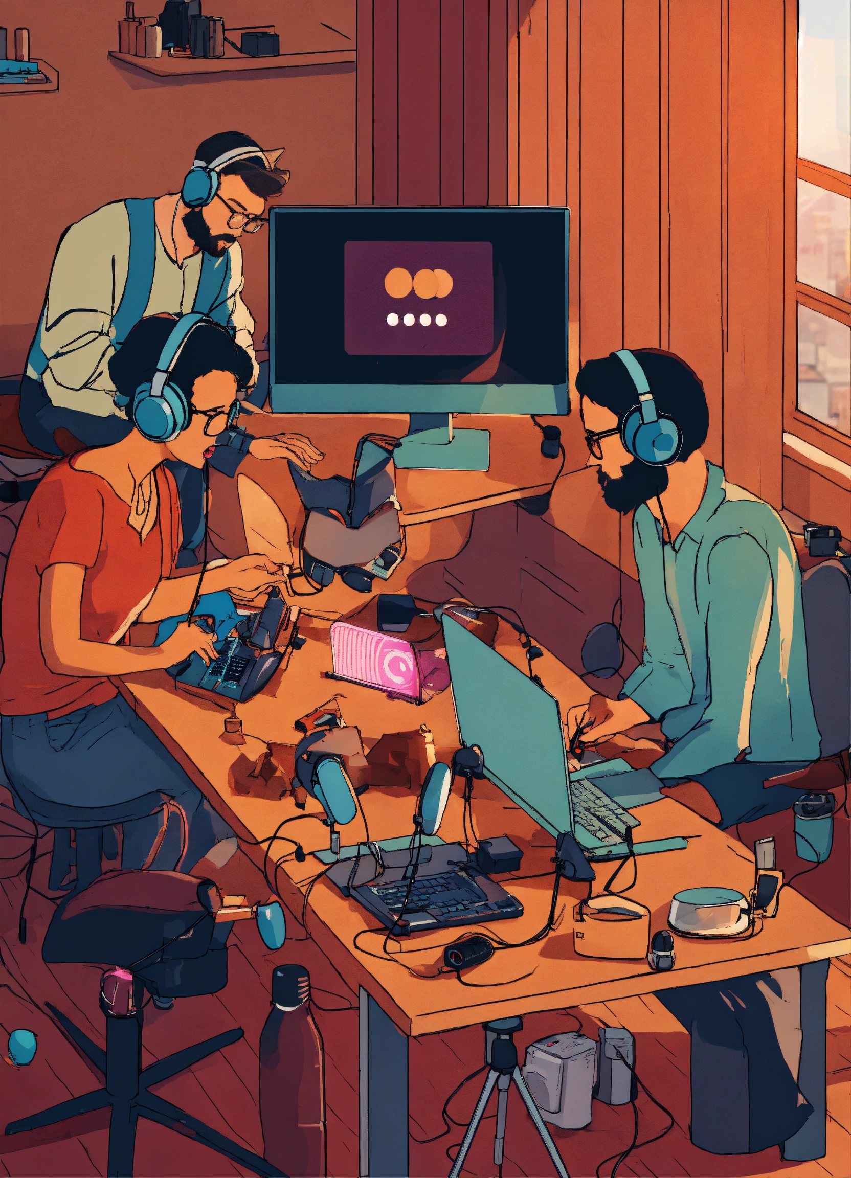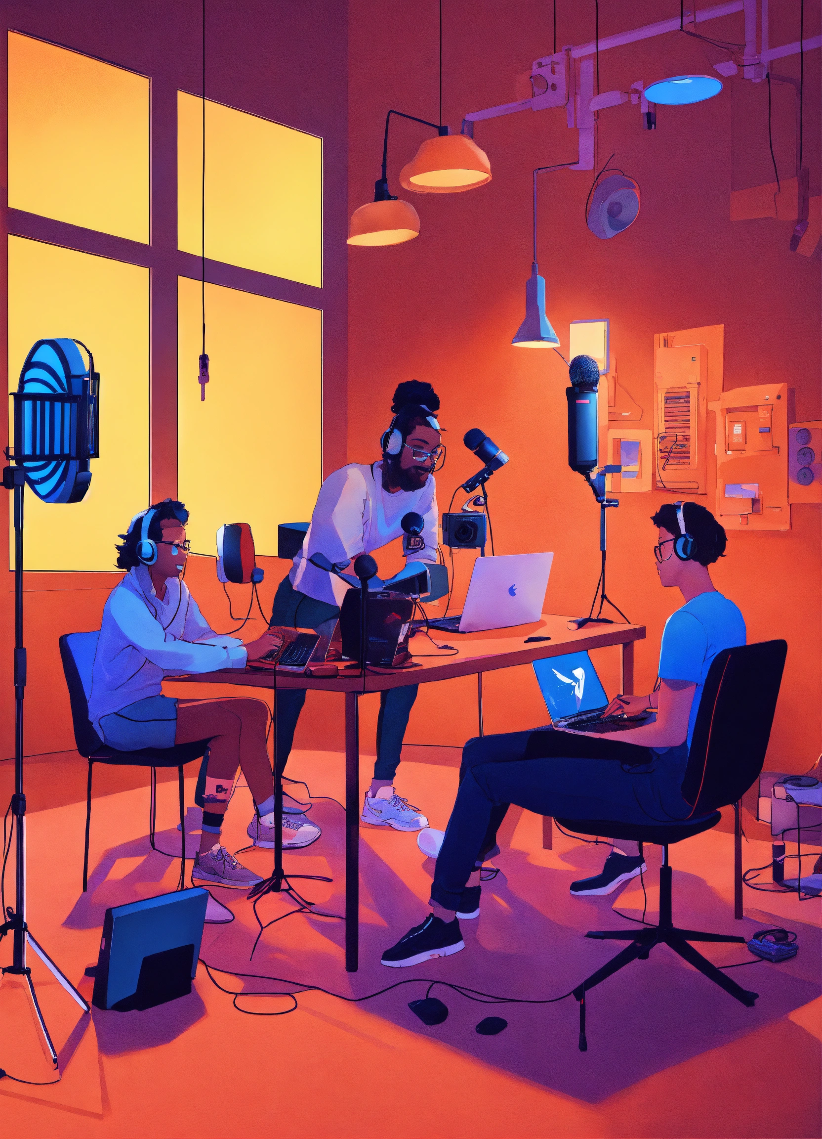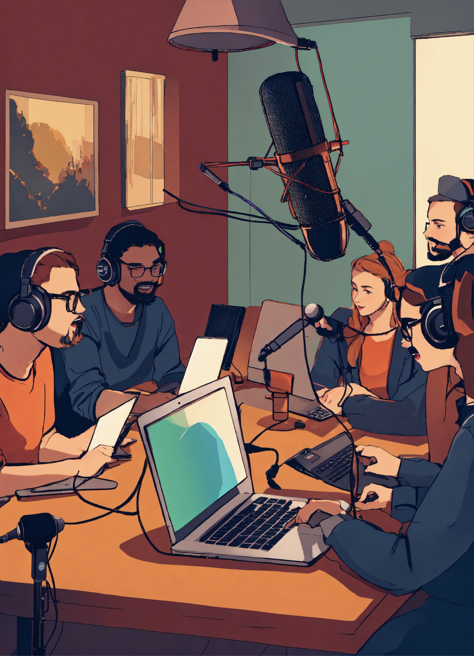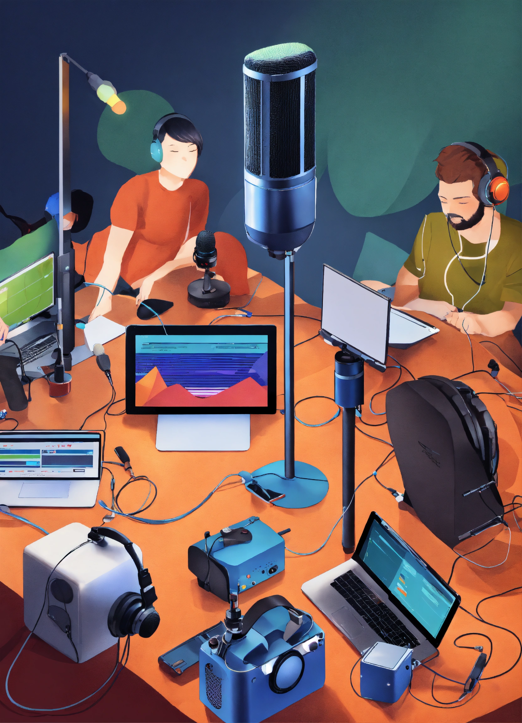 A group of people making a podcast. with podcasting equipment, microphone, laptops and recording equipment.
