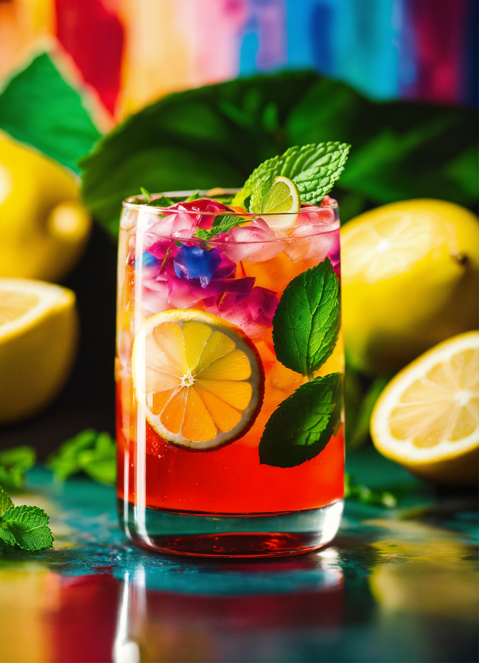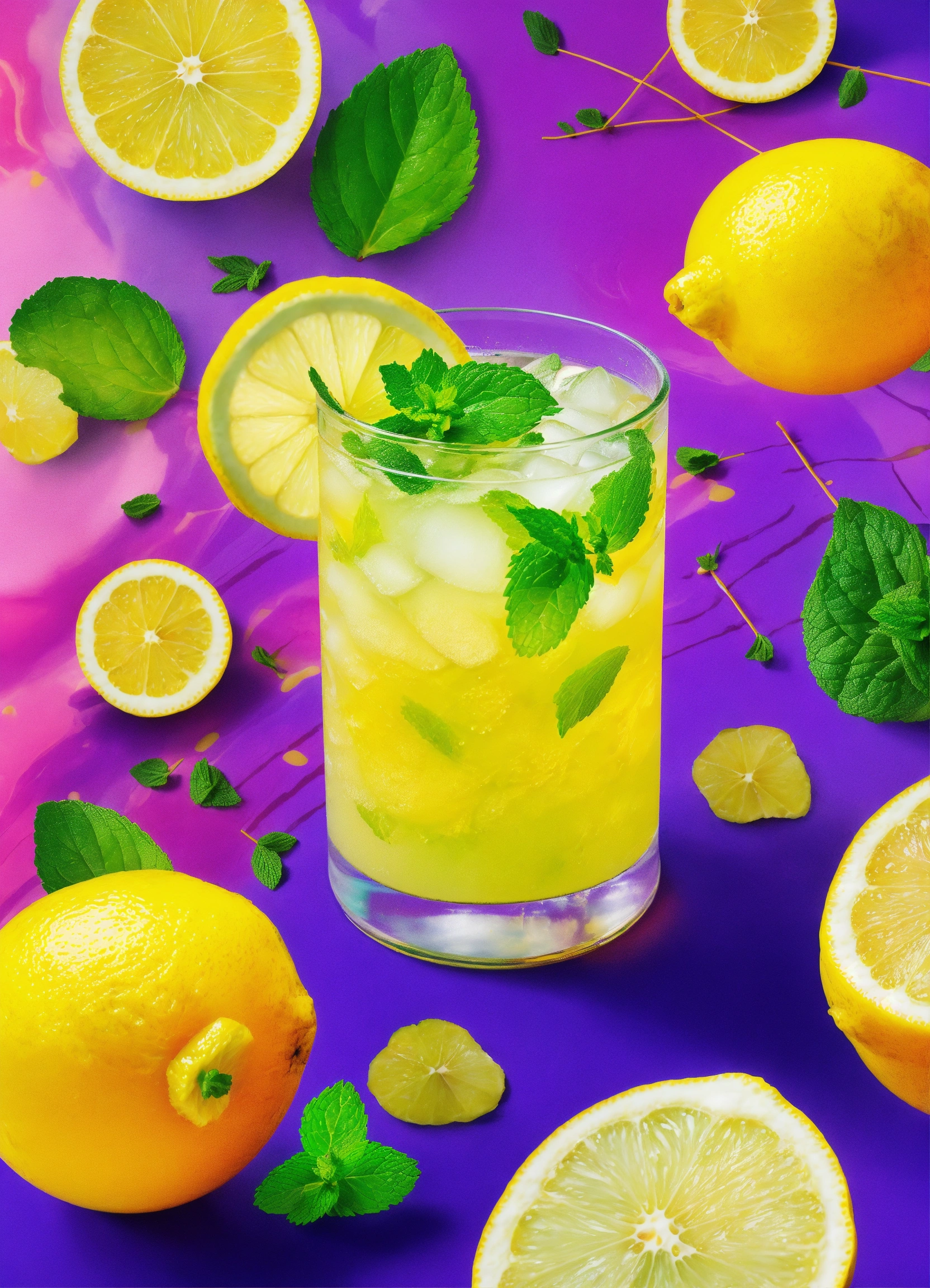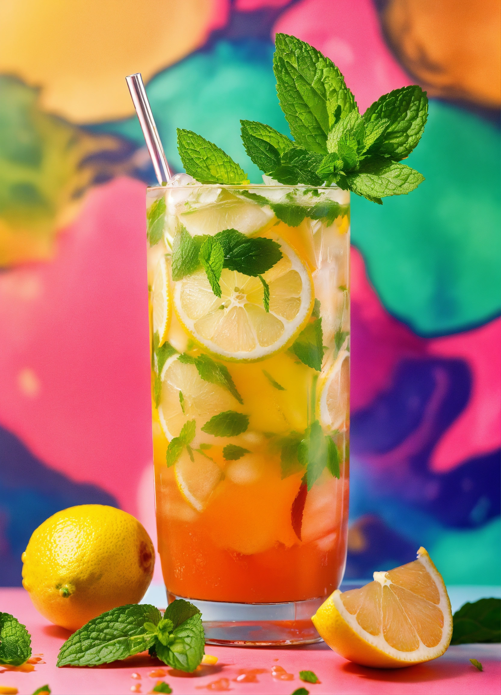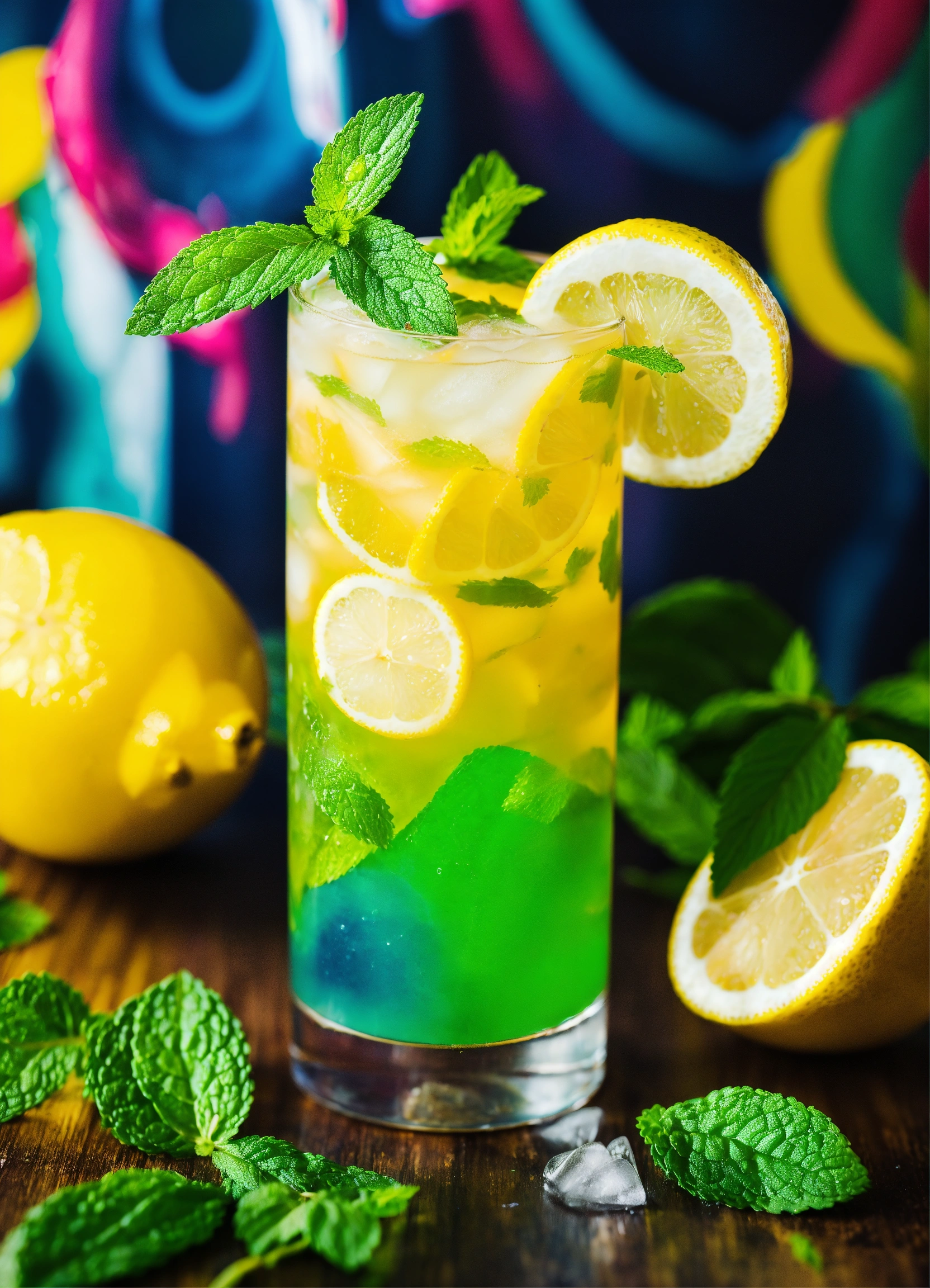 A photo of a colorful lemon mocktail can with mint leaves with an abstract background,