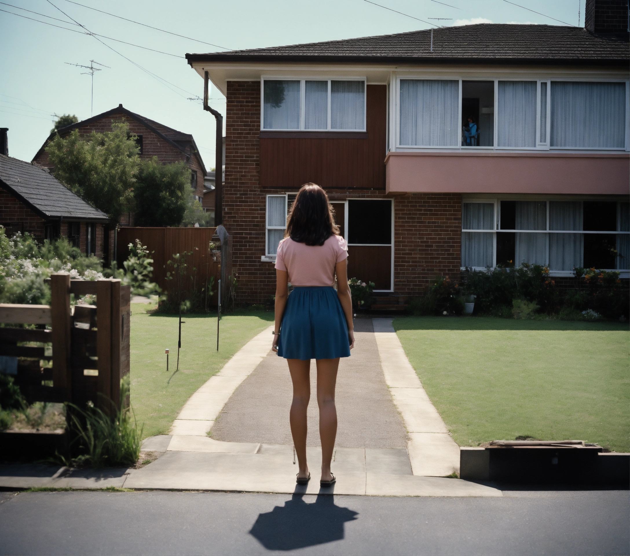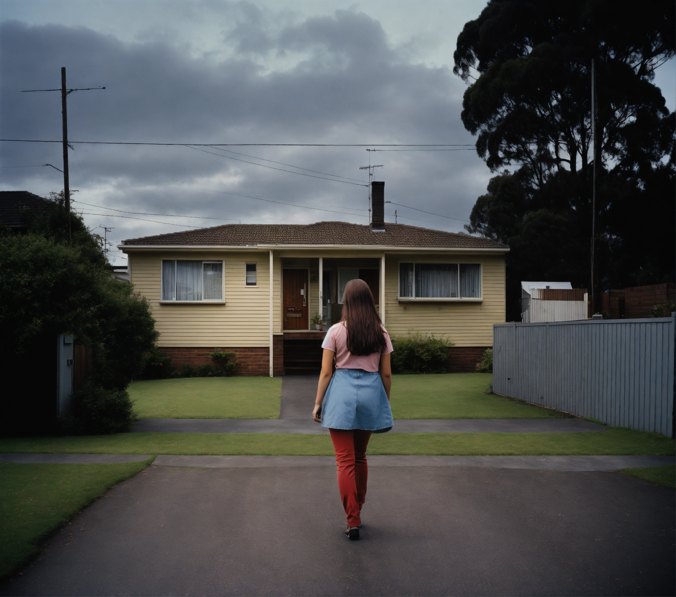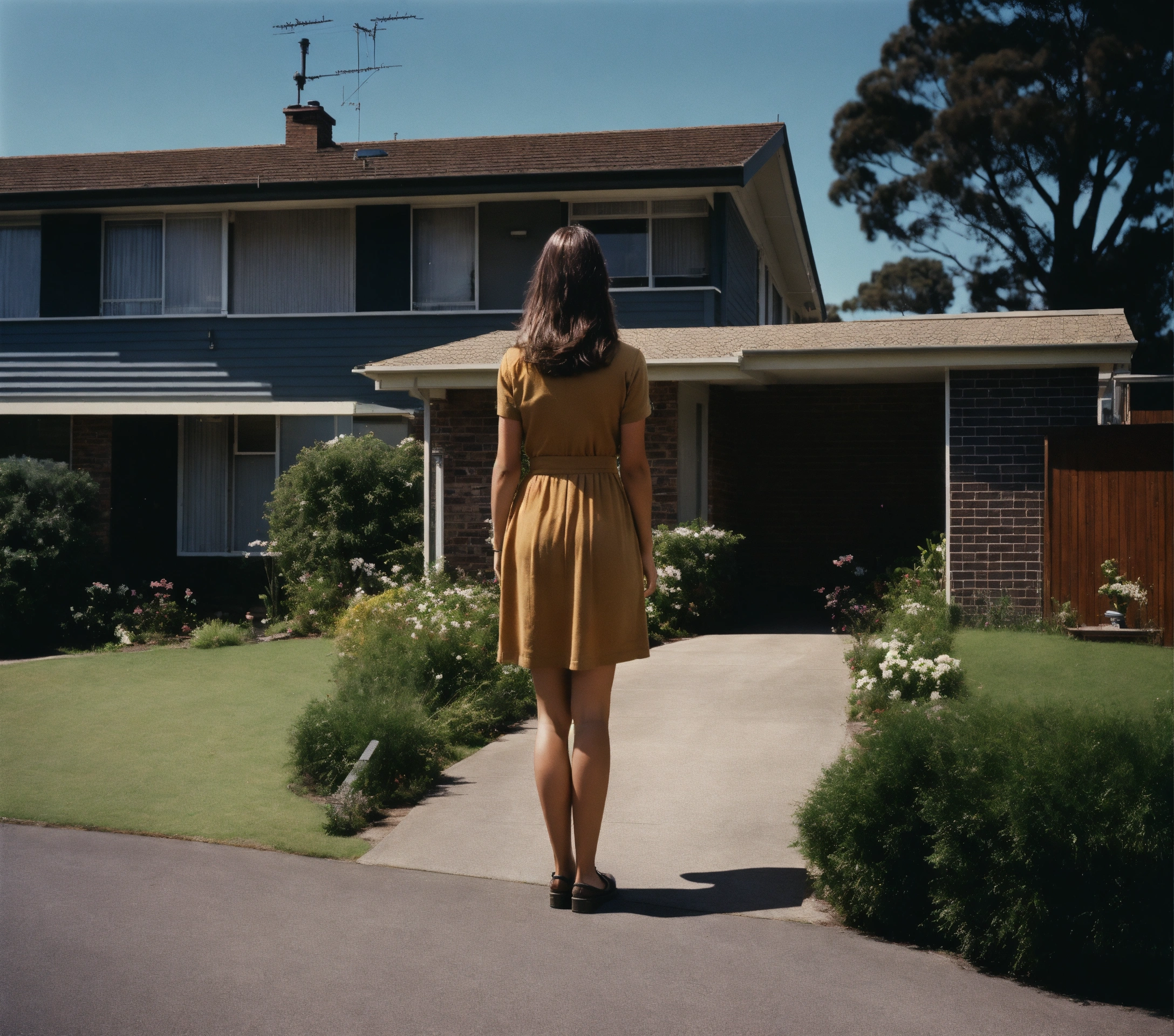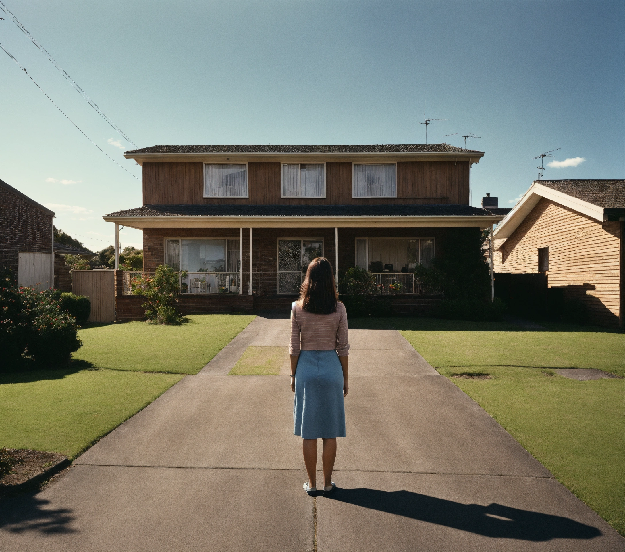 A photograph of a woman with long brown hair standing in the driveway in front of a suburban weatherboard 1970s housing commission home, wide format gregory crewdson style image and colour grading, rear view of woman, the sky is visible above the home