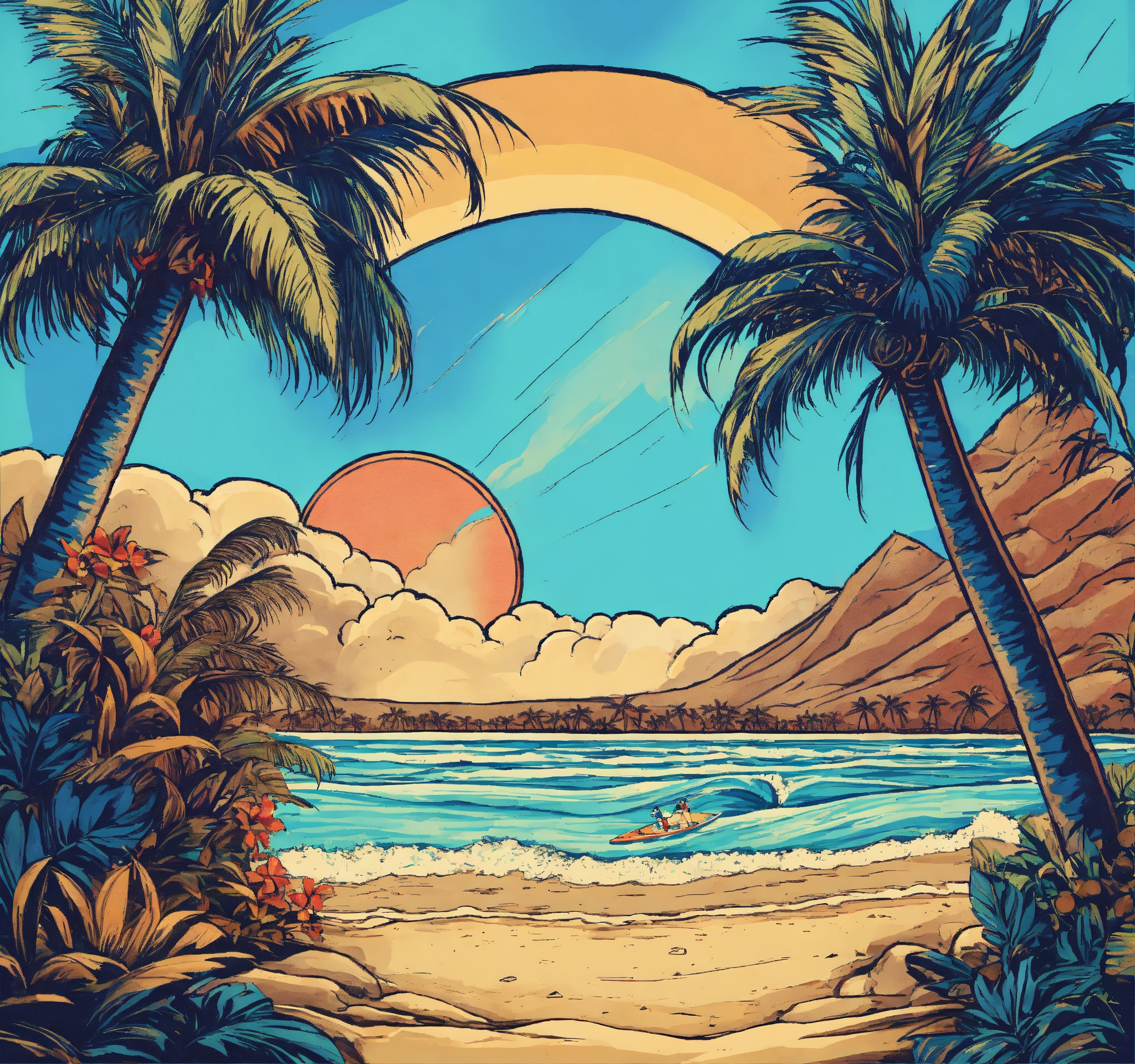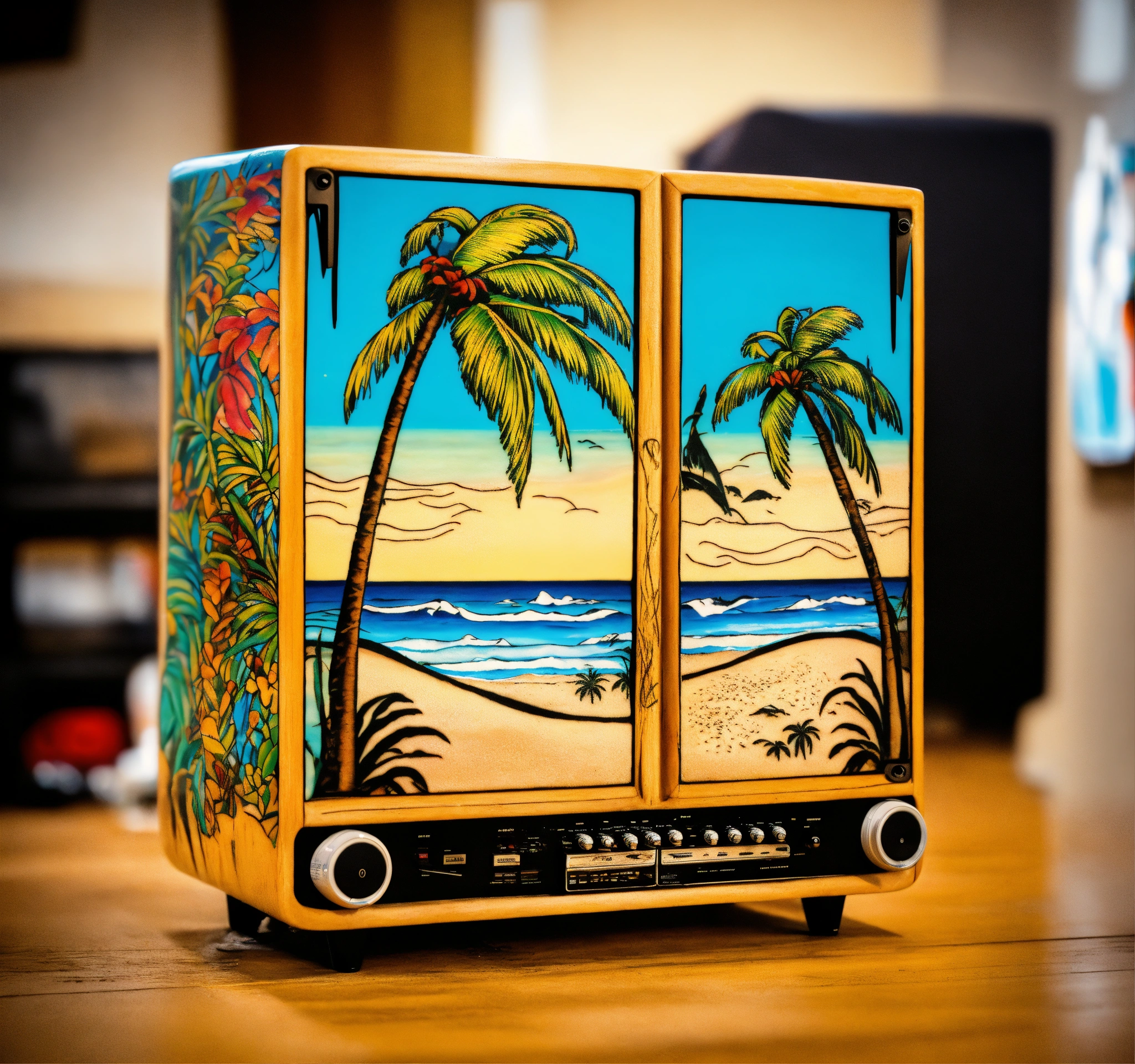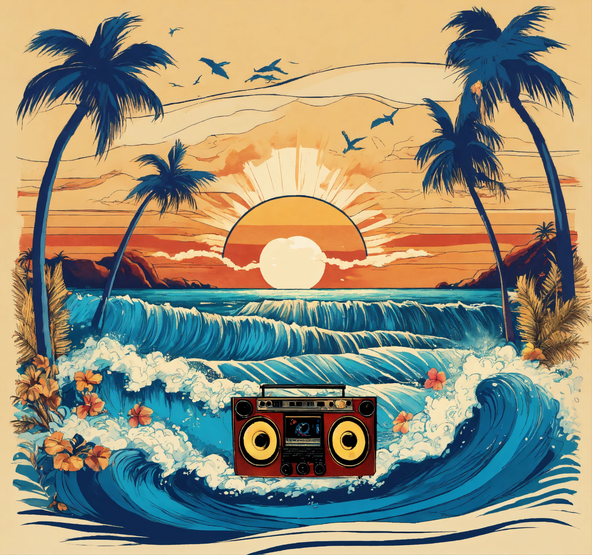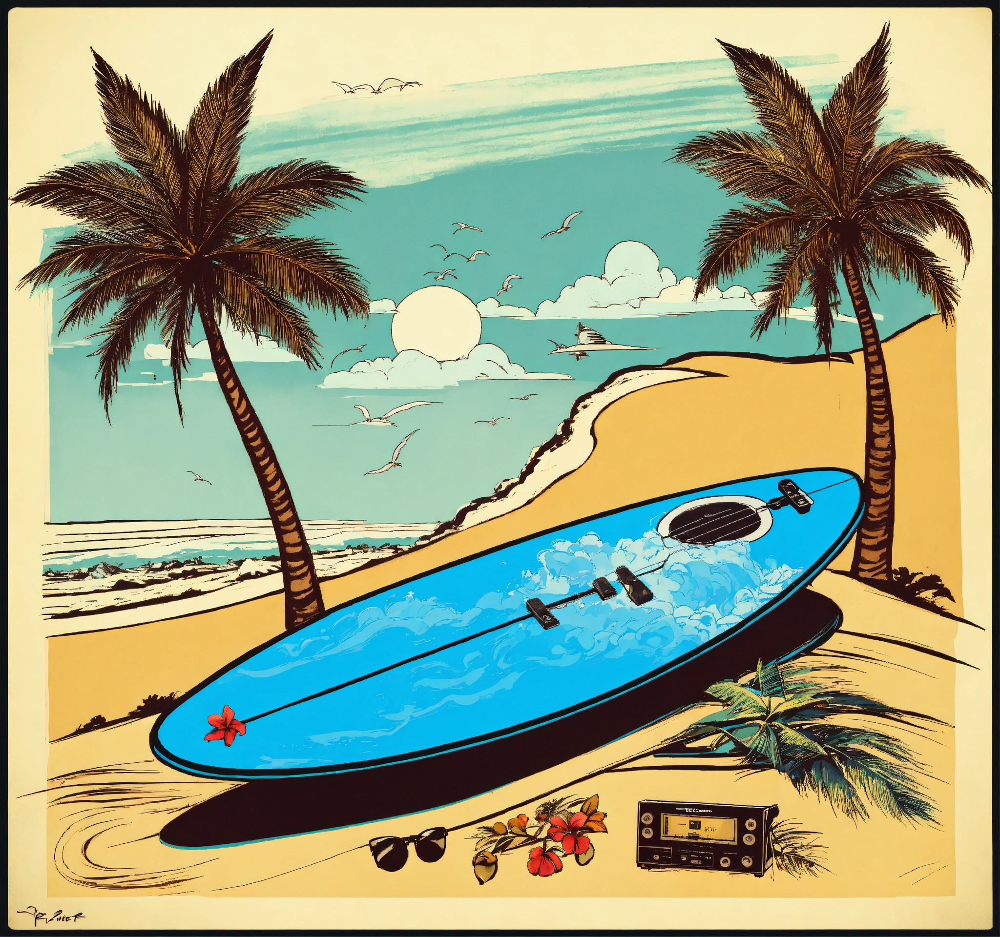 A tropical beach seen. flipflop surfboards in the sand. ocean waves, blue skies, palmtrees, and a old school stereo in the style of opie ortiz. tattoo art