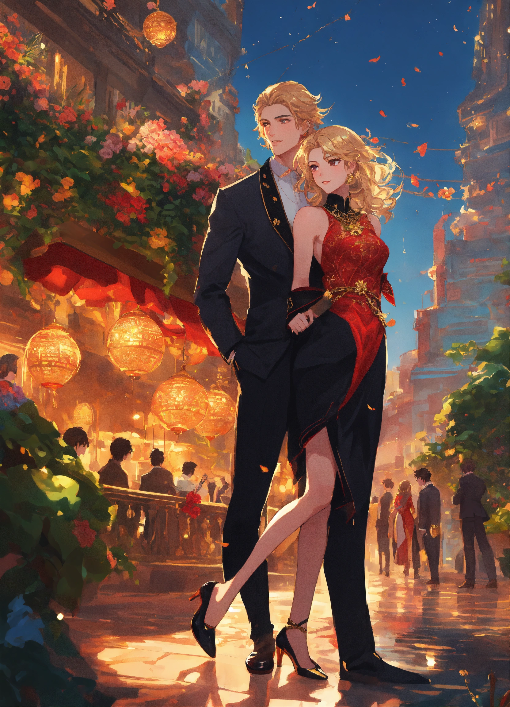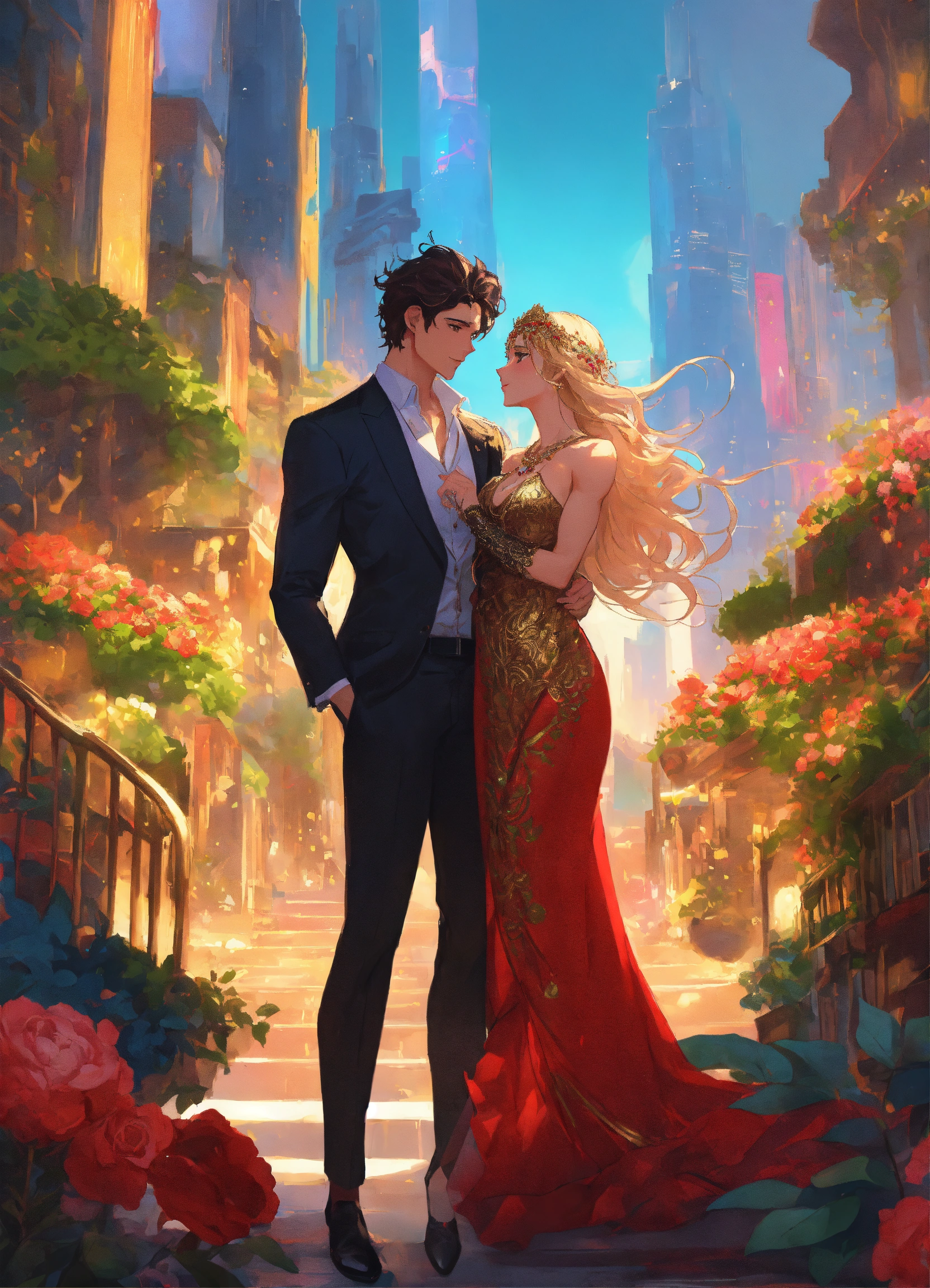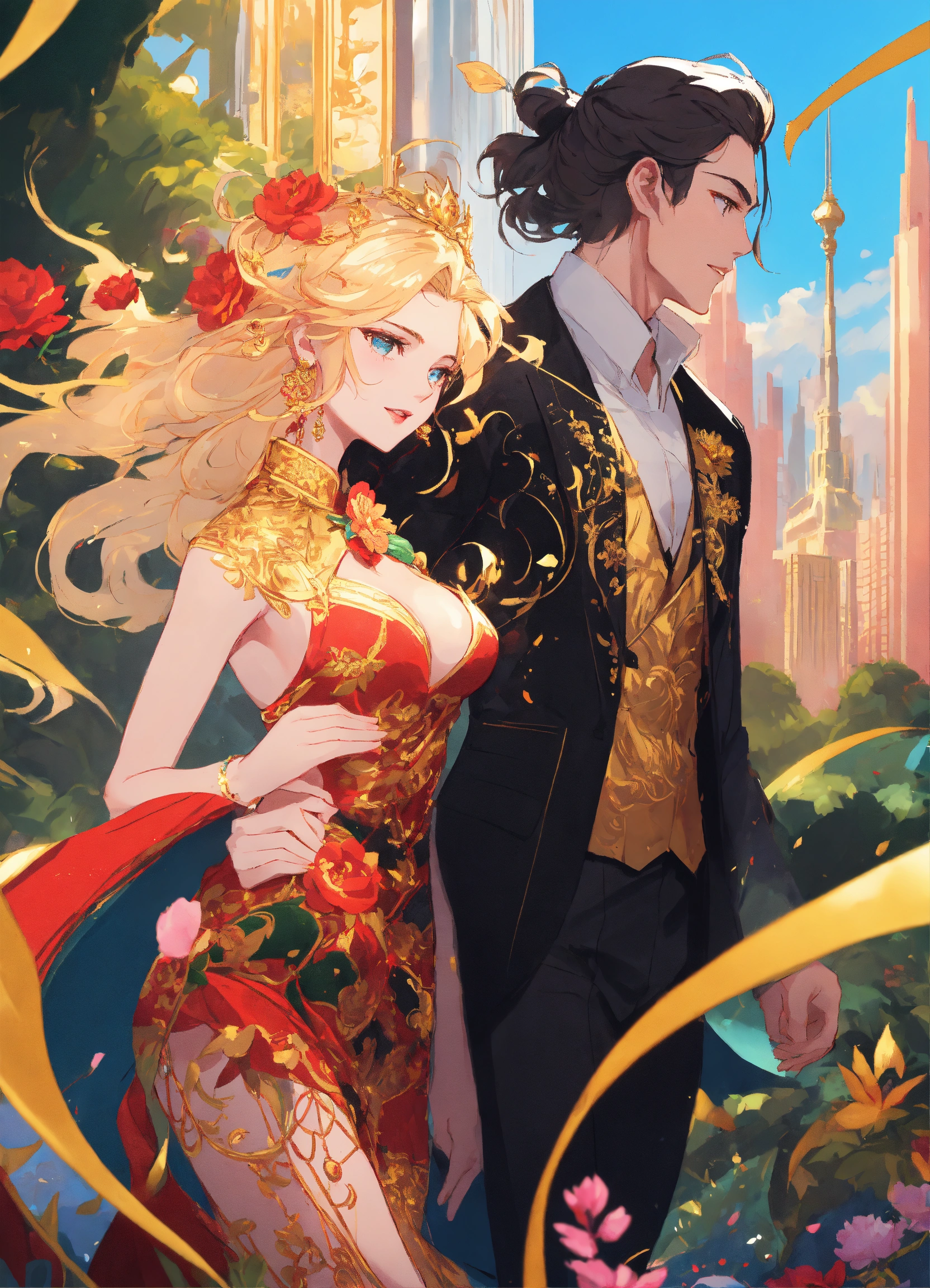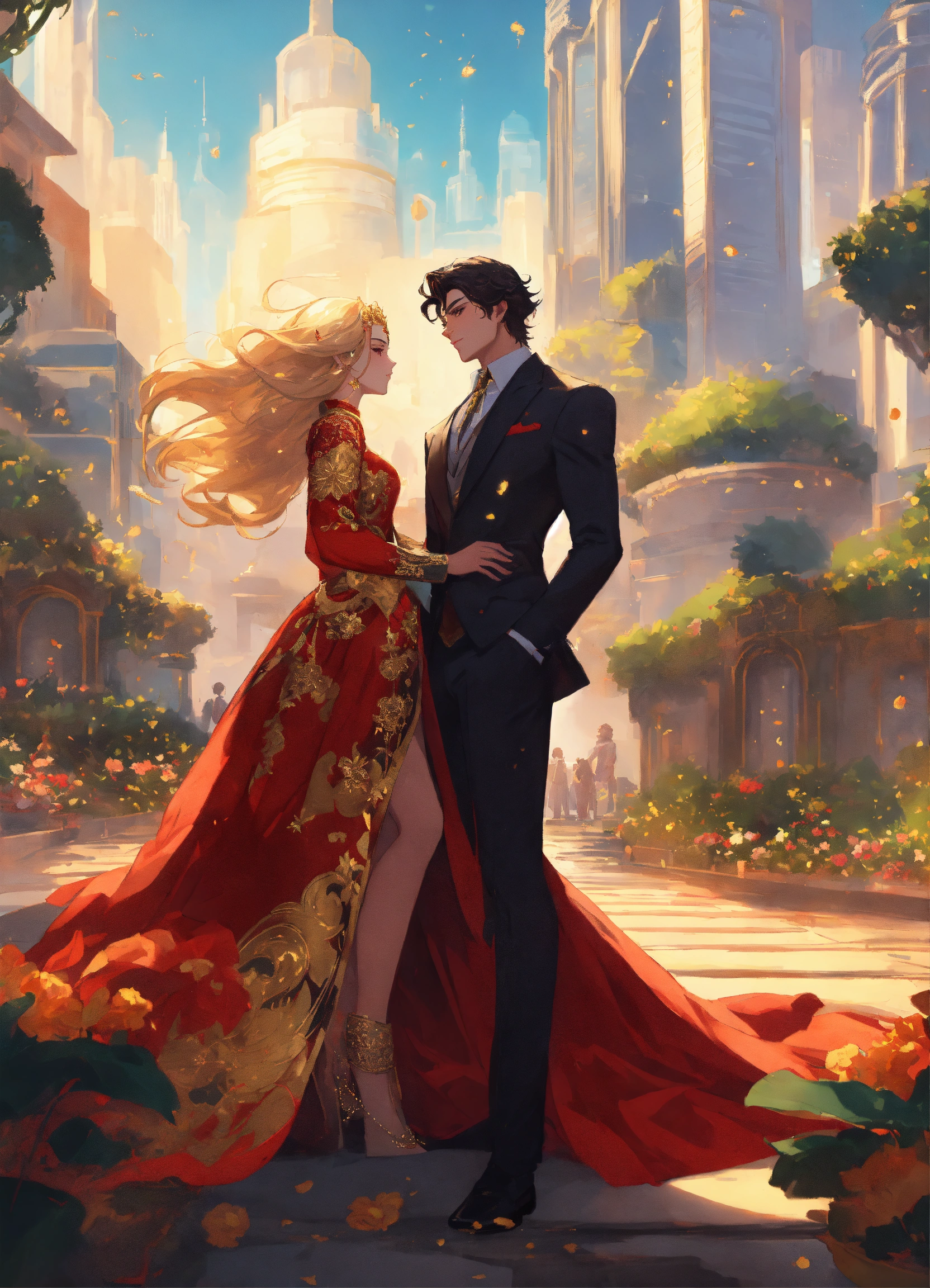 Illustration of beautiful city of towering skyscrapers, islands, vibrant colors, fair skin, the young man wears a intricate princely black suit with gold ornaments, has wavy black tousled hair, the golden haired woman wears a red intricate dress with gold adornments that shows legs, she has muscles, maximalist, 8k photo, animestyle, by artgerm, by rossdraws, trending on artstation, garden, windy, flowers, circular perspective, romantic, facing each other