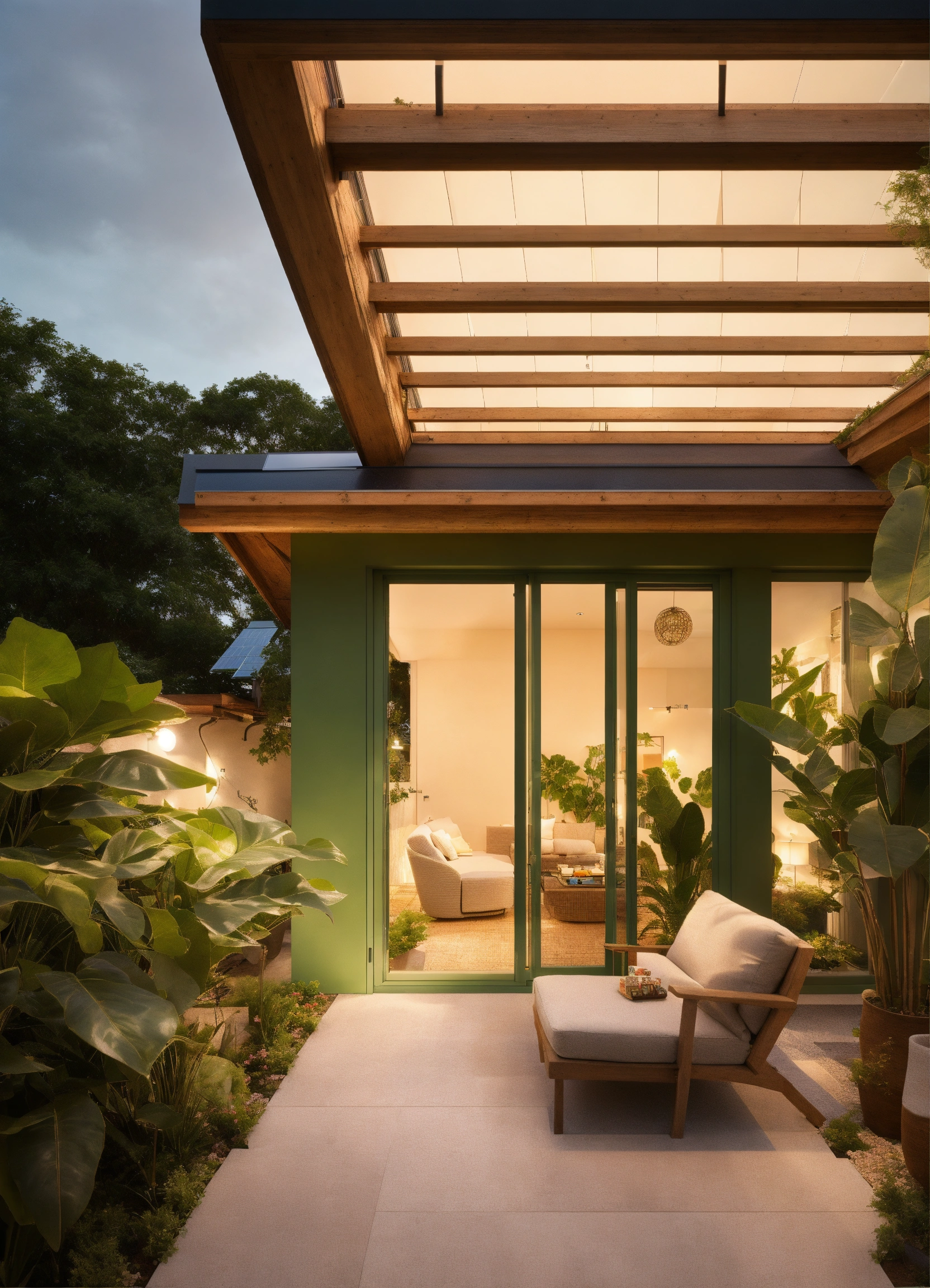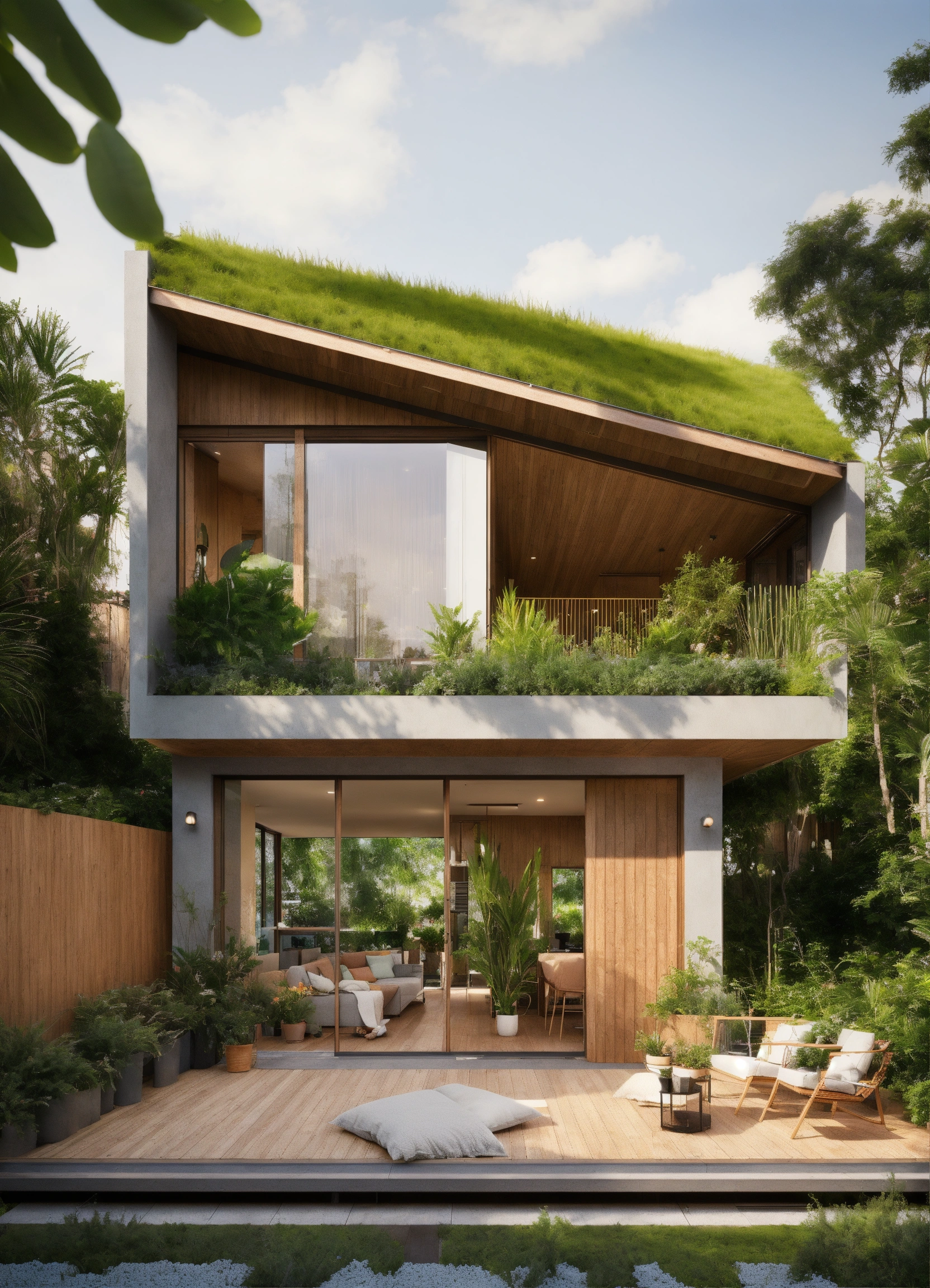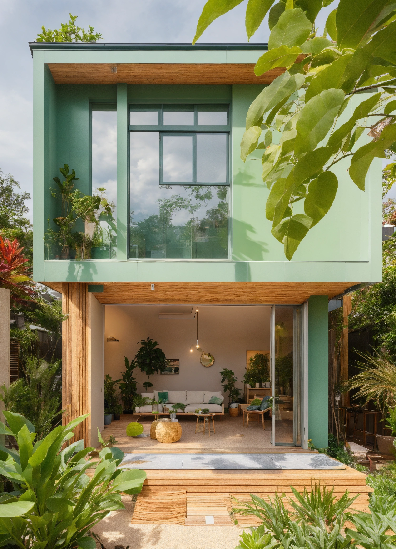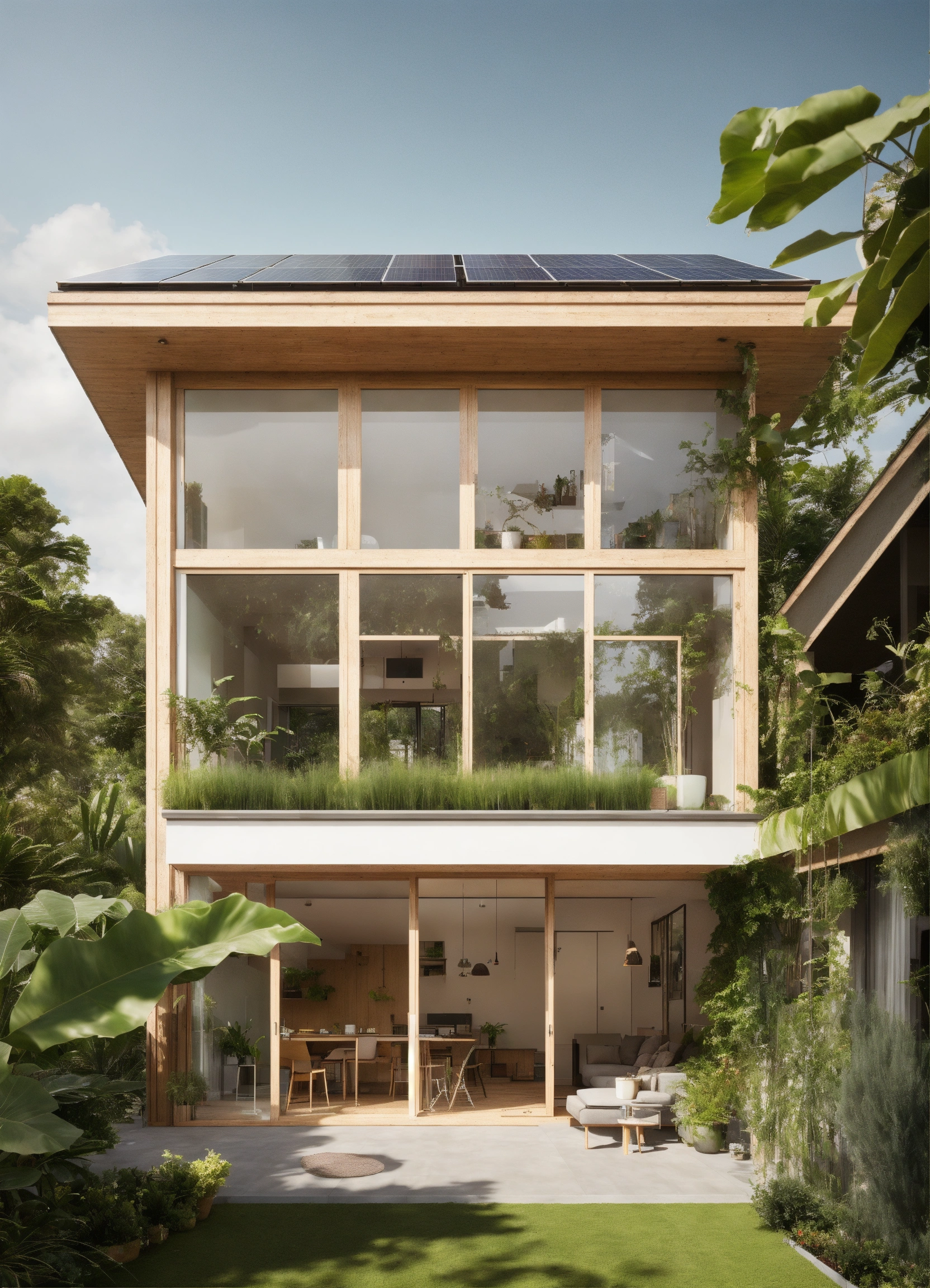 House project reusable materials light colours glass modern style tropical plants sustainable building solar panels green roof light colours living room external view light colours