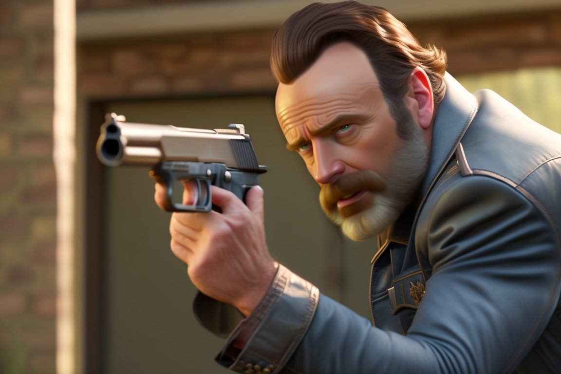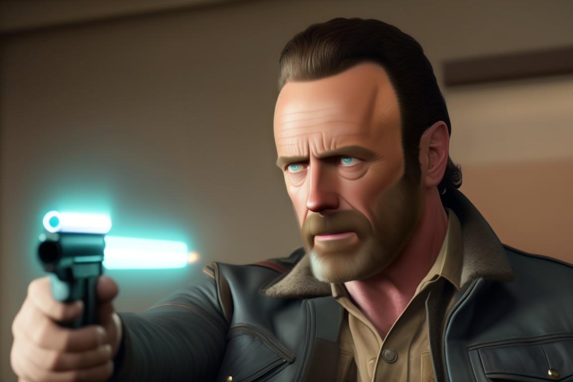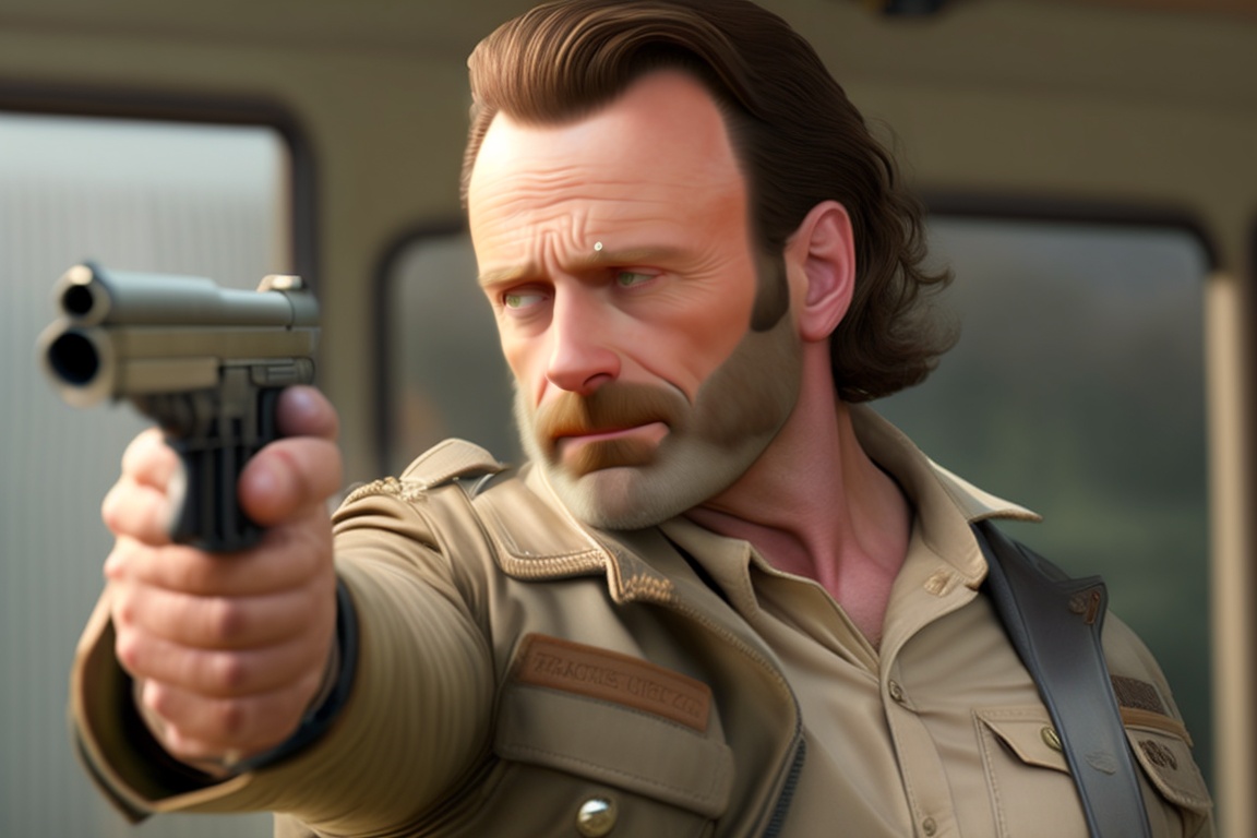 Rick grimes, the main character of the series the walking dead, nervously points a gun at walter white, the main character of the series breaking bad, but walter white just stares without reacting.