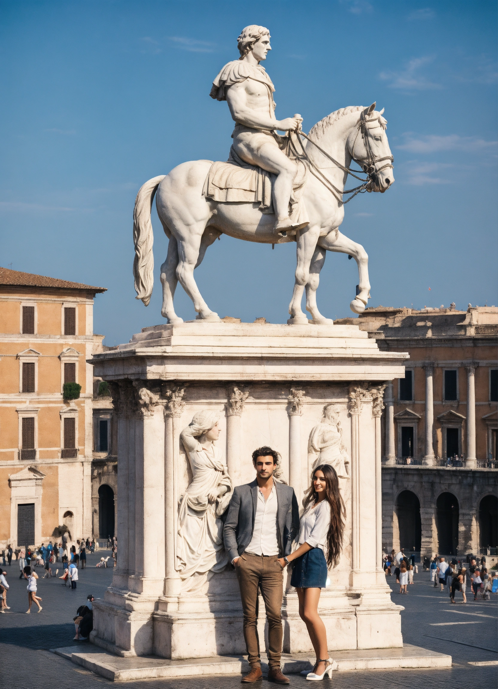 Photo of rome at day with two model a man and a women and the victor emmanuel ii monument, looking into the the camera; long hair, clothes in white color, photo in white color, innocence, perfect hands