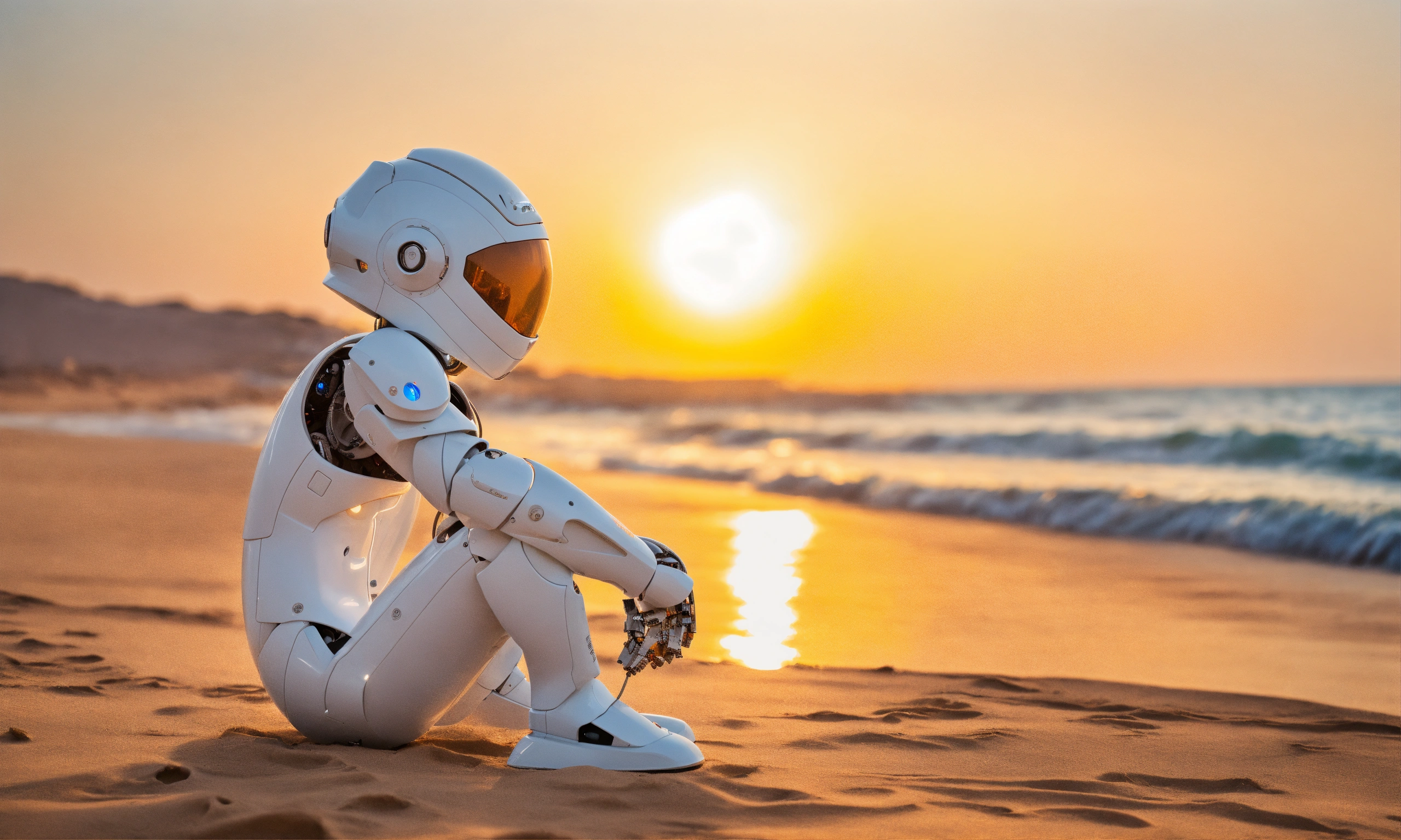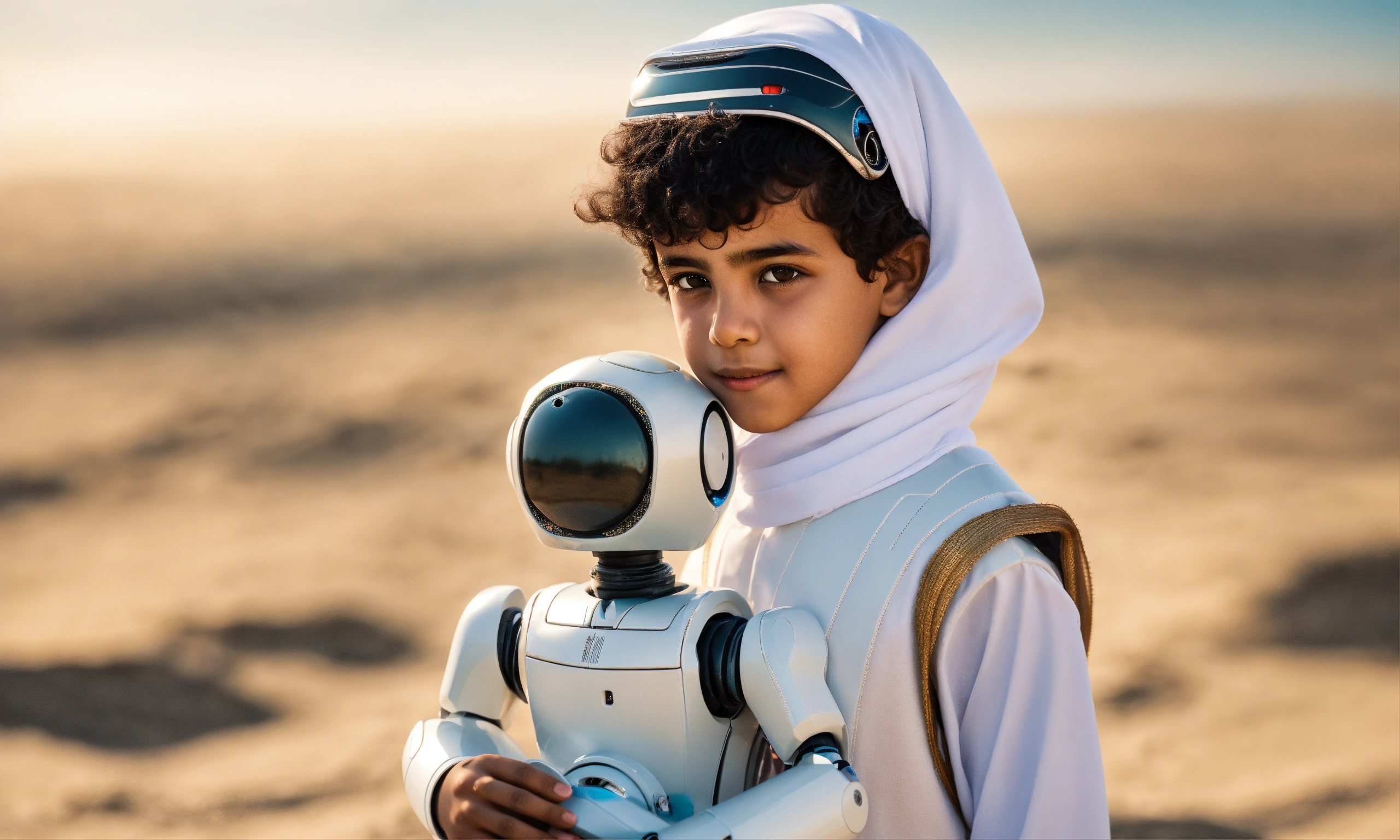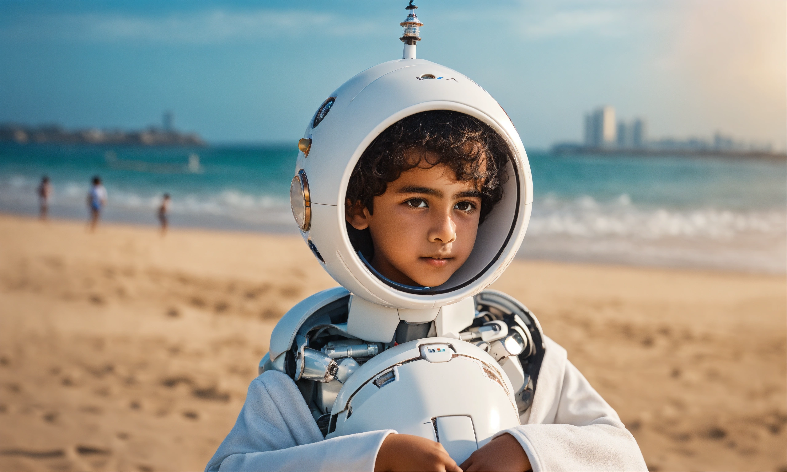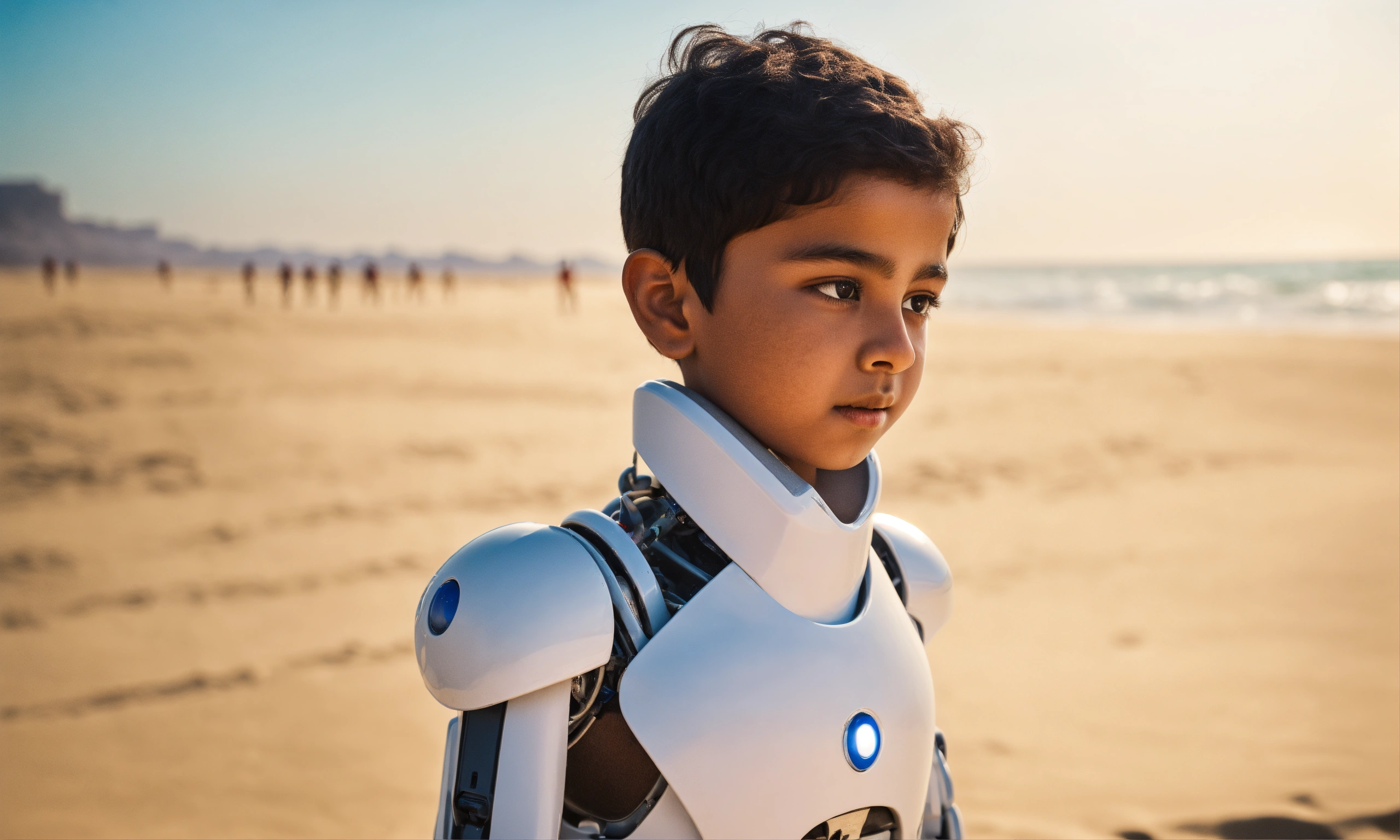 Close up of a saudi kid embracing his robot, white costume, beach, horizon, warm, photo-realistic, 8k, high definition