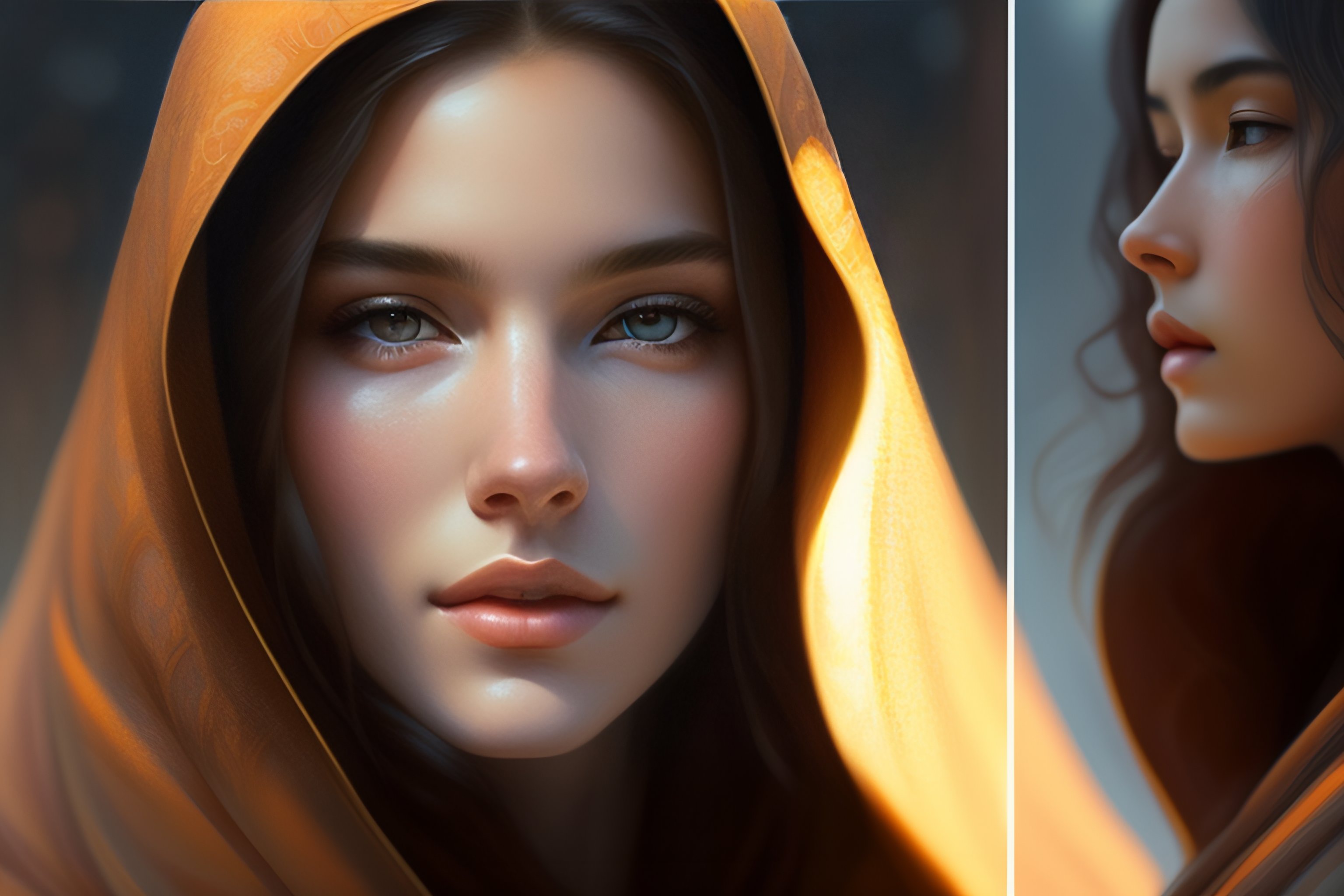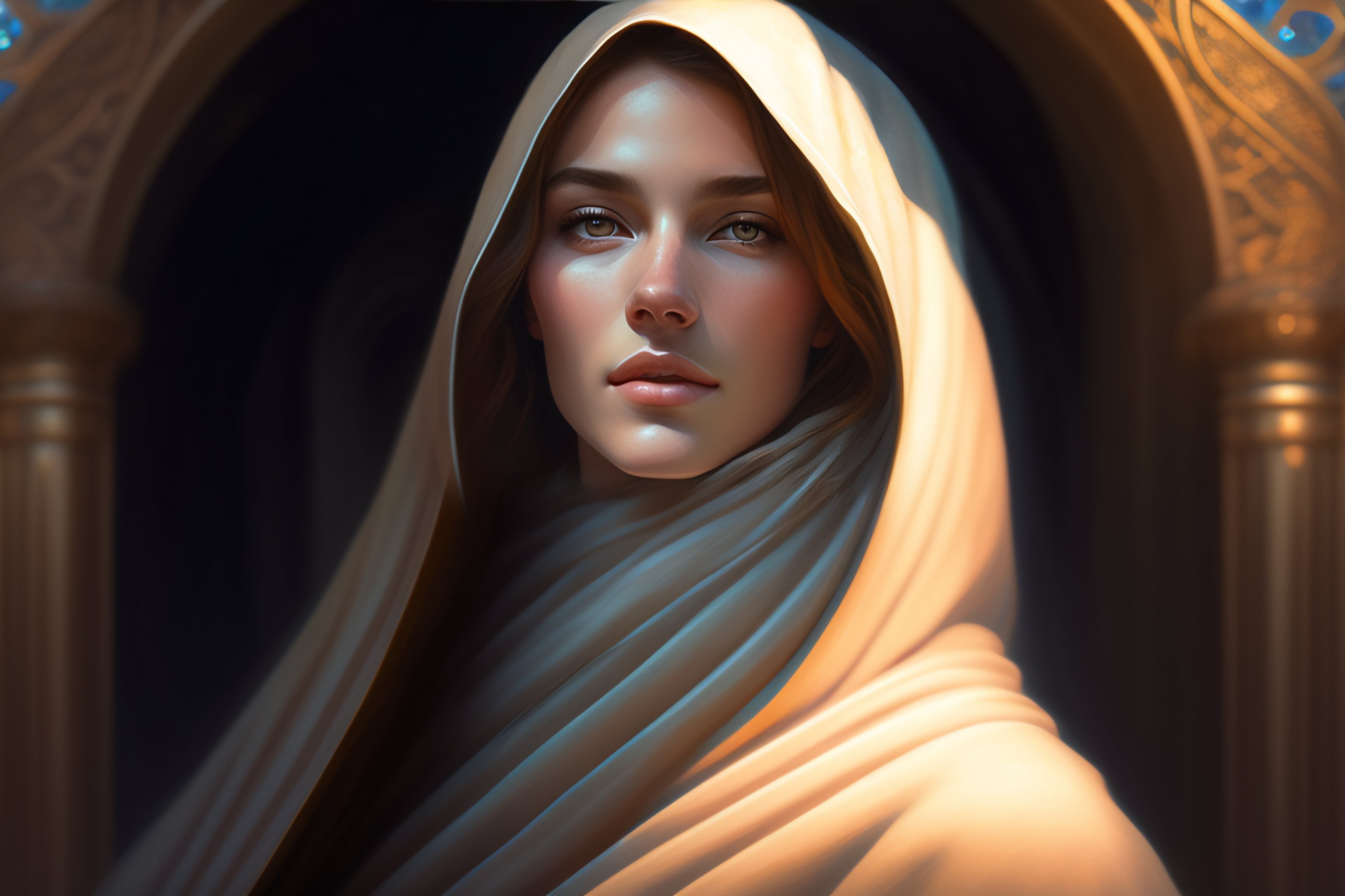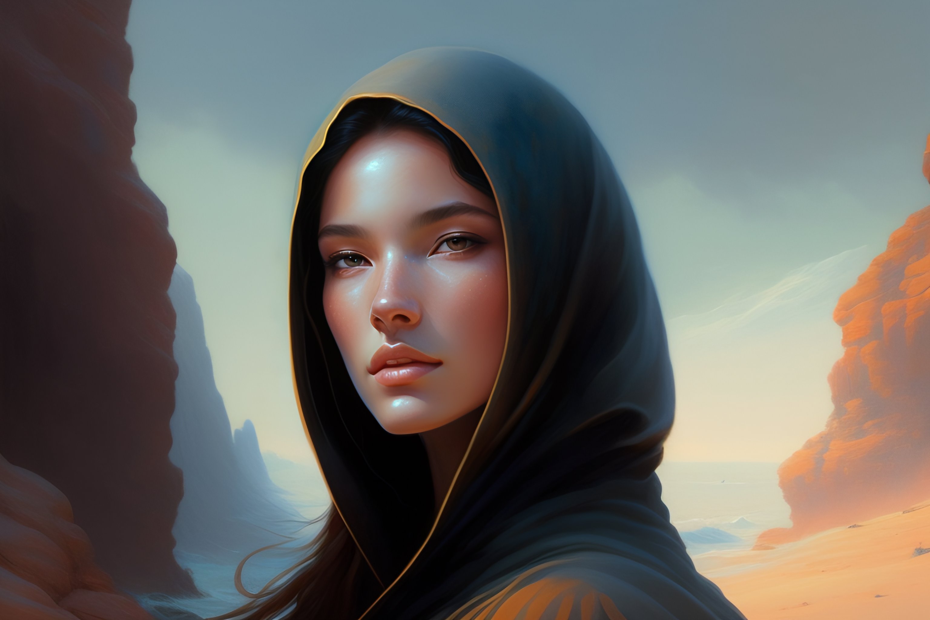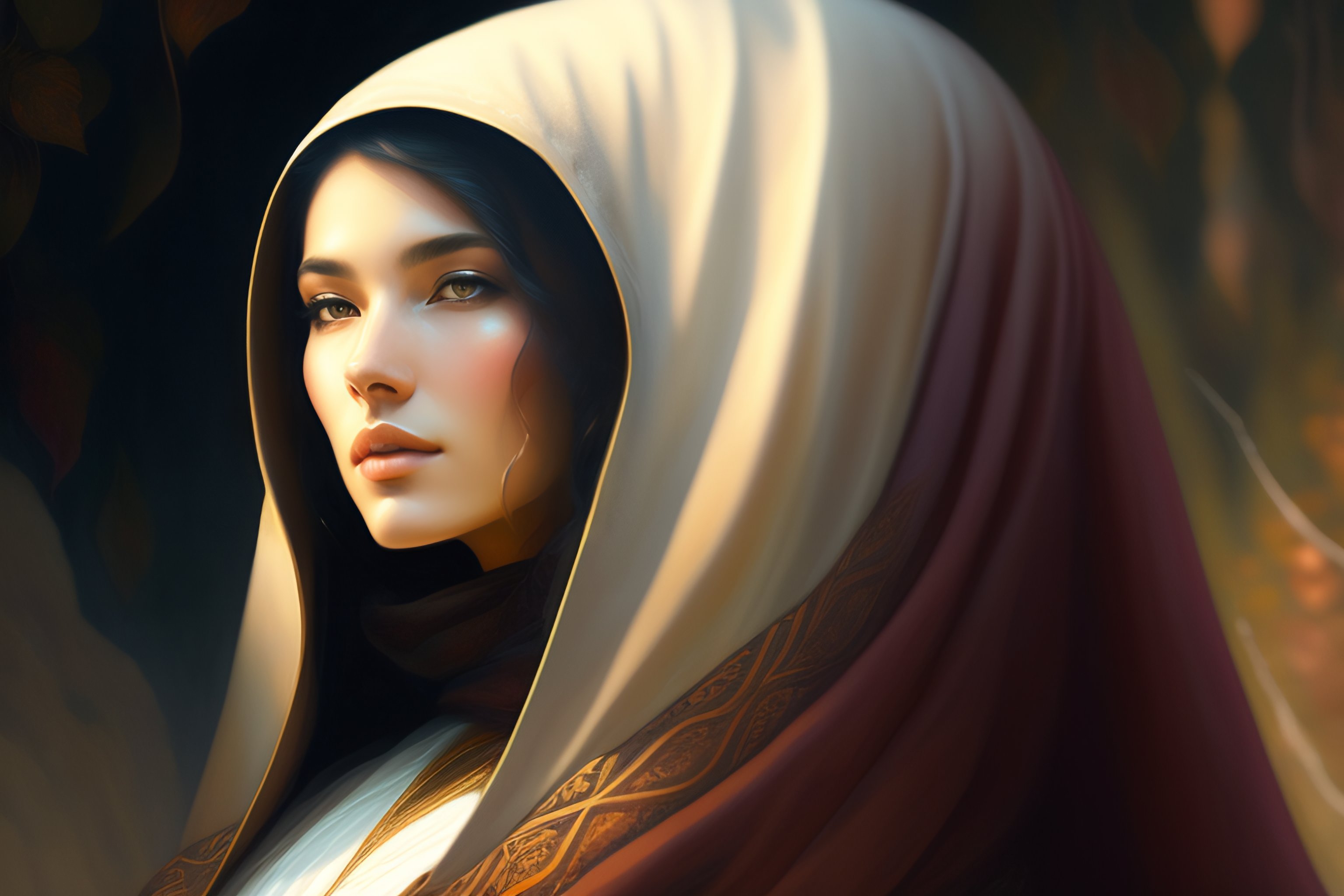 Portrait of a young woman wearing a hooded robe, non-centered shot, unique pose, intricate, elegant, highly detailed, digital painting, artstation, concept art, smooth, sharp focus, illustration, art by artgerm and greg rutkowski and alphonse mucha, by beksinski