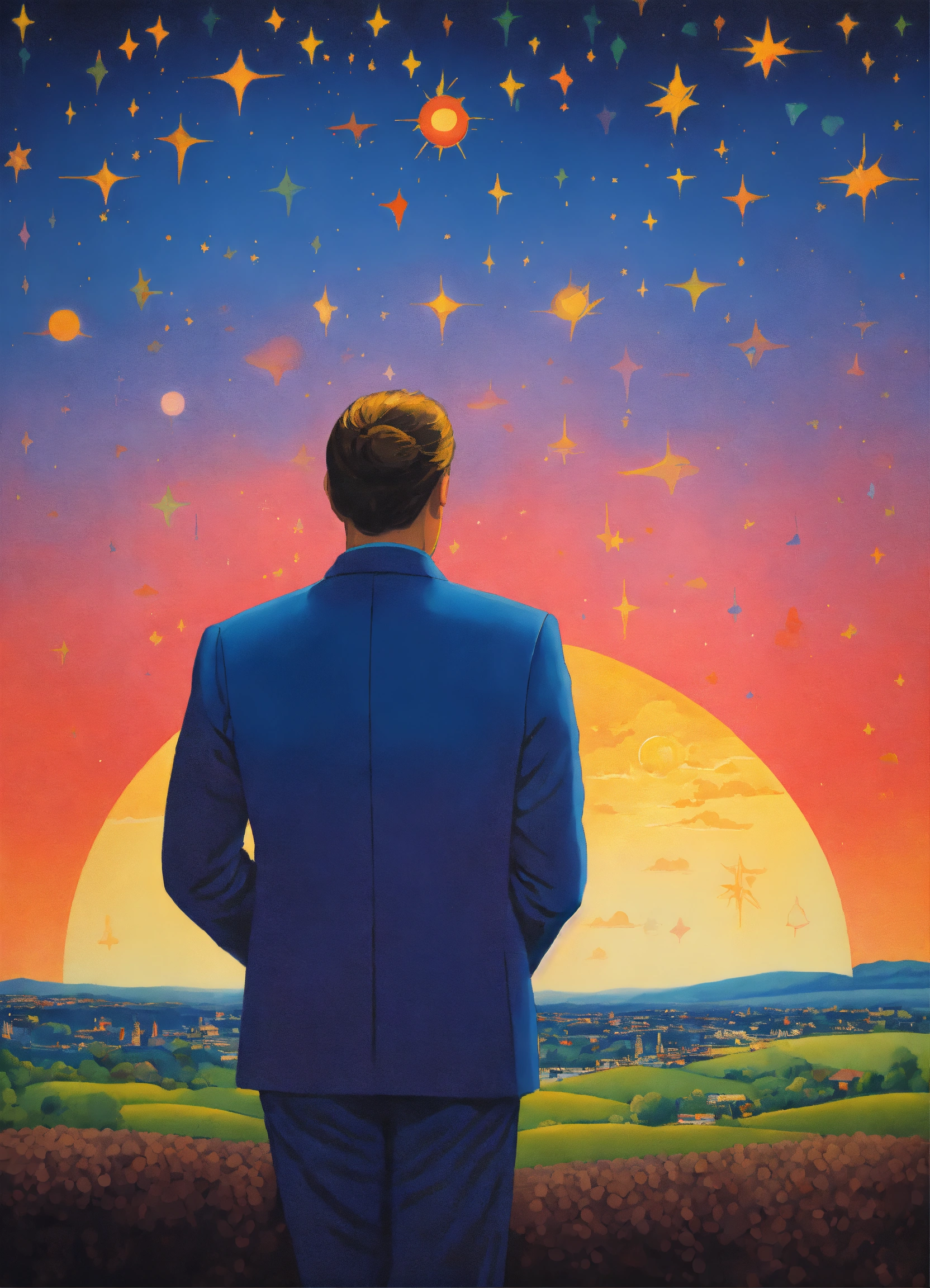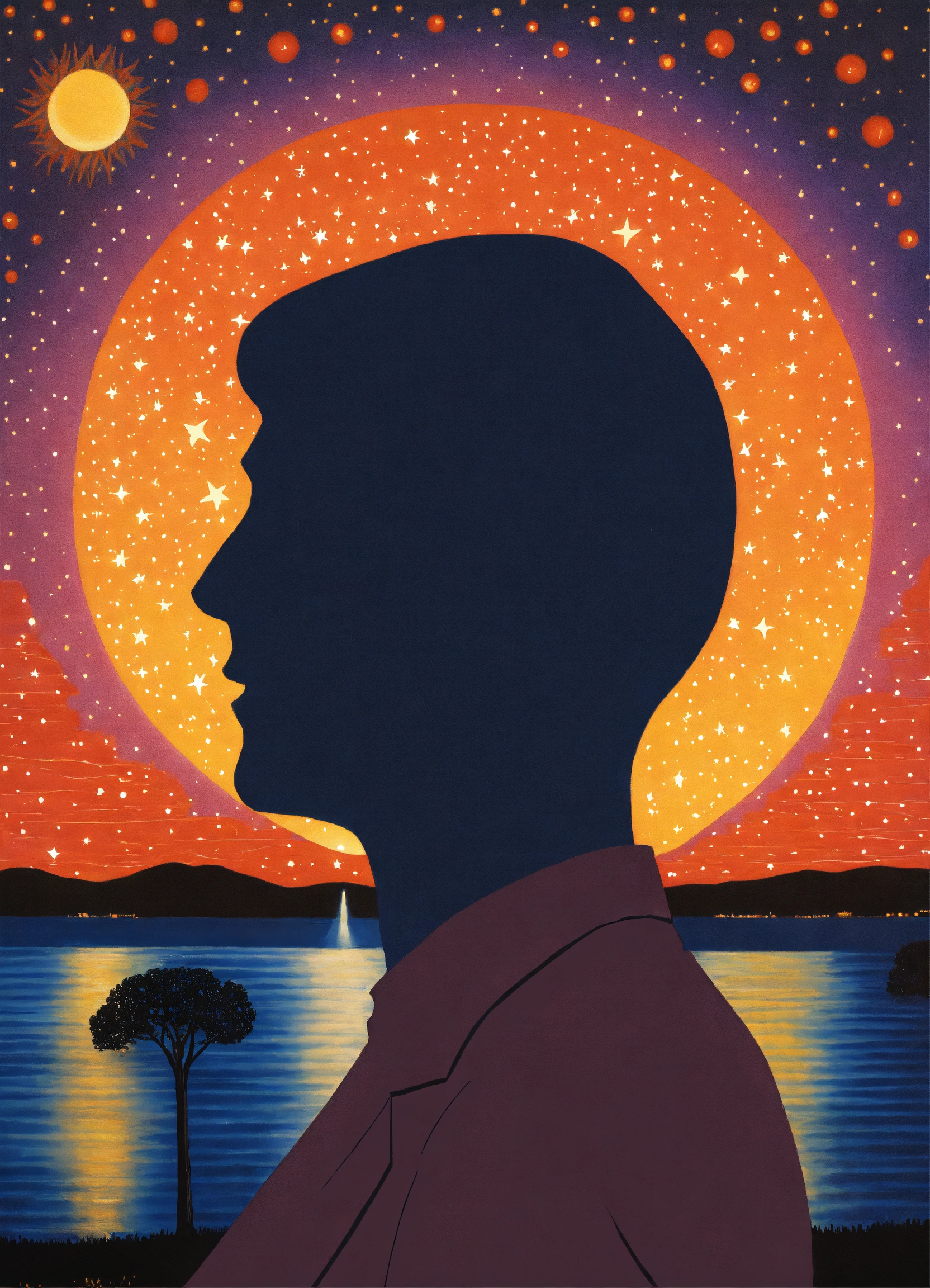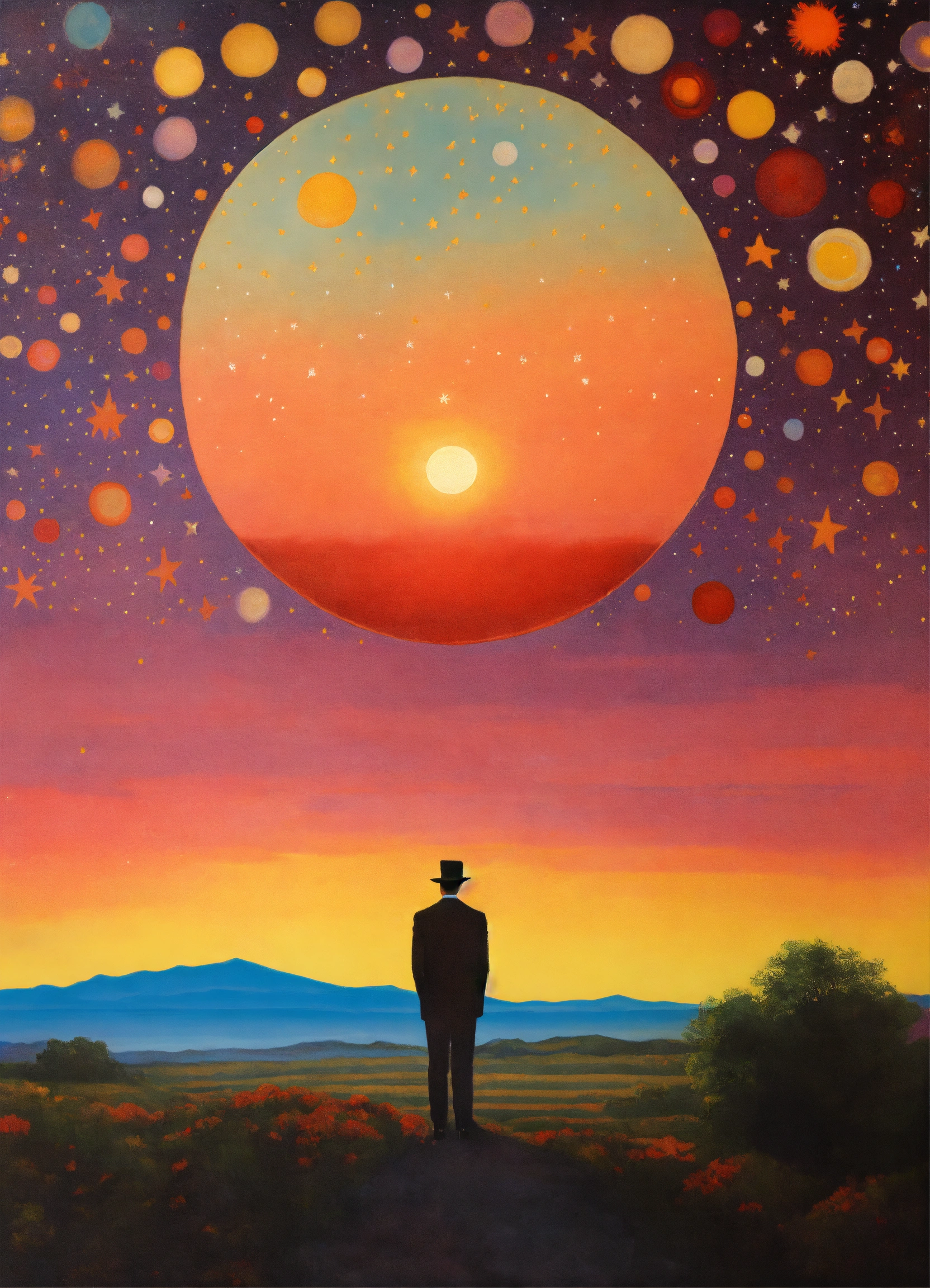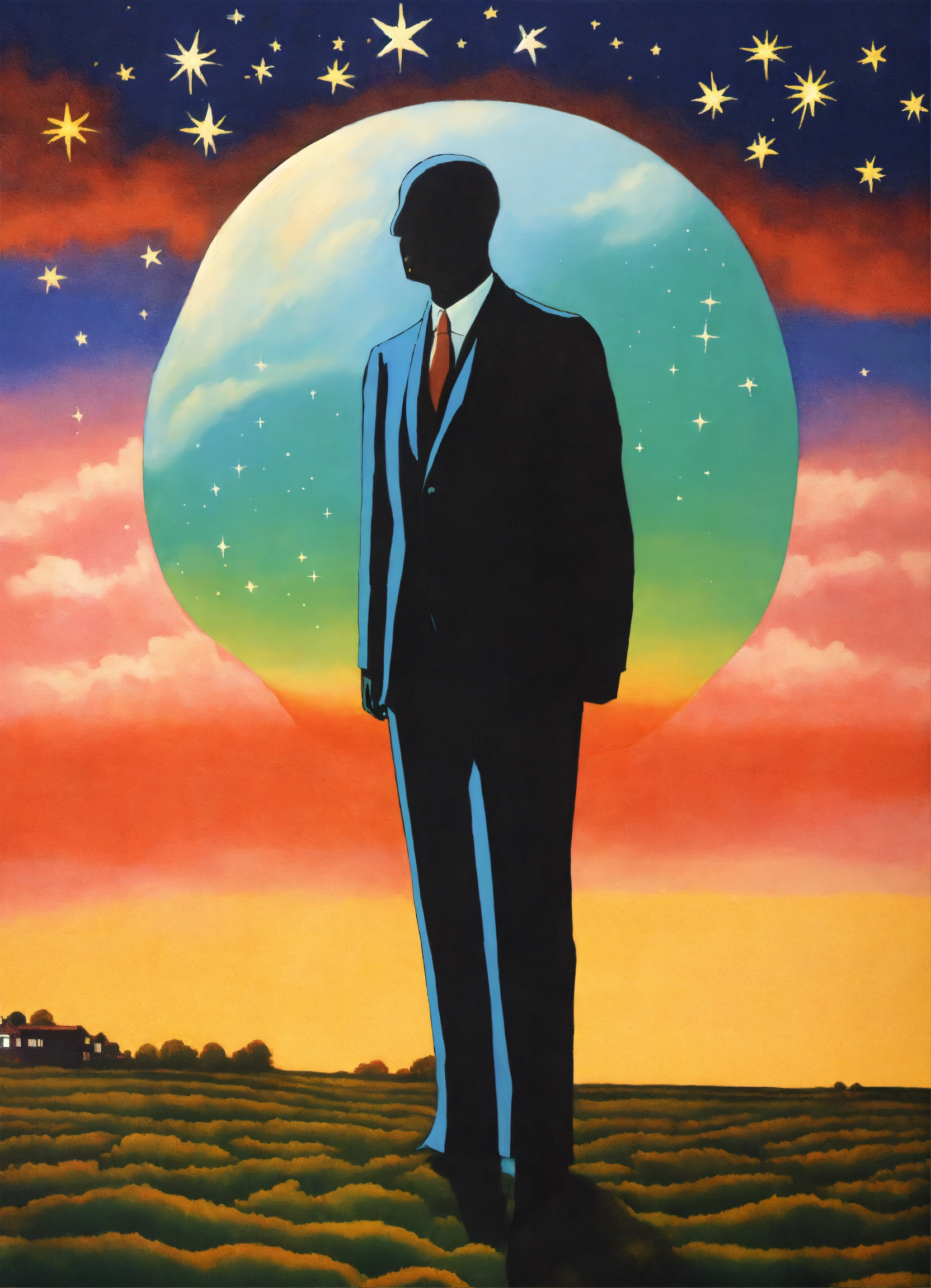 Outline of human body gazing into the bliss colourful sun set and night stars painted by rene magritte