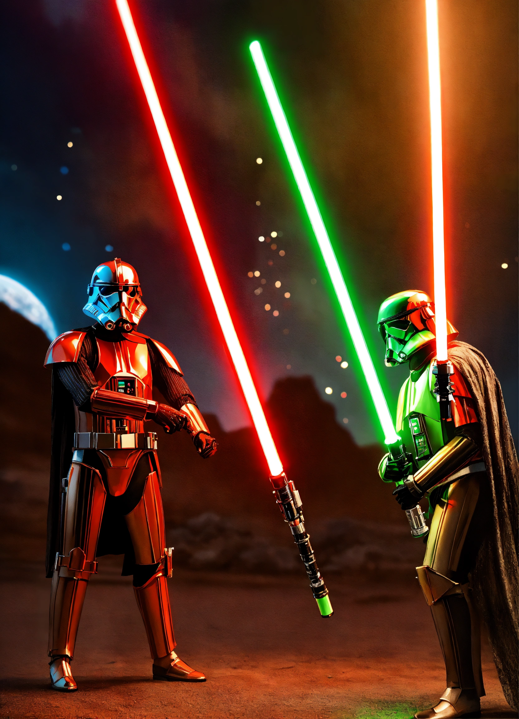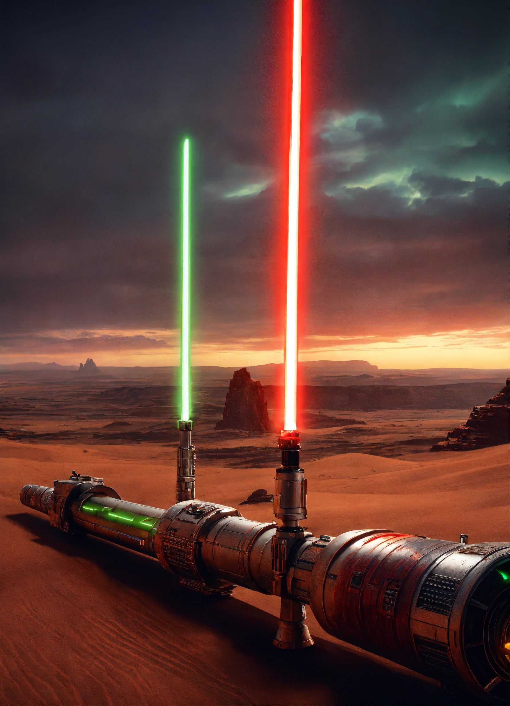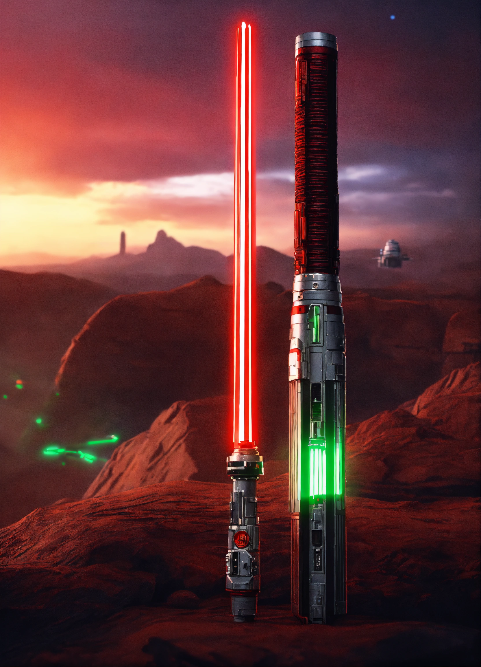 "a photorealistic depiction of two iconic star wars lightsabers, one with a vivid red blade and the other with a vibrant green blade, locked in a dynamic crossing action. the lightsabers should be the central focus of the image, set against a detailed, alien landscape. capture this dramatic moment with a 135mm camera lens in a medium shot, emphasizing the lightsabers' intricate details. render this image in 8k resolution with hyper-detailed textures and hdr lighting, creating a lifelike portrayal of the lightsabers."