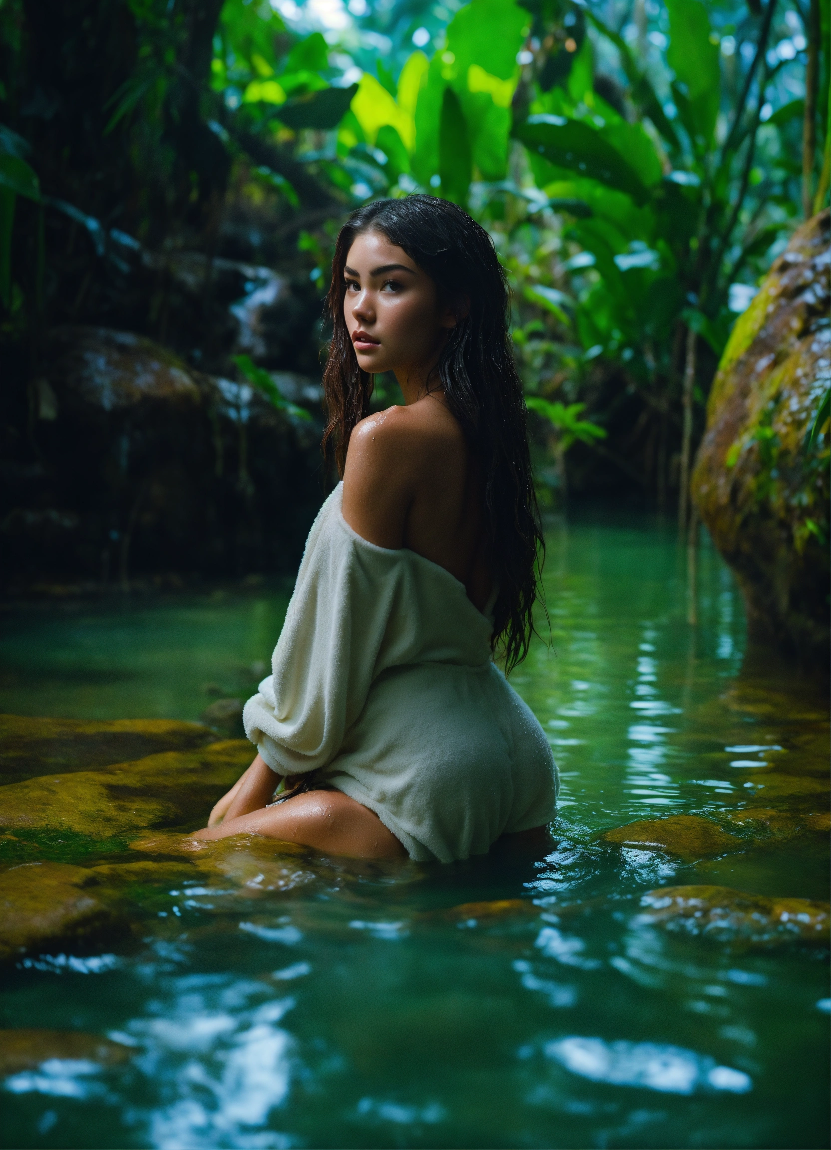 Madison beer in a natural hot springs in the jungle, drenched hair, realistic. wet. back turned. over the shoulder look. full natural body view. 4k real photoshoot.