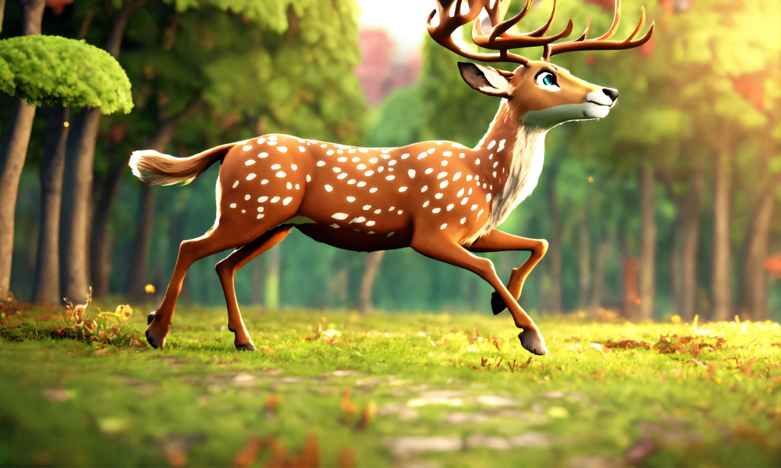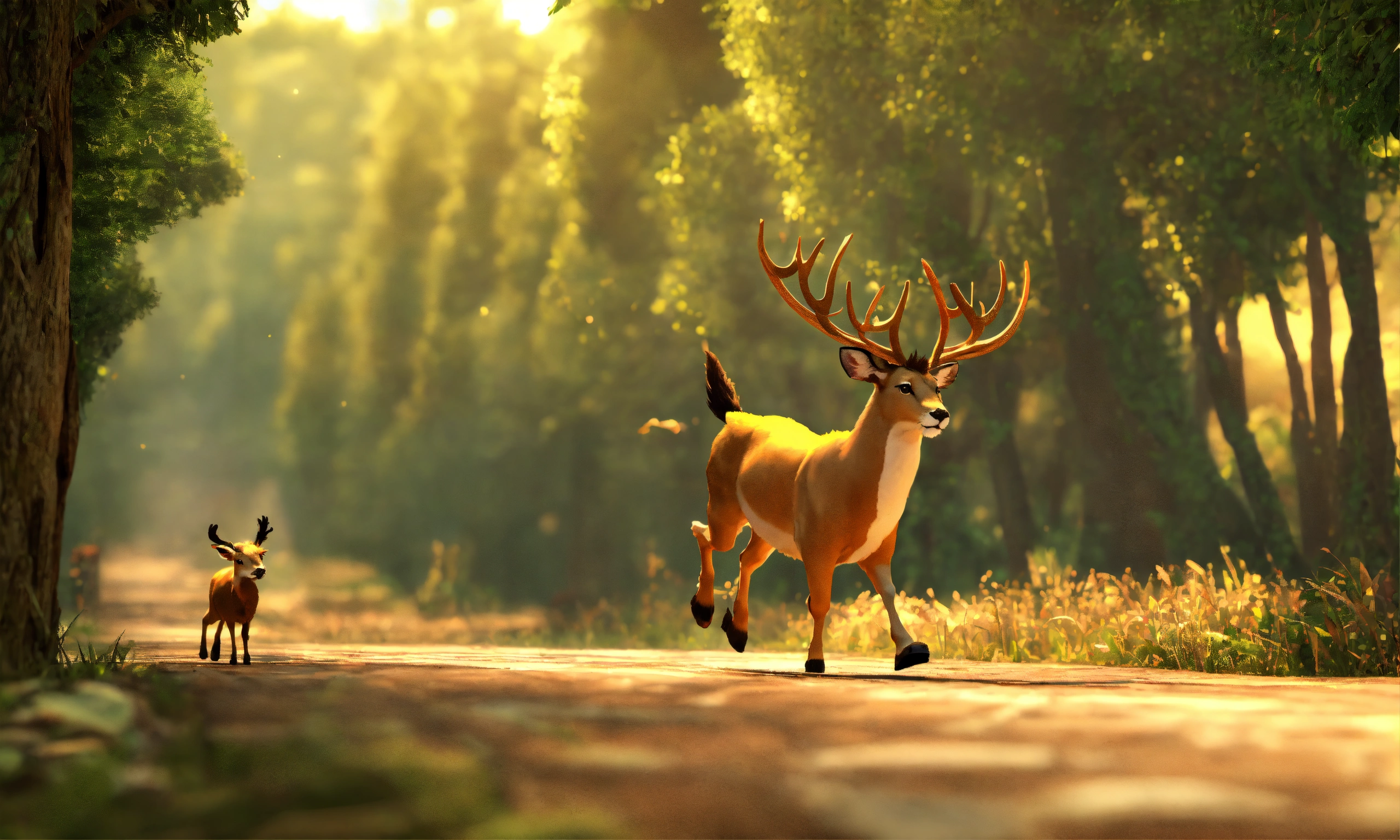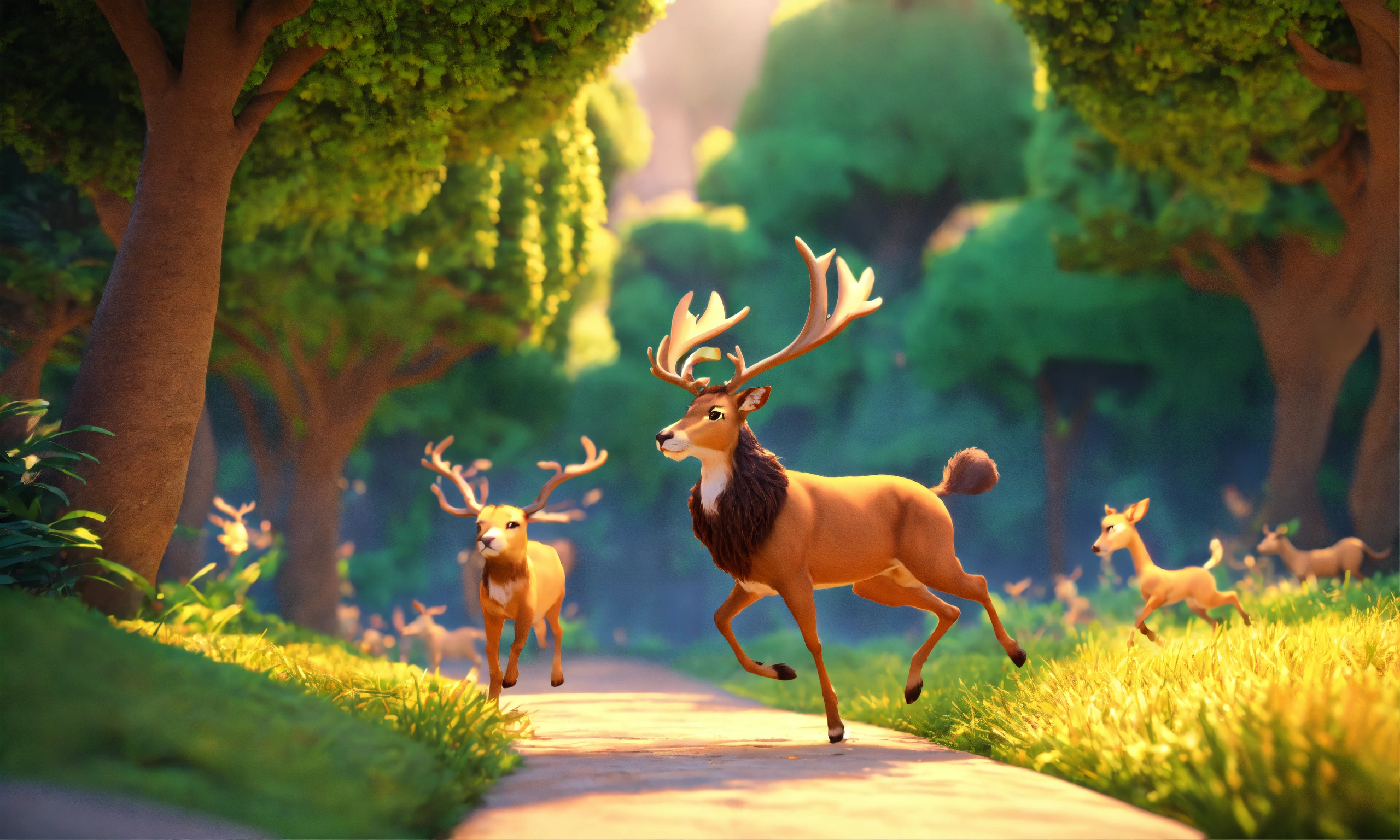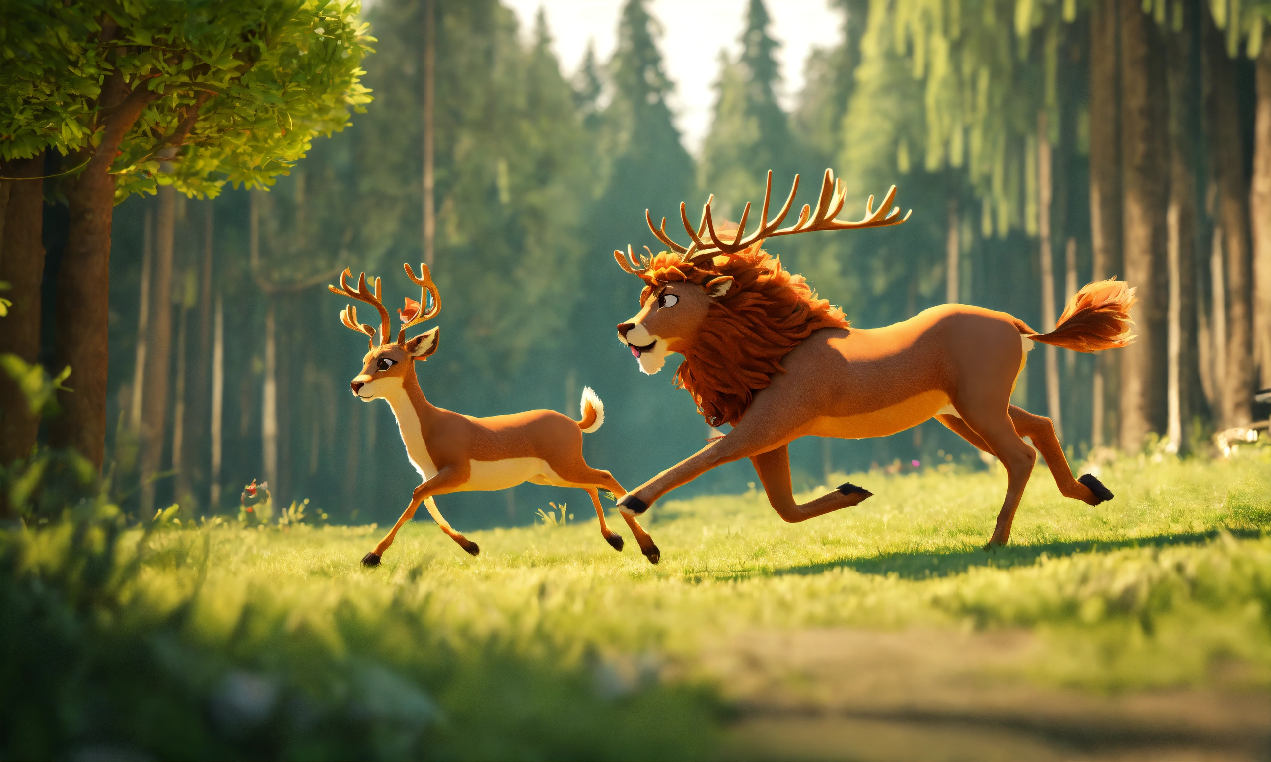 3d animation style cartoon deer running ahead behind it lion running