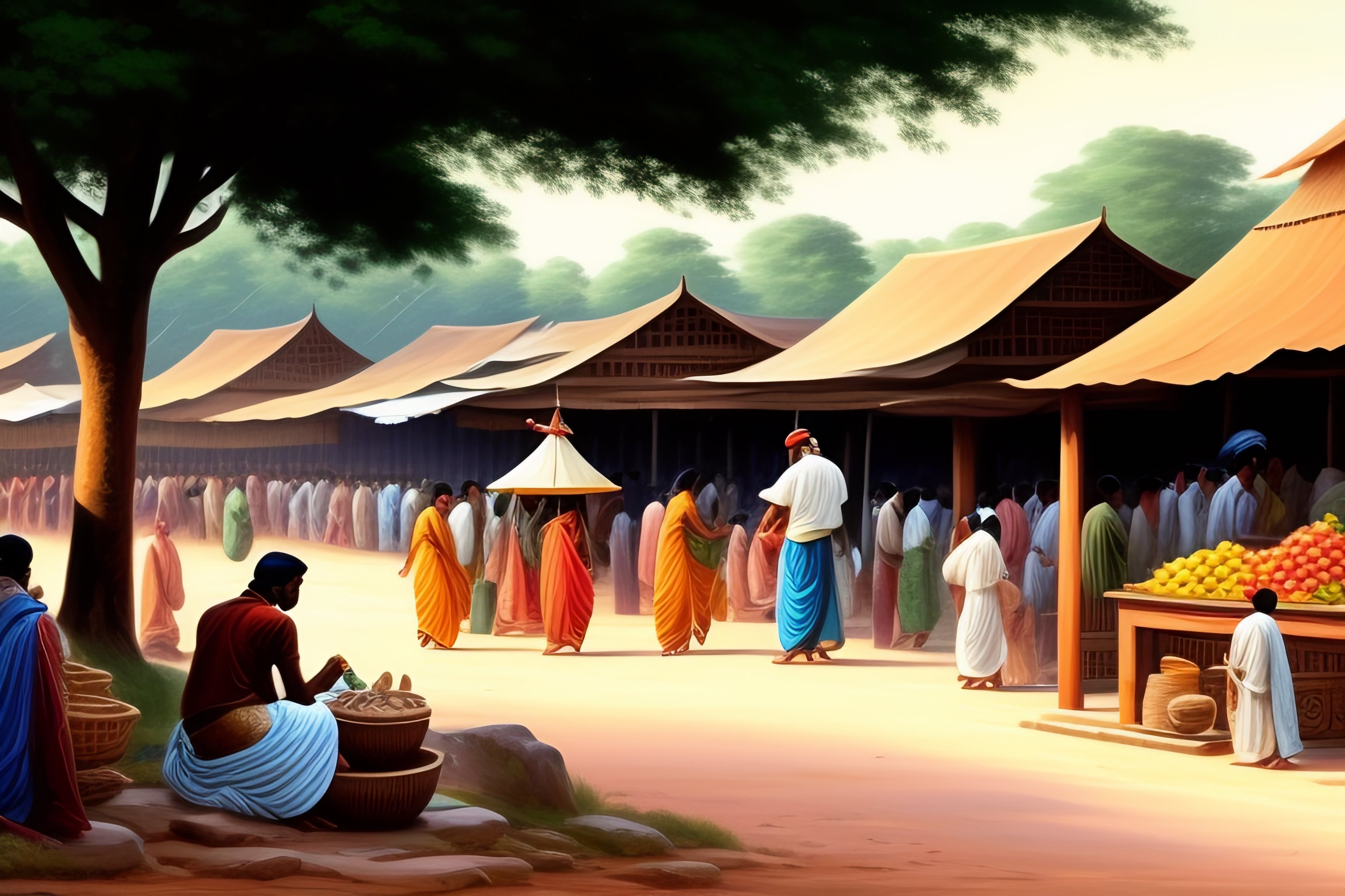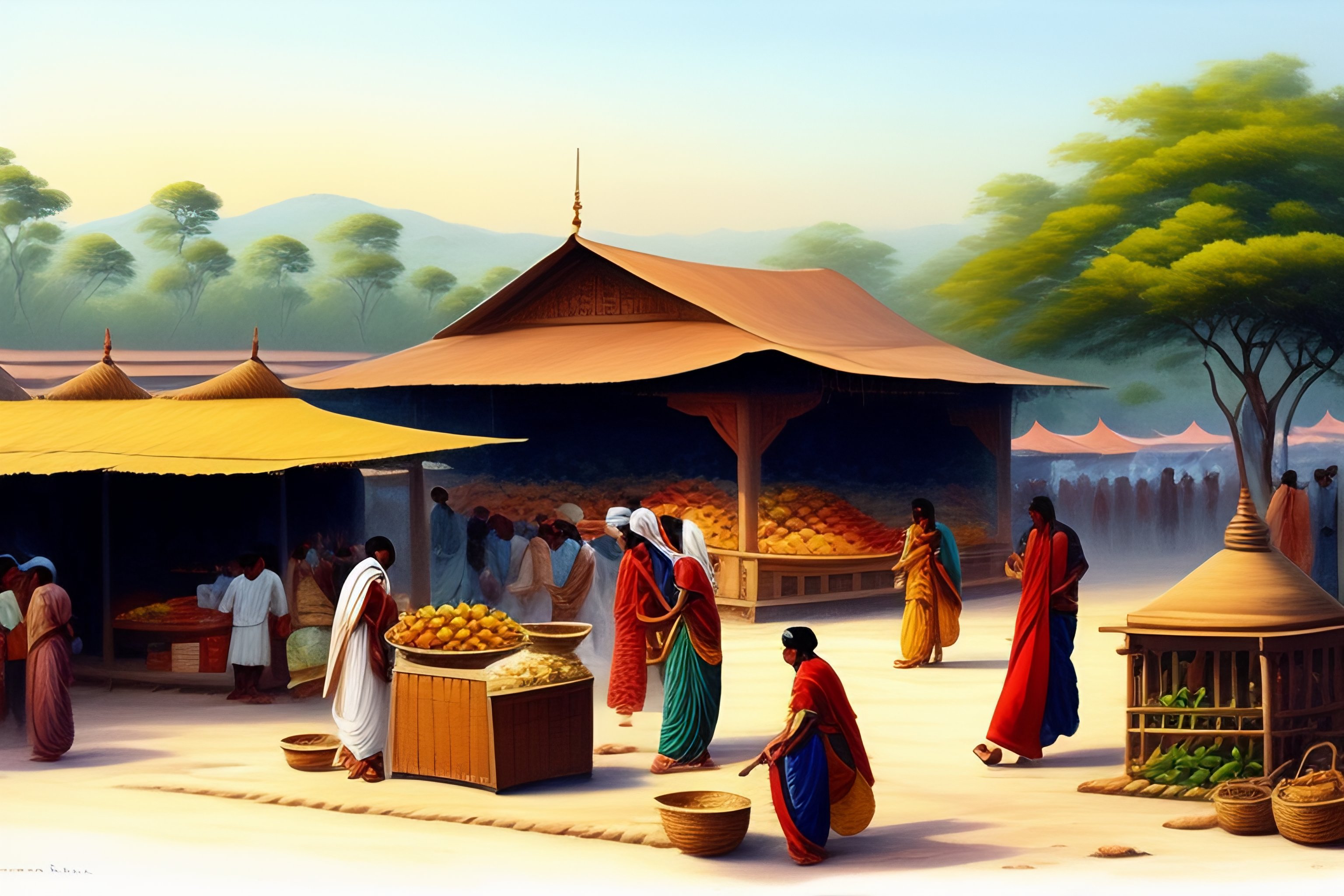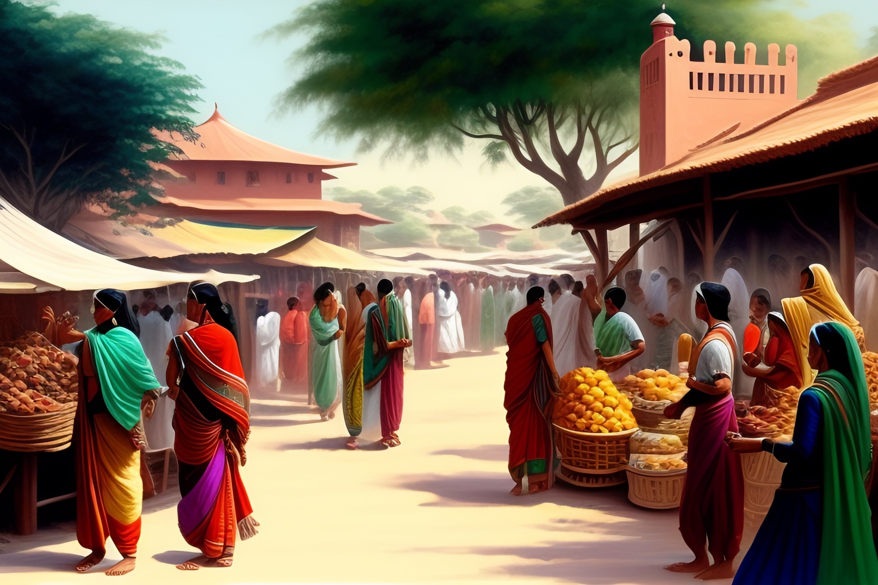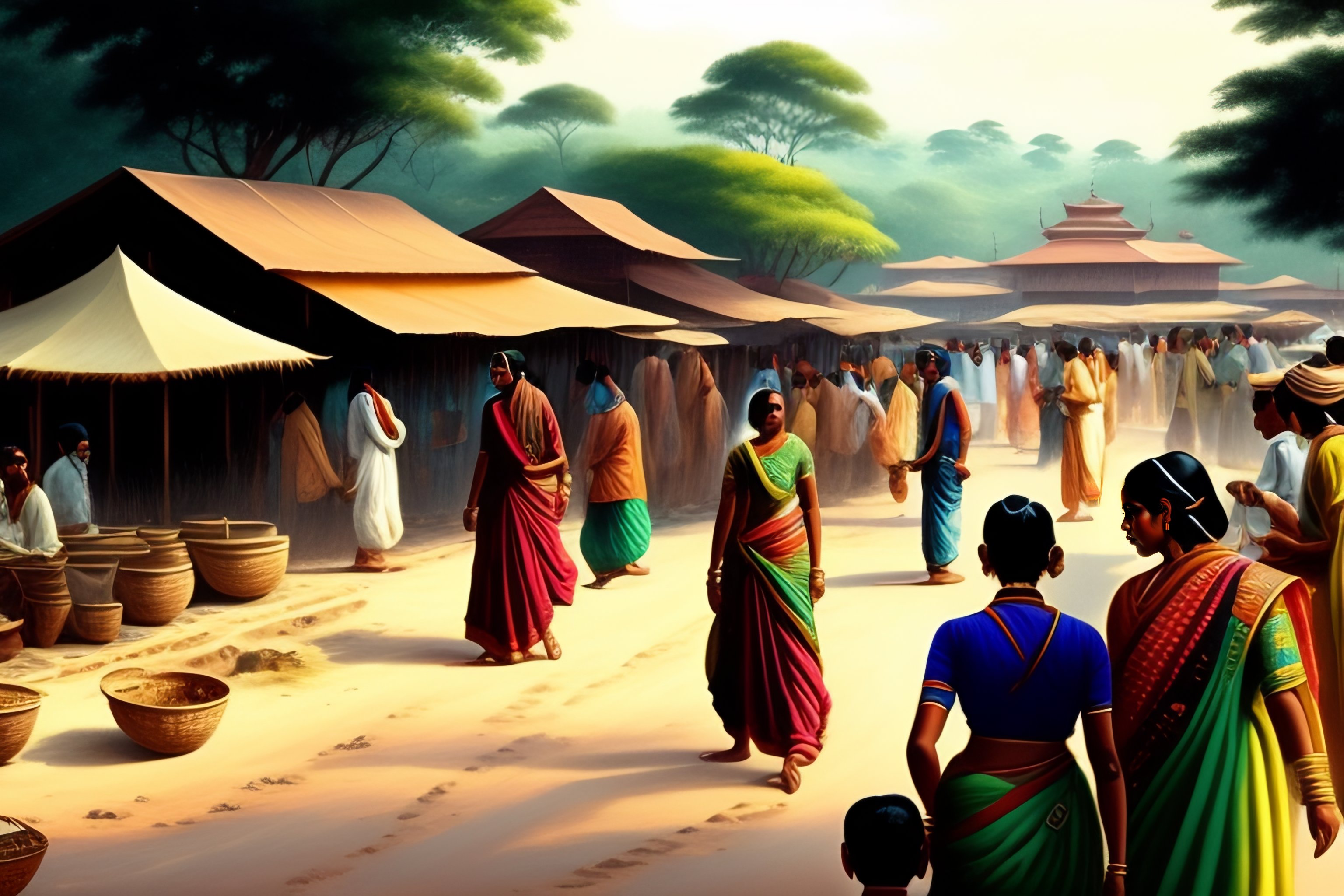 Nandalal bose style sketch of a busy indian village market