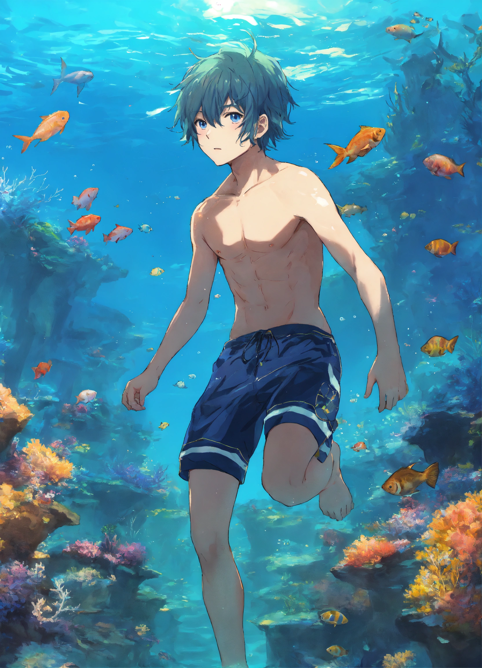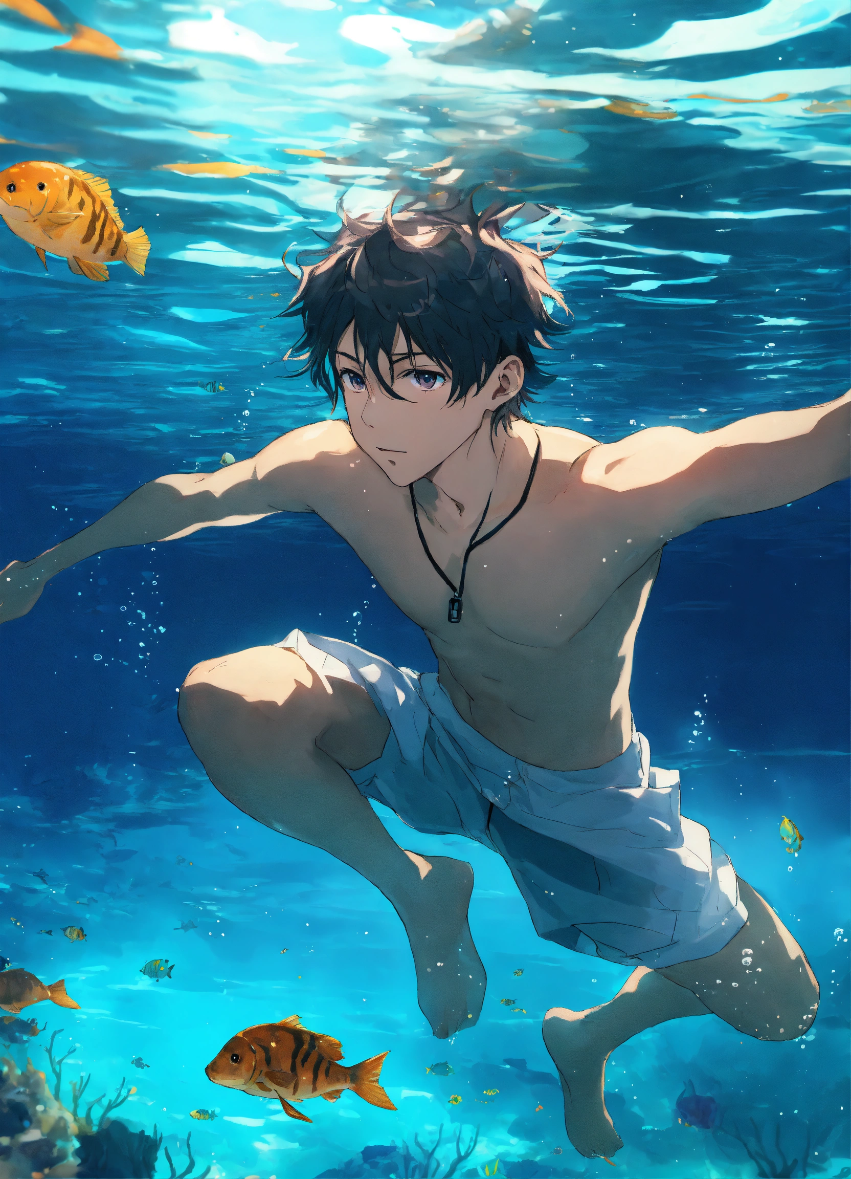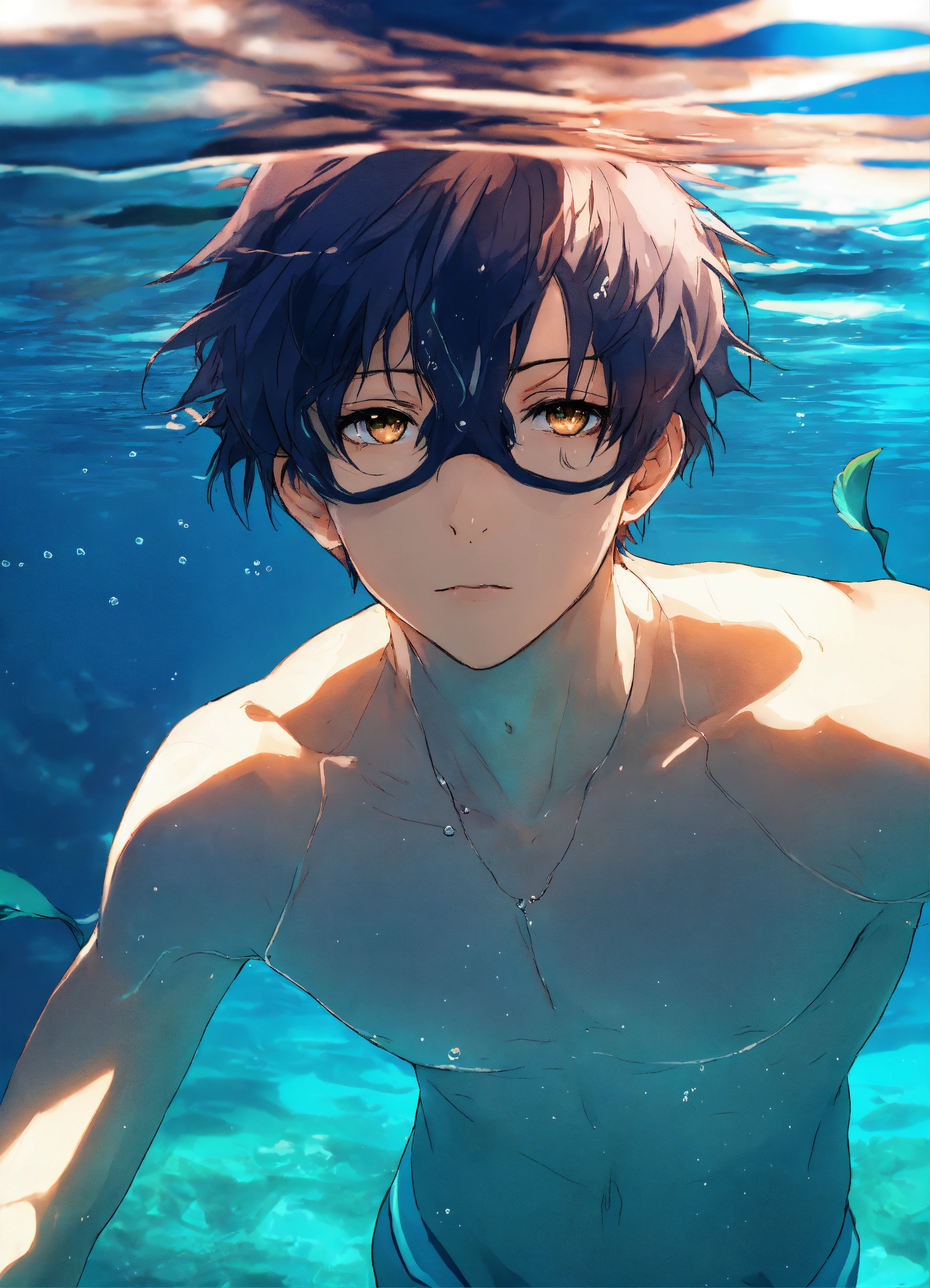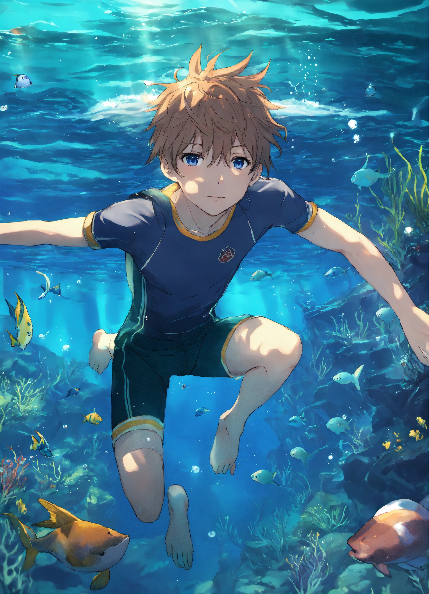 Anime boy swim underwater sea