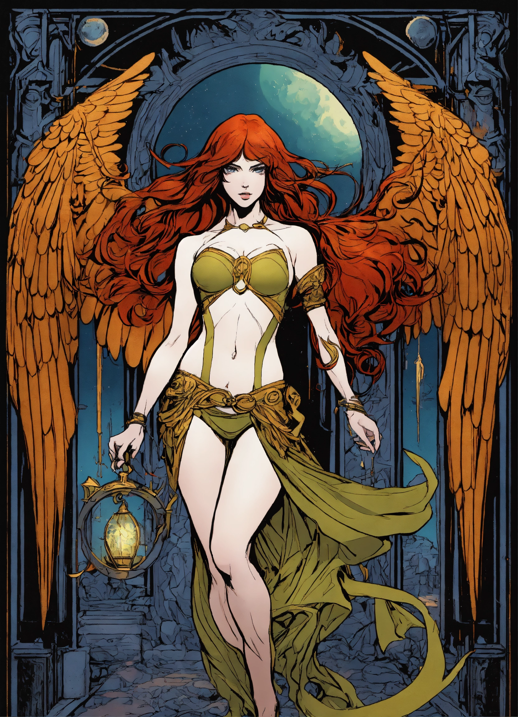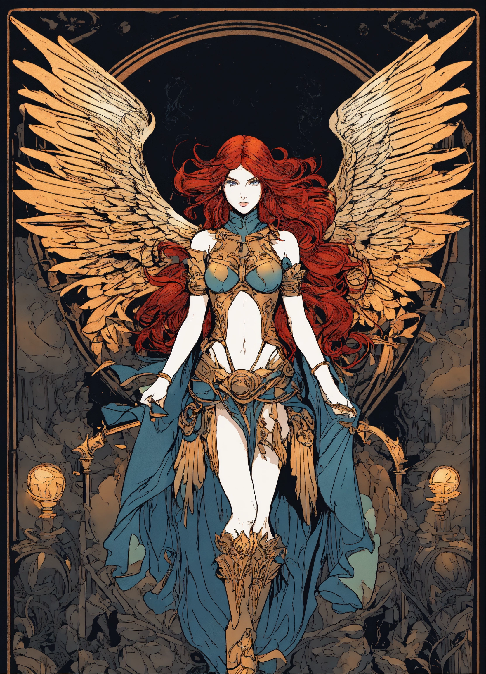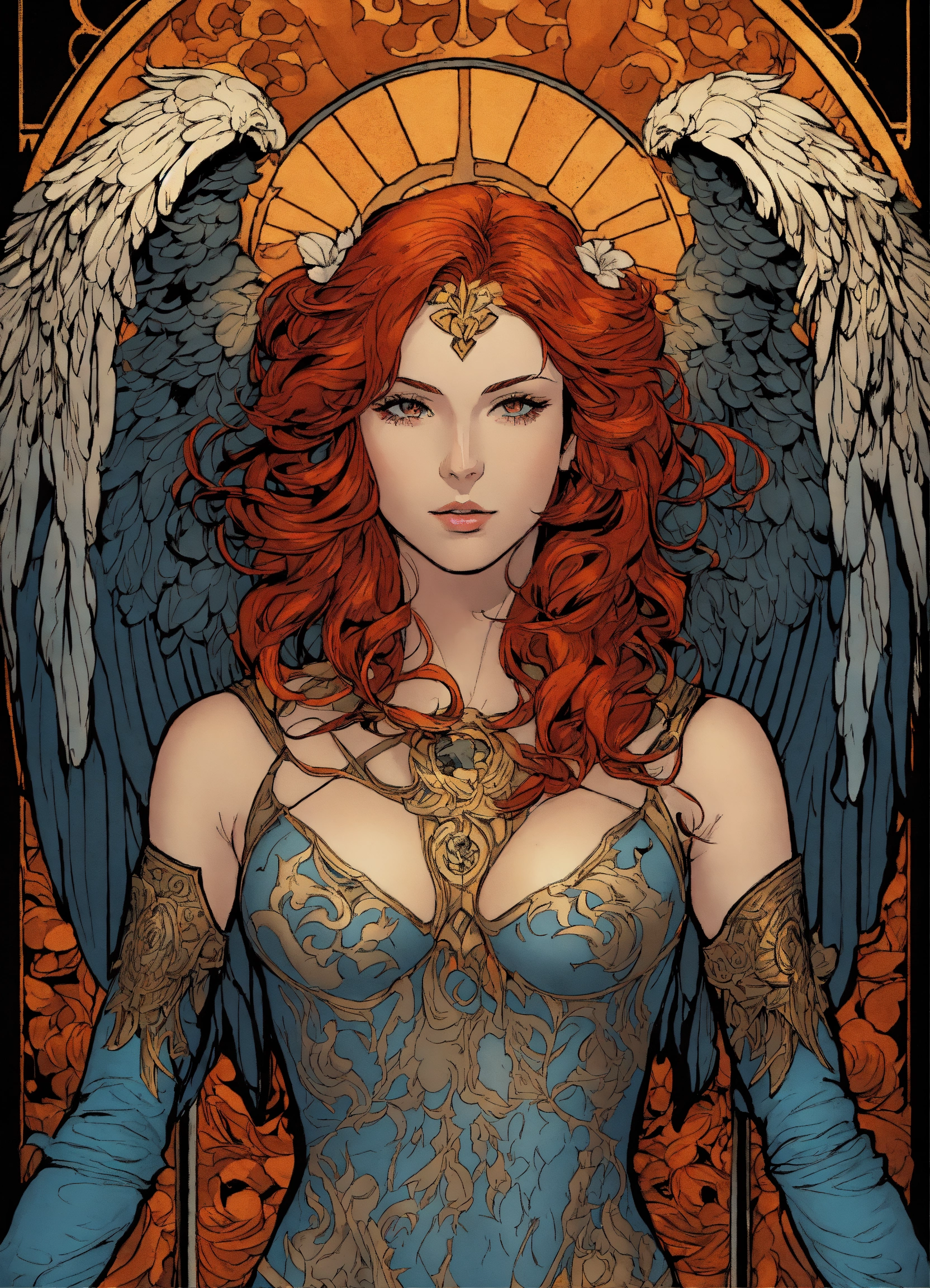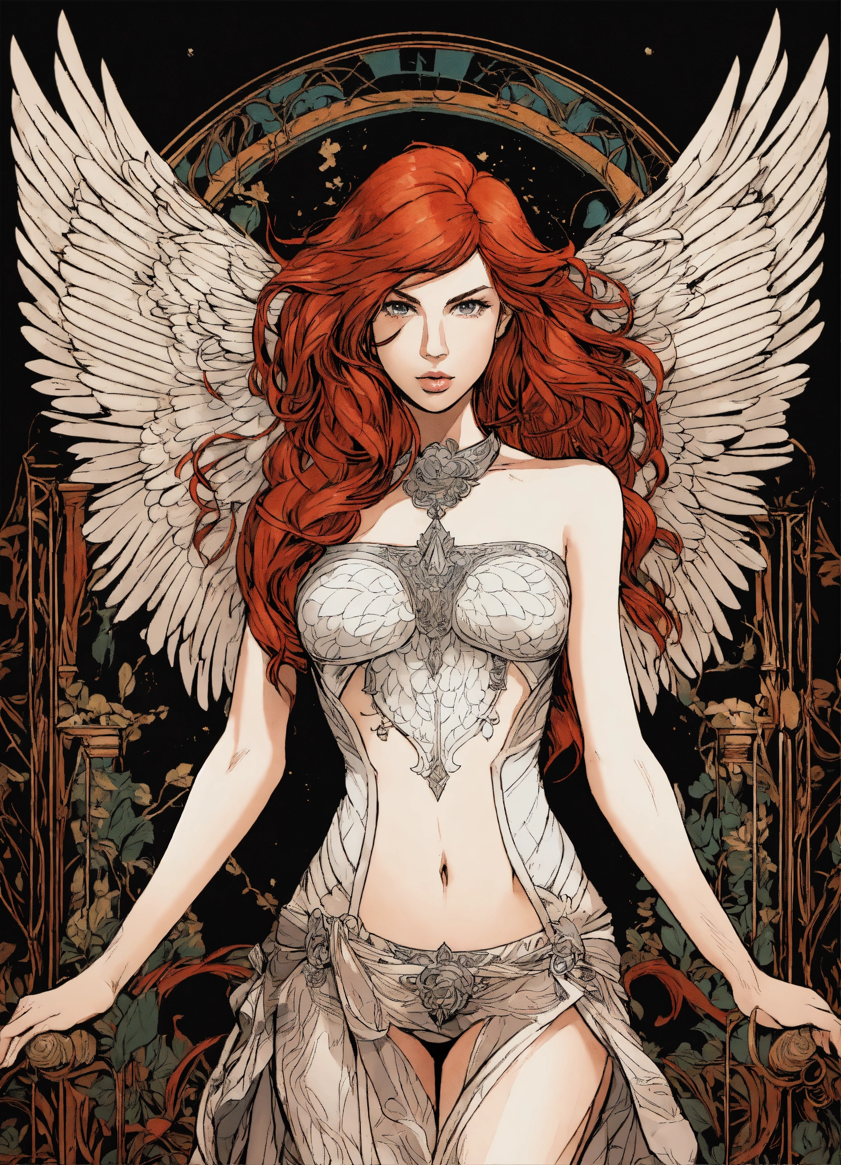 Midshot, mark sylestri ´s darkness comic book style, centered image, ultra detailed illustration of a full body gorgeous redhead angel (tetradic colors), inkpunk, ink lines, strong outlines, art nouveau, art by sylestri, bold traces, unframed, high contrast, cel-shaded, vector, 32k resolution, best quality