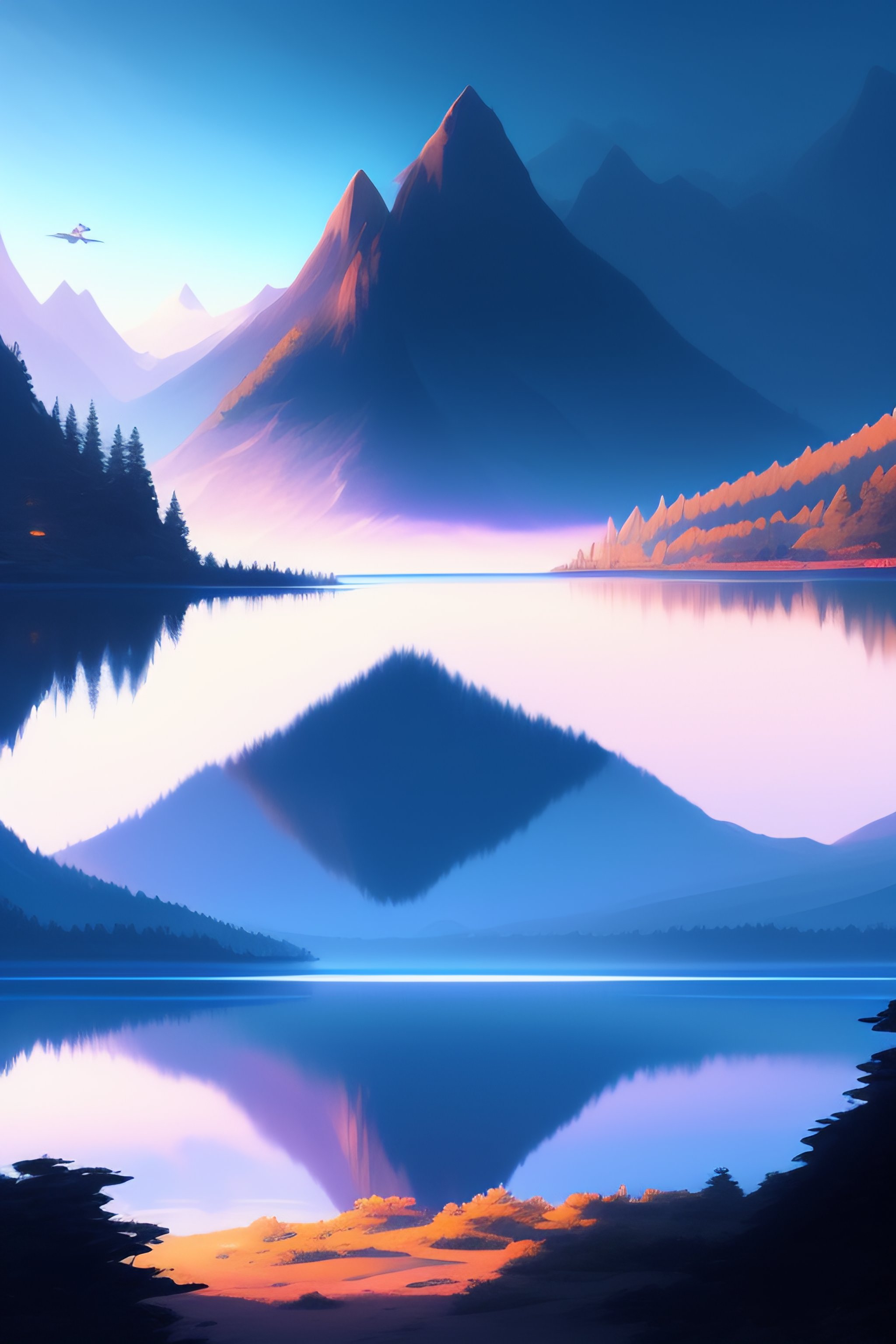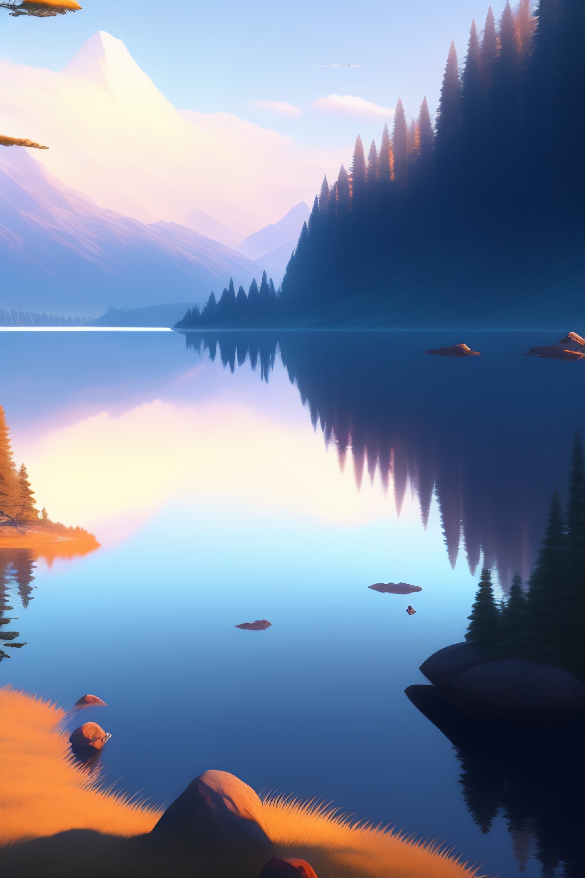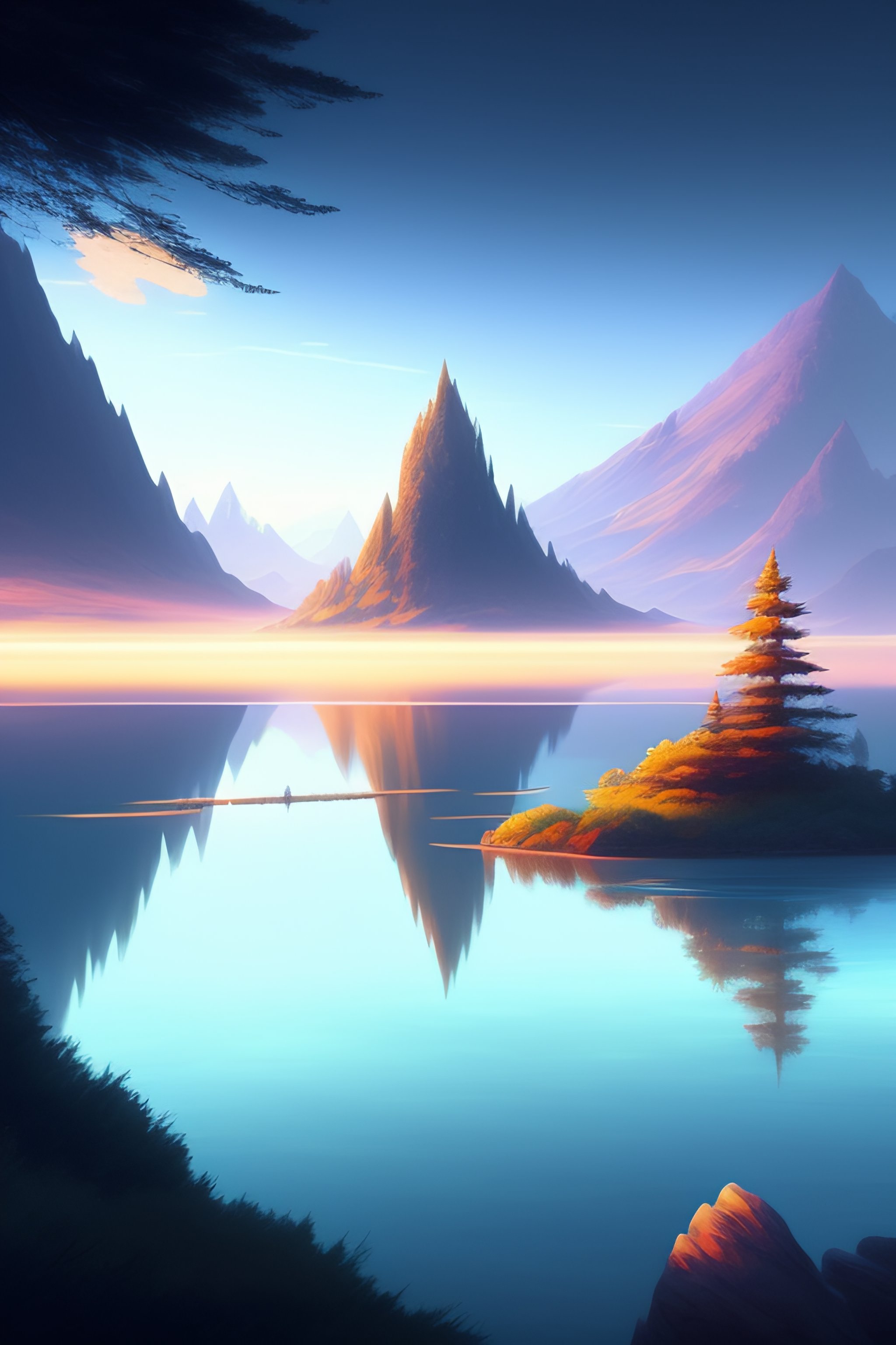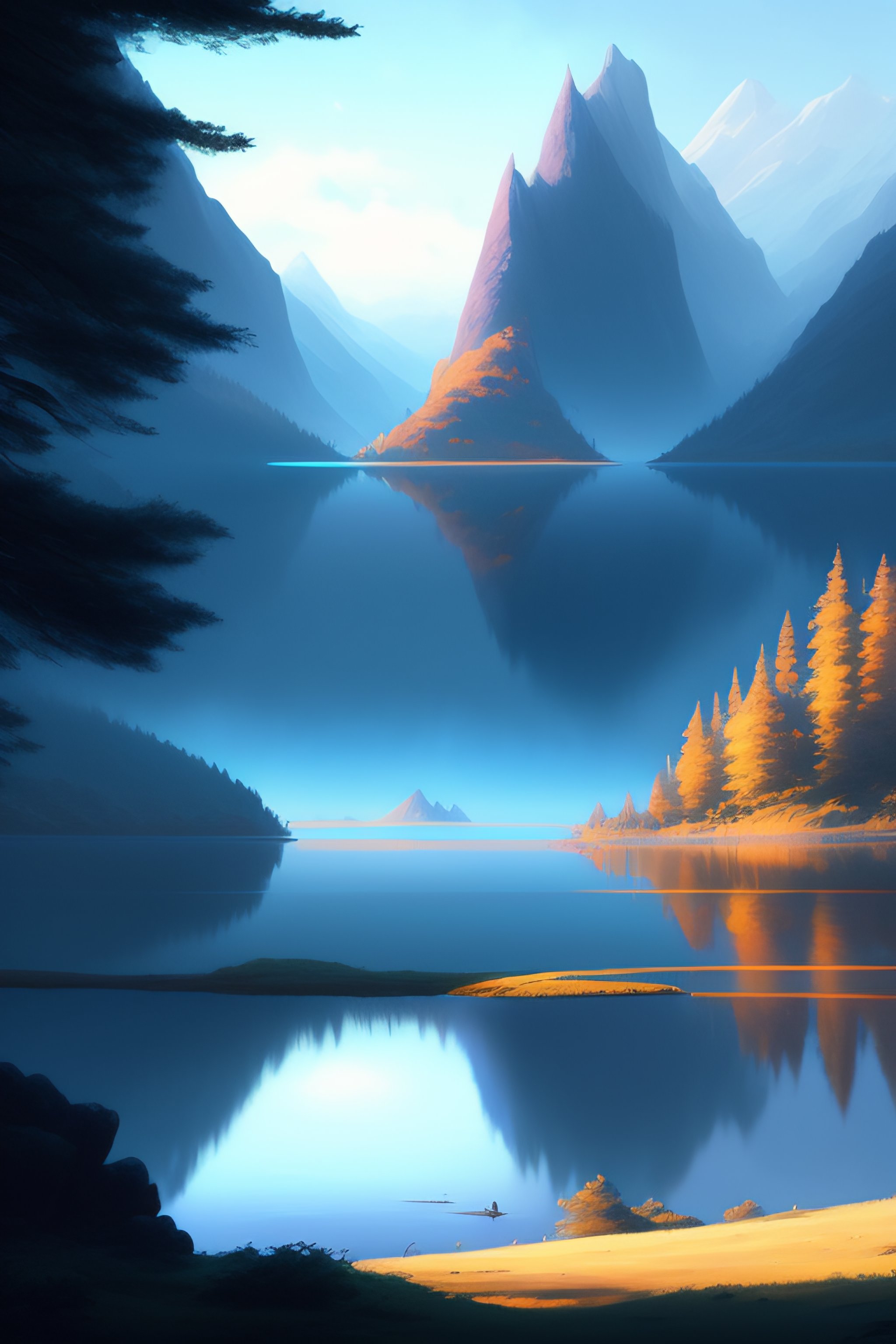 Large lake with a forested island in the middle, cinematic view, blue sky, detailed, concept art, low angle, high detail, realistic, warm lighting, volumetric, godrays, vivid, artstation, digital painting by jordan grimmer and greg rutkowski