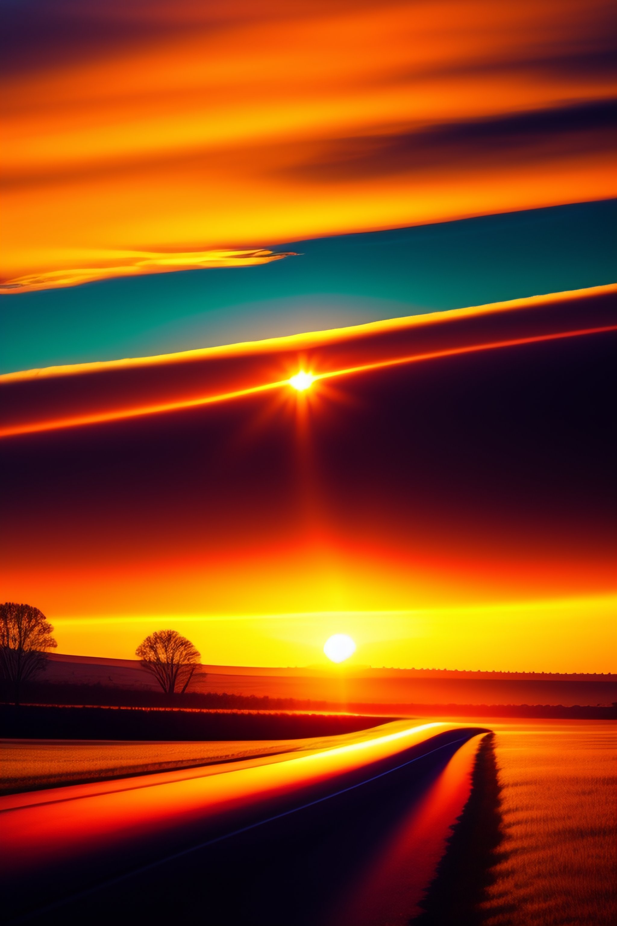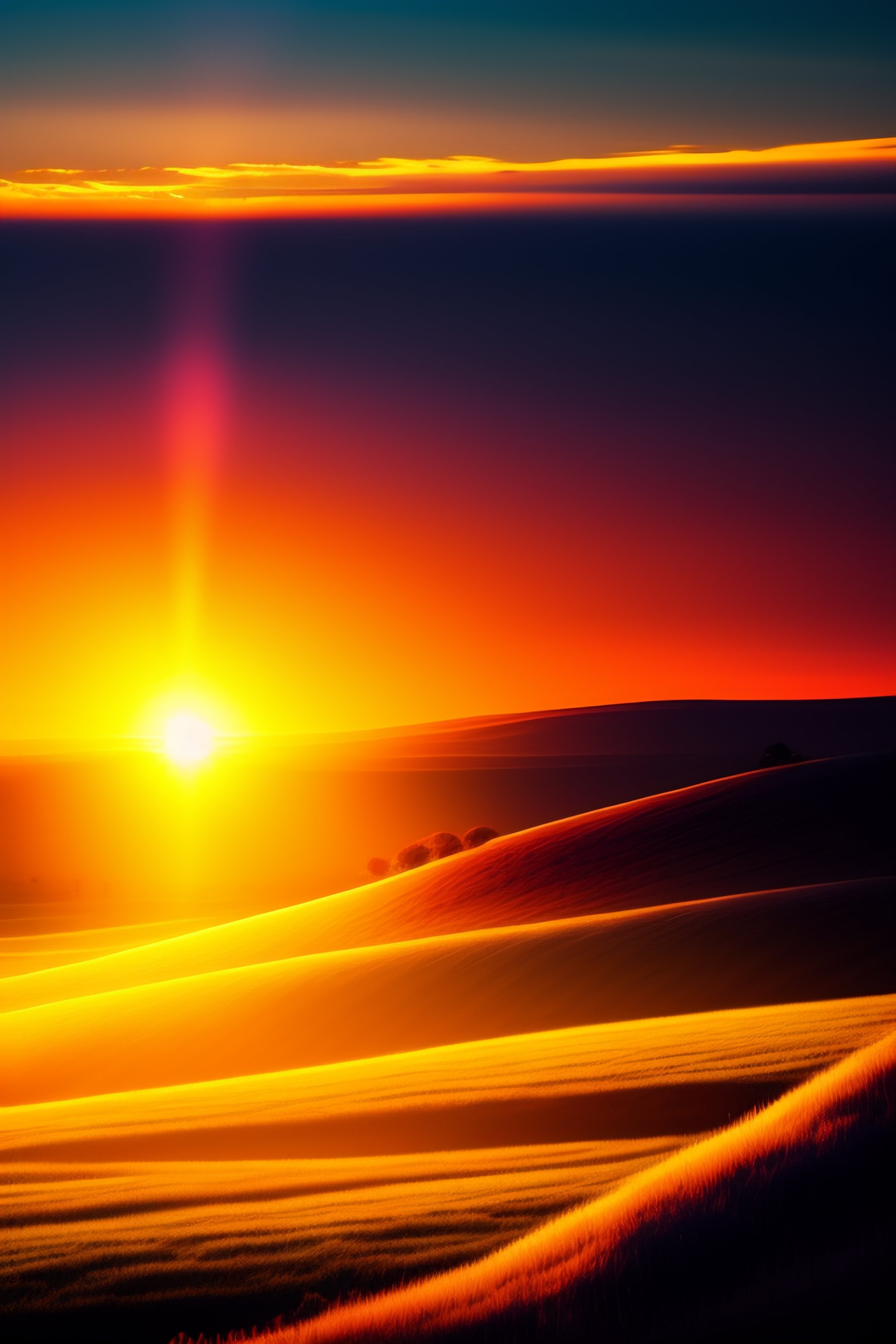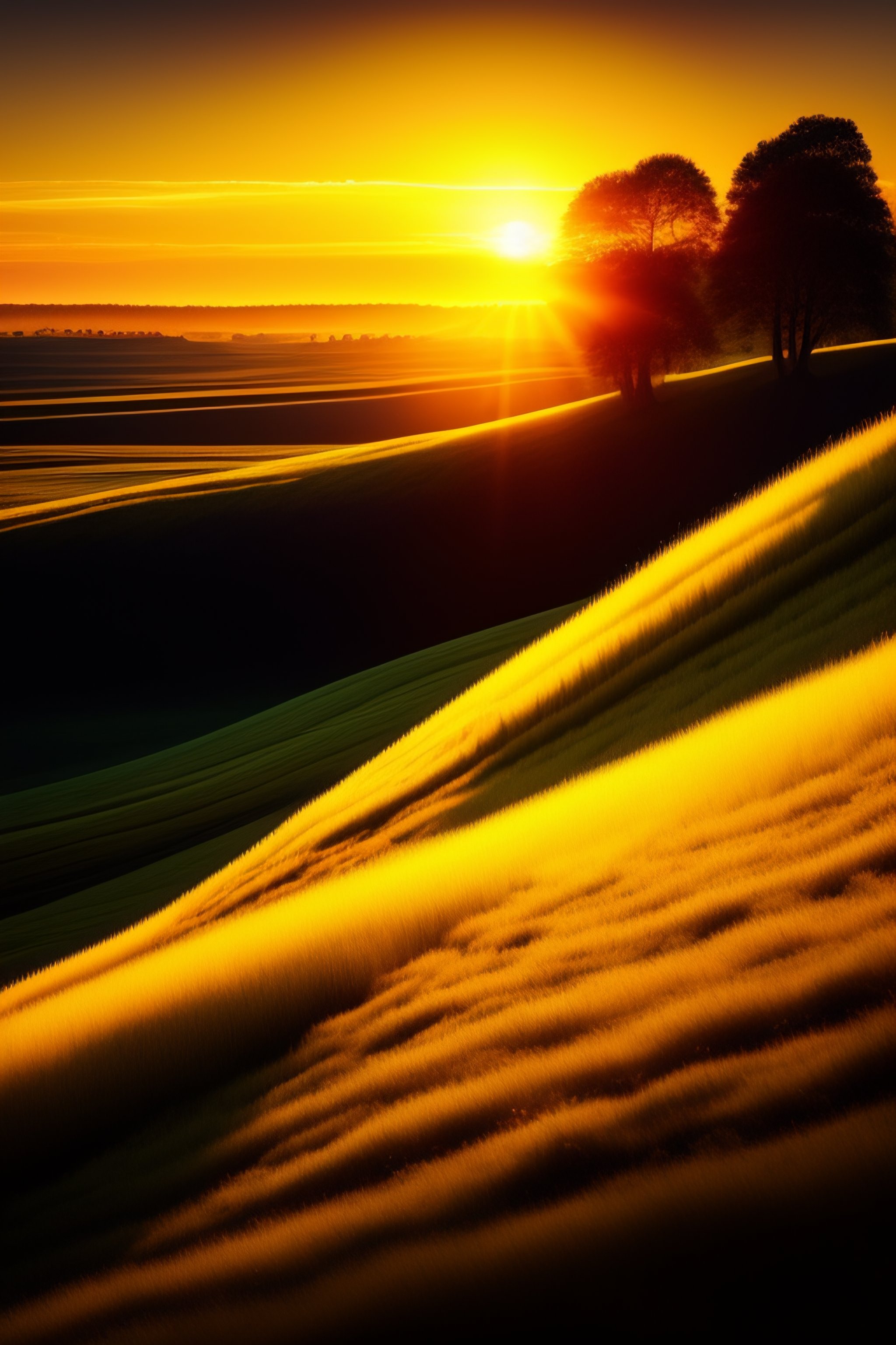 Sunset landscape, beautiful sunrays, depth of field, lovely, optimistic, bold colors, yellow, shadows