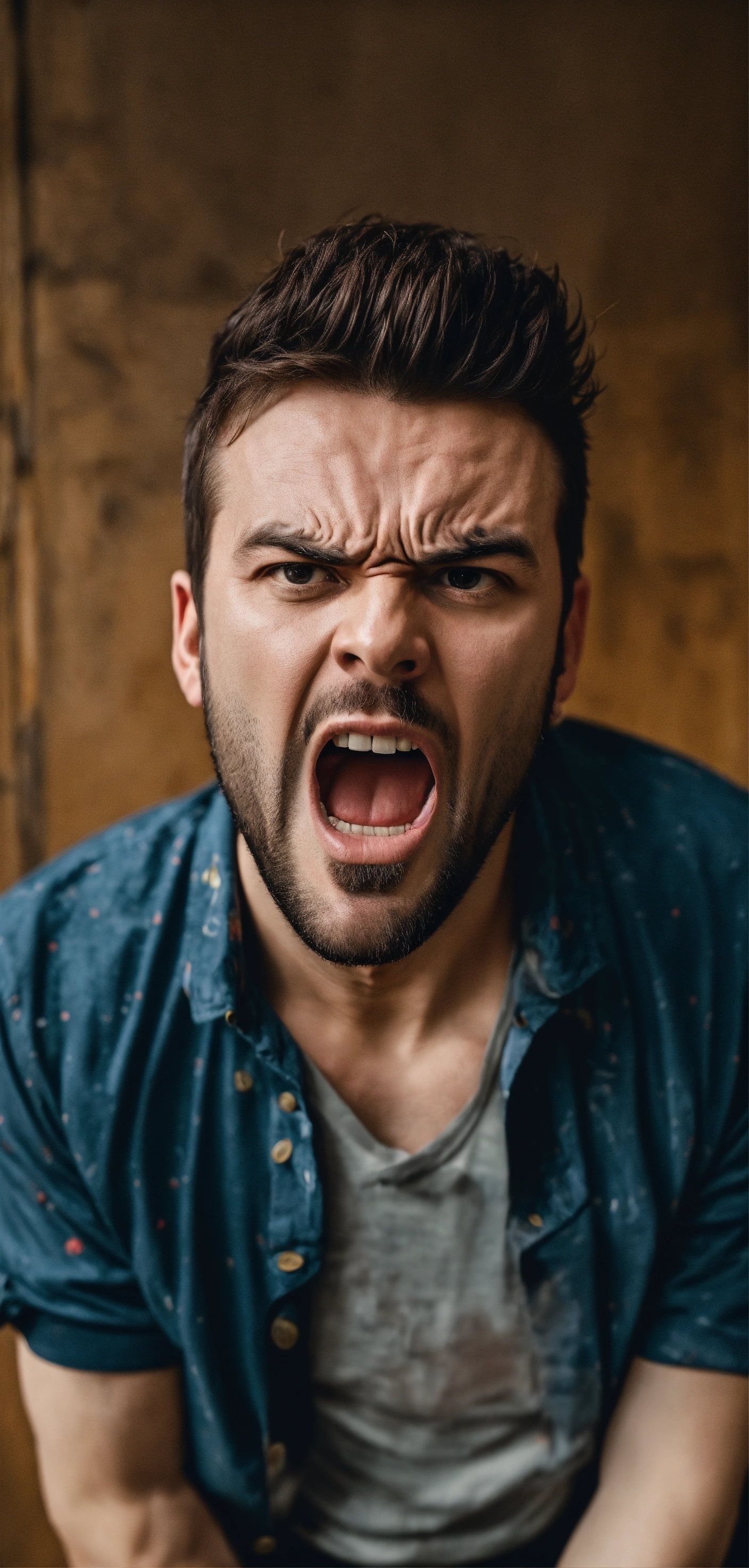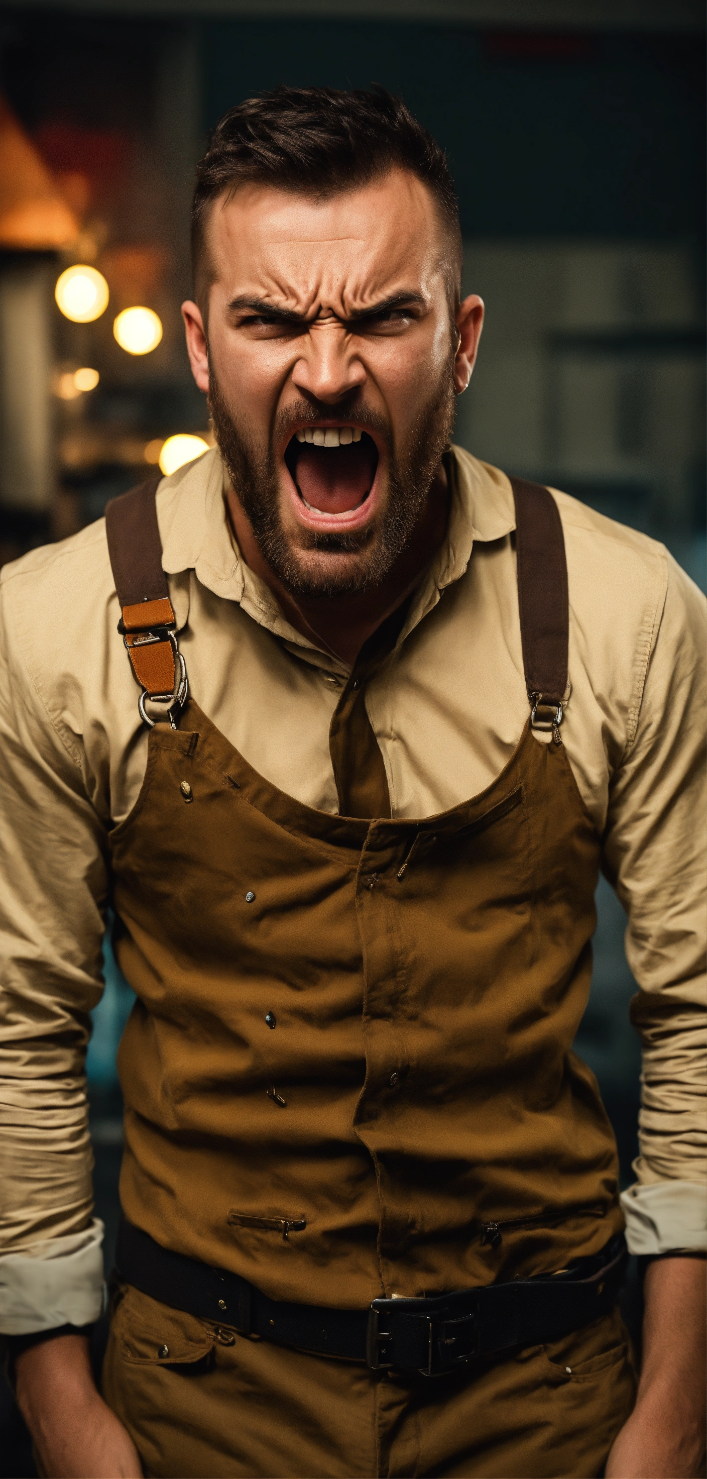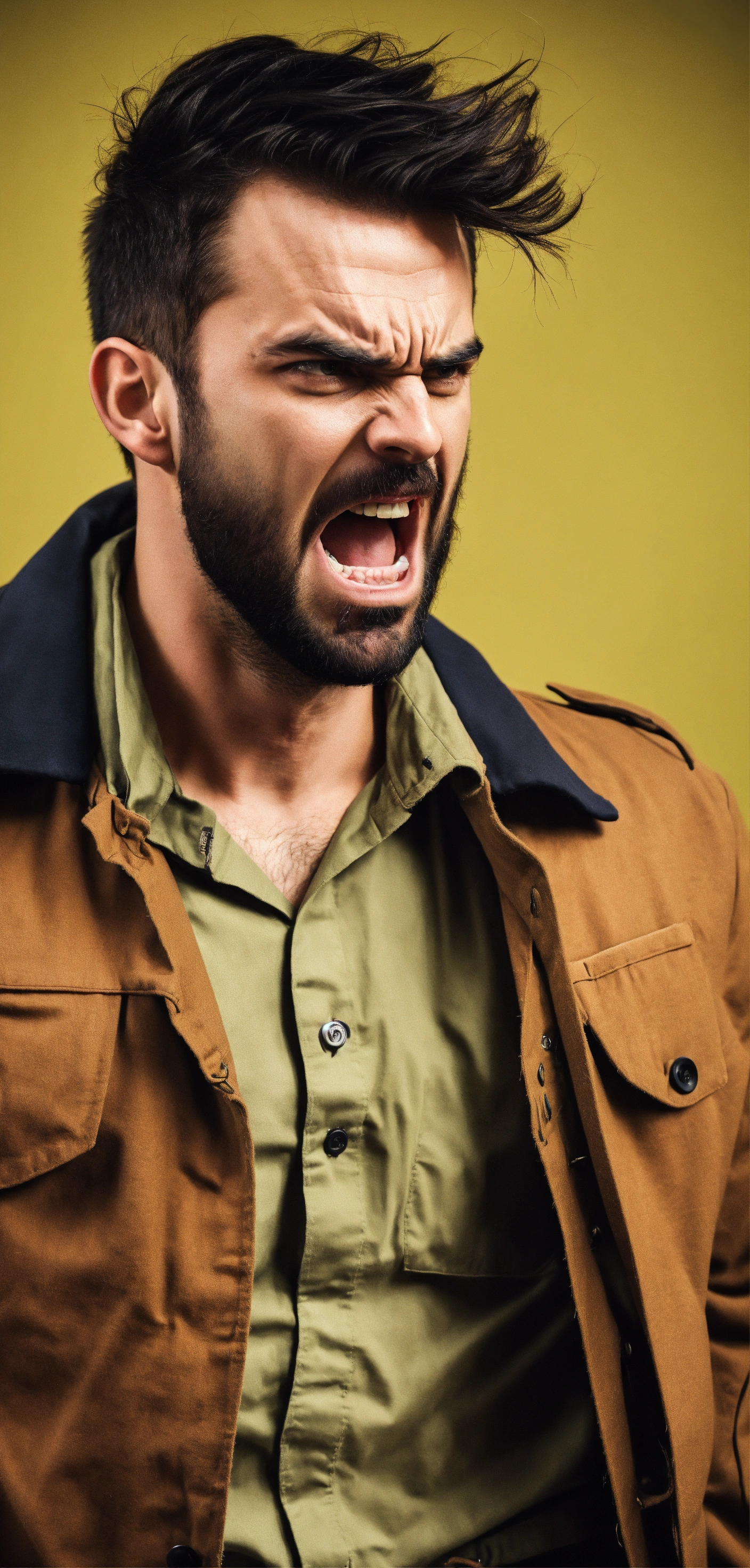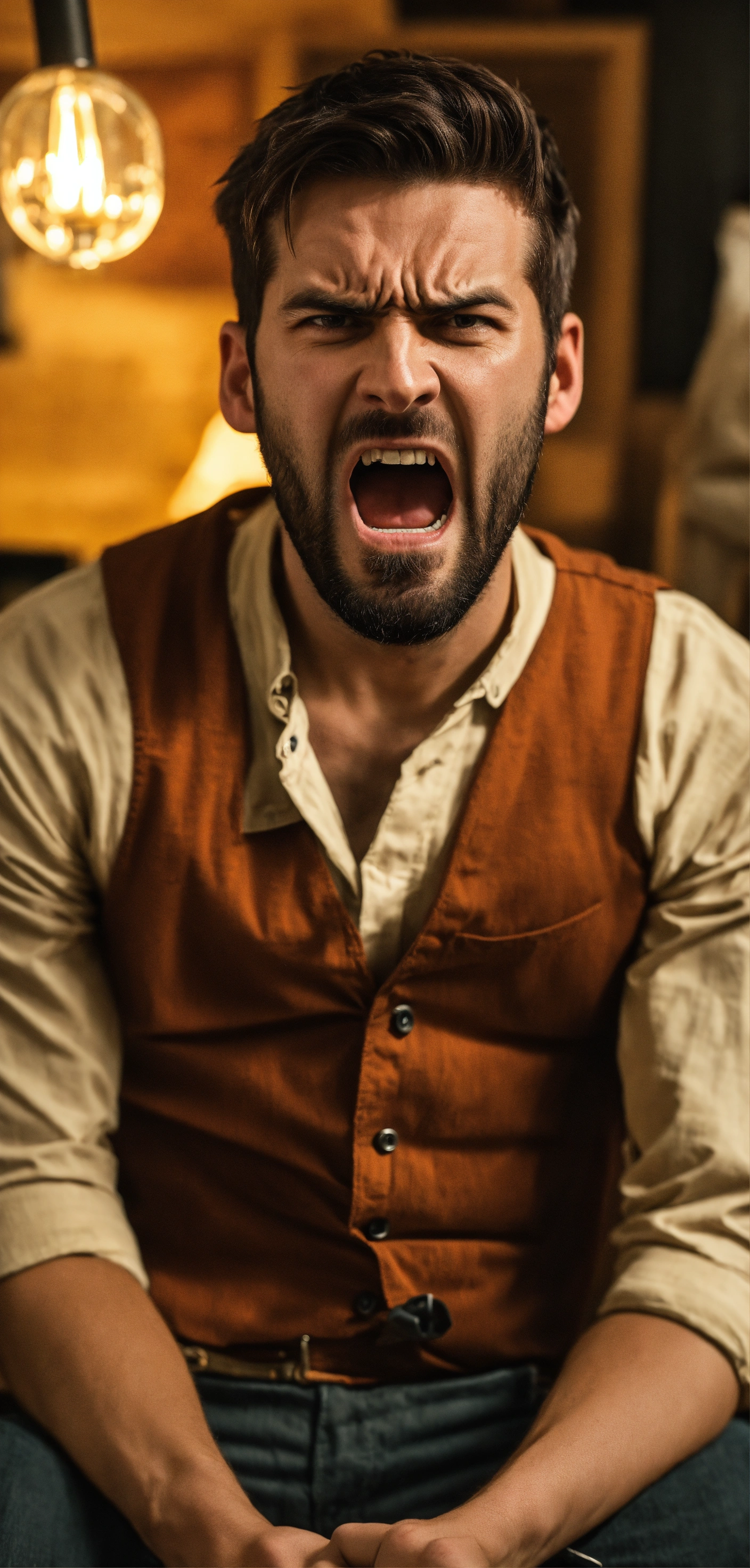 A very angry man in his 30s, tyrant, in homemade clothes, shouting at someone and looking at the camera
