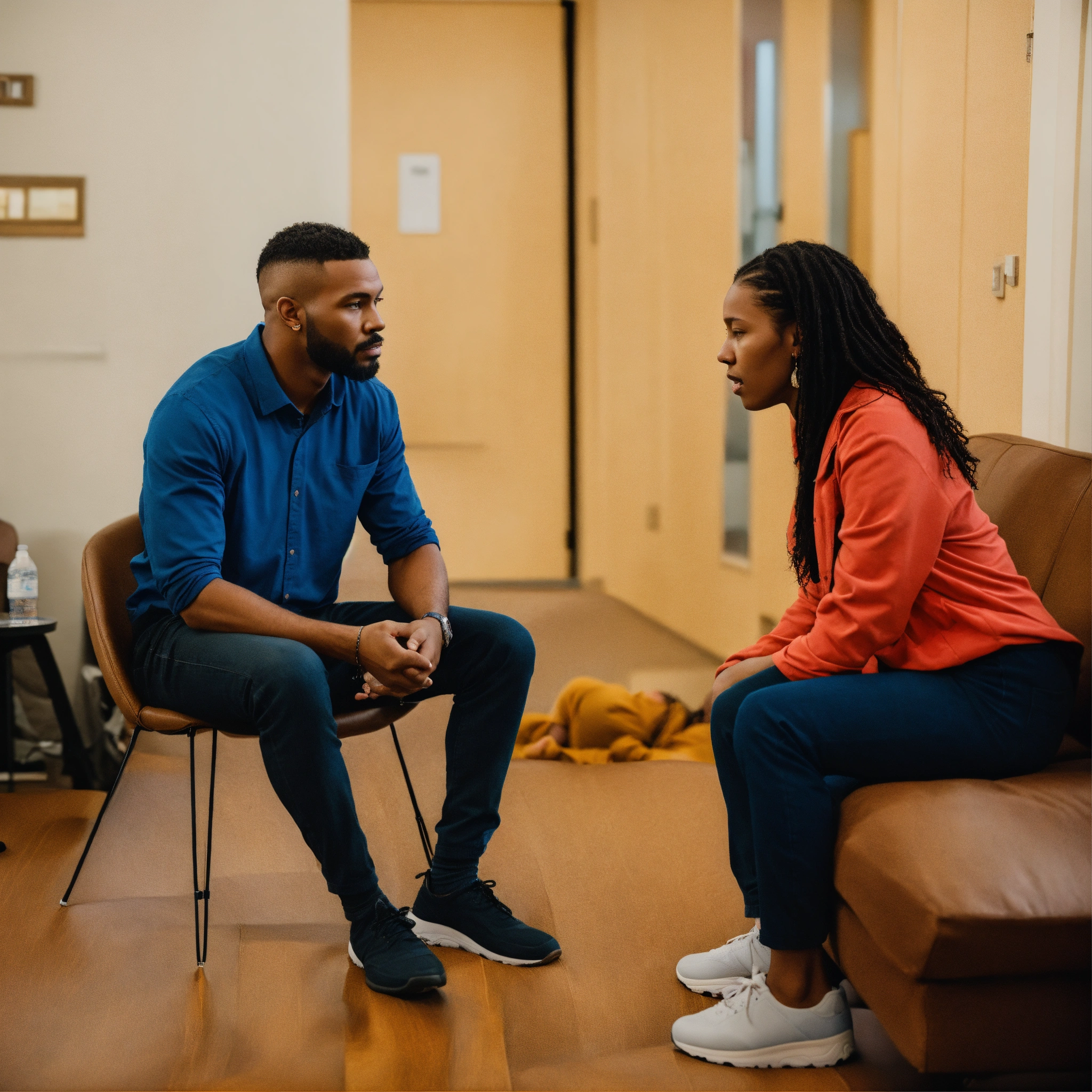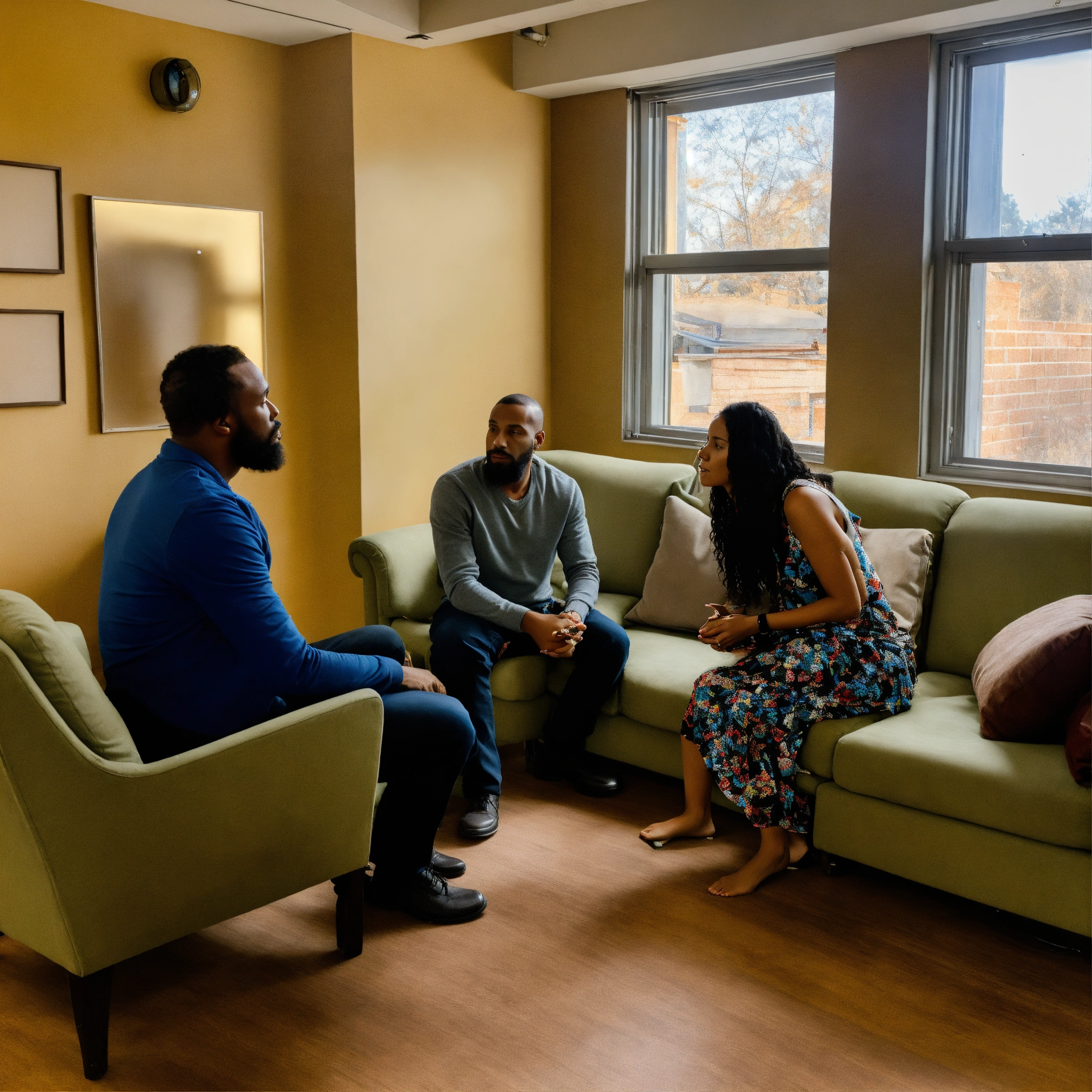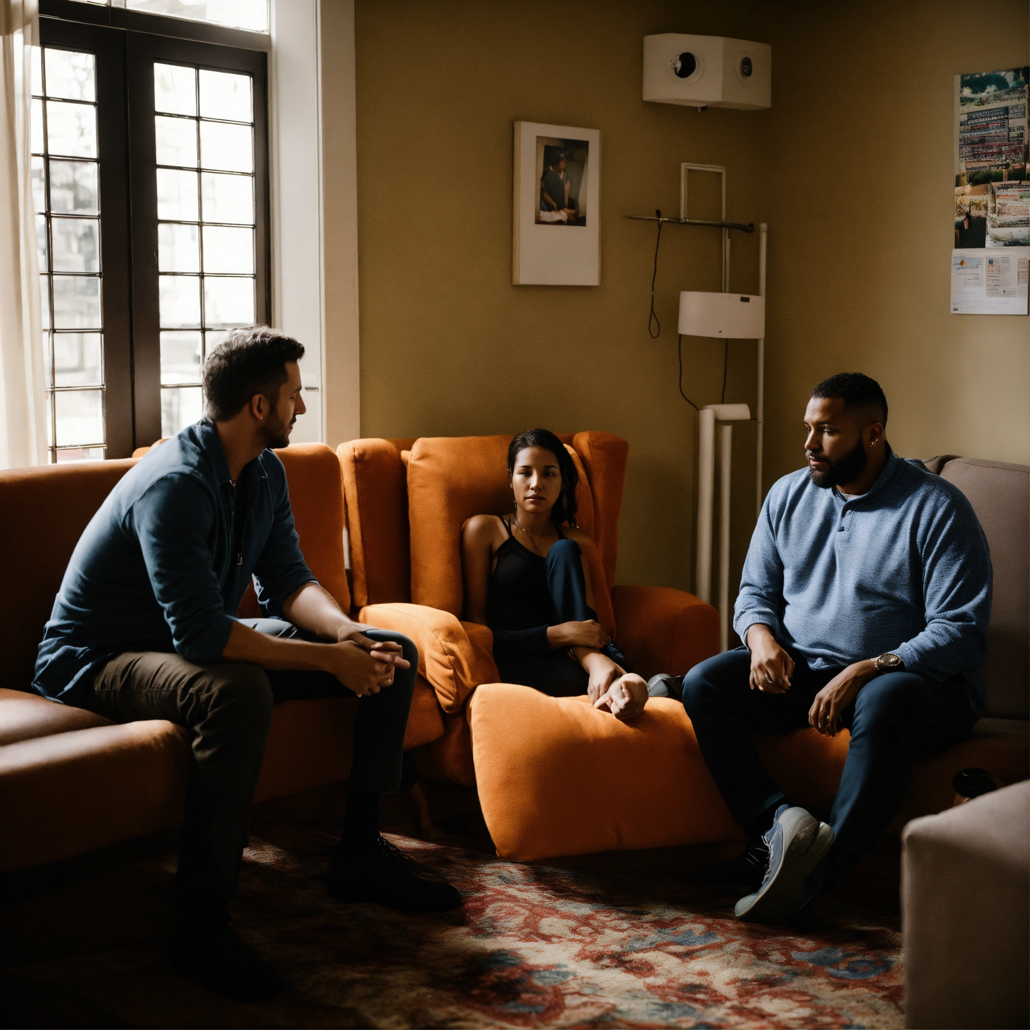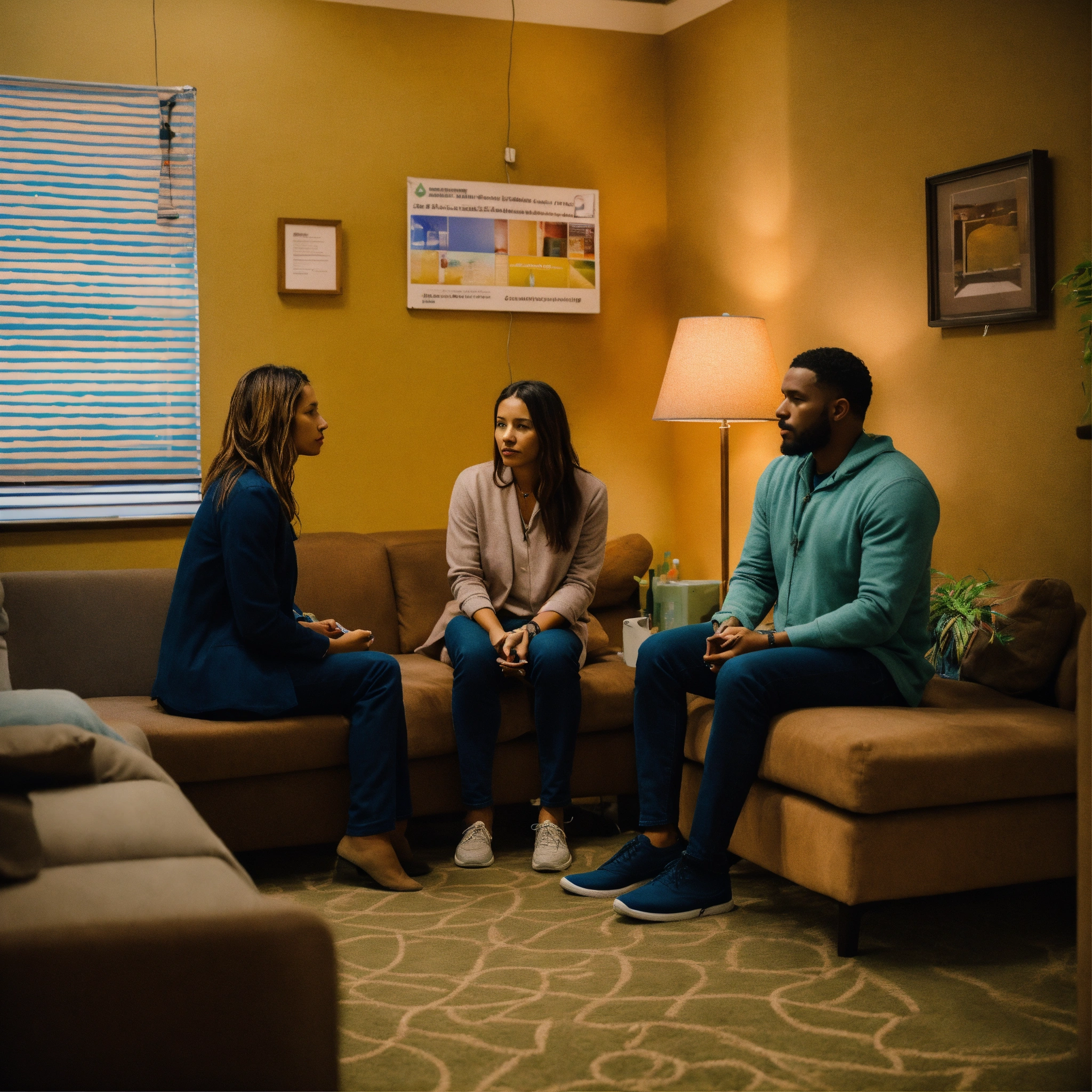 A photo of a man and woman in a recovery center, the man and woman are sitting on a couch, they are talking to a therapist