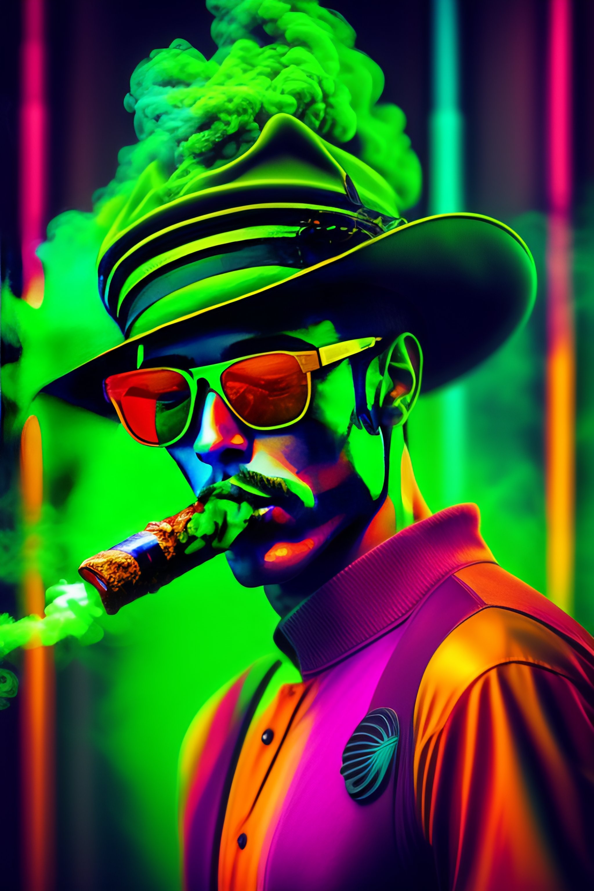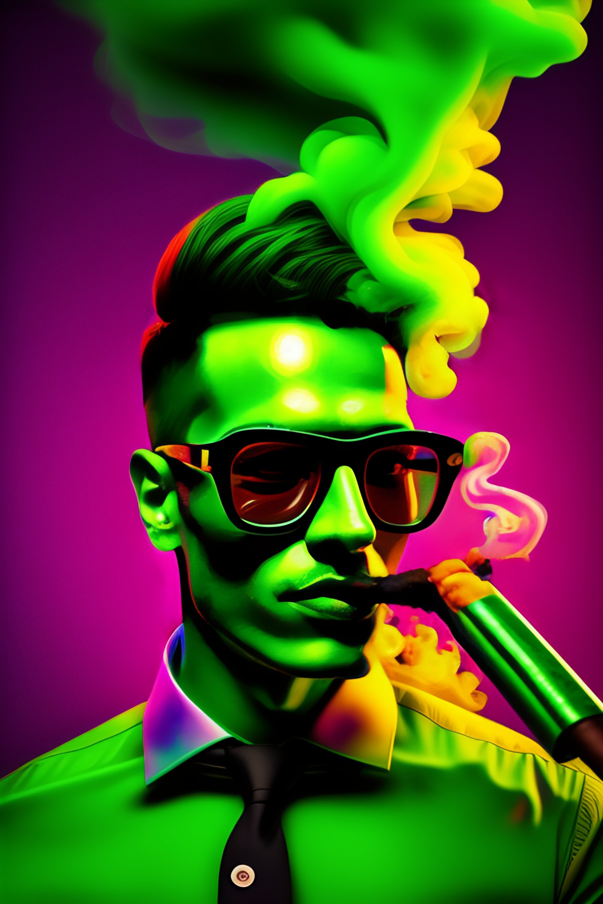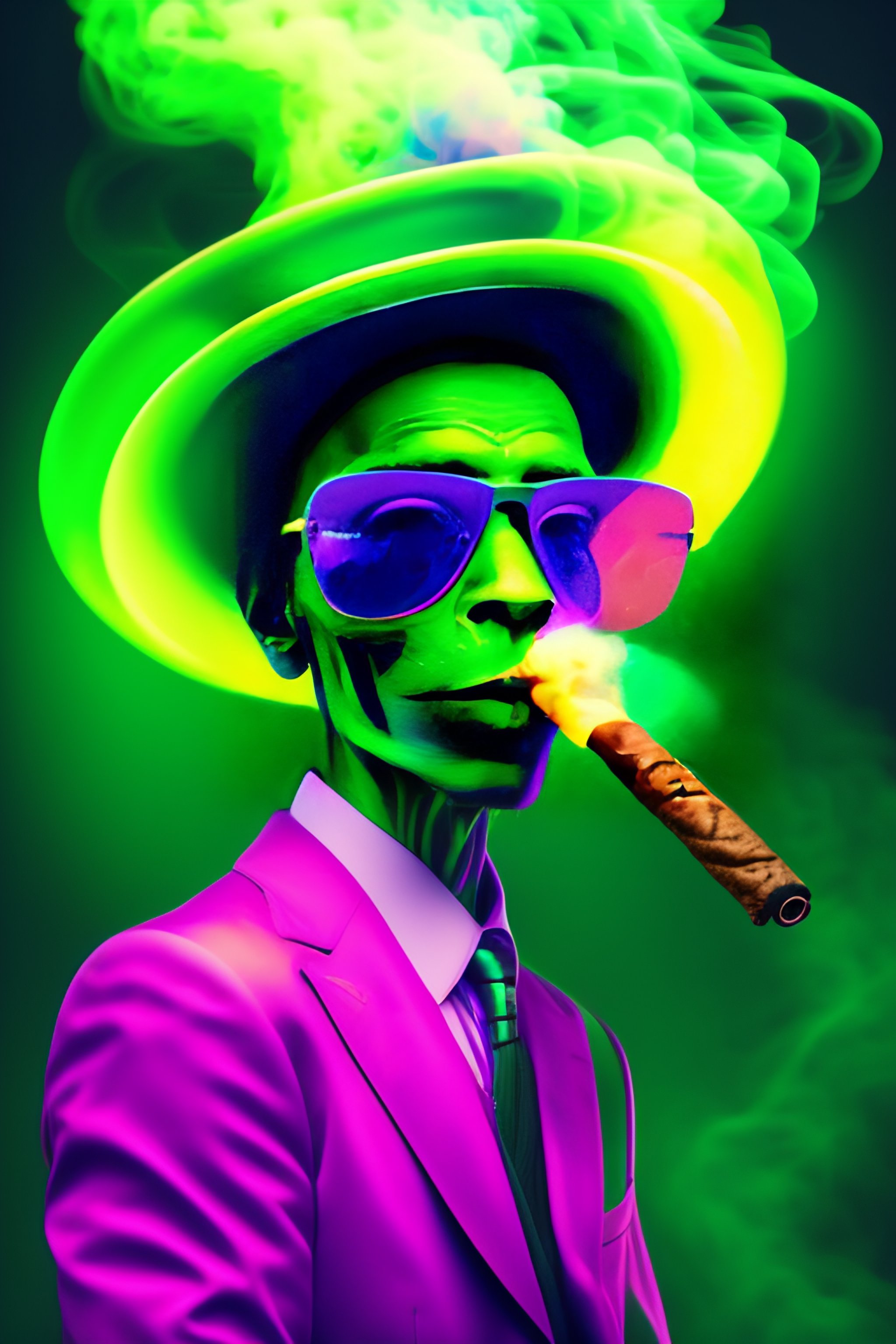 Green alien face cartoon smoking cigar with nice smoke effects, trippy glasses, colorful clothing, background