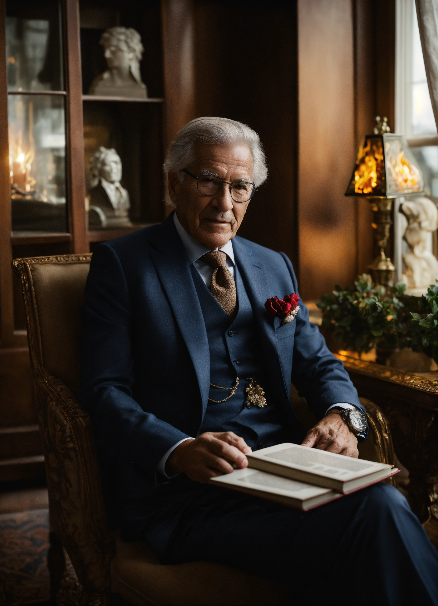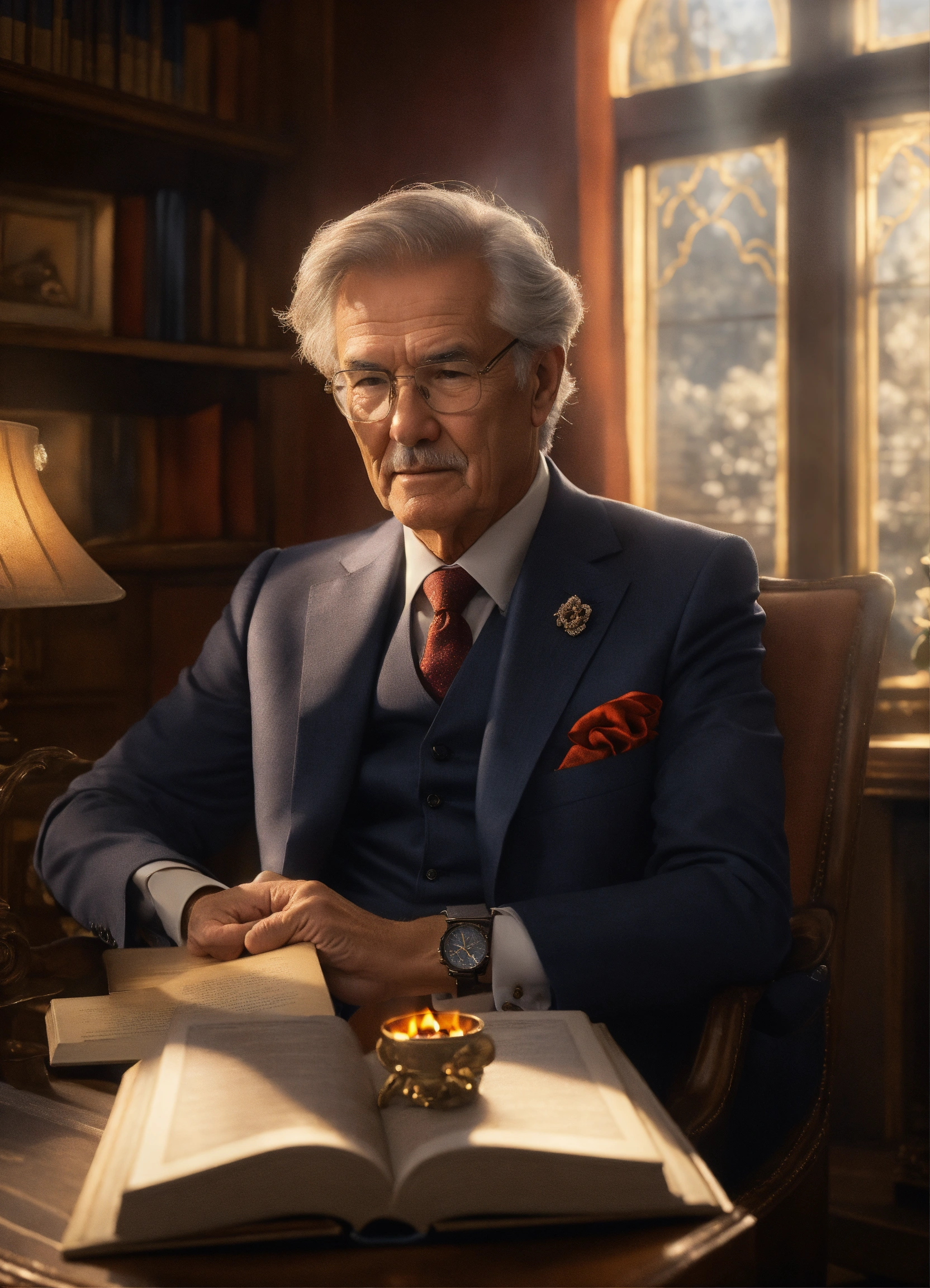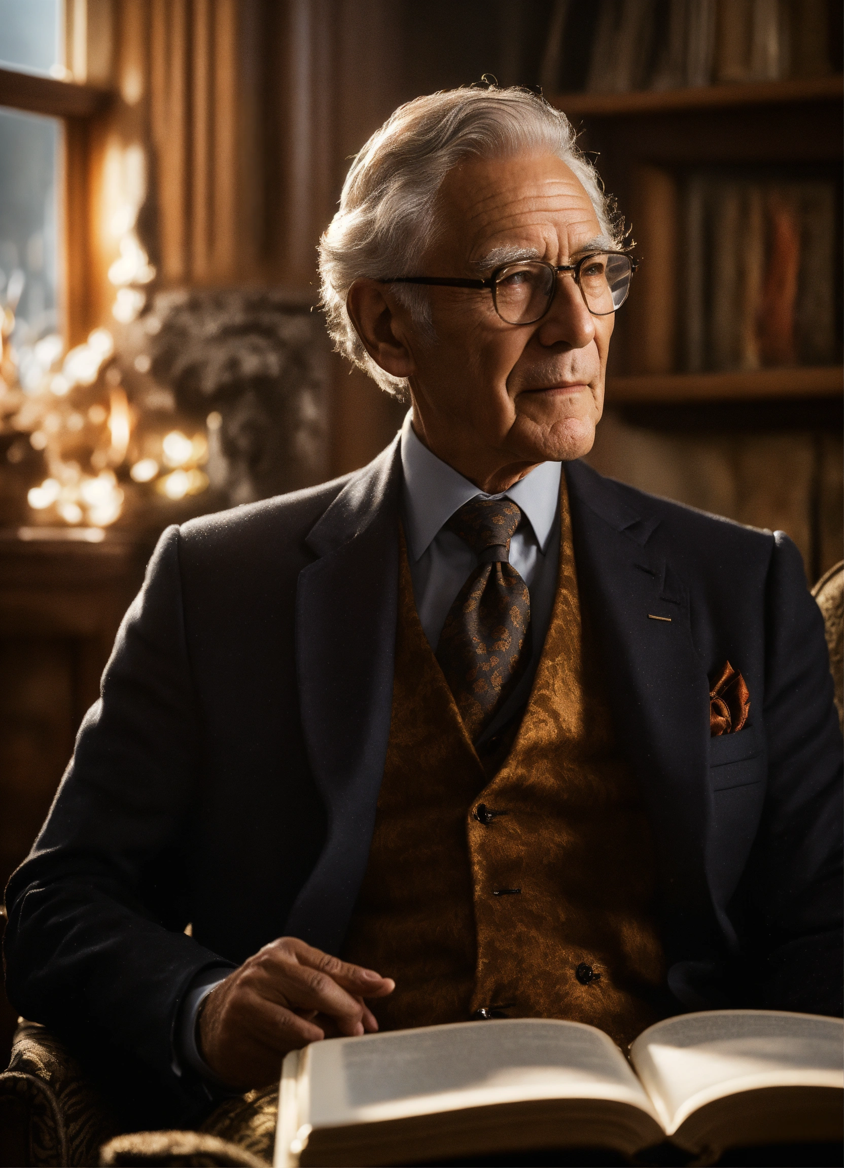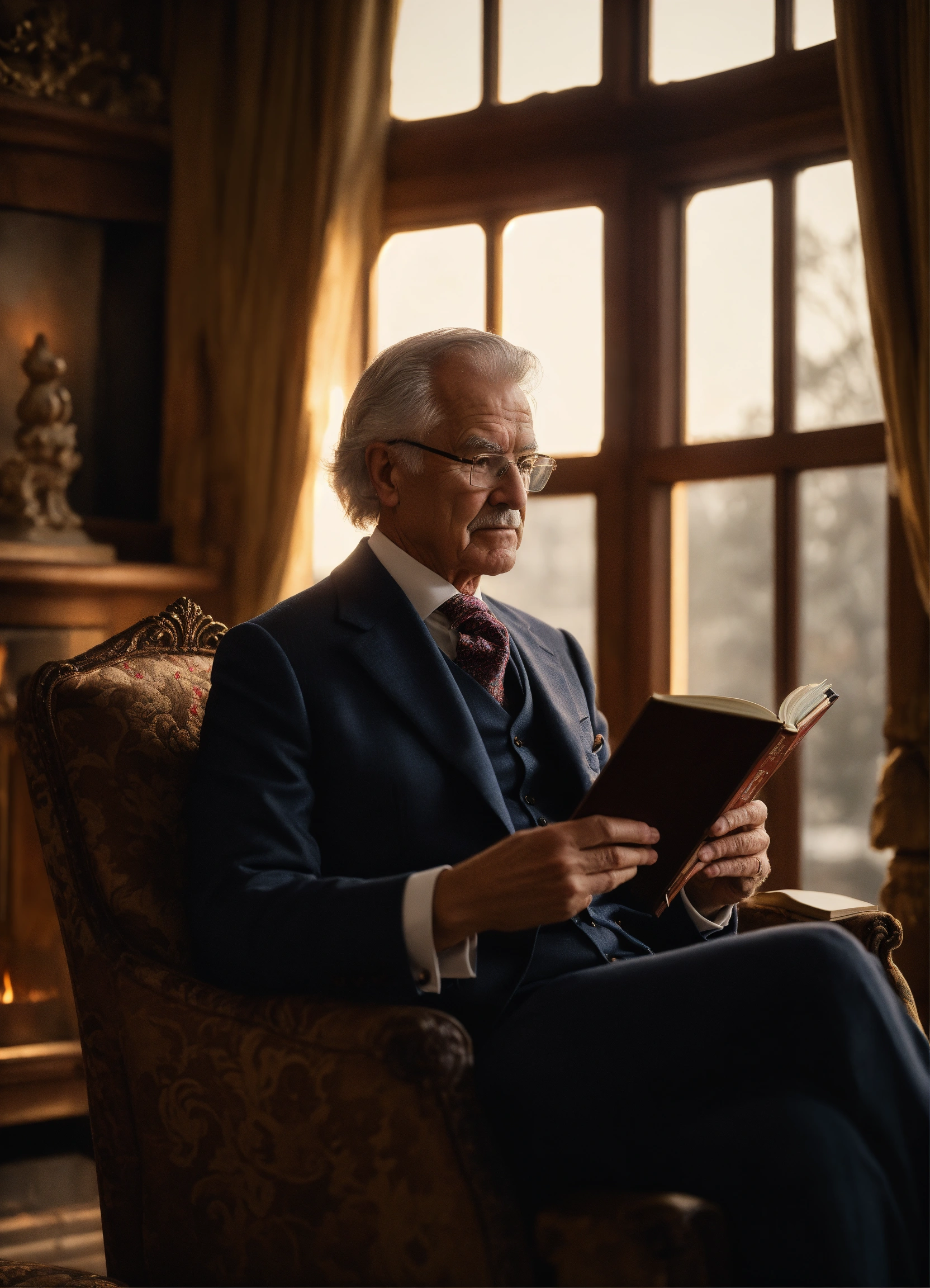 N a heavenly setting, a warm atmosphere reigns around a crackling fireplace, gently lighting the room with a comforting glow. we see a close-up of the bust of an elderly businessman, dressed in an elegant three-piece suit, comfortably seated in an armchair near the fireplace. his silver hair reflects years of experience, and he wears clear, black-rimmed glasses that add to his air of wisdom. he is holding a book in his hand, looking at it intently. behind him, a bay window offers a view of an enchanting winter landscape. the winter sun caresses his confident face, while an elegant watch adorns his wrist, symbolising the precious time he has invested in reaching the summit. an aura of success and confidence emanates from him, an undisputed icon of accomplished entrepreneurship, ready to guide those who aspire to follow in his footsteps towards a bright future.