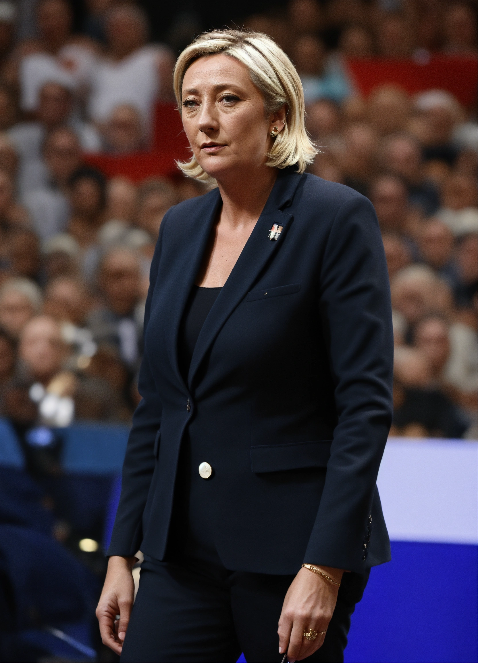 Marine le pen en maillot de bain une piece noir très brillant et en escarpins