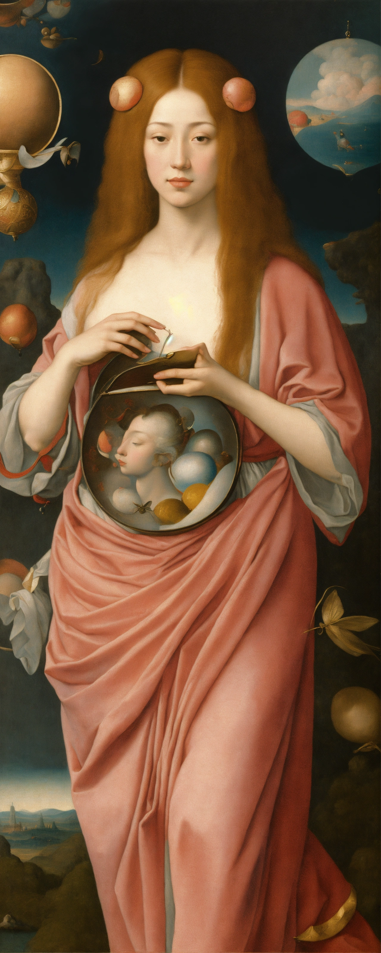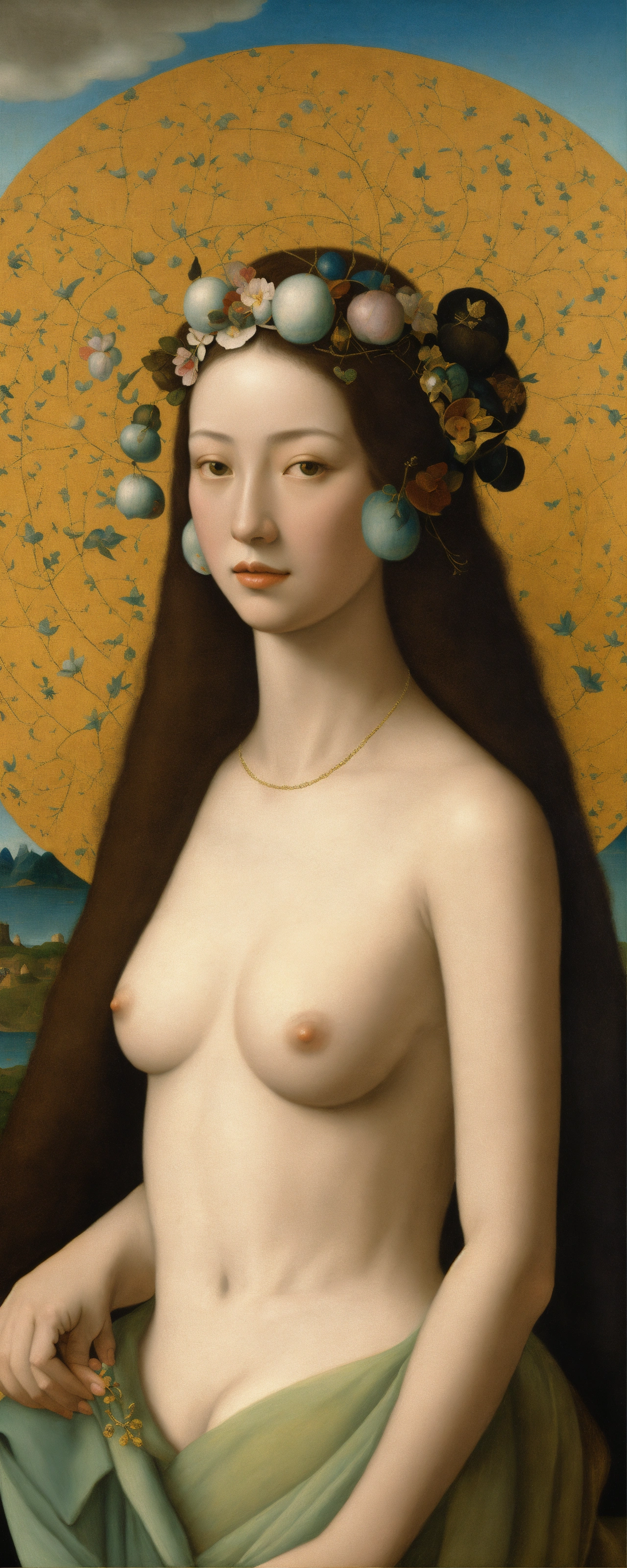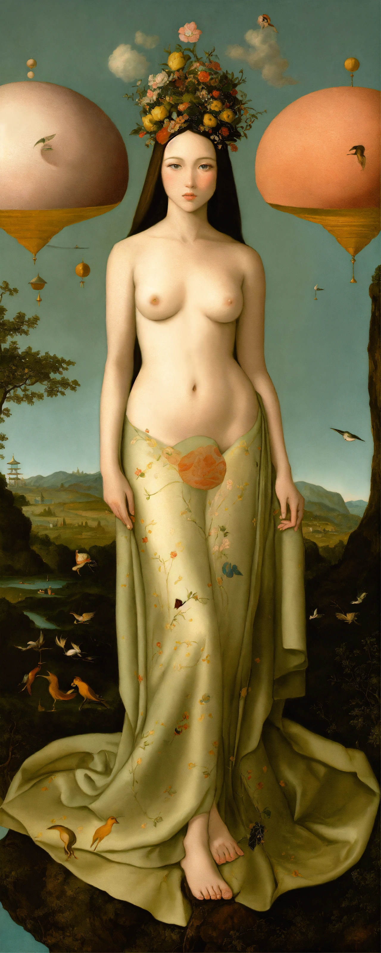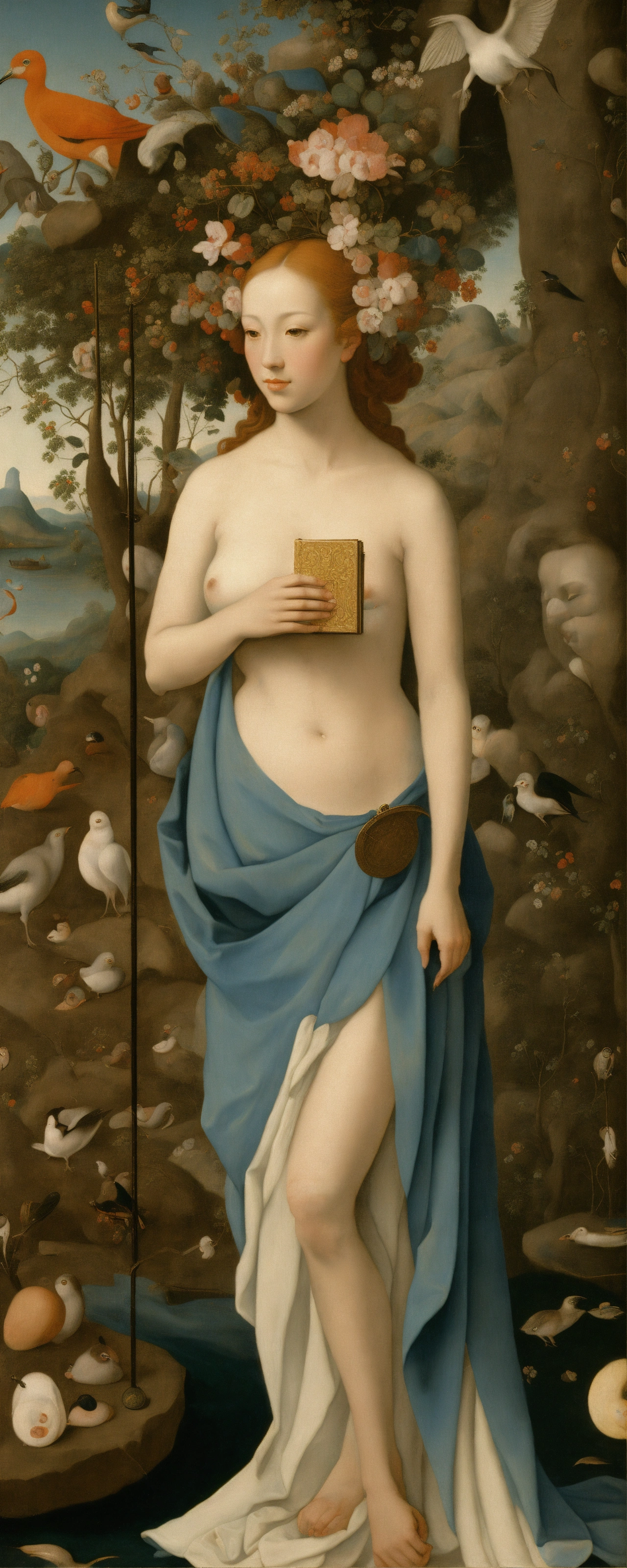 Portrait of aphrodite with a japanese face in the book of enough, illustrated by hieronymus bosch and rene magritte, 64k resolution, highly-detailed surrealistic forbidden painting, the year 2067