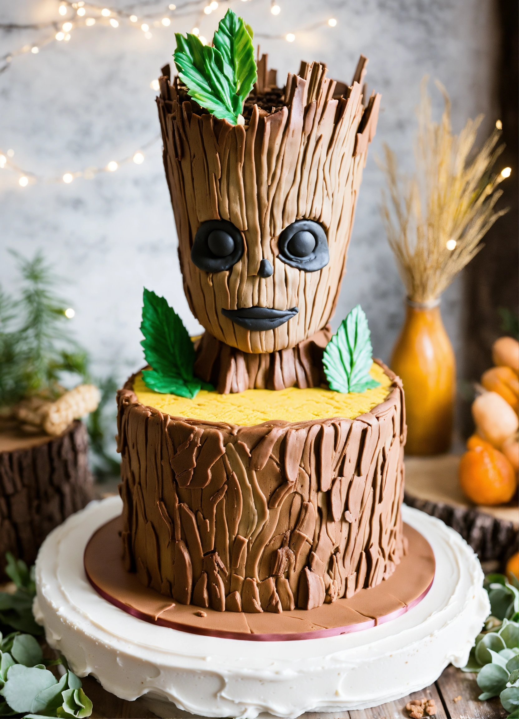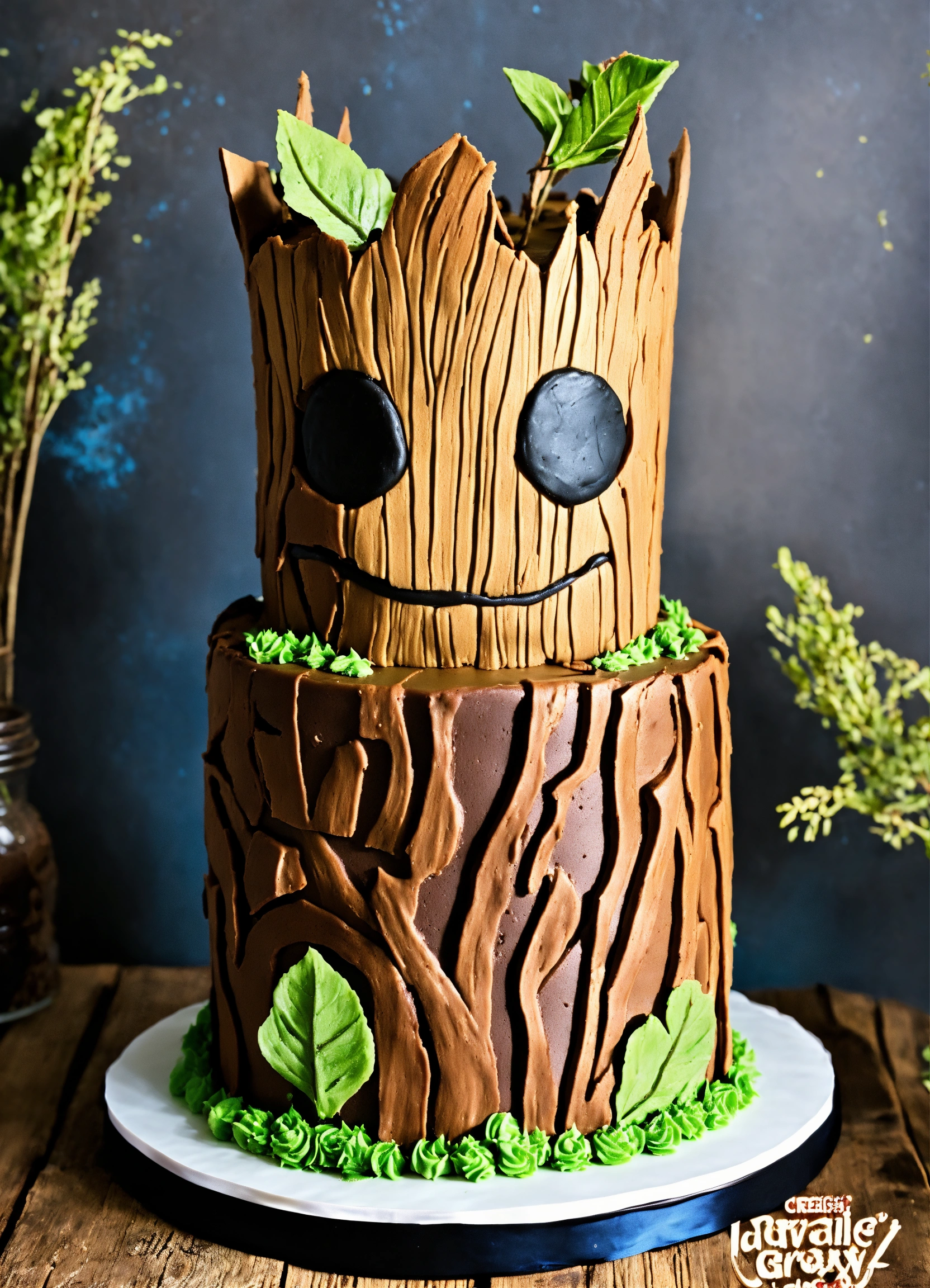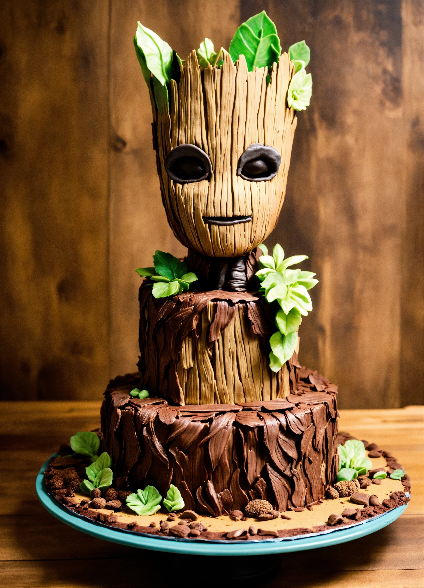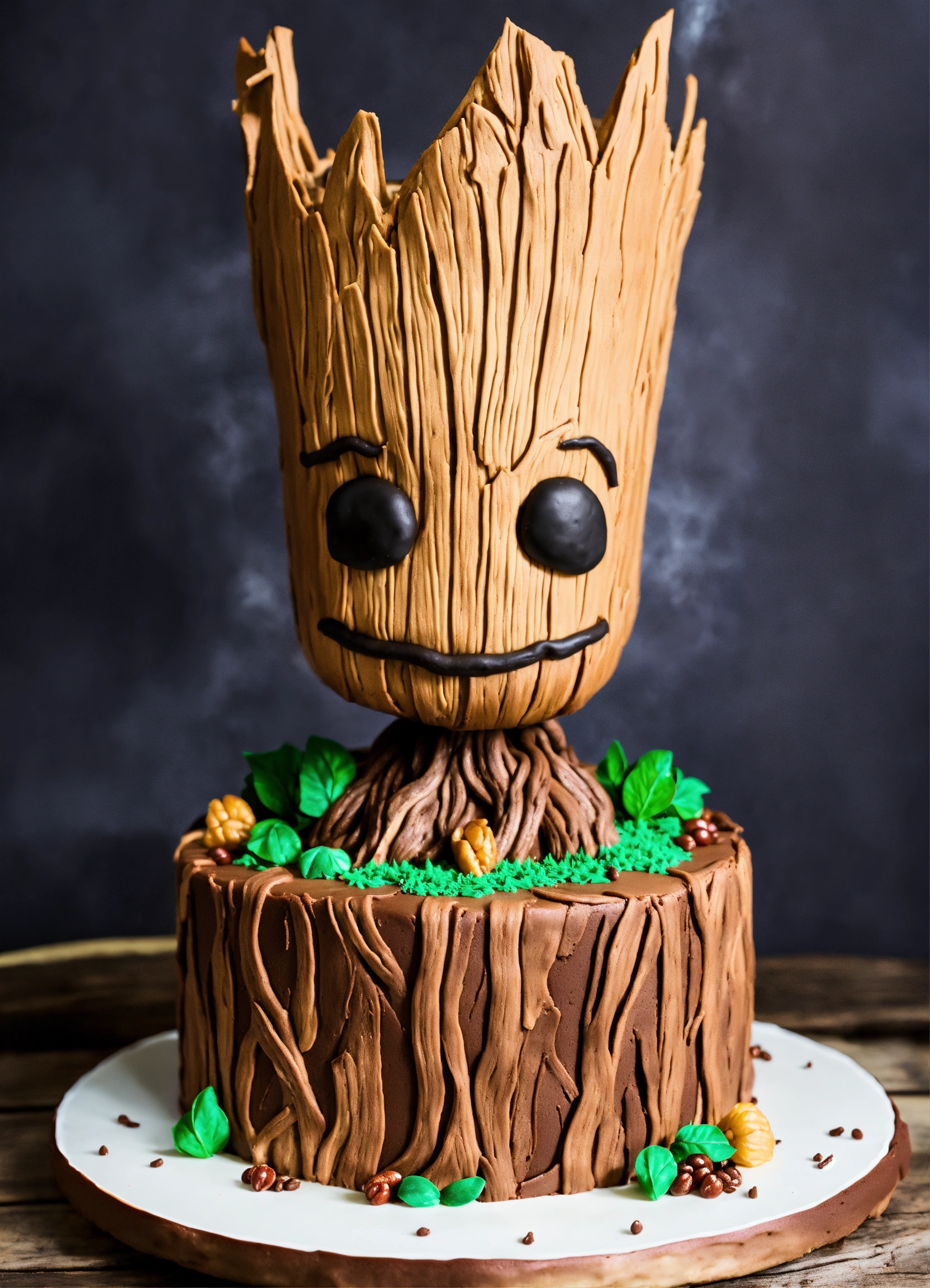 Design a cake inspired by groot, the lovable guardian of the galaxy. incorporate earthy colors, woody textures, and groot's iconic features into the cake design. create a delicious and visually appealing cake that reflects groot's nature-inspired character.
