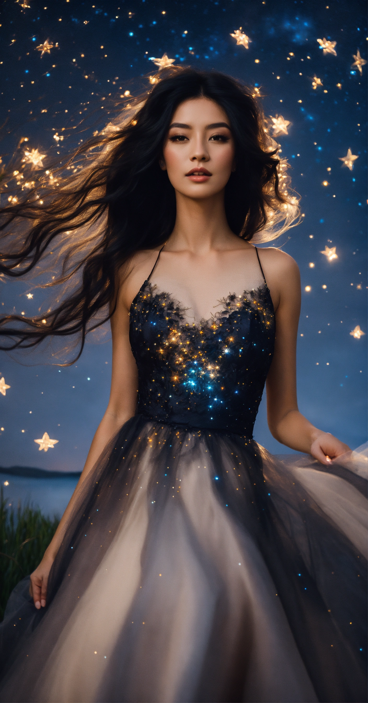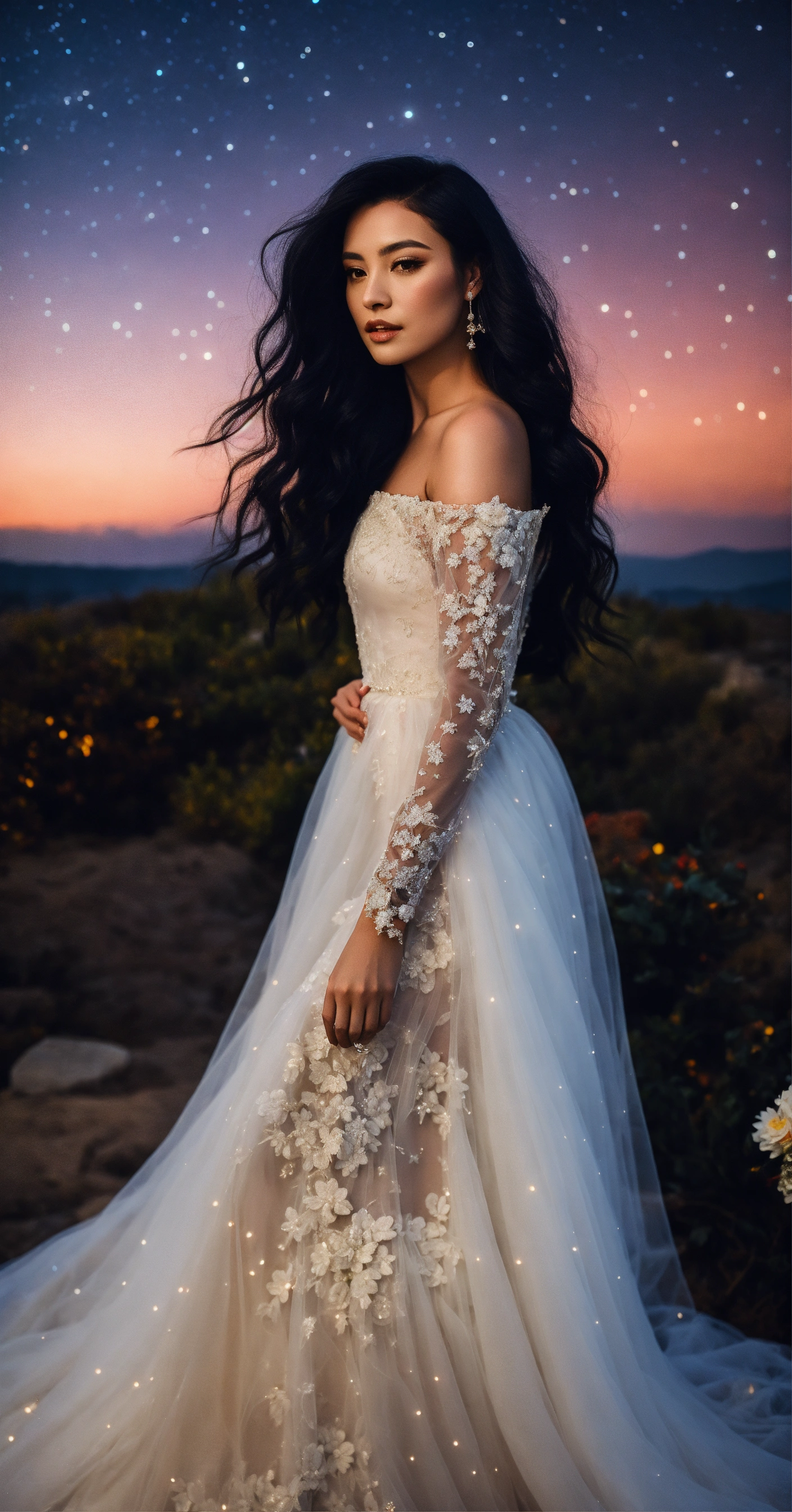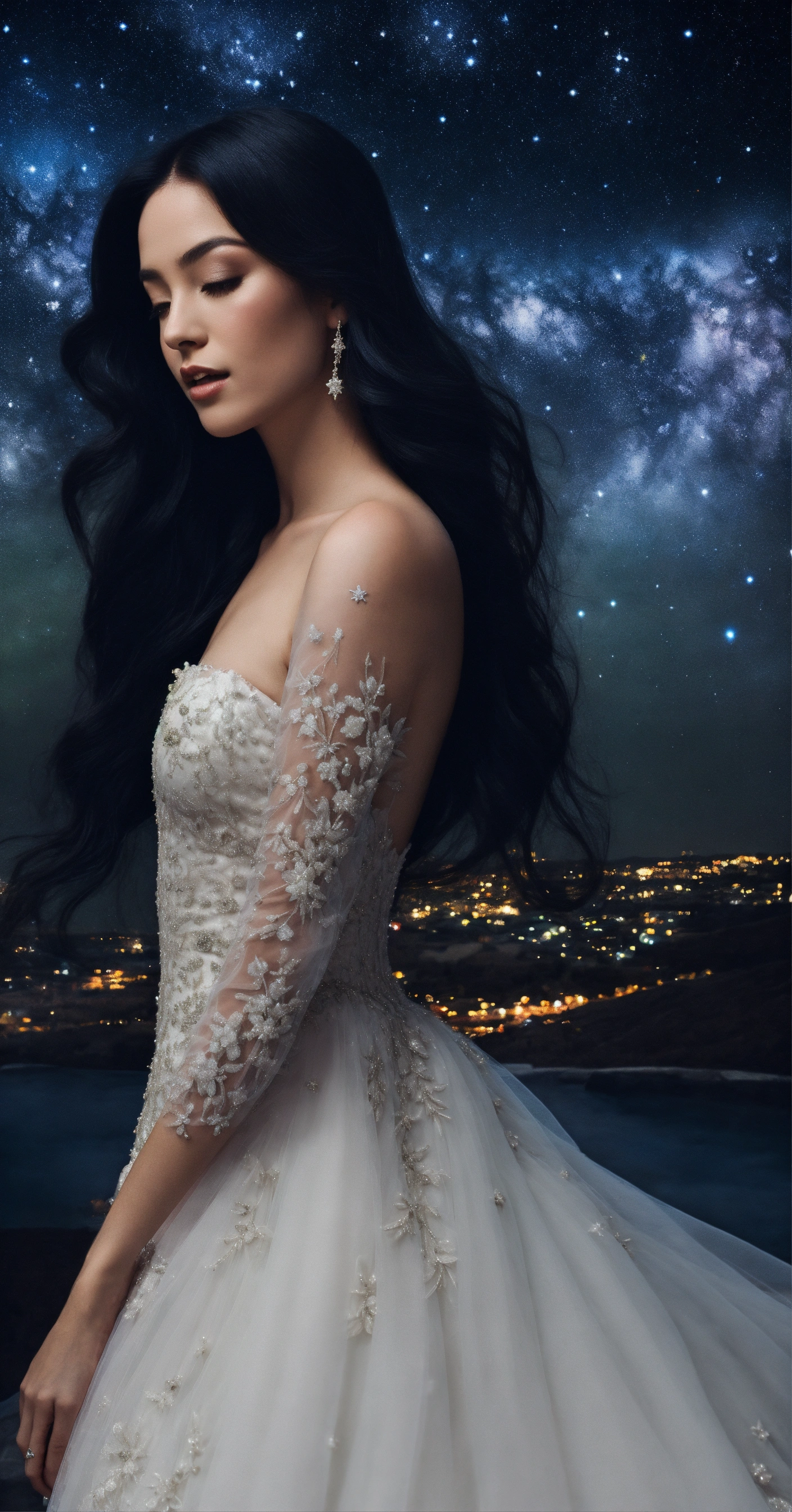 Women with black long silky hair in wedding dress inspired by starry night sky