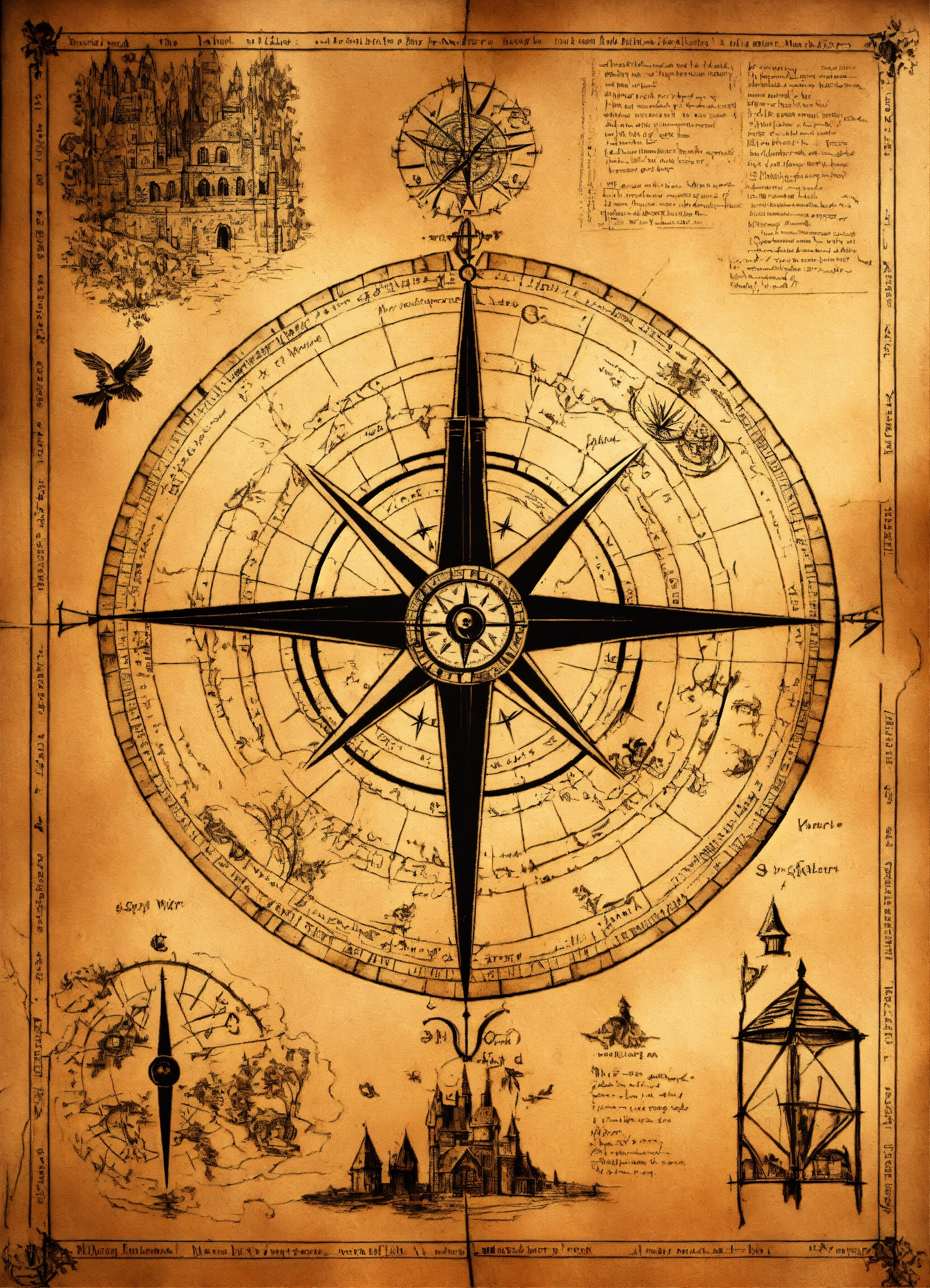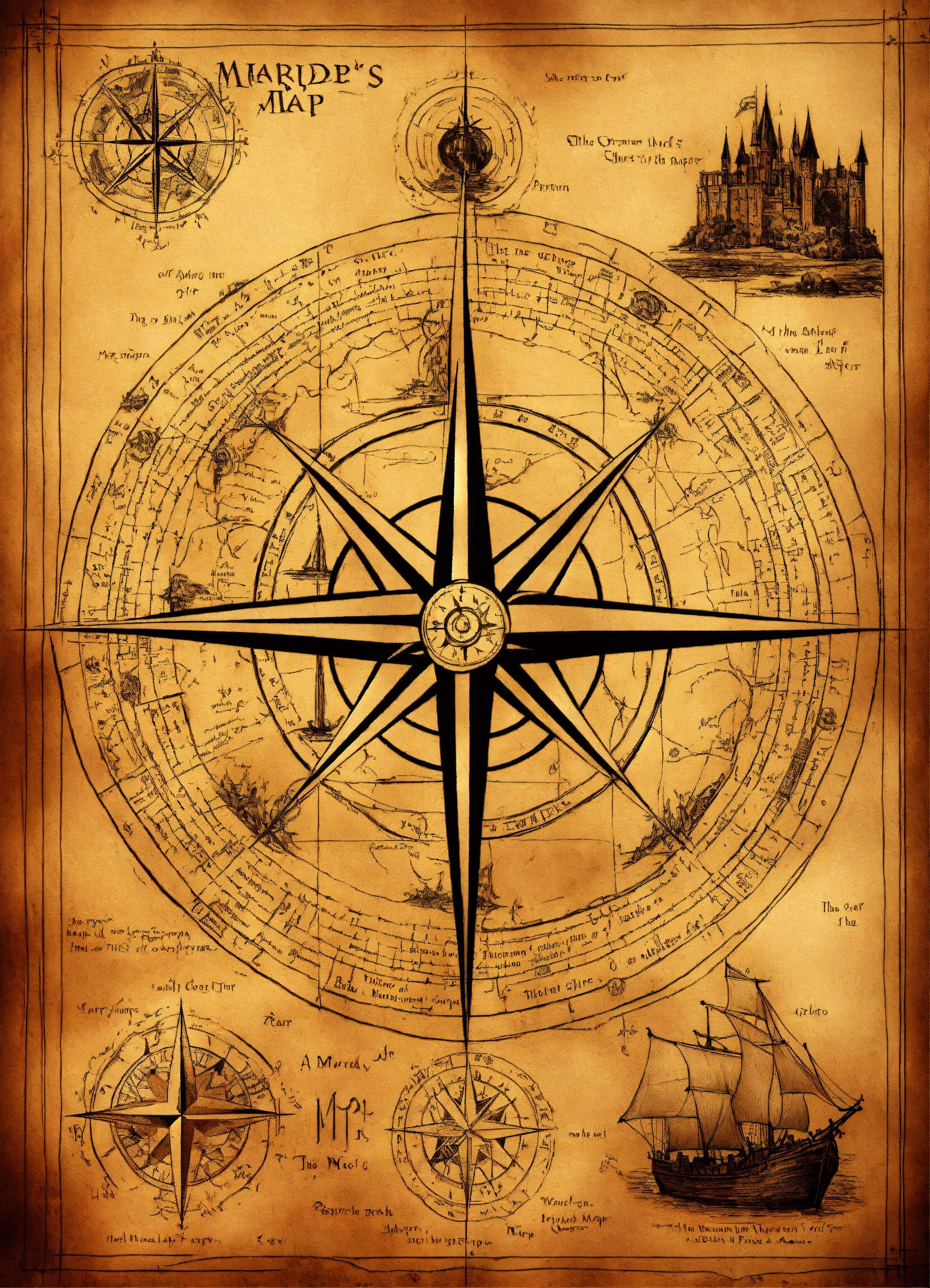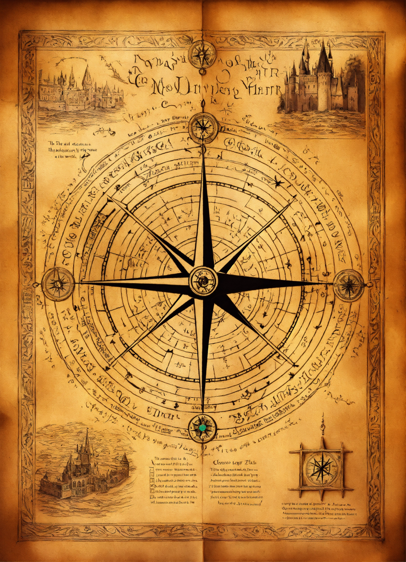 The marauder's map from harry potter, in the center the drawing of a compass, inside the map a symbol of fire, a symbol of earth, a symbol of wood, a symbol of water and a symbol of metal.