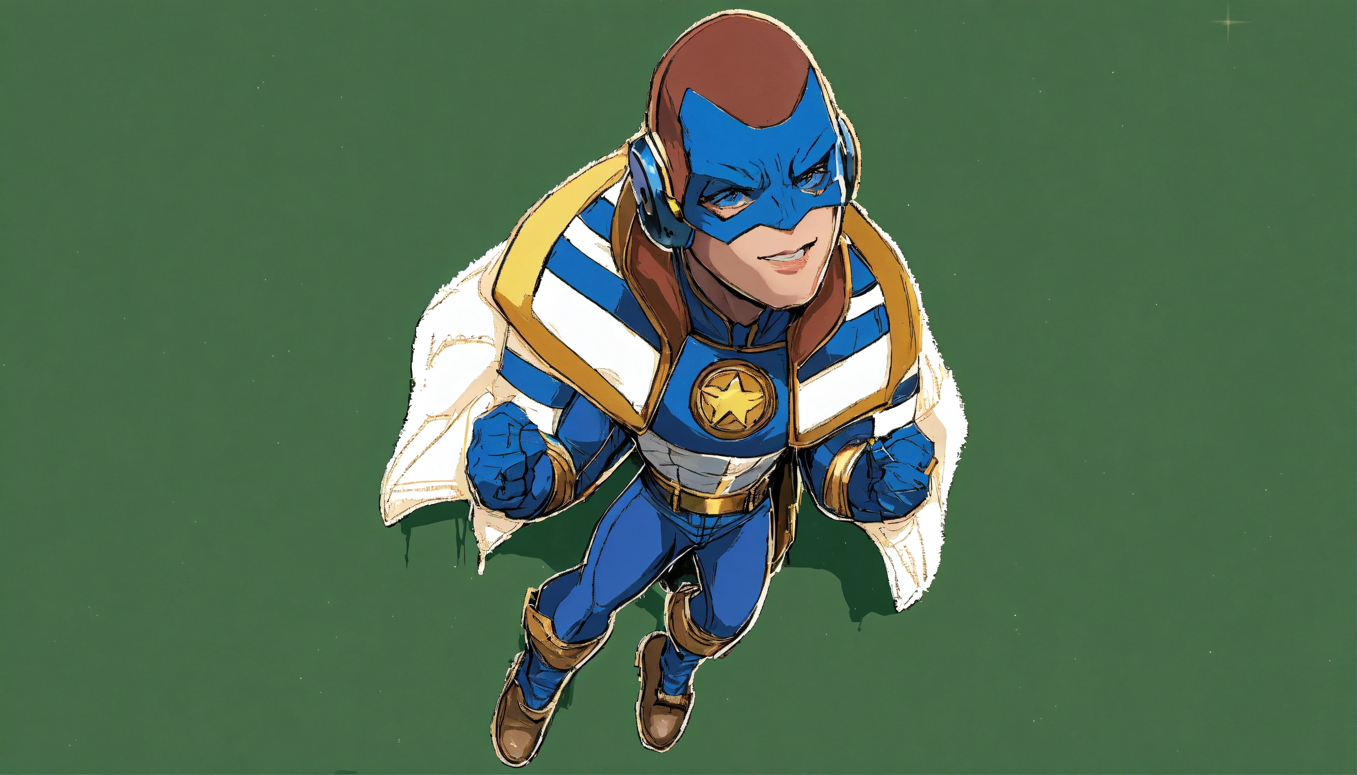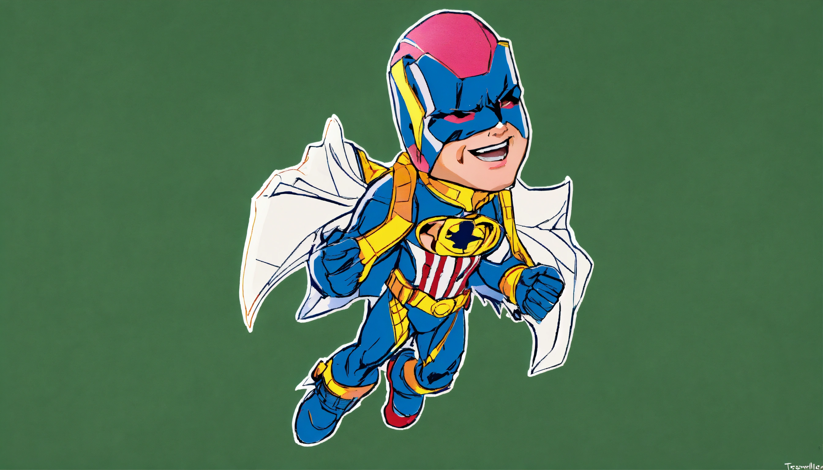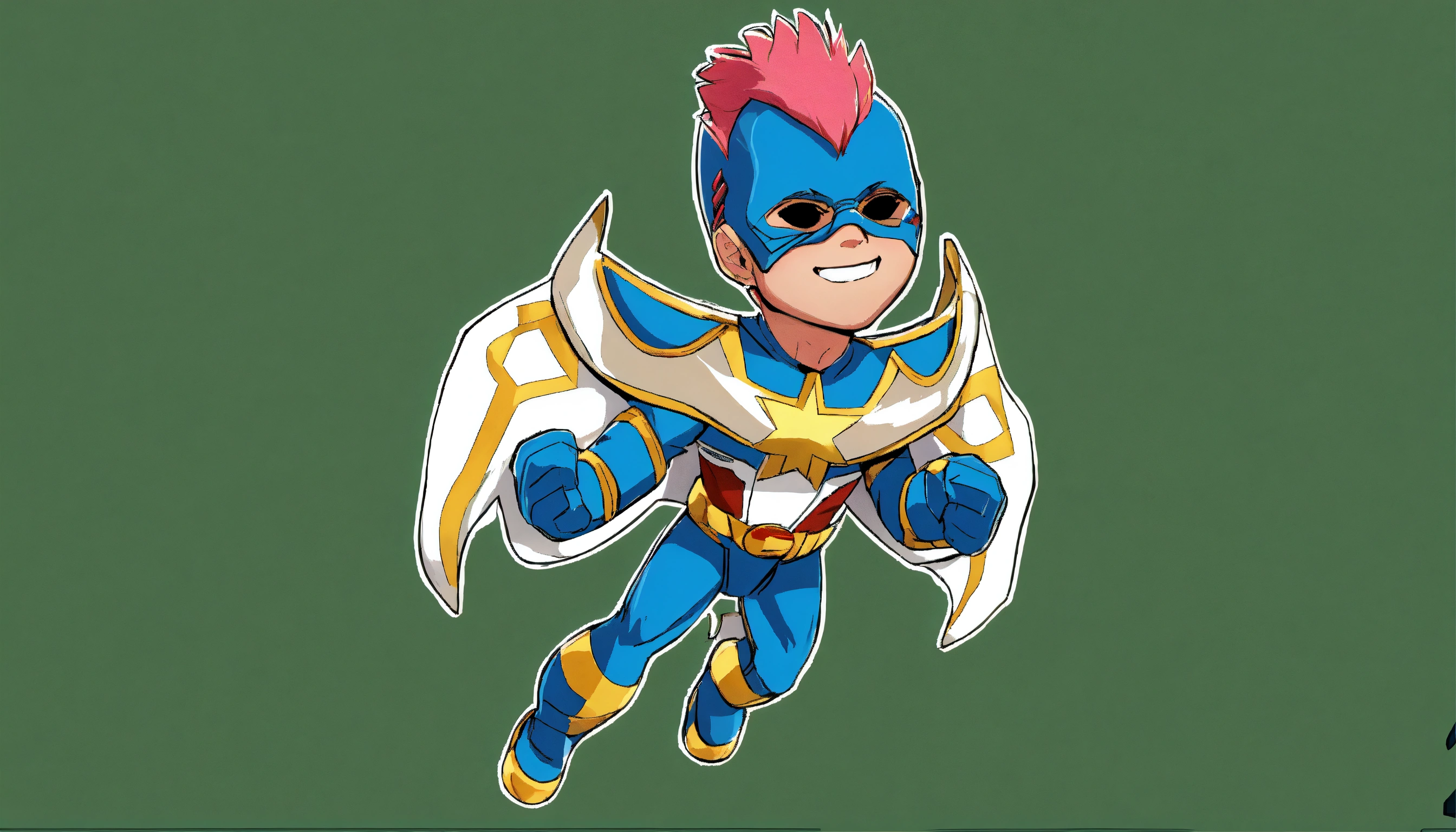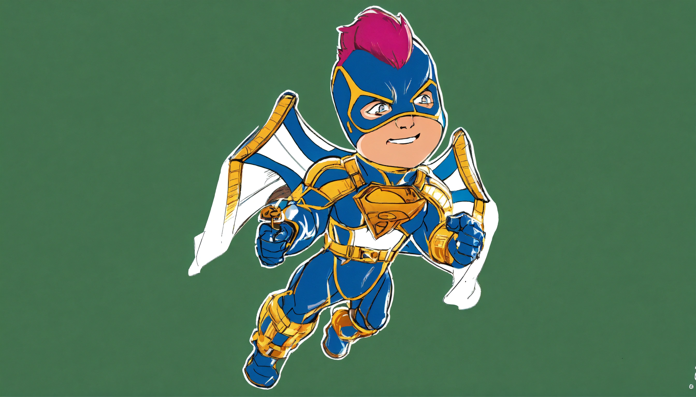 Personagem fosse um super herói homem da vida real, ele usa uma máscara azul com detalhes dourados na altura das orelhas que cobre todo o rosto deixando apenas o nariz e a boca de fora, a máscara é fechada por um tirante marrom estilo aviador e uma abertura no topo da cabeça por onde passa o seu cabelo rosa estilo moicano, ele está olhando de frente