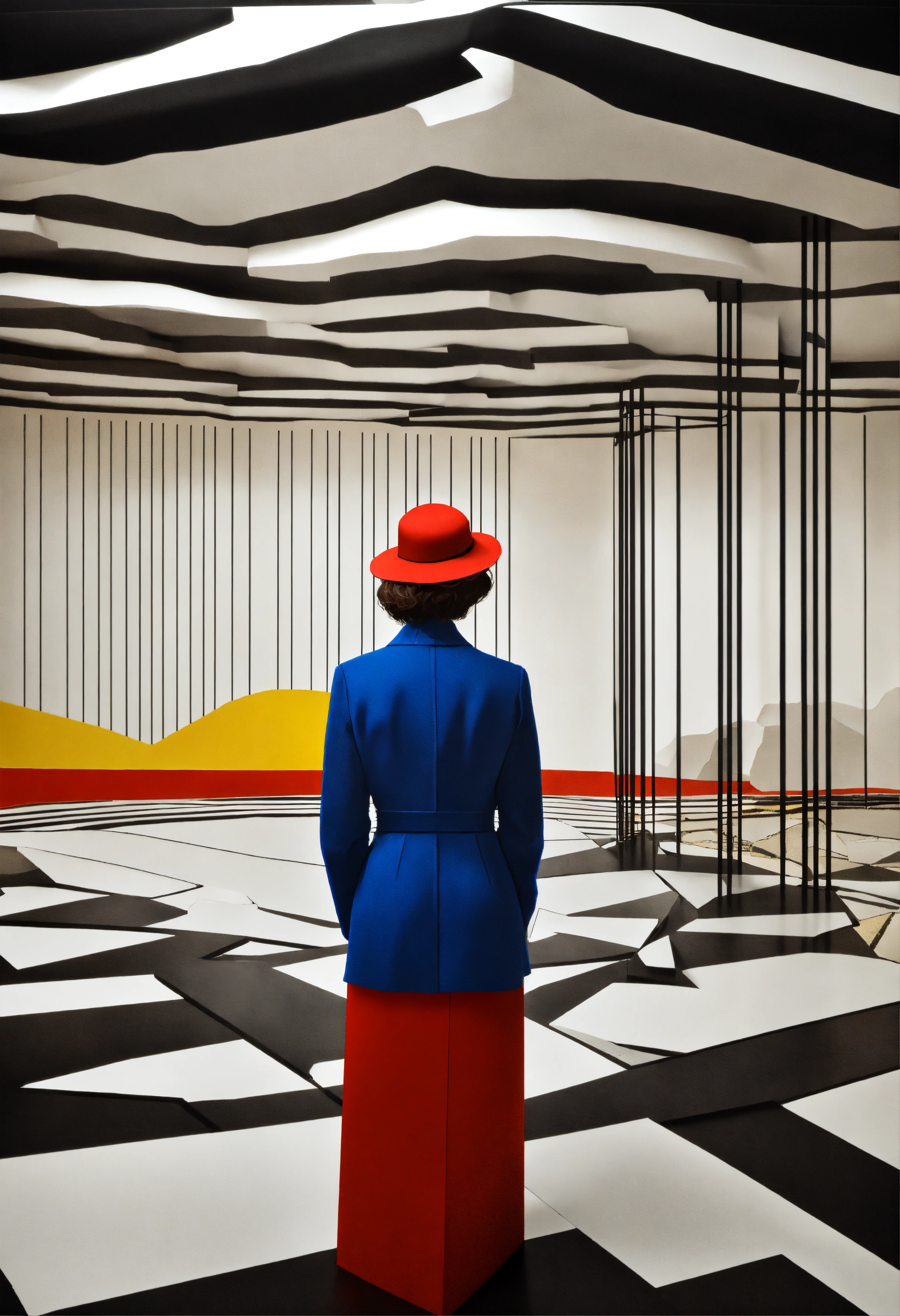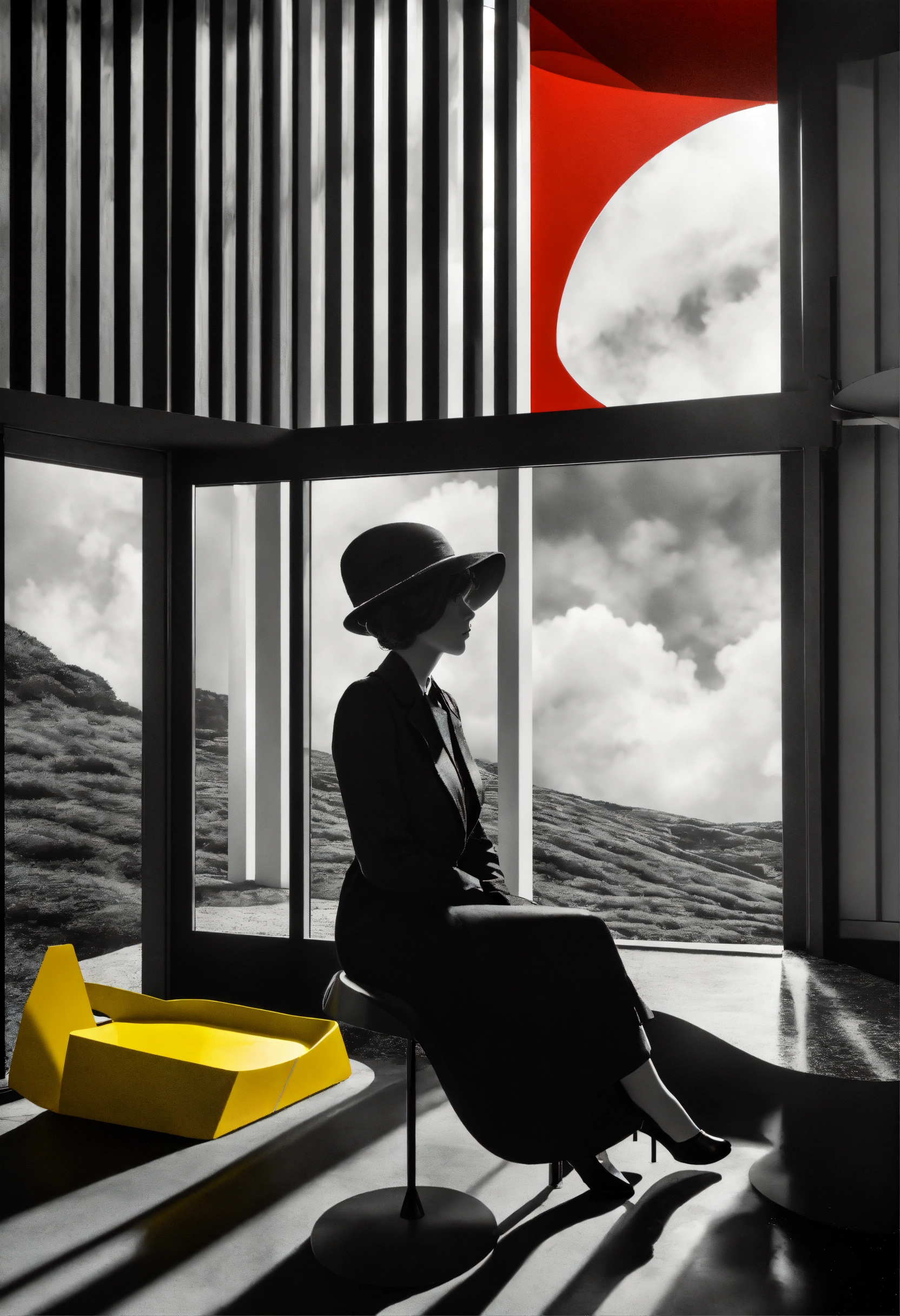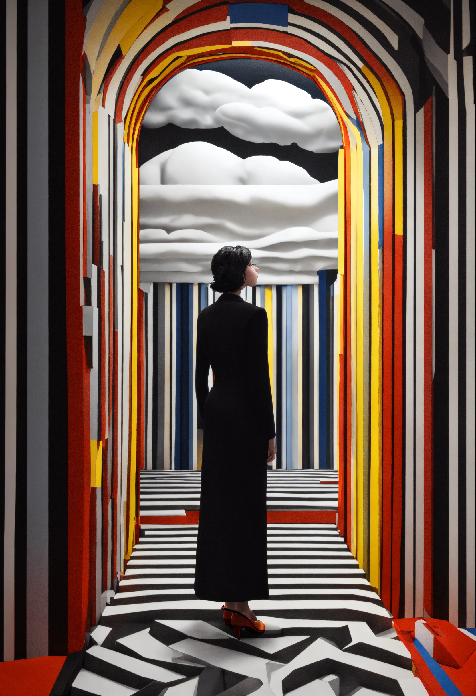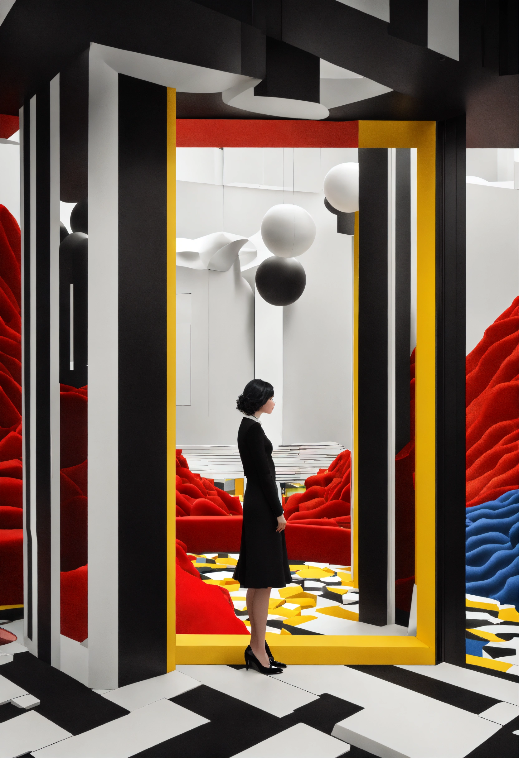 Black and white, primary colors, 3d abstract modeling landscape, woman contemplating, immersive-inspired art deco, inside and out landscape, rene magritte inspiration.