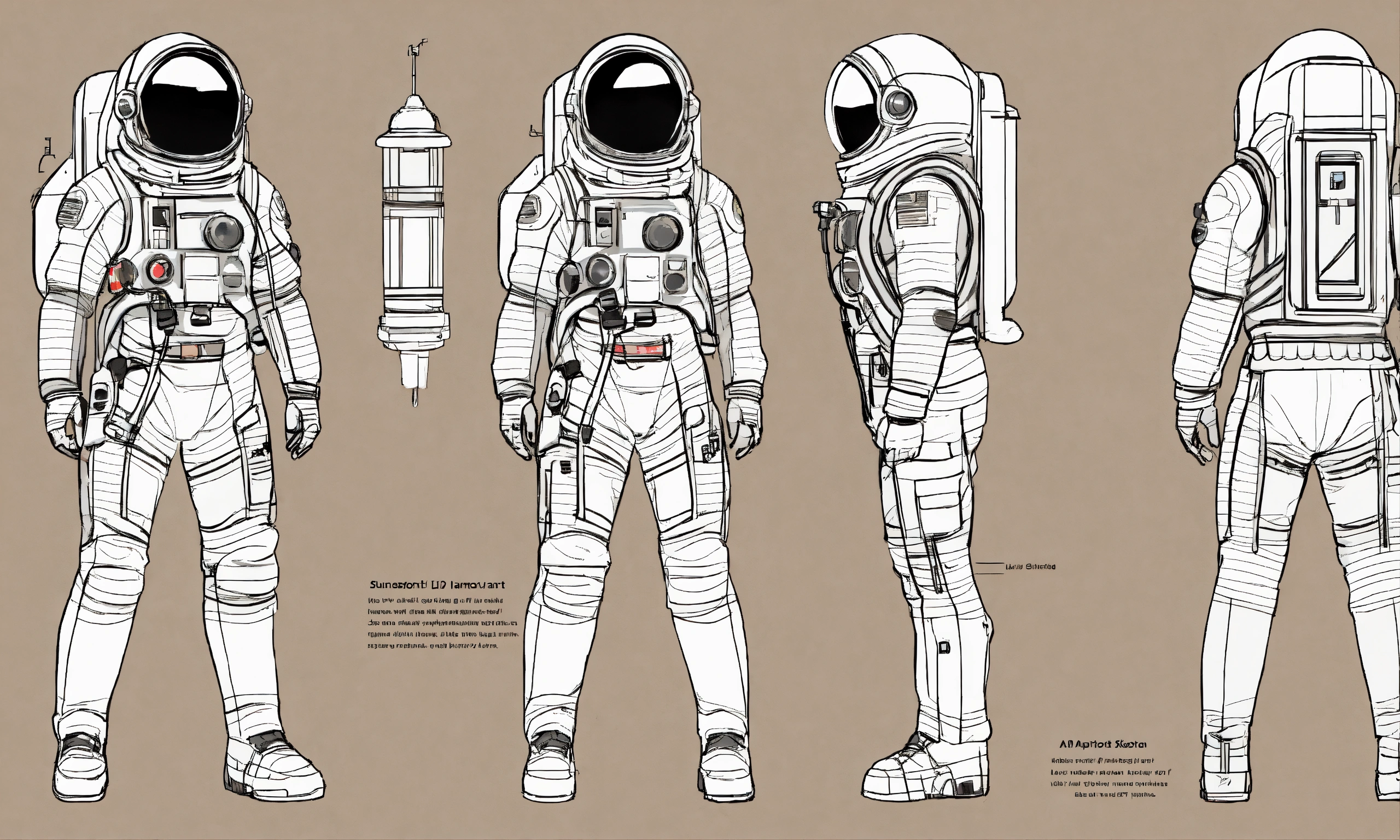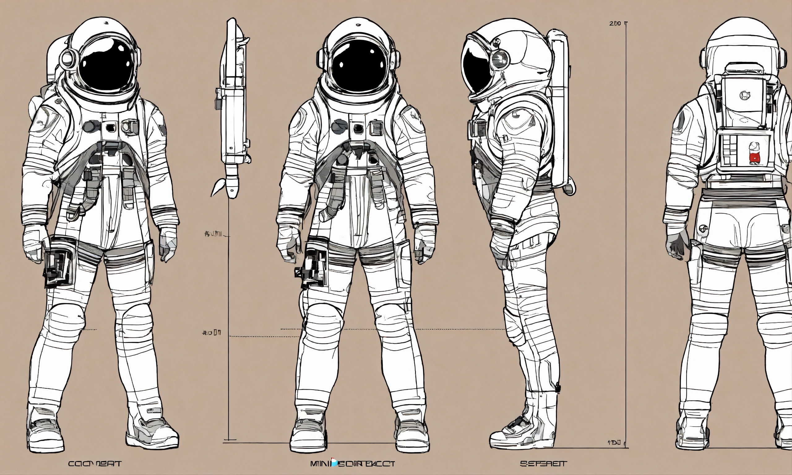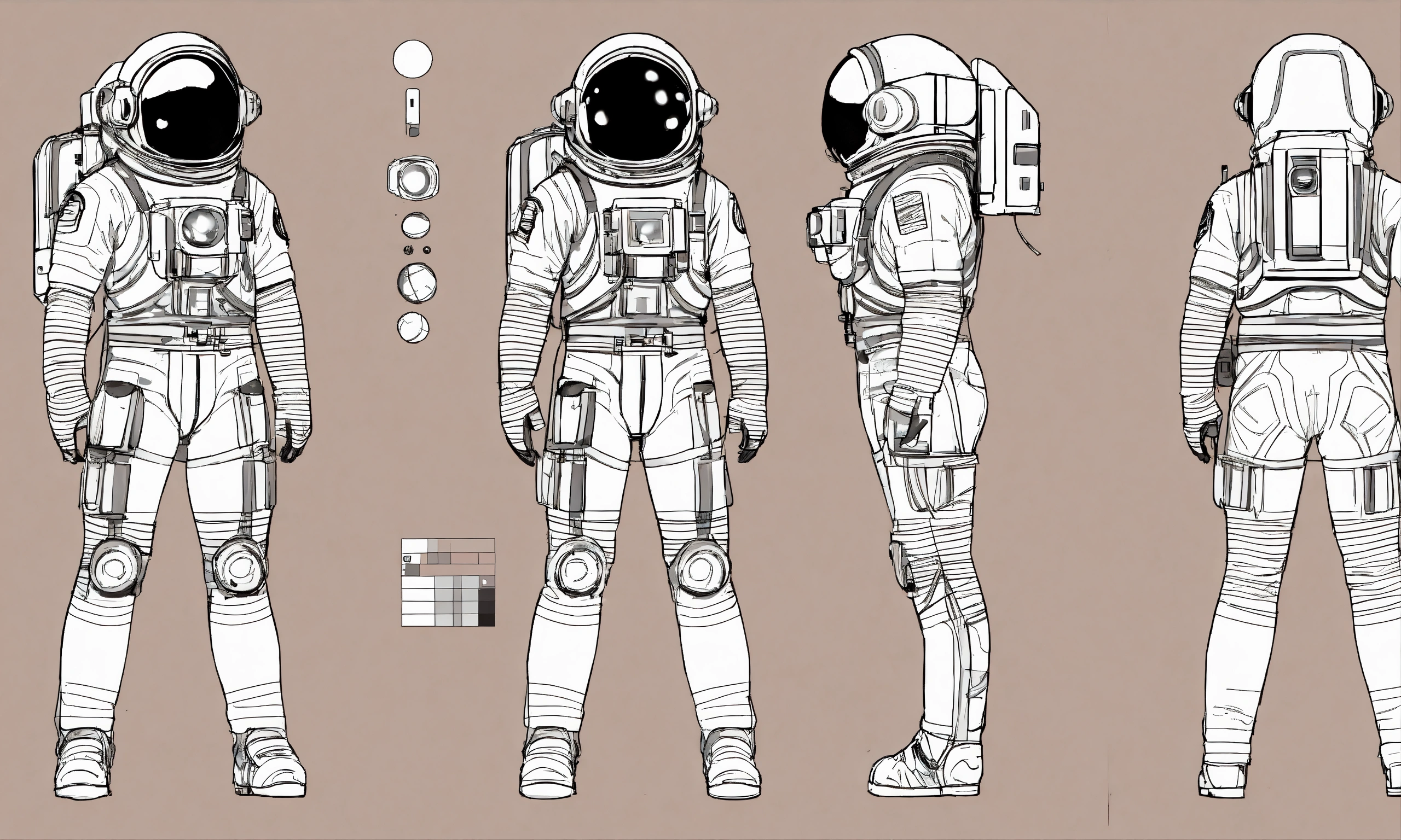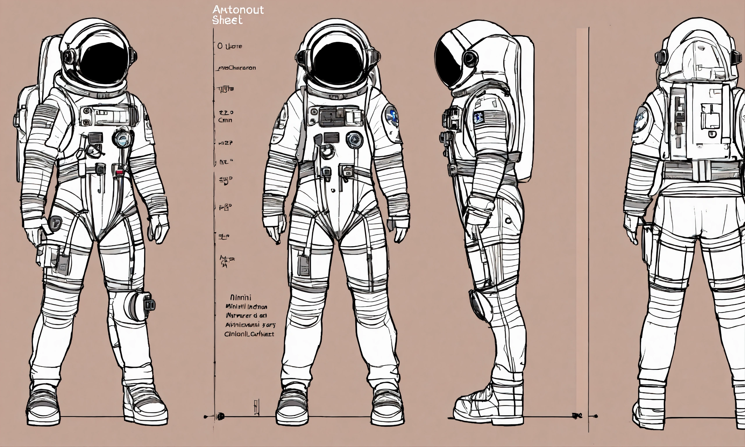 Mini astronaut, 2d, character sheet, full body, reference sheet, character model, detailed, front view, side view, back view
