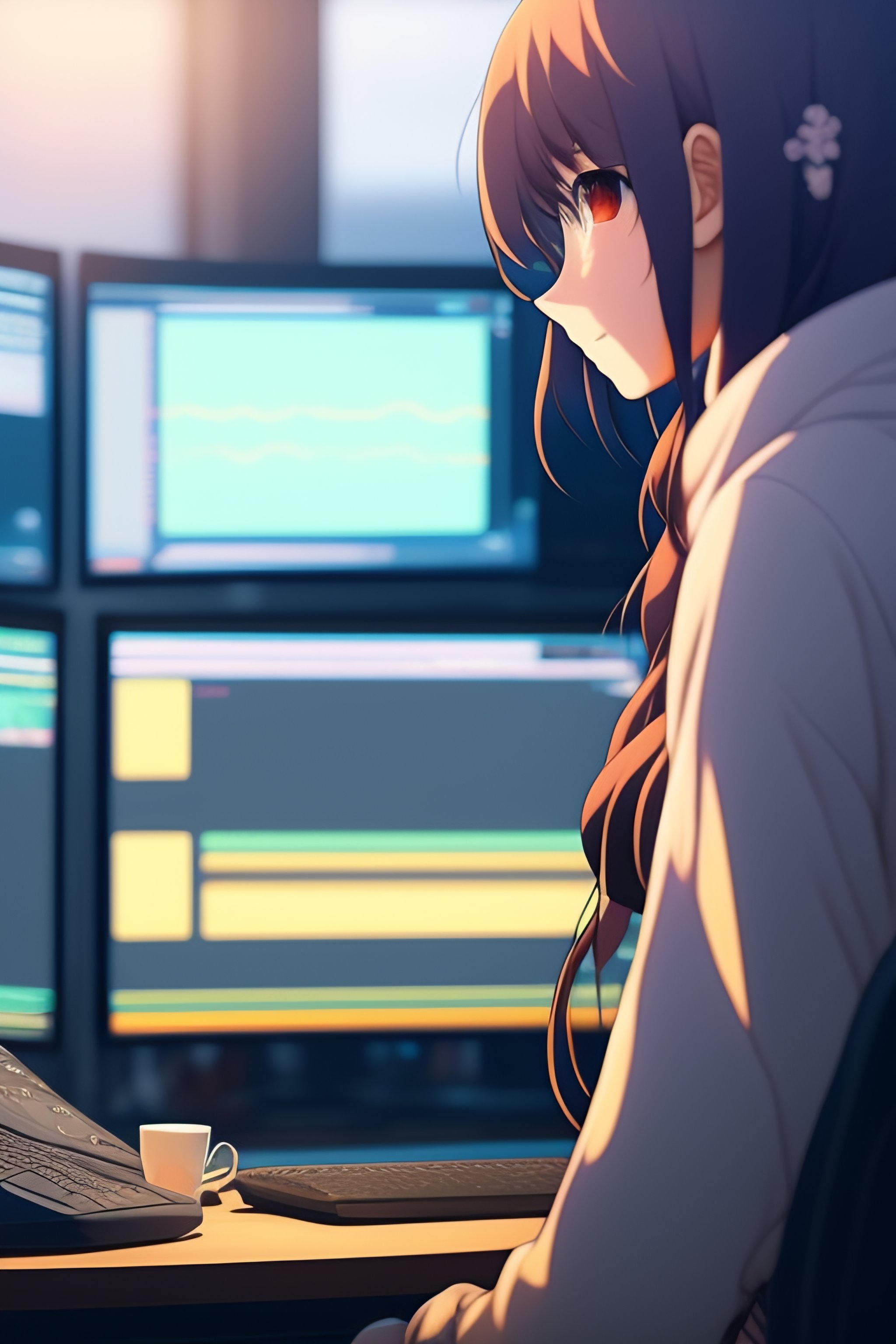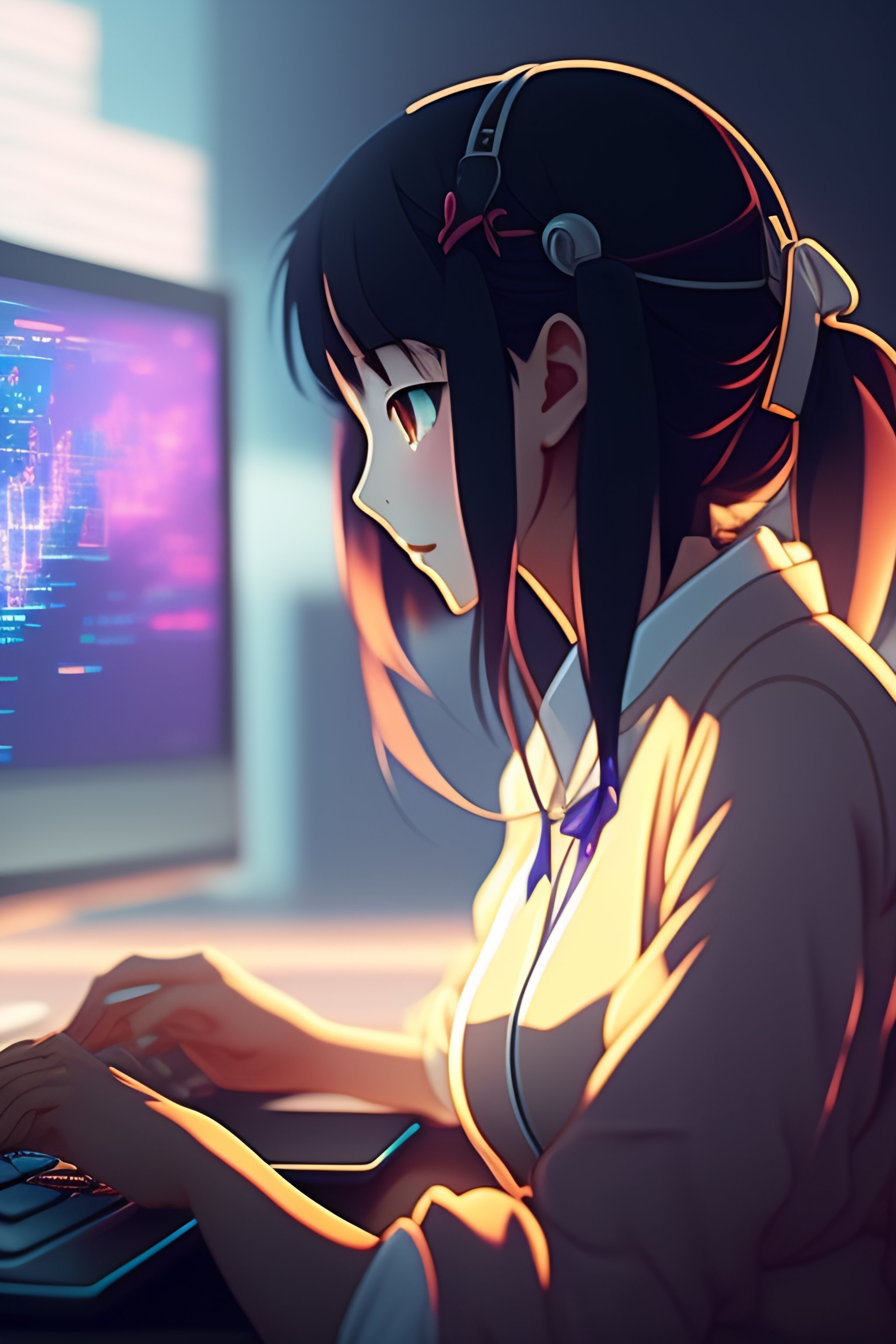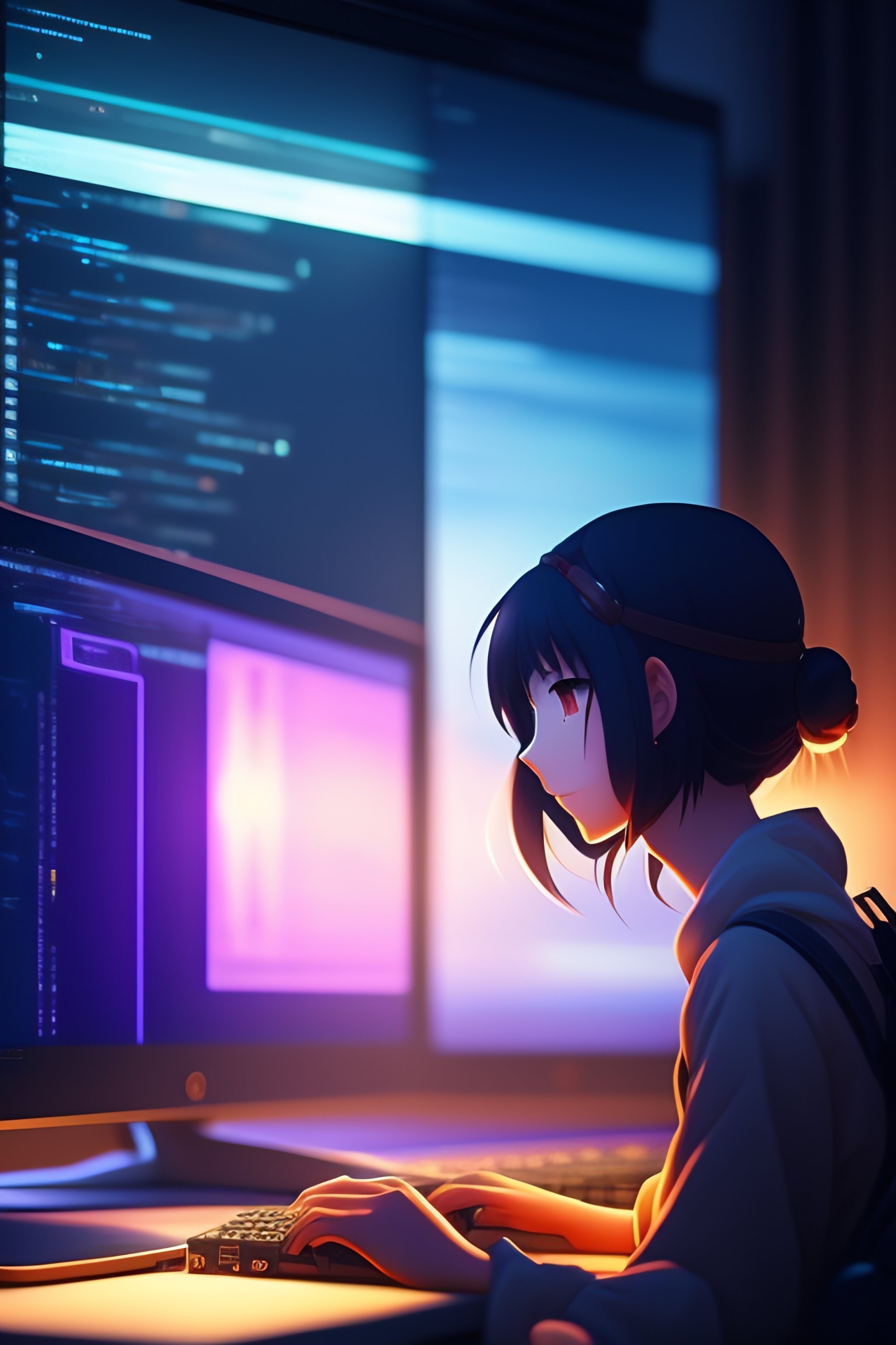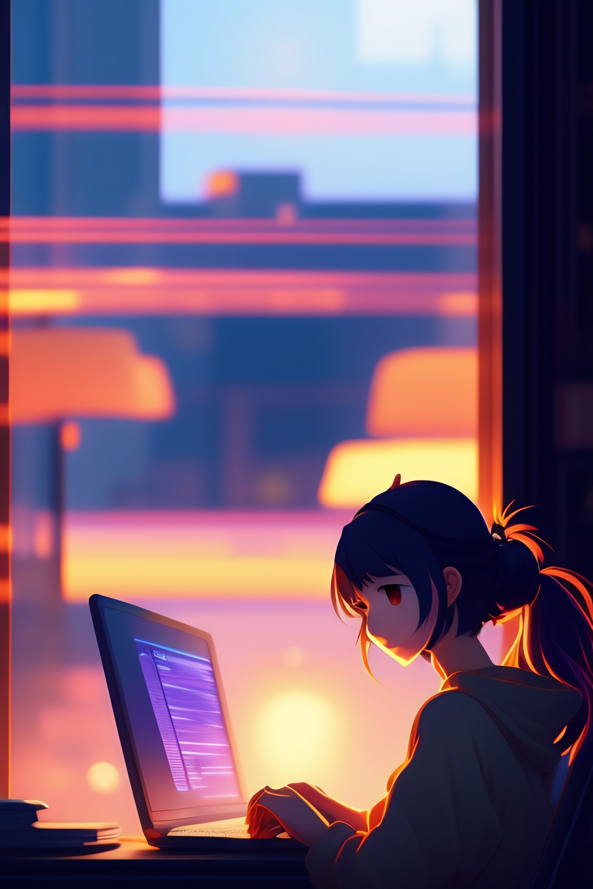 Create a high resolution artwork of anime girl is programming at a laptop in a room, web developer, by makoto shinkai and ghibli studio, outlined silhouettes, dramatic lighting, highly detailed, incredible quality, trending on artstation, masterpiece, 8k