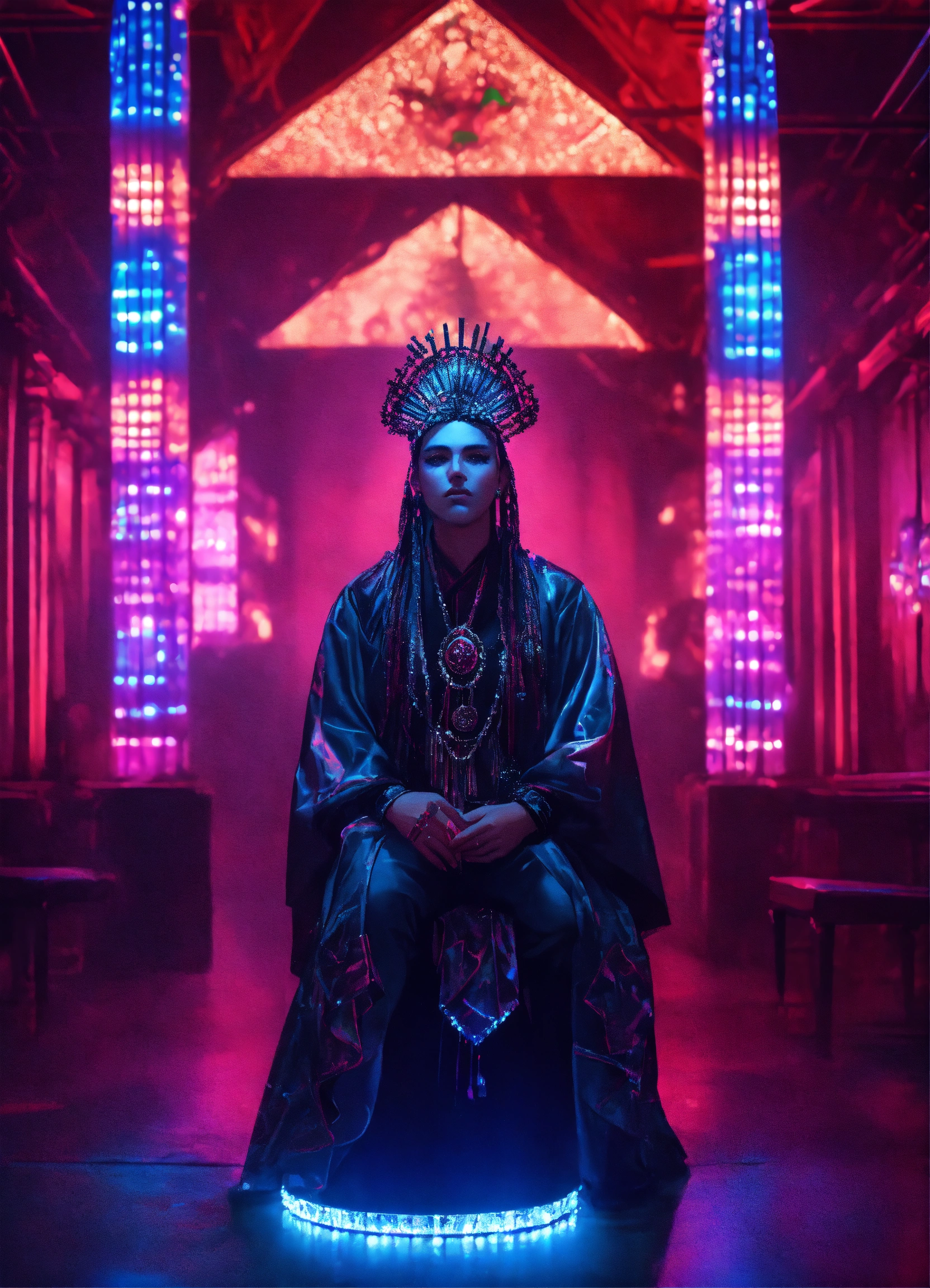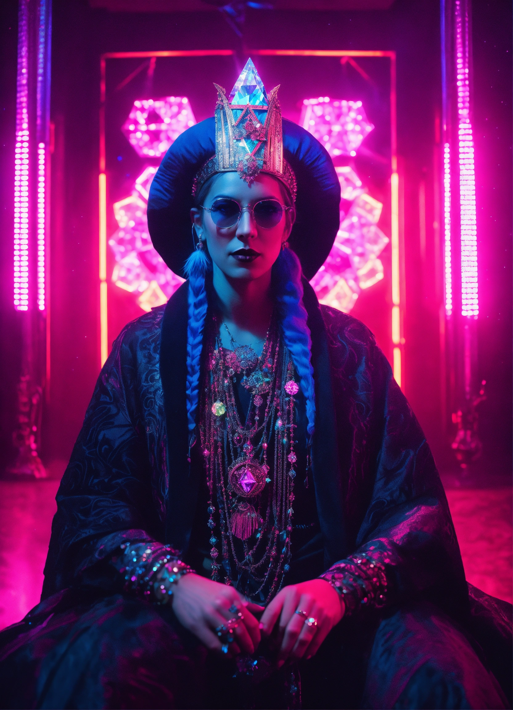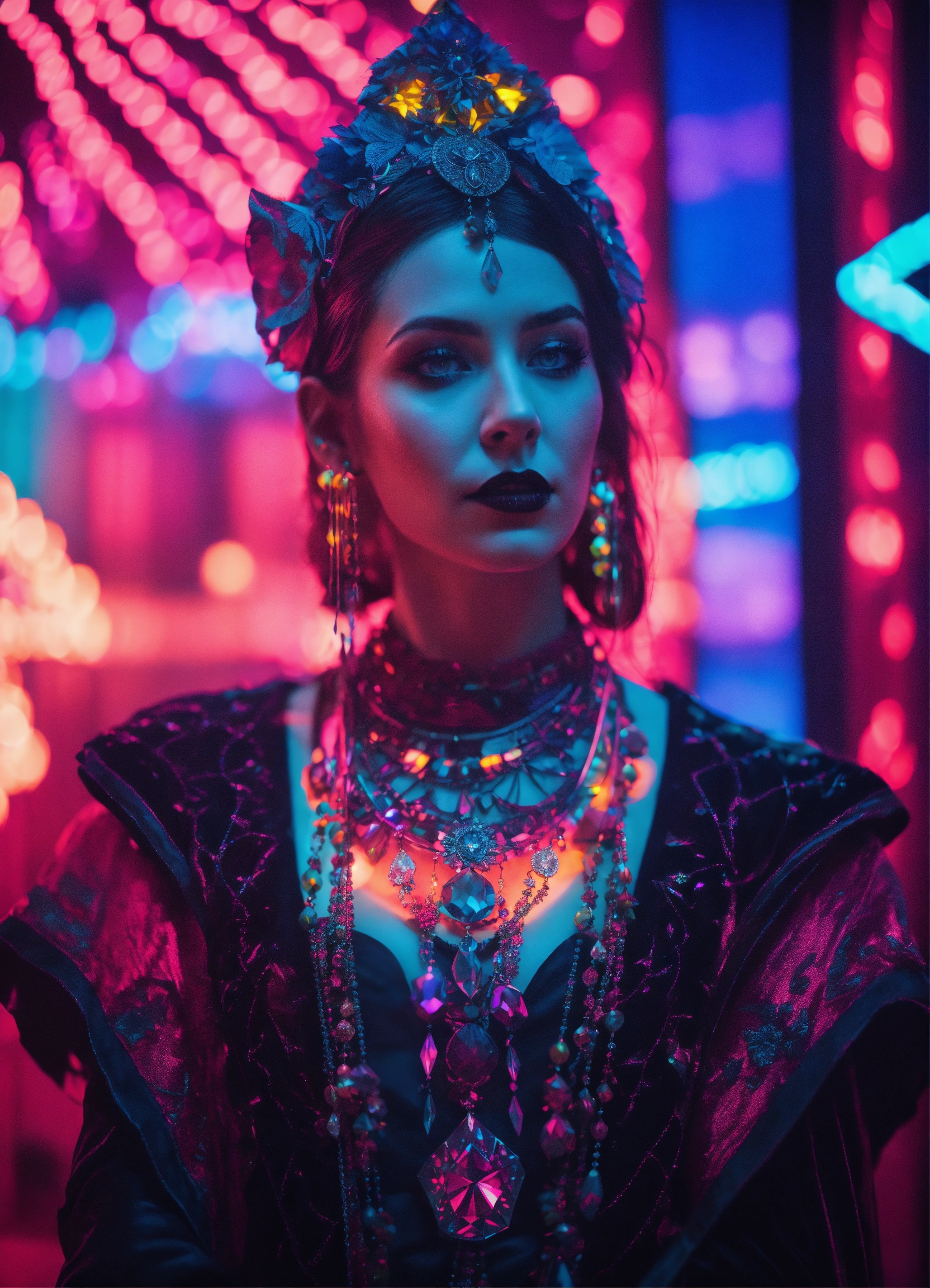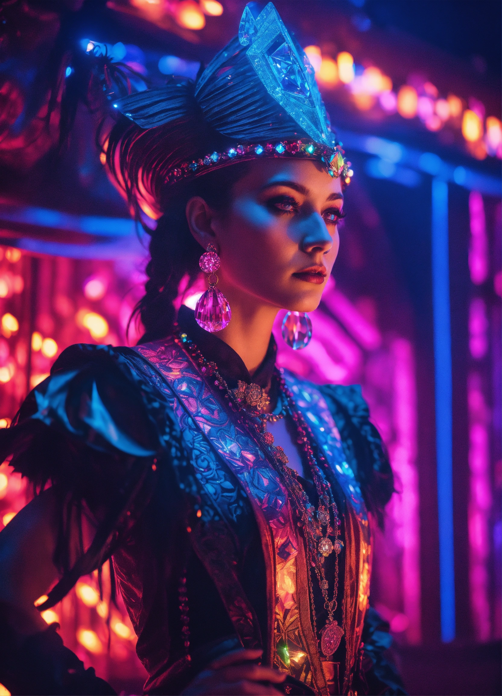 I’m photorealistic portrait of a gothic shaman in folk costume, photorealistic surreal dreamlike crystal parisian music hall in a retro 80s synthwave style with diamonds, techno dmt neon room photorealistic, volumetric lighting, 8k, highly detailed.