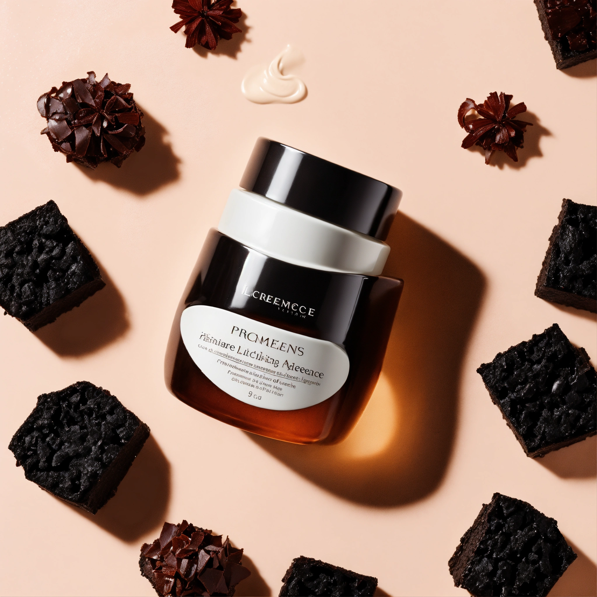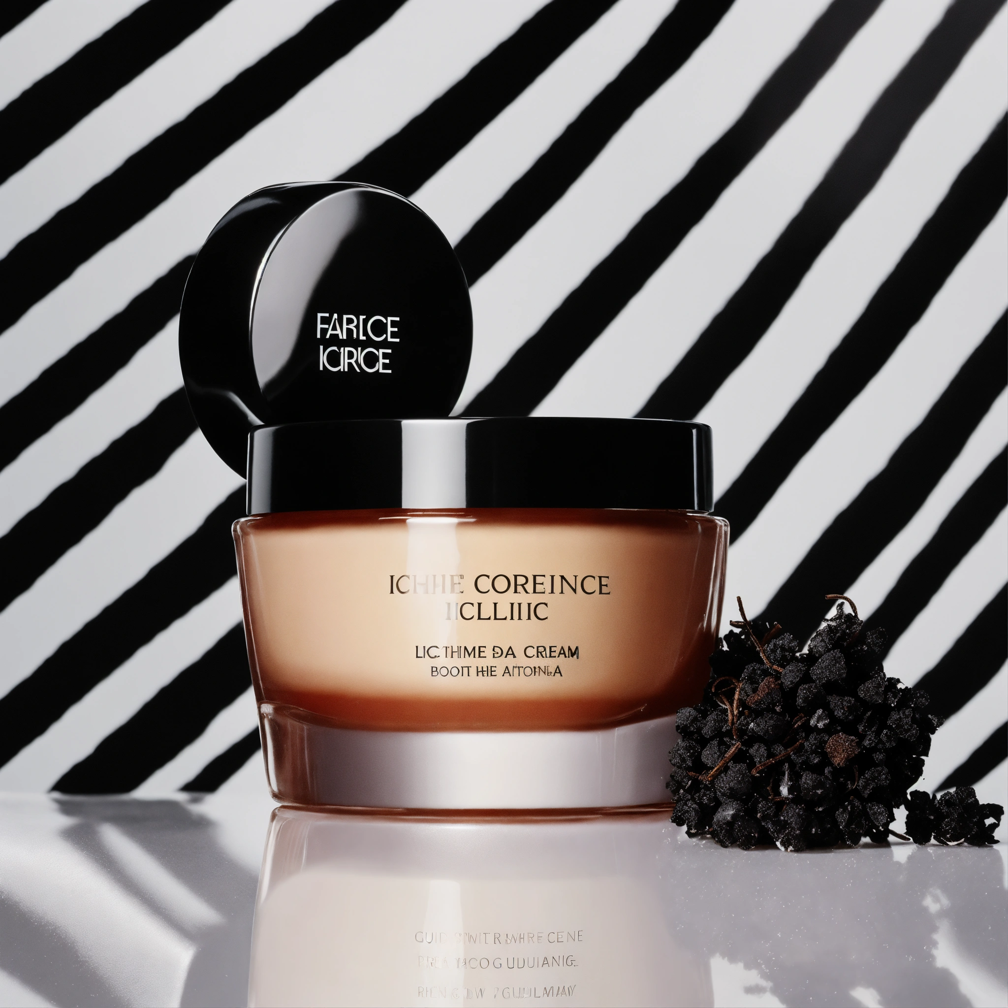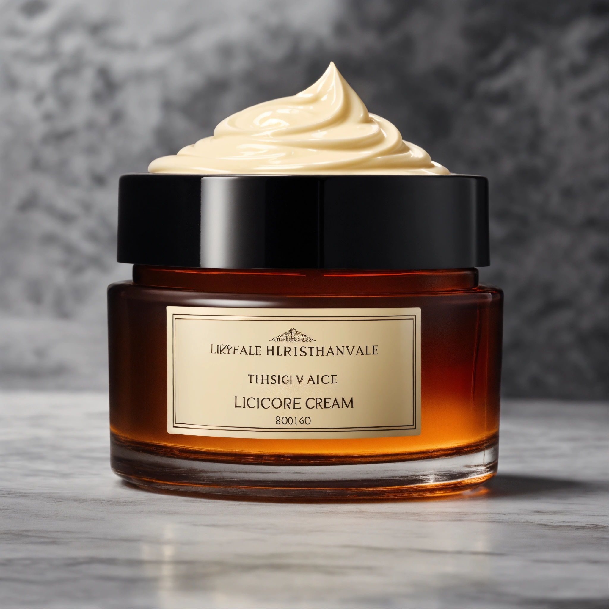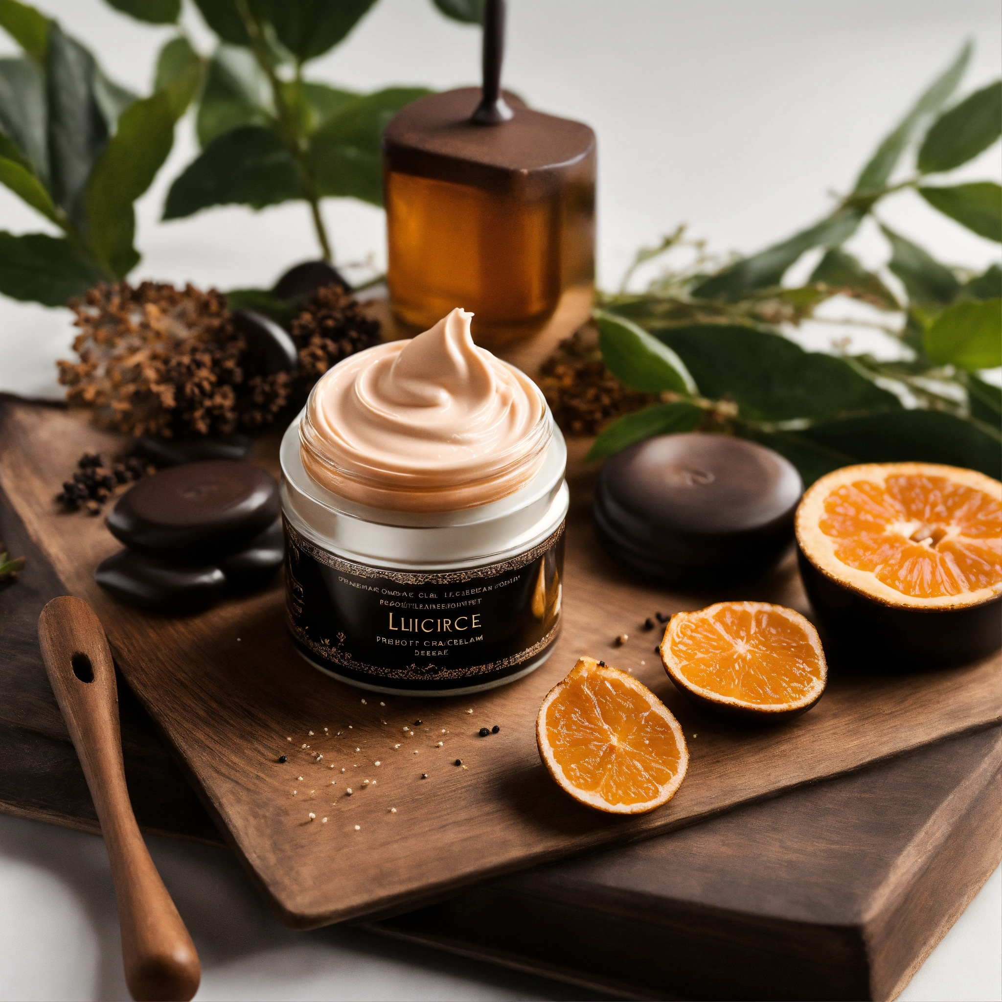 Design an image highlighting a face cream, prominently placed against a pristine white backdrop. the face cream's design, color, and aesthetic should draw deep inspiration from licorice, a cherished and aromatic root. let the sweet, soothing, and dark essence of licorice guide the visual nuances.