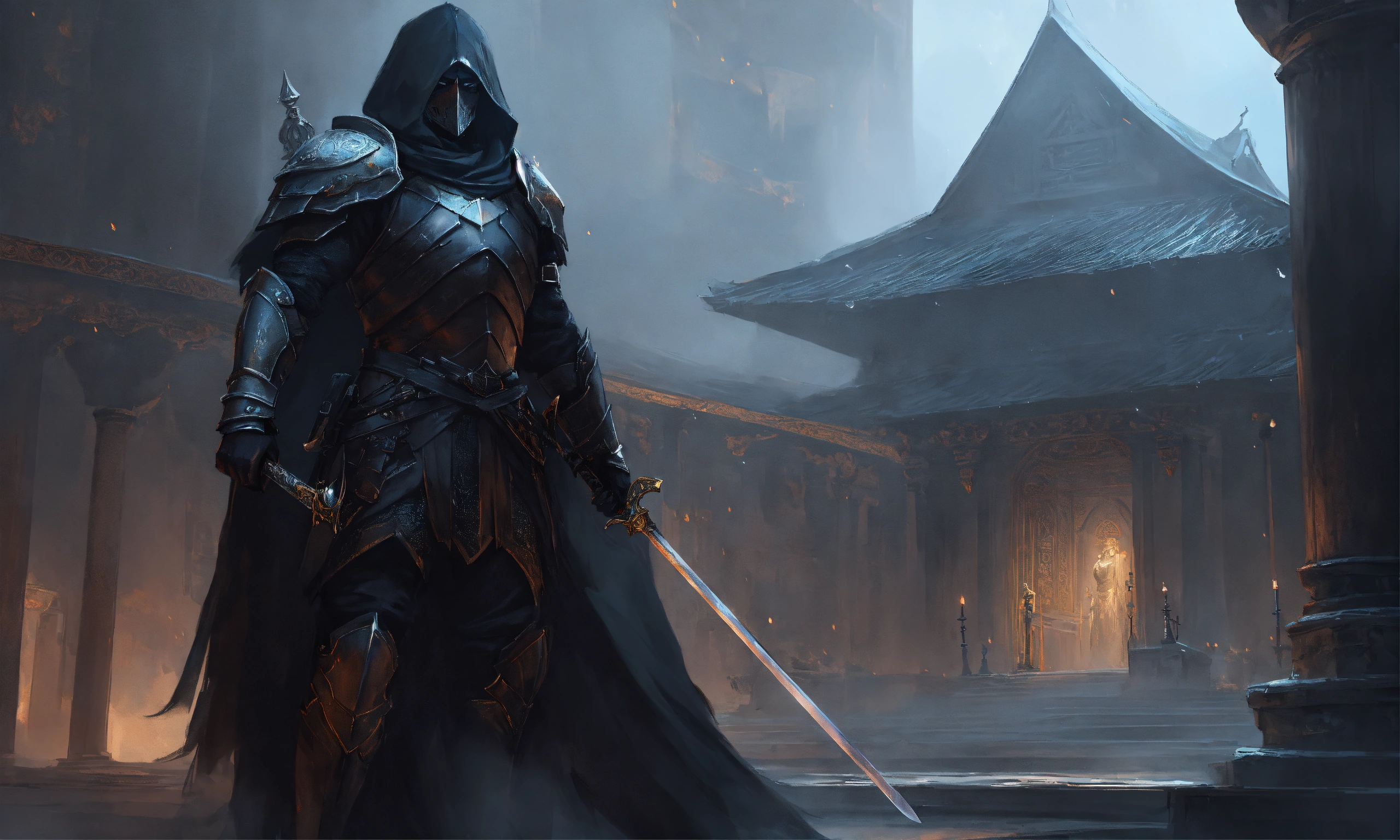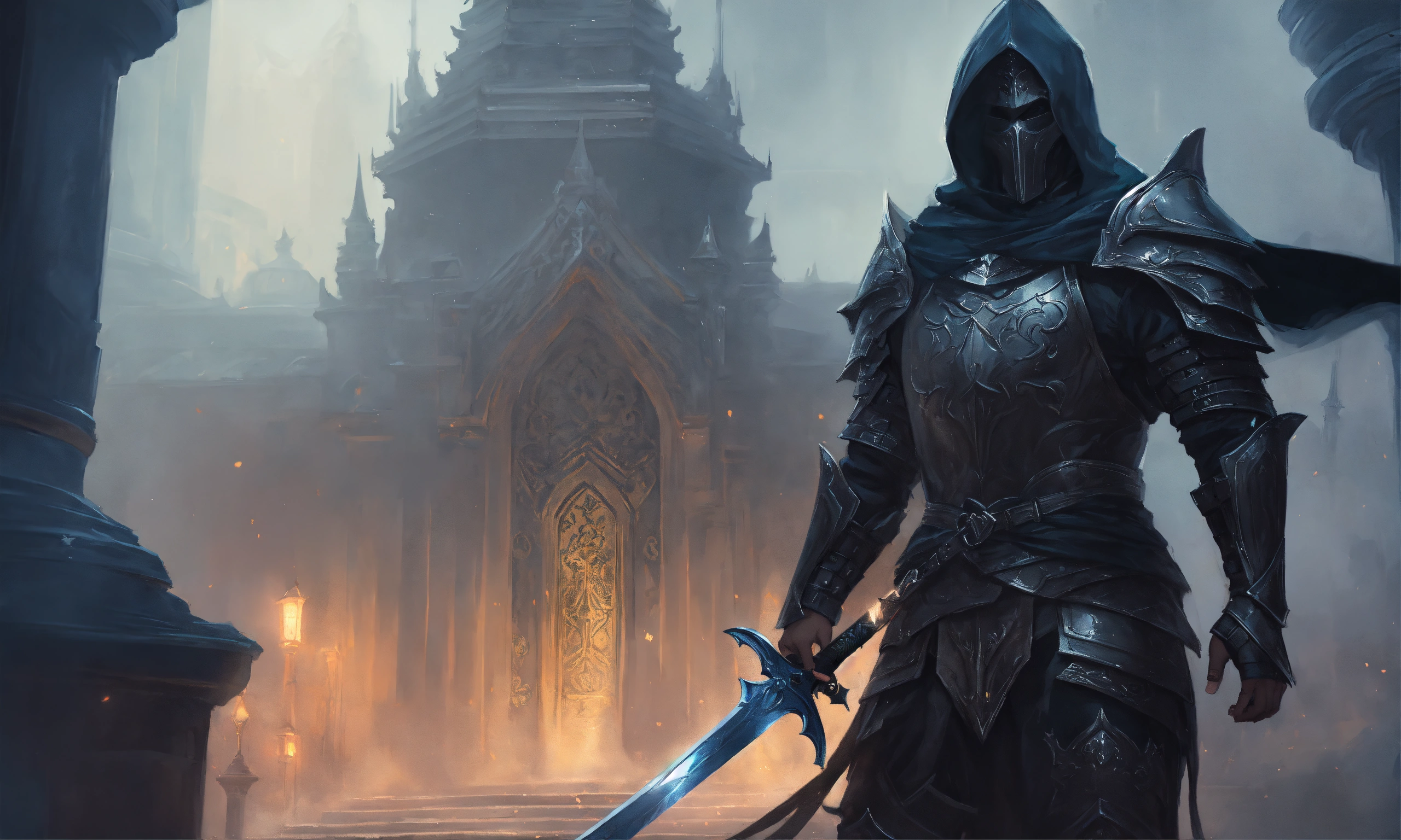 Dark fantasy painting, knight in dark armor with black combat cowl and sword with bearded face, stands by a temple in the fog, by artgerm, intricate detail, trending on artstation, 8k, fluid motion, stunning shading, by wlop