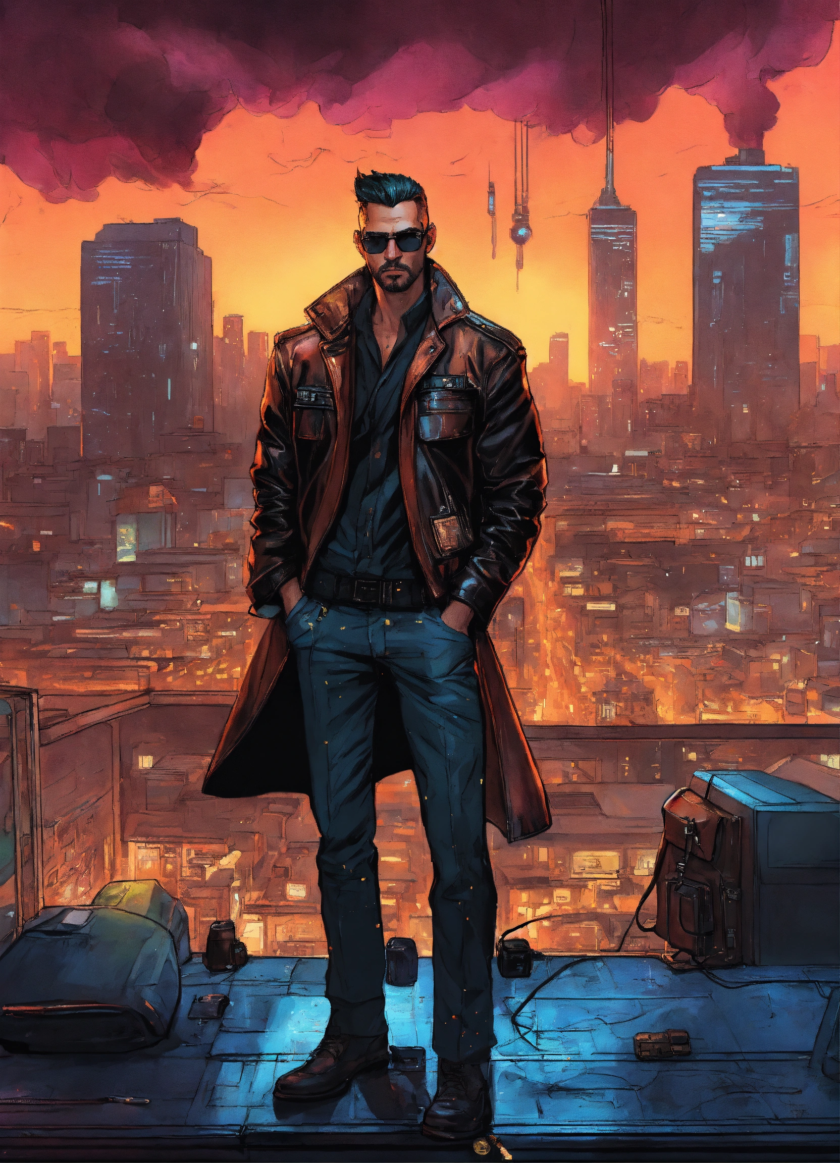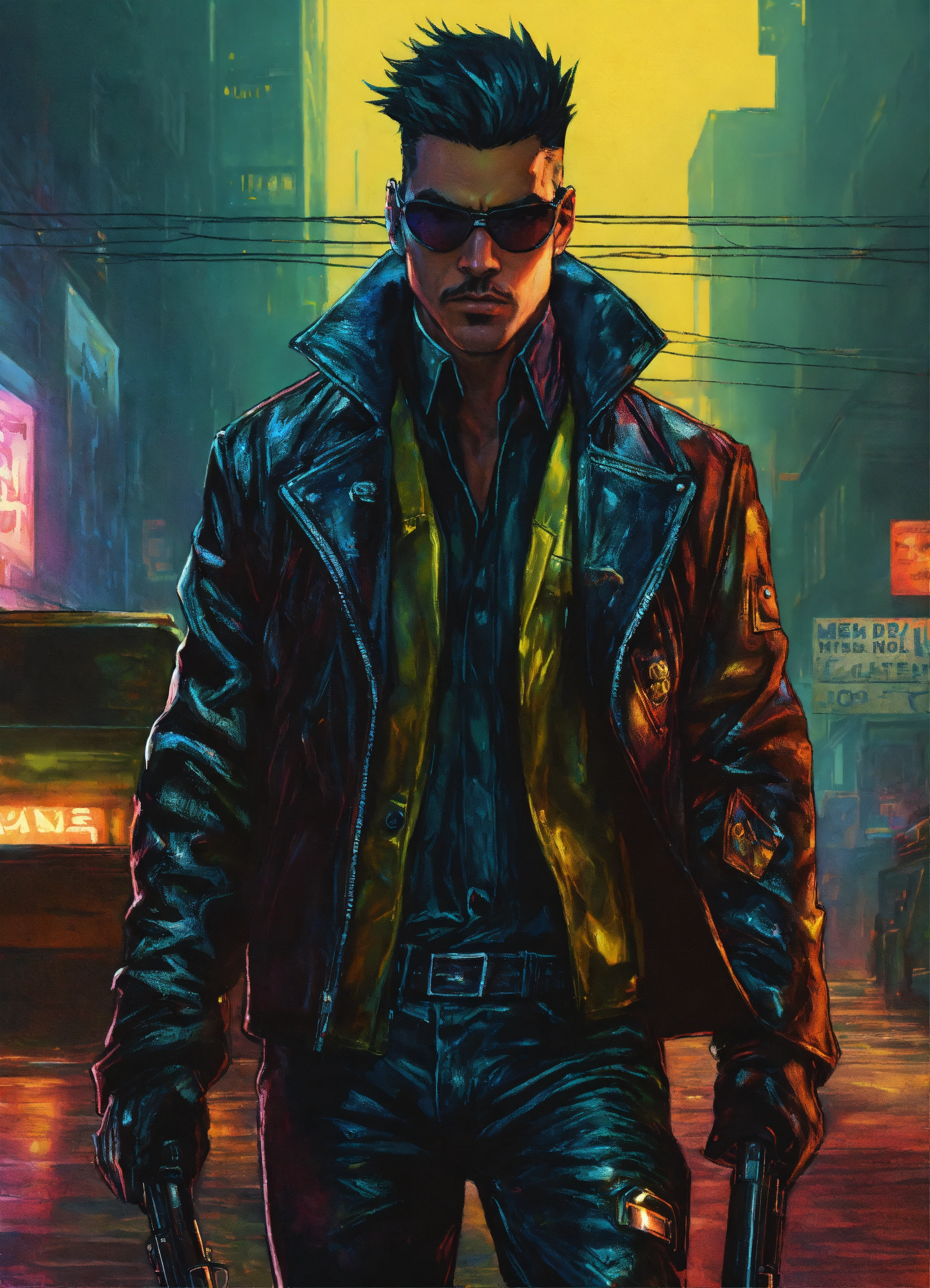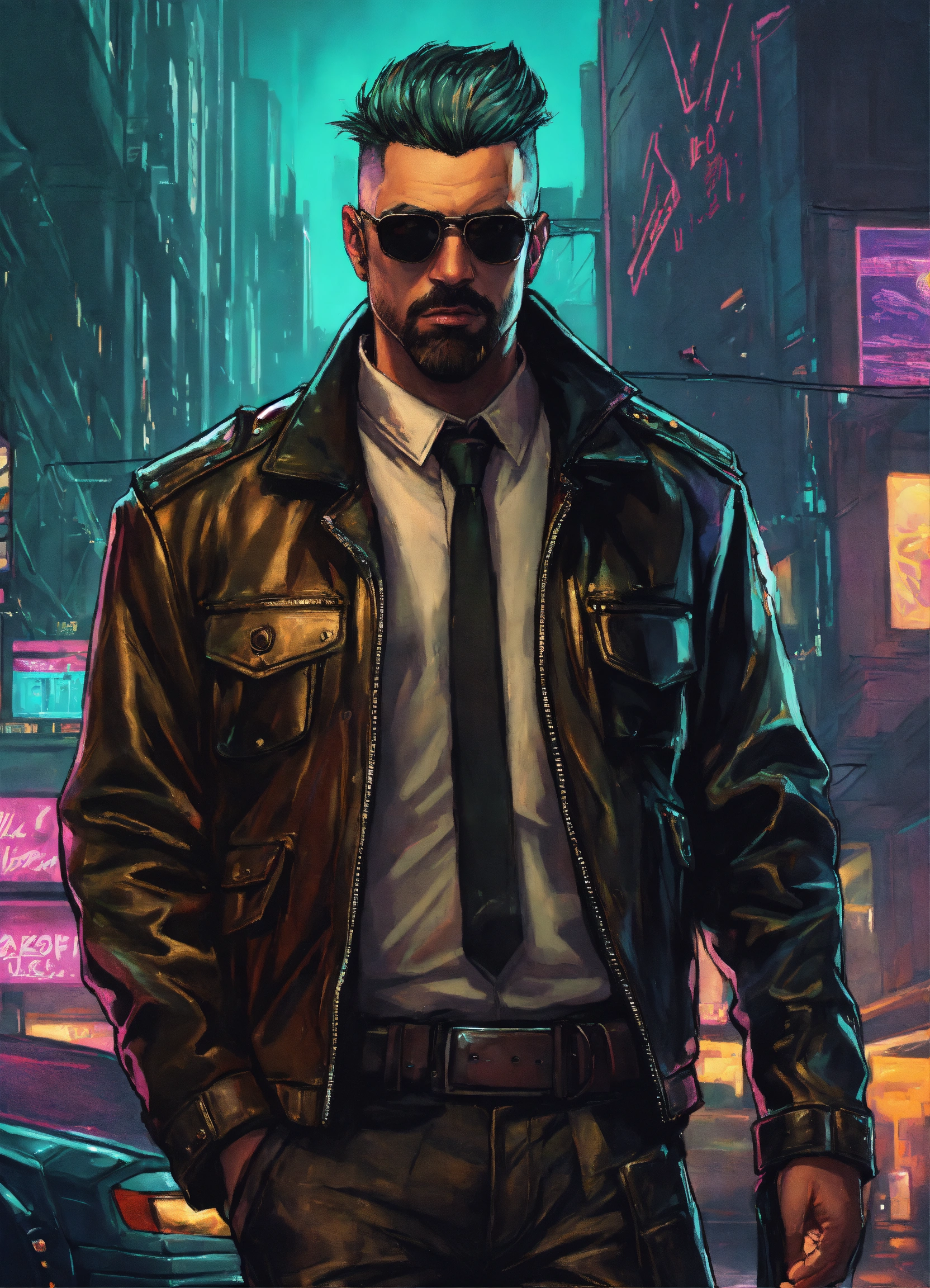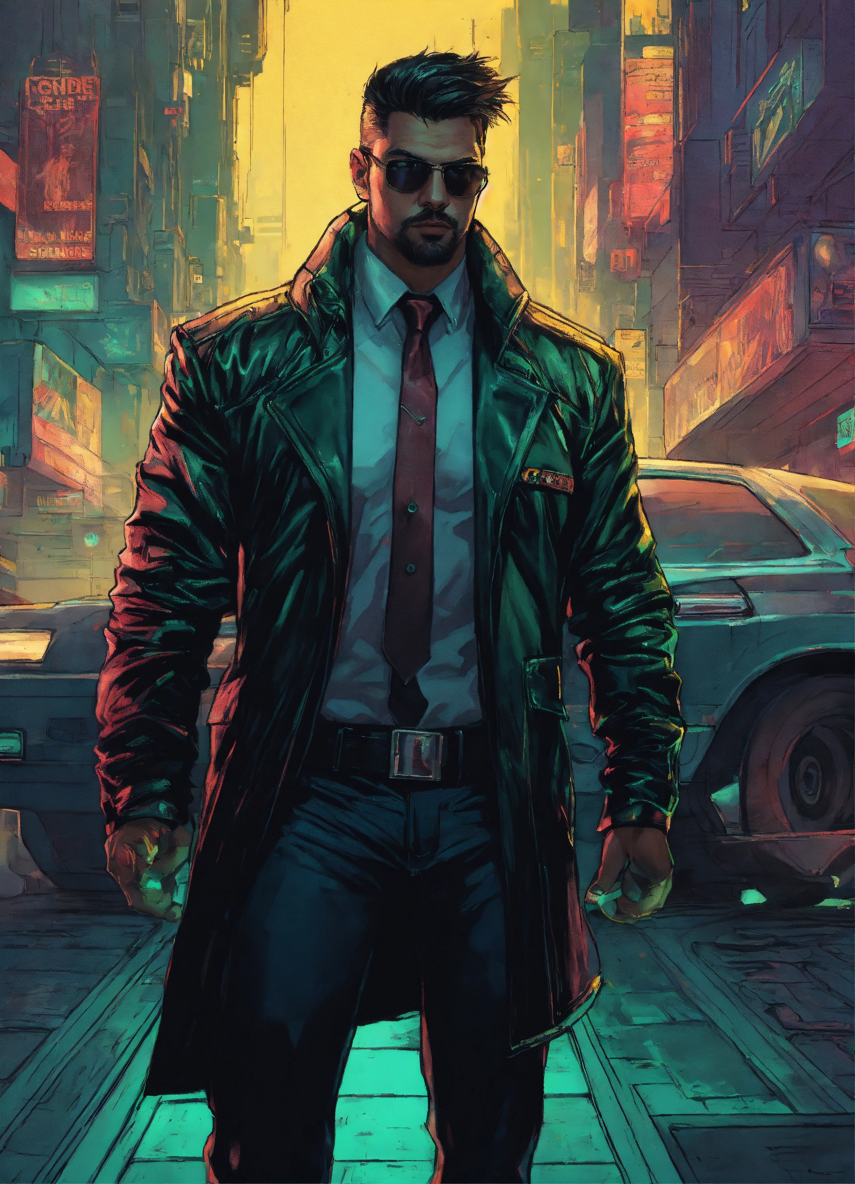 E cyberpunk mob boss wearing a leather jacket realistic comic book style art