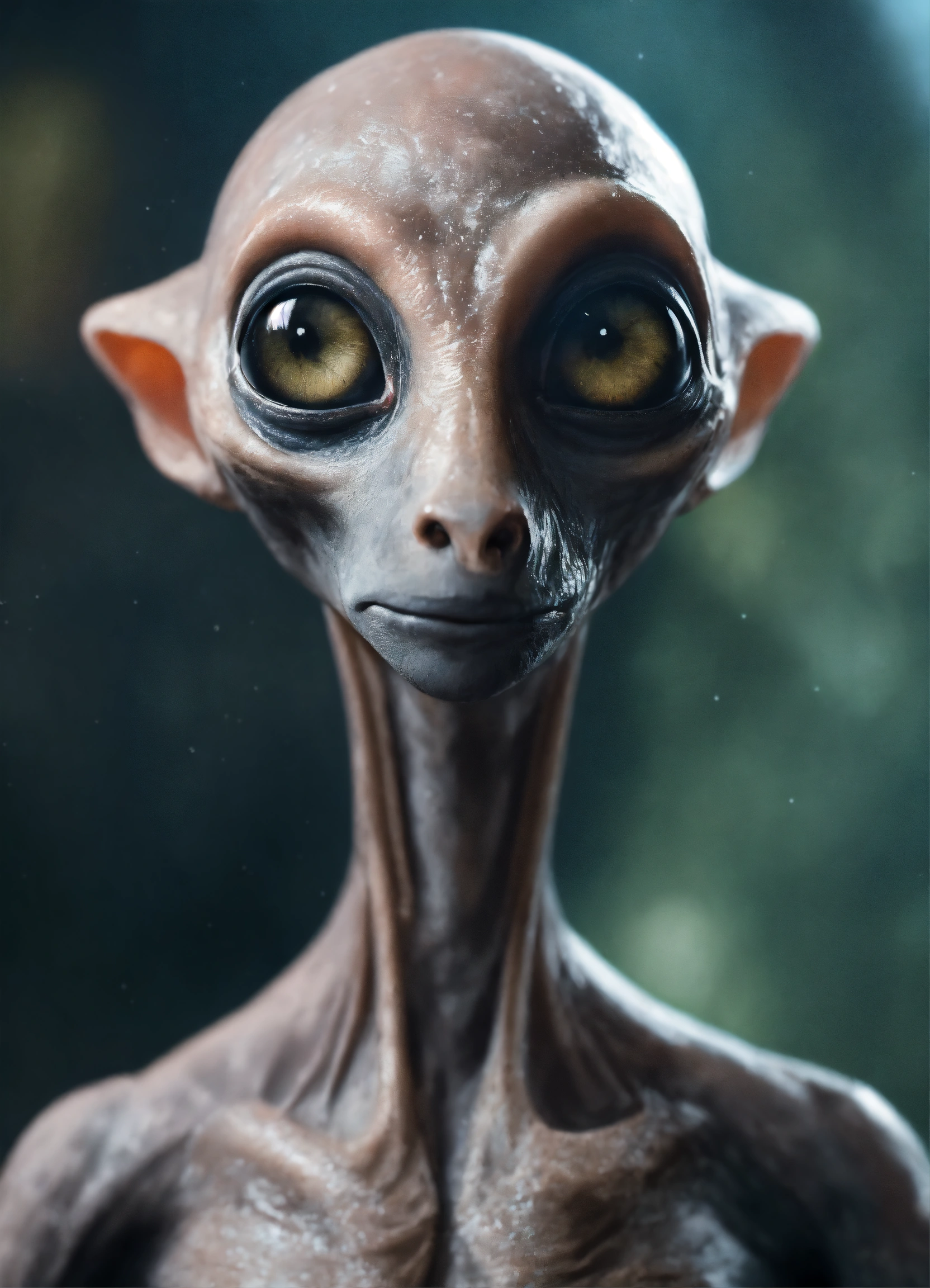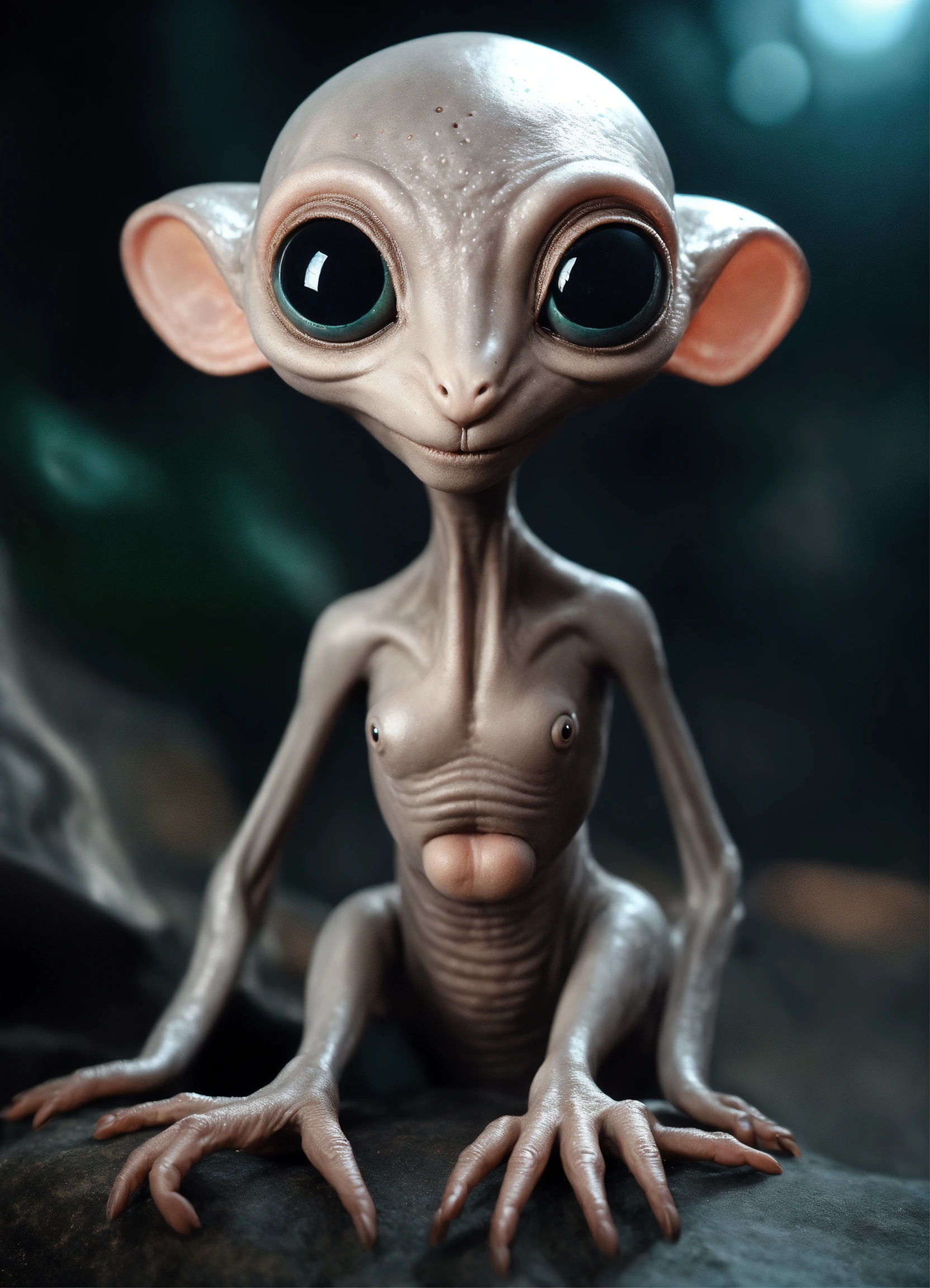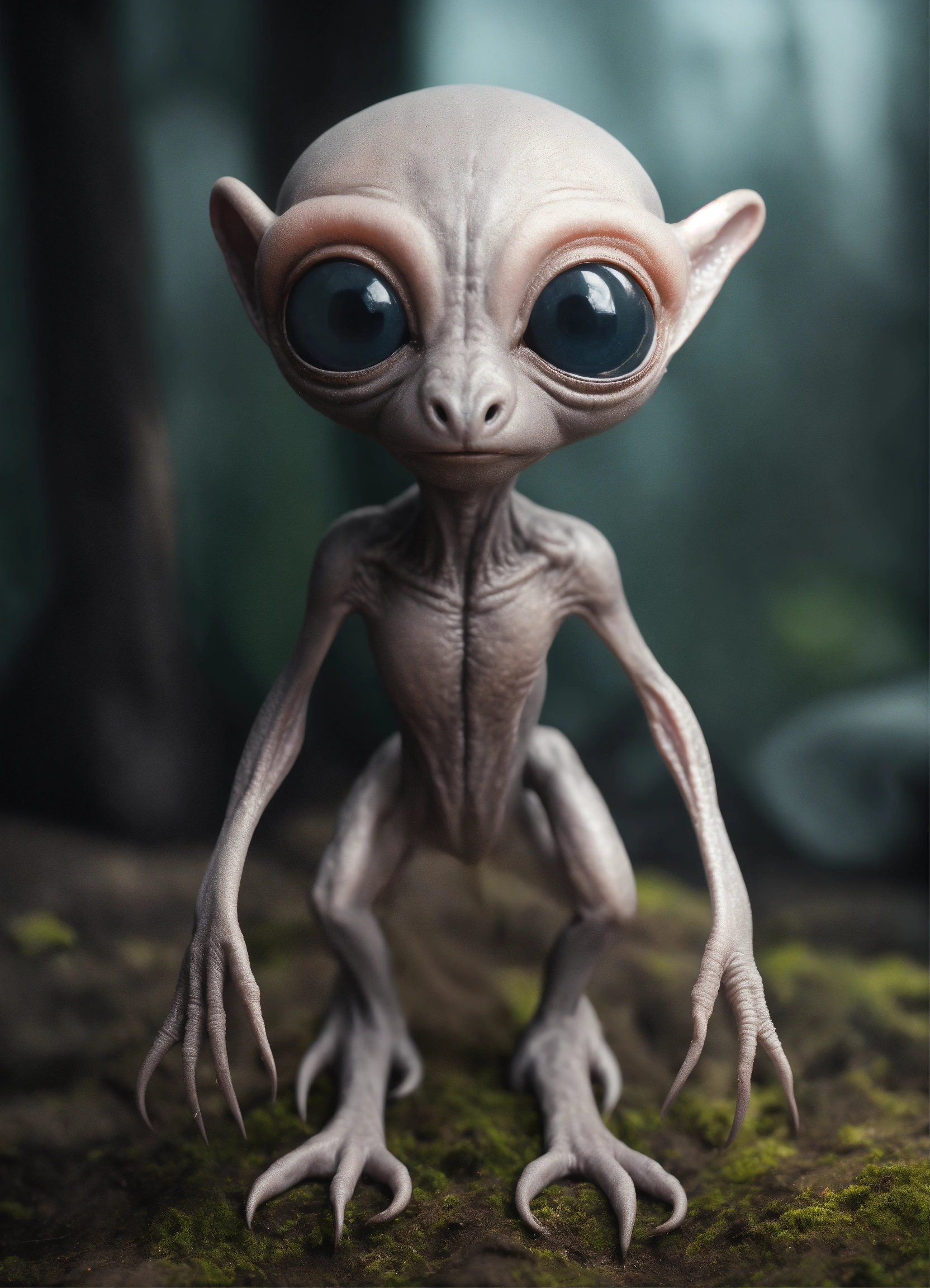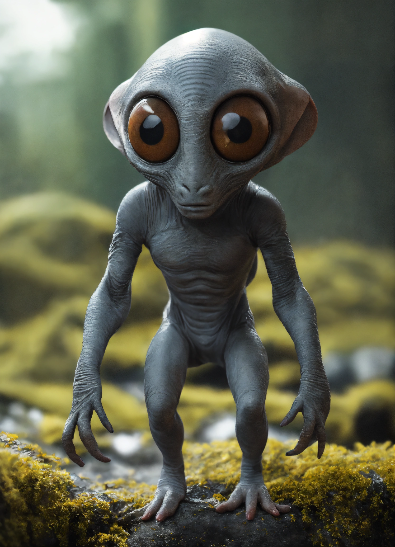 Gray alien creature with huge eyes, bald. instead of a nose there is a small gap, a mouth without lips. lop-eared. 3 fingers on each hand. full length