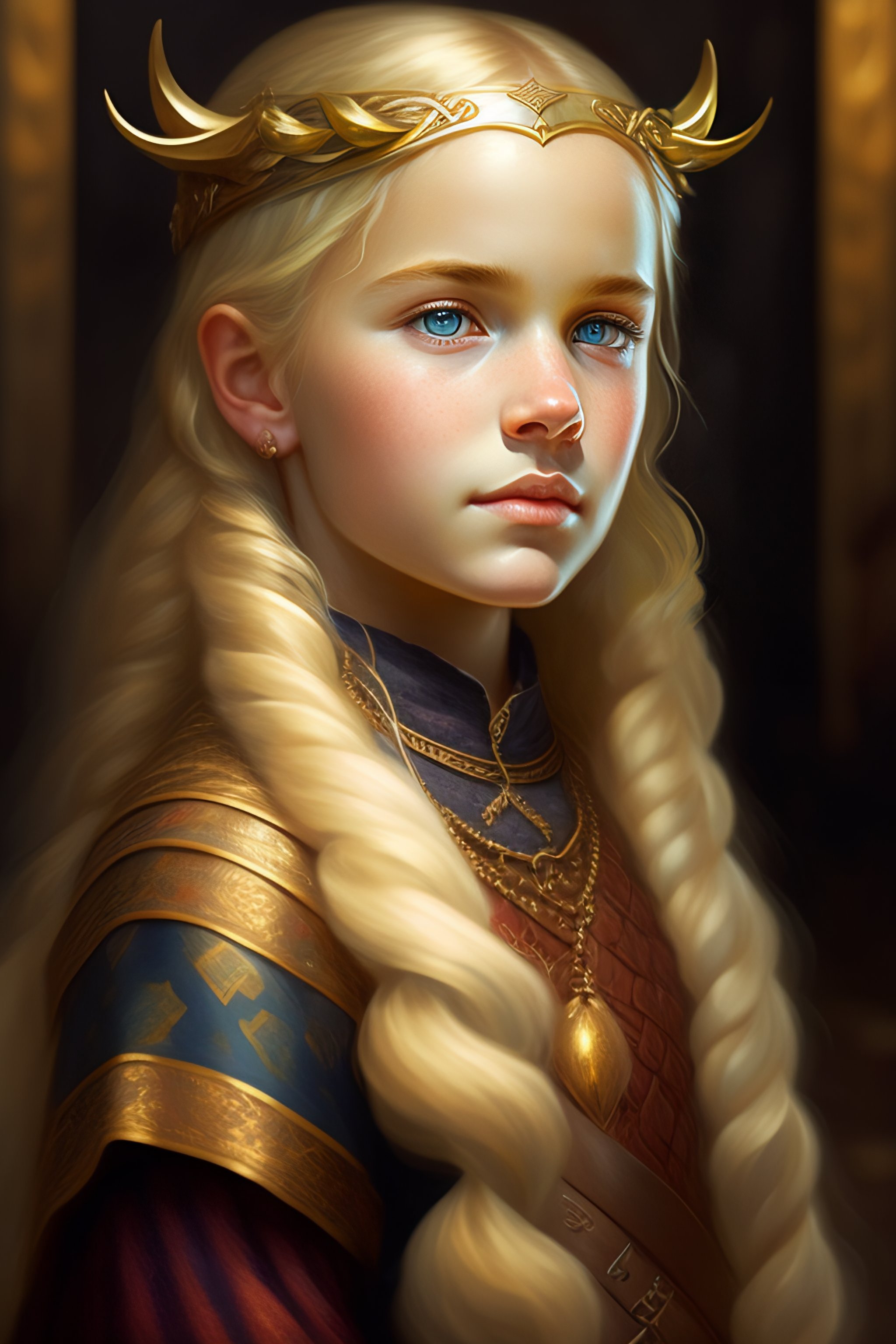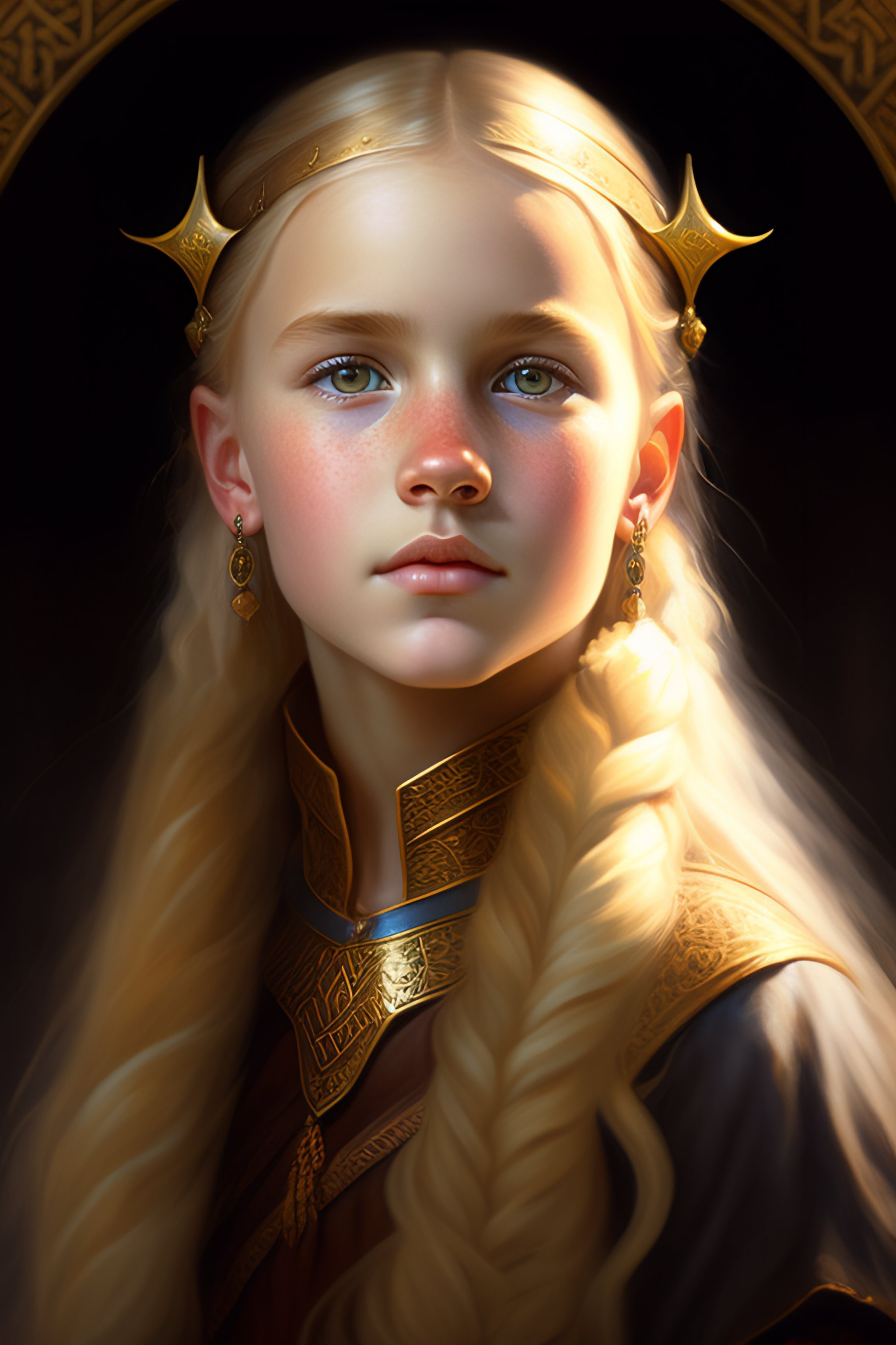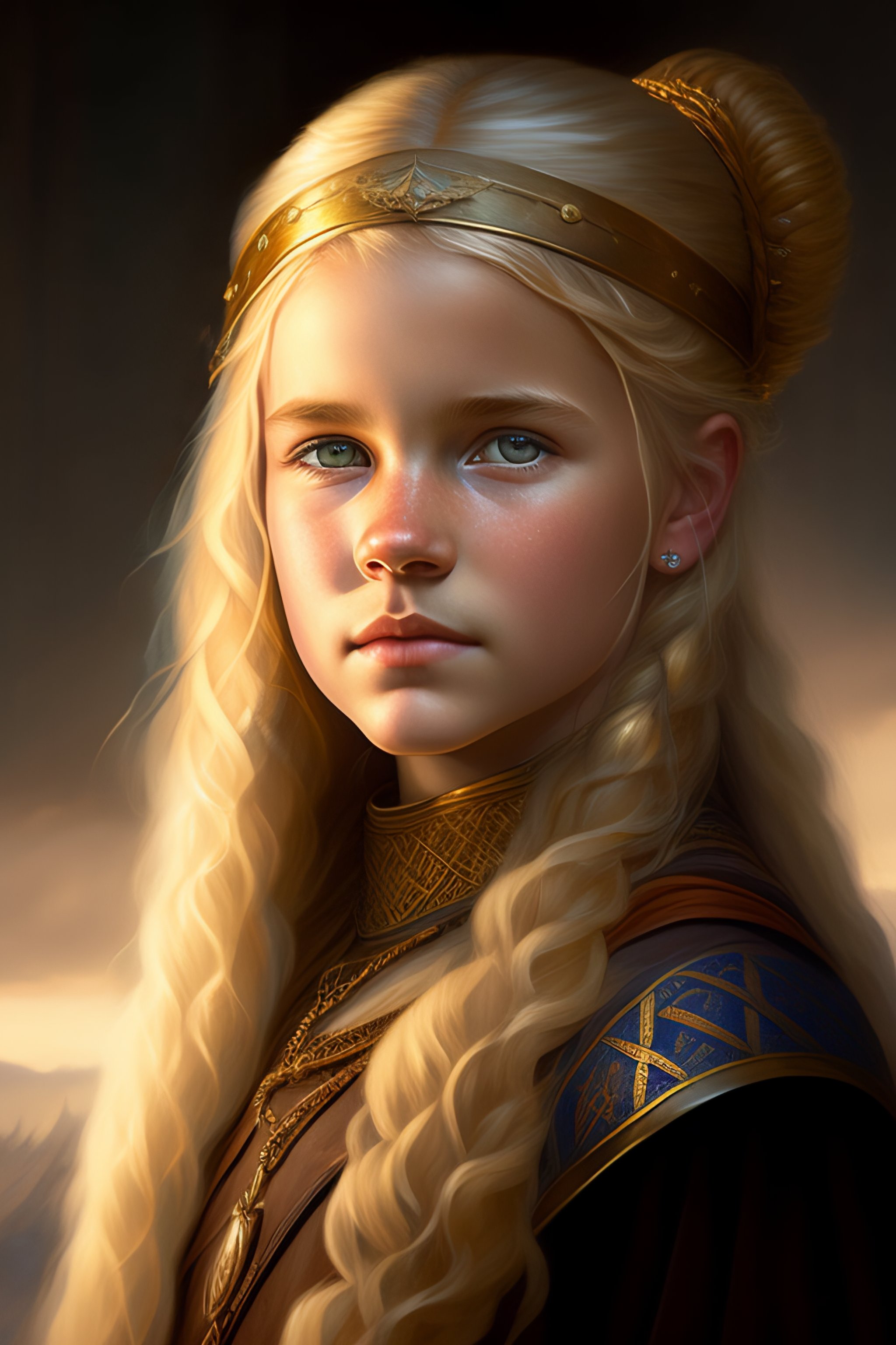 Medieval portrait of a viking young girl peasant poor child blond hair sharp features, grim, cold stare, dark colors, volumetric lighting, baroque oil painting by greg rutkowski, artgerm, wlop, alphonse mucha dynamic lighting hyperdetailed intricately detailed