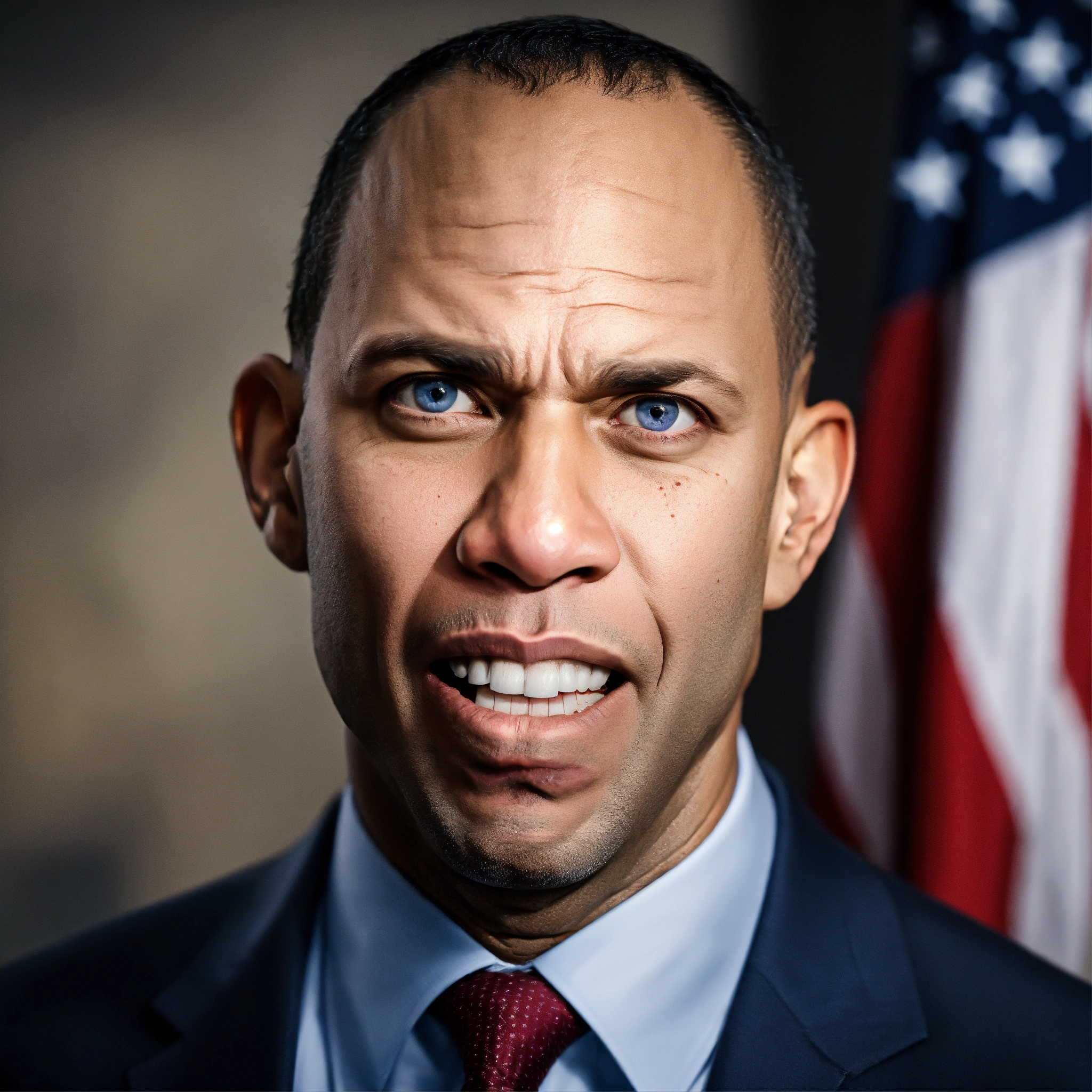 Senator hakeem jeffries light silvery blue eyes, angry, mad yelling, crooked mouth, squinting eyes, acne