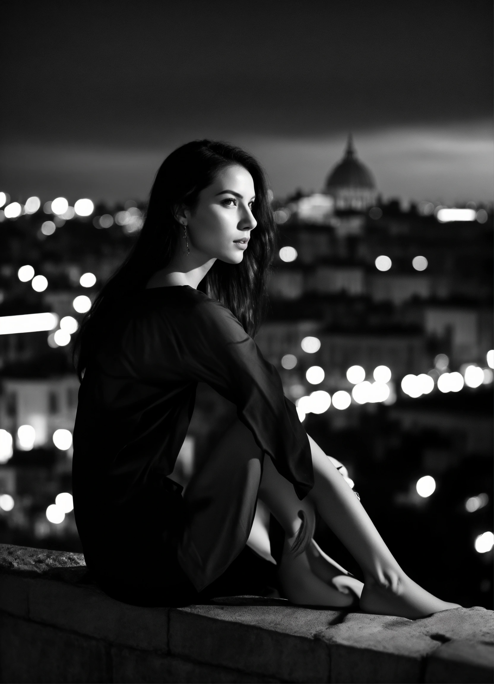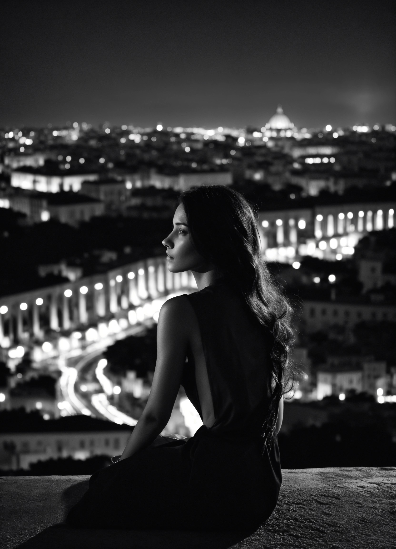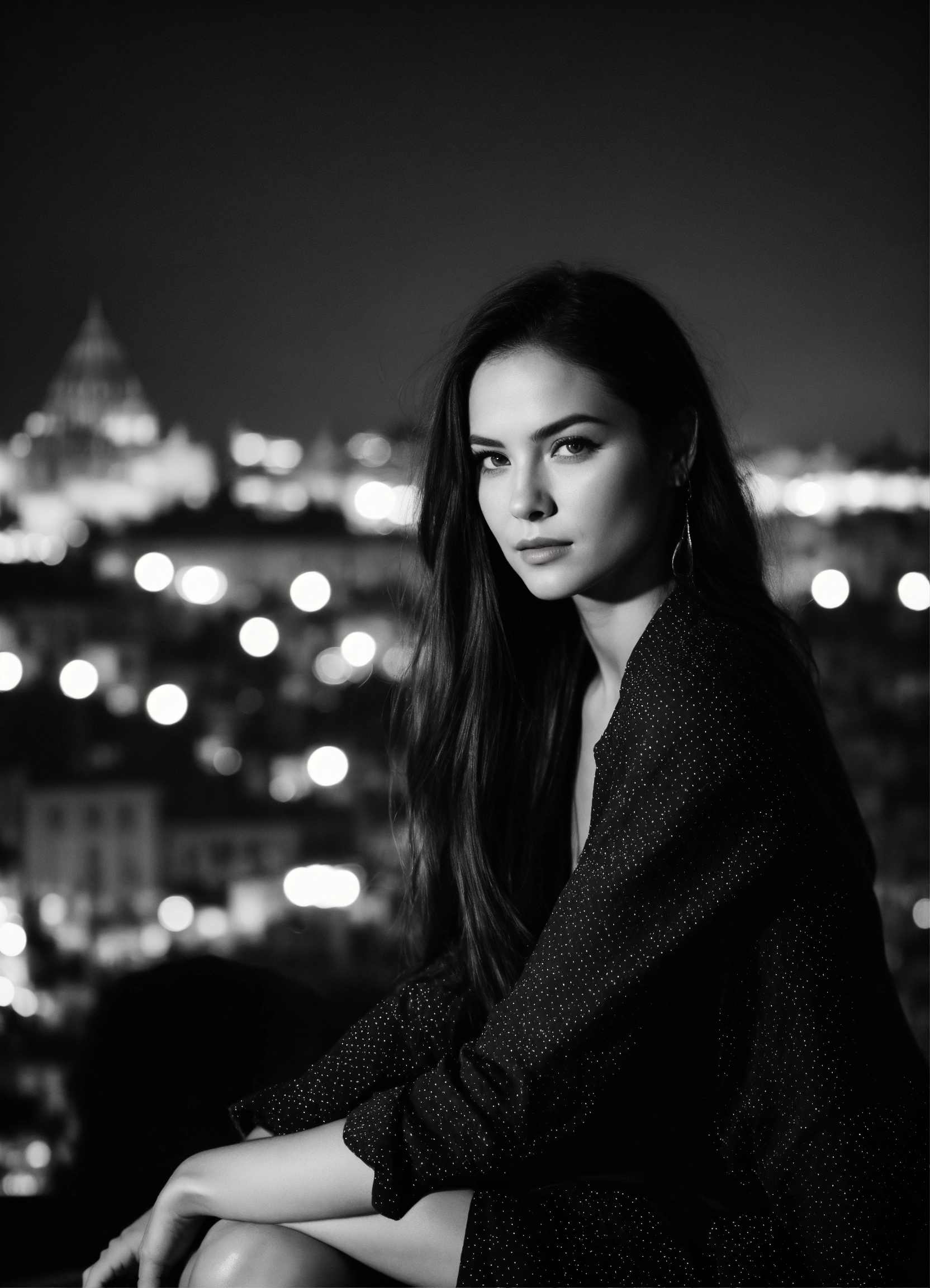 Photo of a model one women with long dark hair in passion sitting, head over shoulder looking into camera, in front of the skyline of rome head left looking in the camera in full view at night as background black and white, realistic, portrait, not painted, very detailed faces, skin with pores, 4k, dark suit, skin not smoothed, looking into the camera, dark shirt. rome skyline in full view at night as background