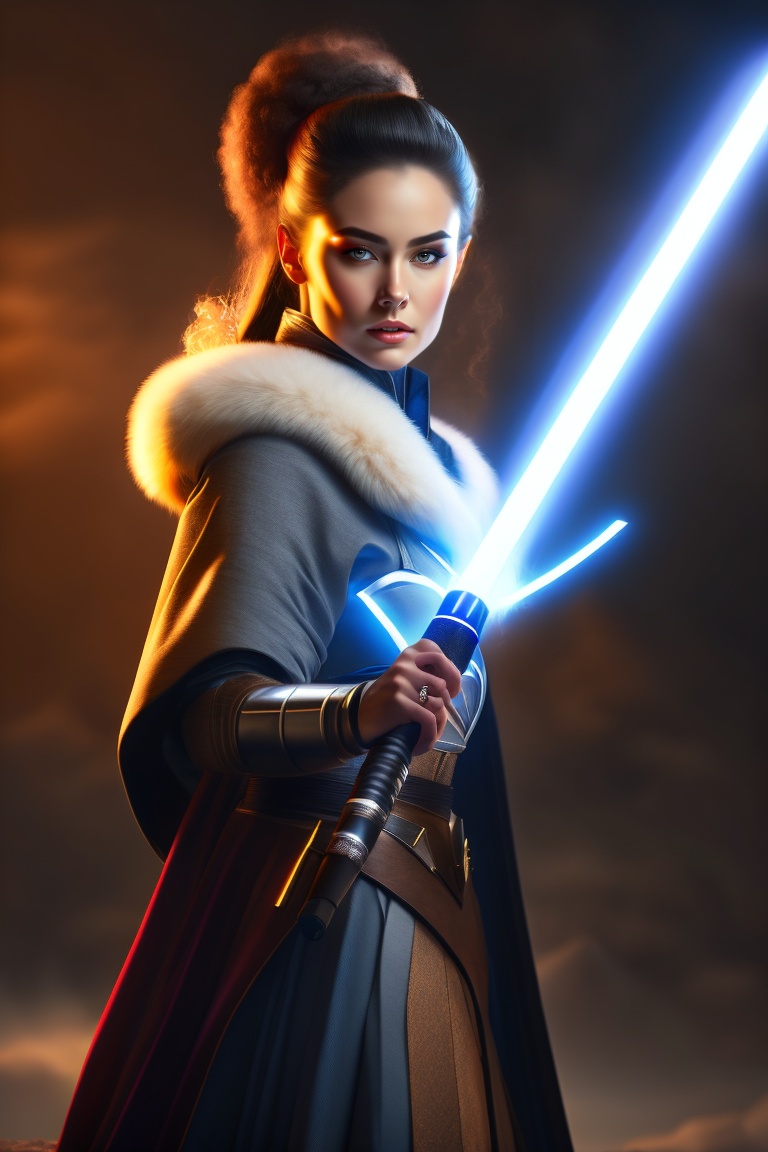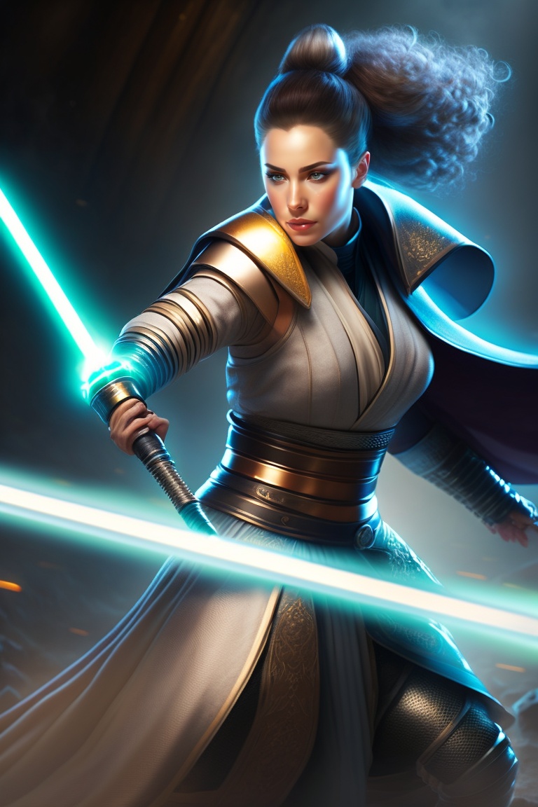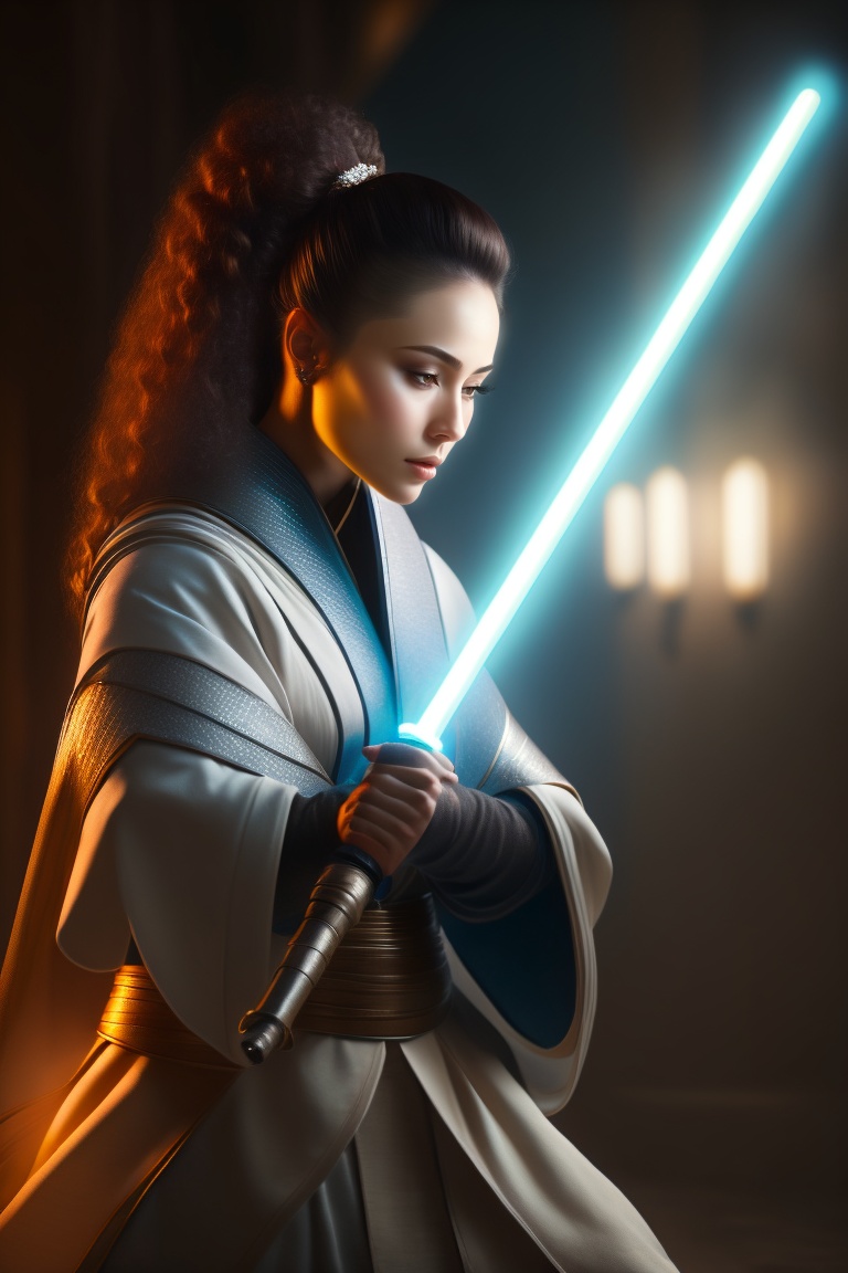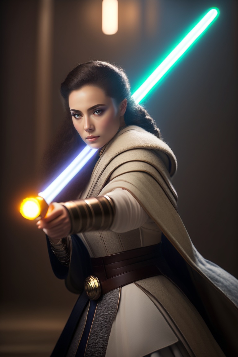 Woman jedi, using a white lightsaber, in combat pose, dramatic lighting, cinematic photography, silver hour