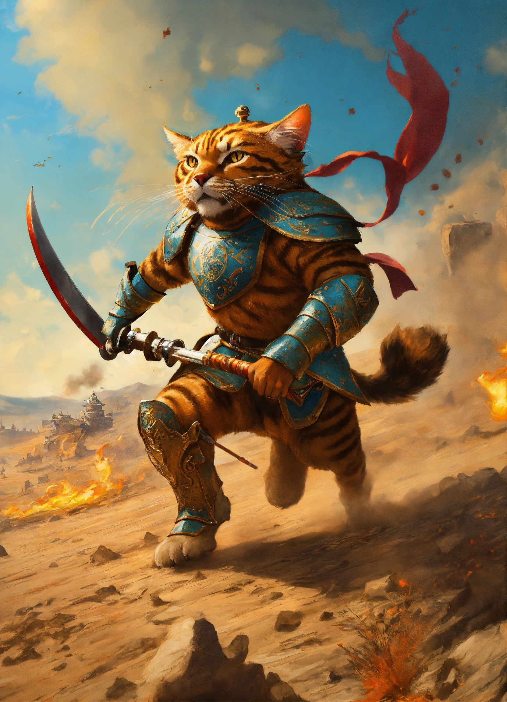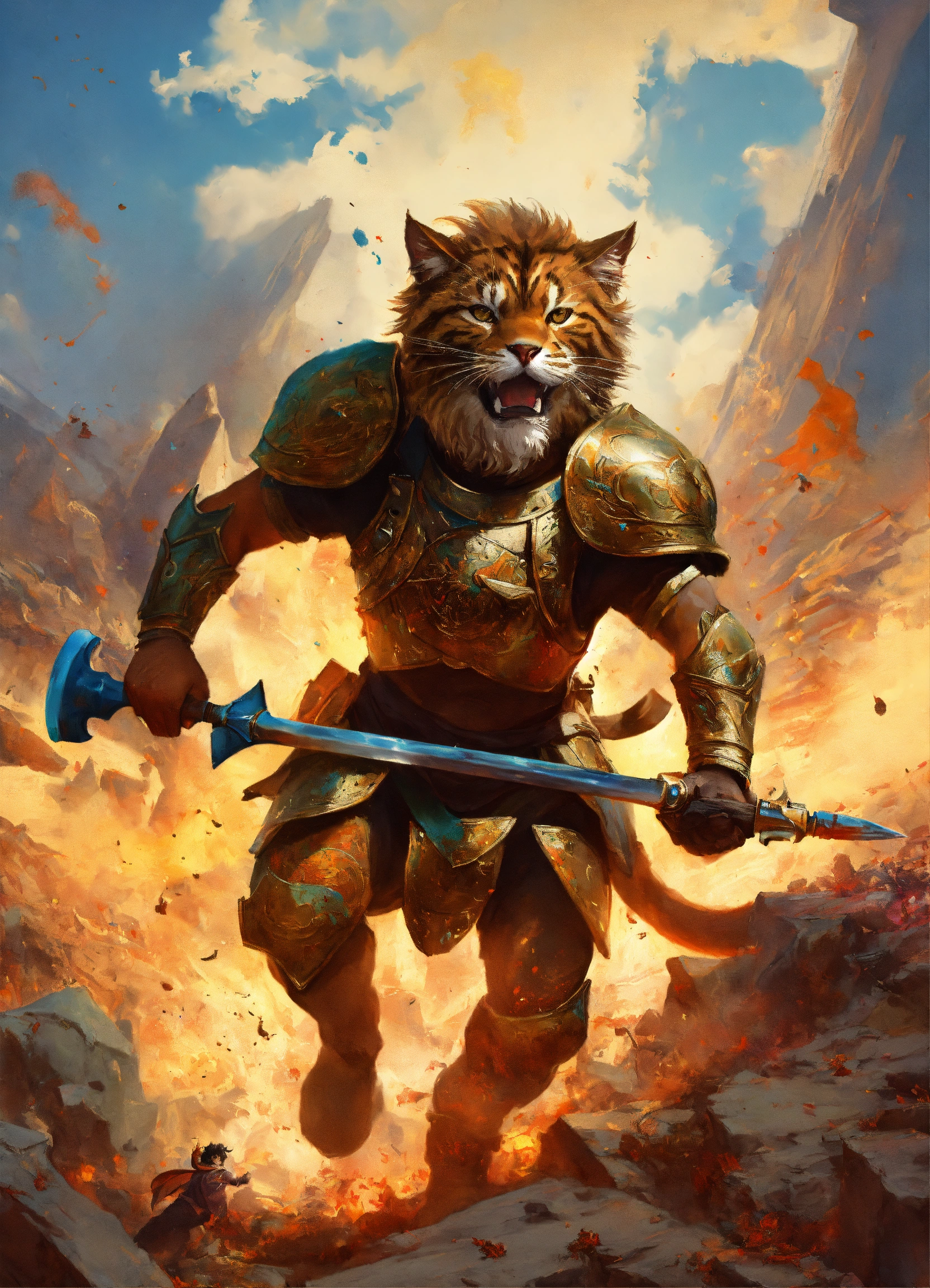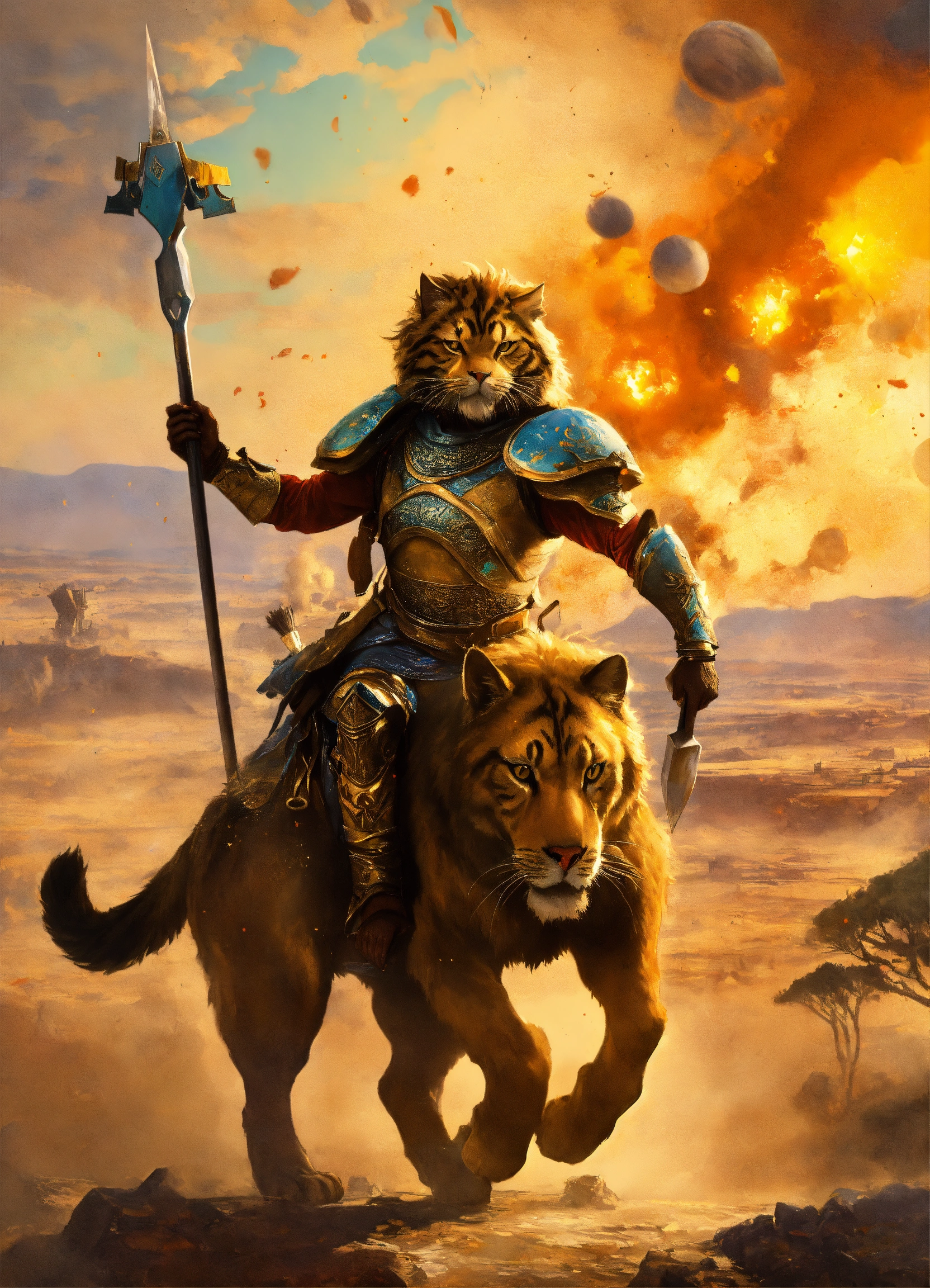 A battle cat wearing armor, running across a battlefield. peter dinklage riding on top of the cat, action shot, gladi-art-tor african, a male artist fights against a large paint pot, african modern warrior artist, he carries a large paintbrush as a weapon, beautiful matte realistic painting of a of a fantasy landscape, african sculptor, african sculptor, a man carving wood, surreal enigma, creative, surrealism, imaginative, paint splatter, ripped canvas