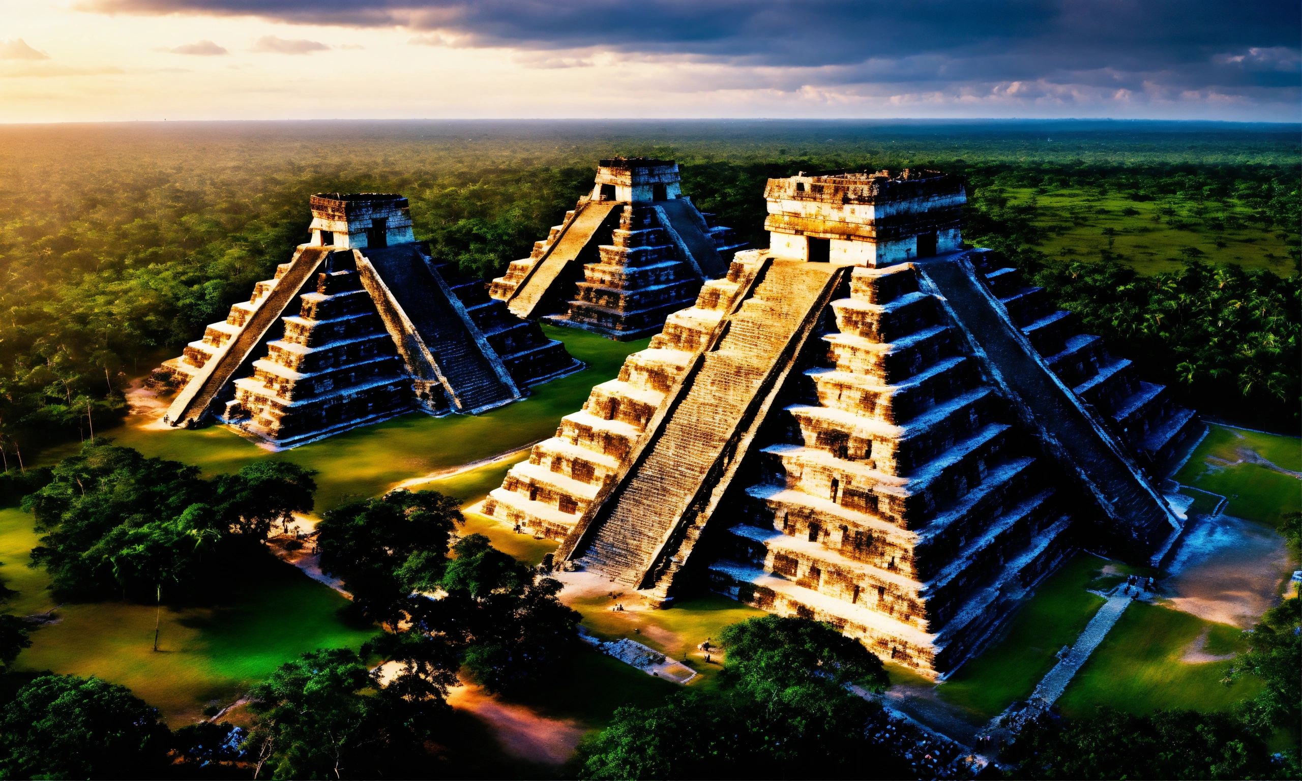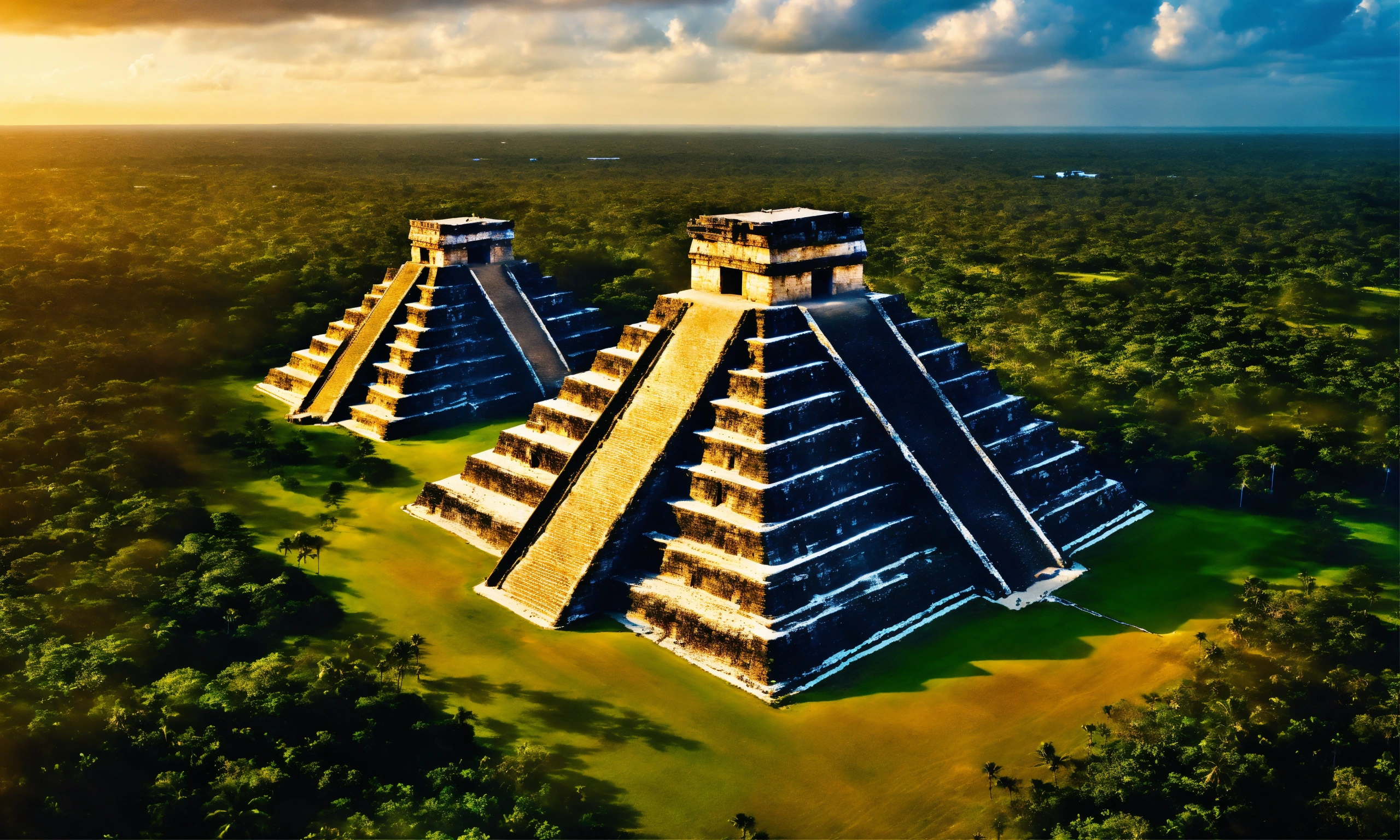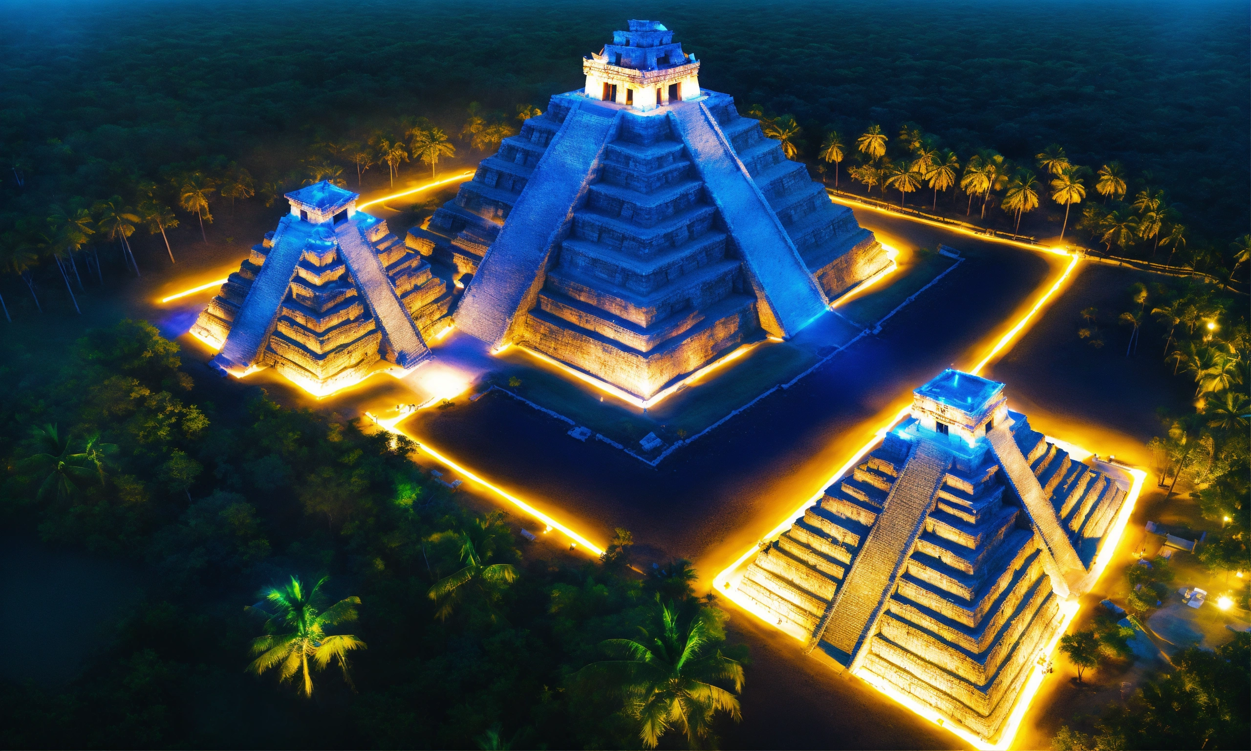 Aerial view of three mayan pyramids connecting the top of each other with a ray of blue light