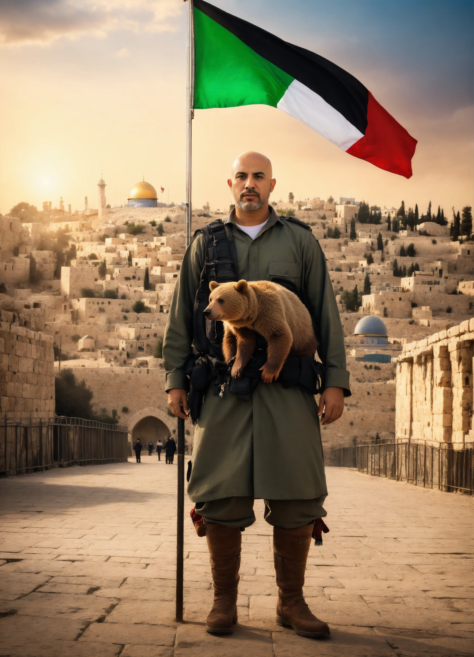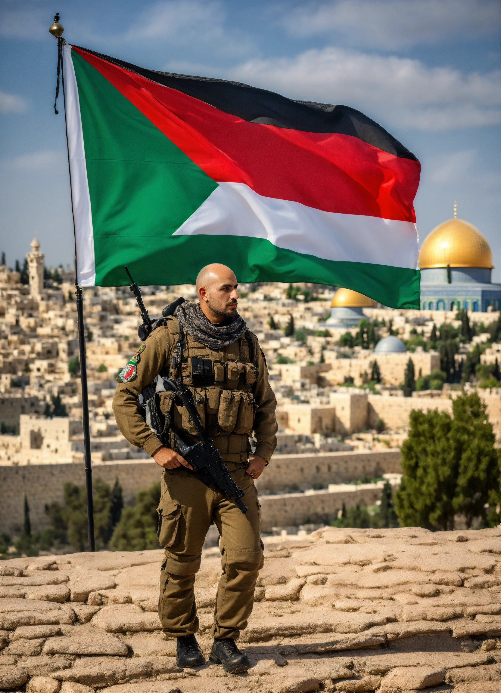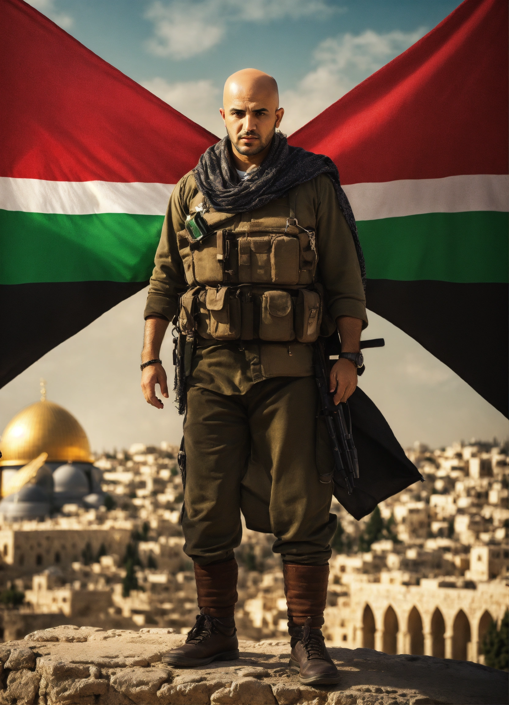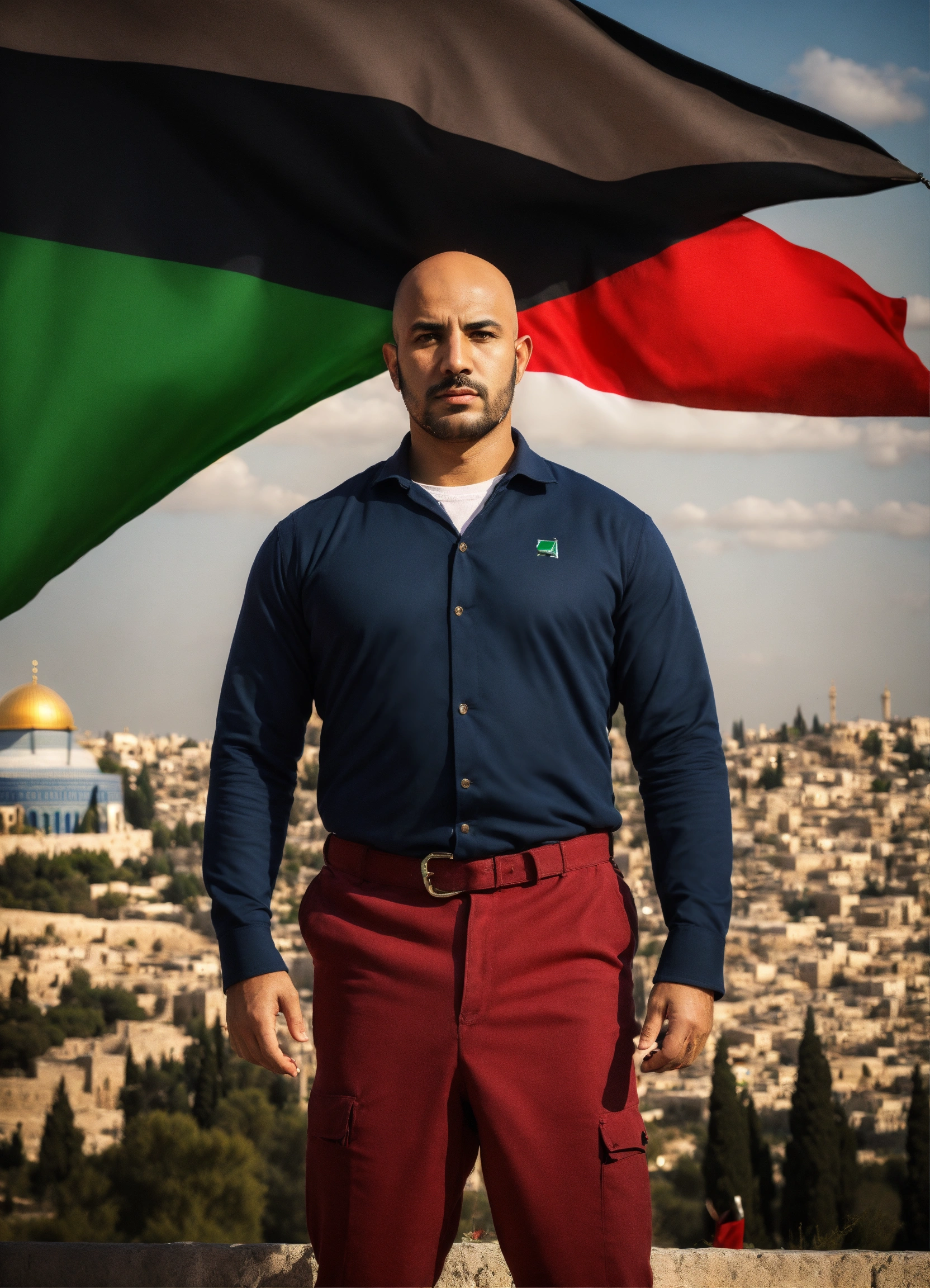 Epic, bald, palestinian, 4k, full body, jerusalem, holyland background, palestinian flag, full body, bear chested