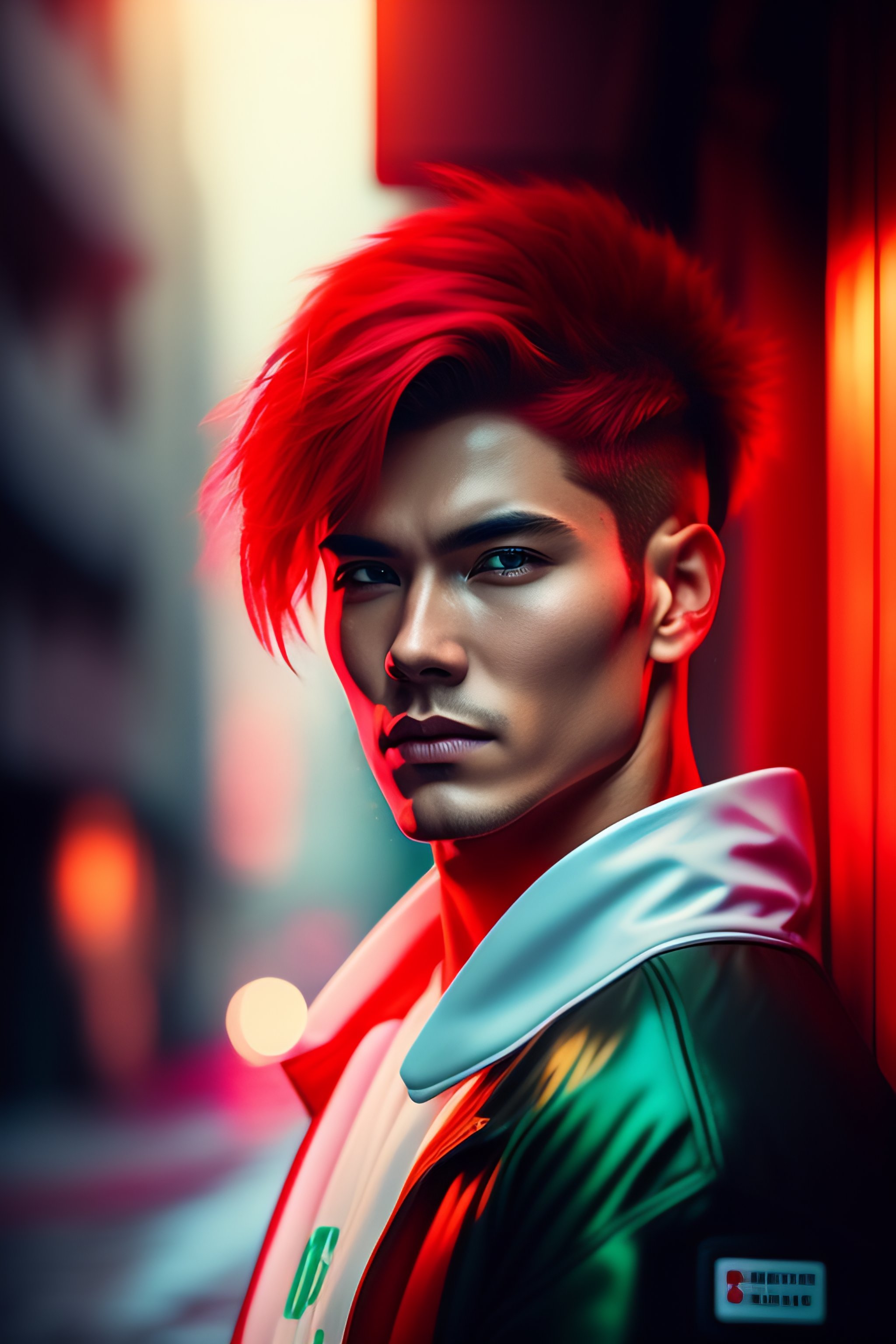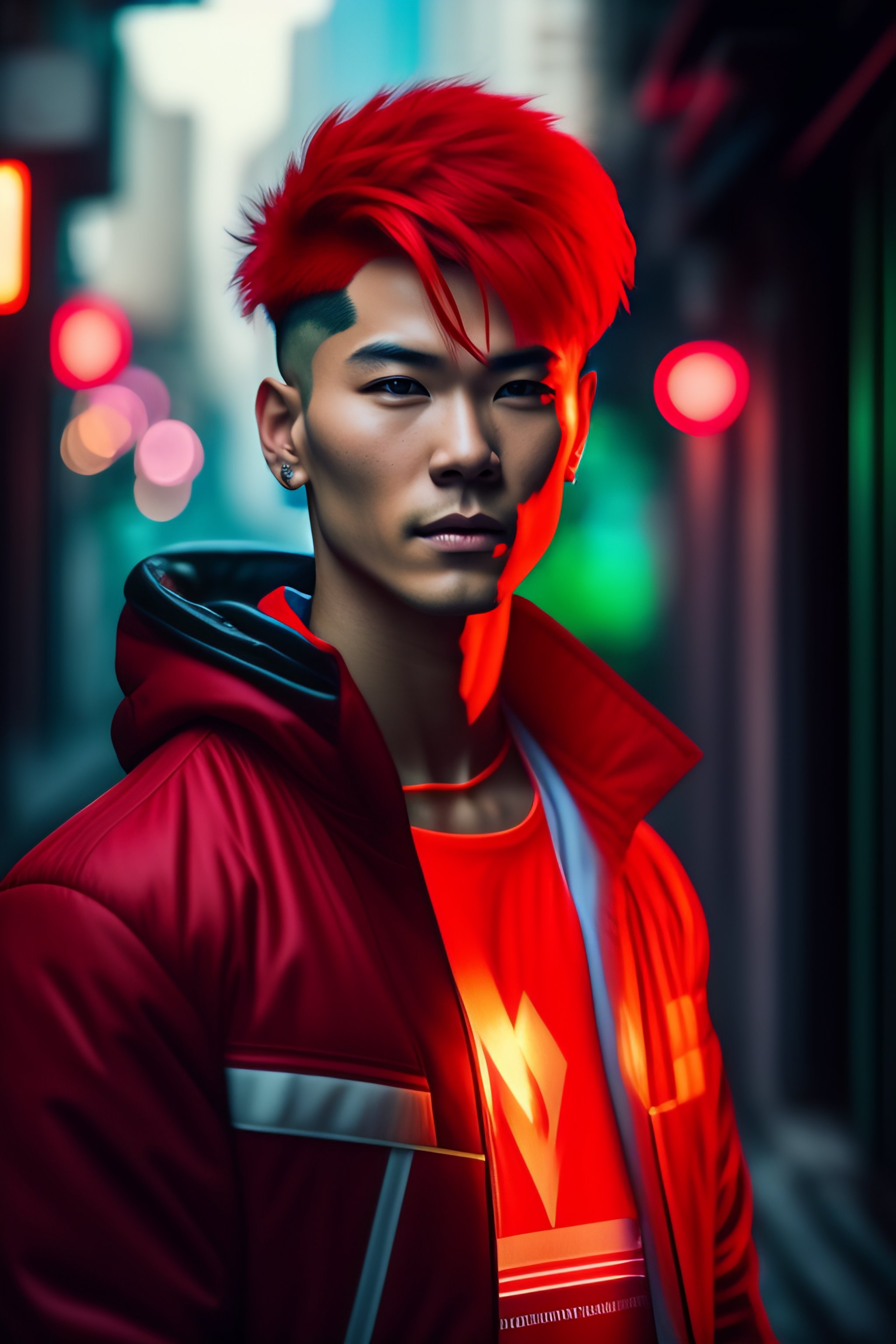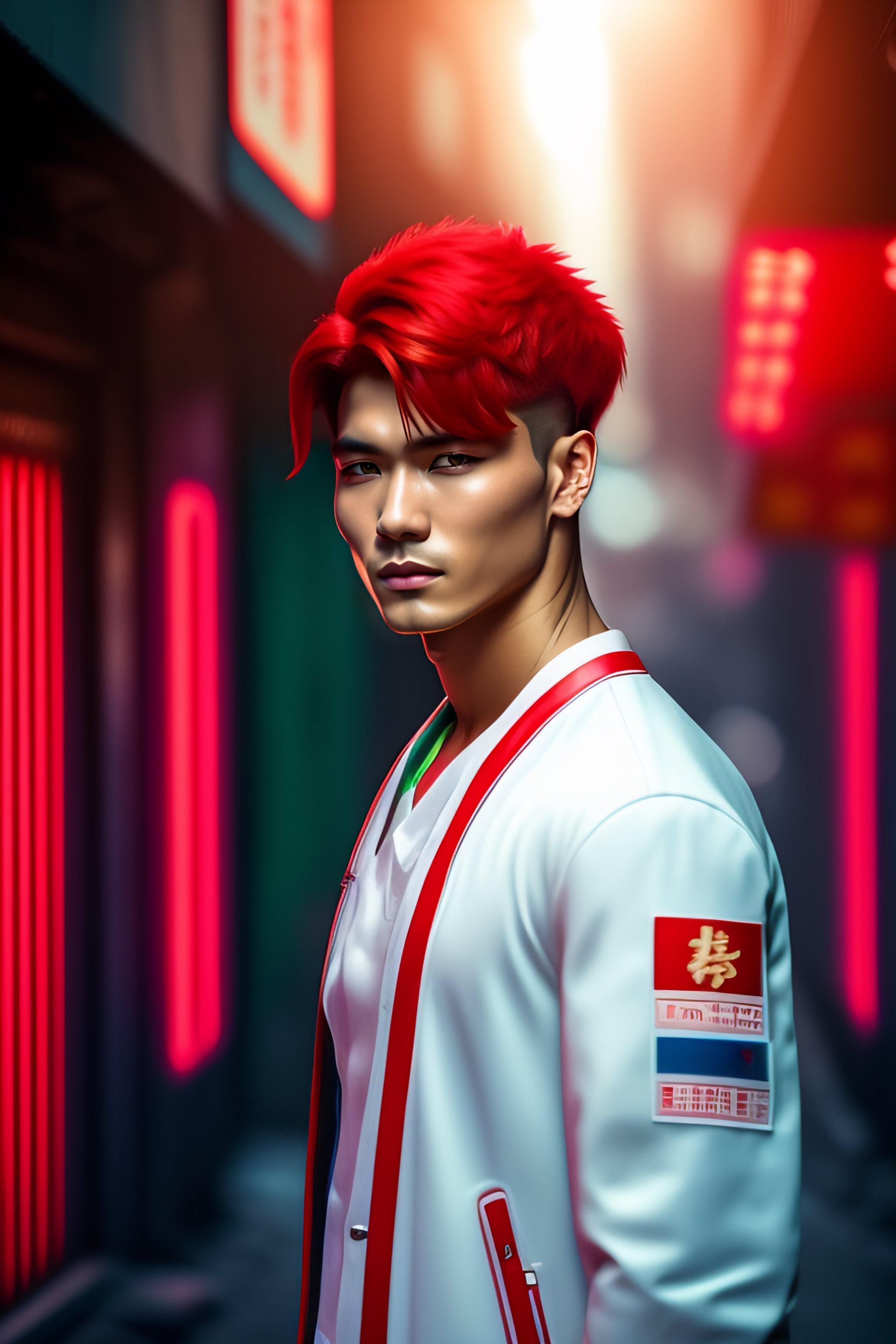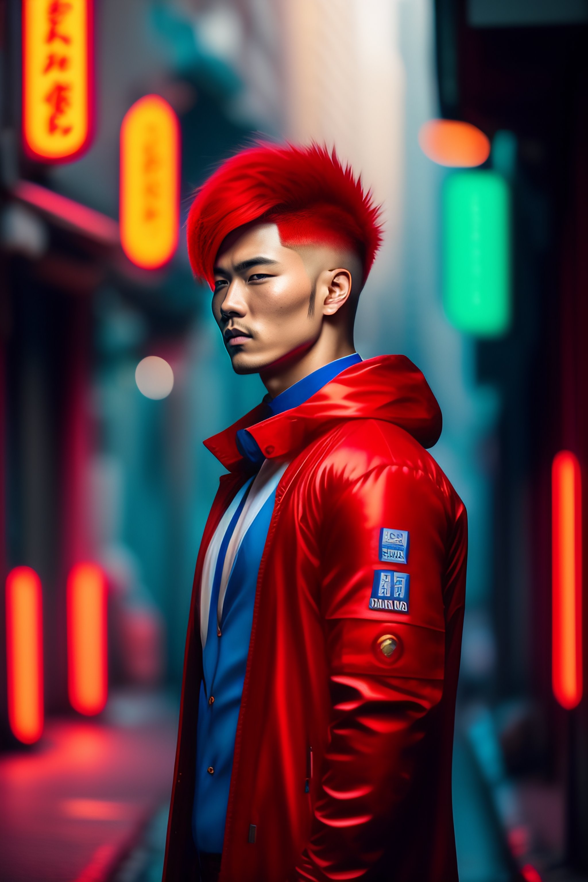Effeminite guy, white medical patch on one eye, red hair, red side ponytail, in red long cloth, in a dark narrow alley, kowloon walled city, cold light, blue and green light, darkwave, dynamic scene, anime style, 8k, hd