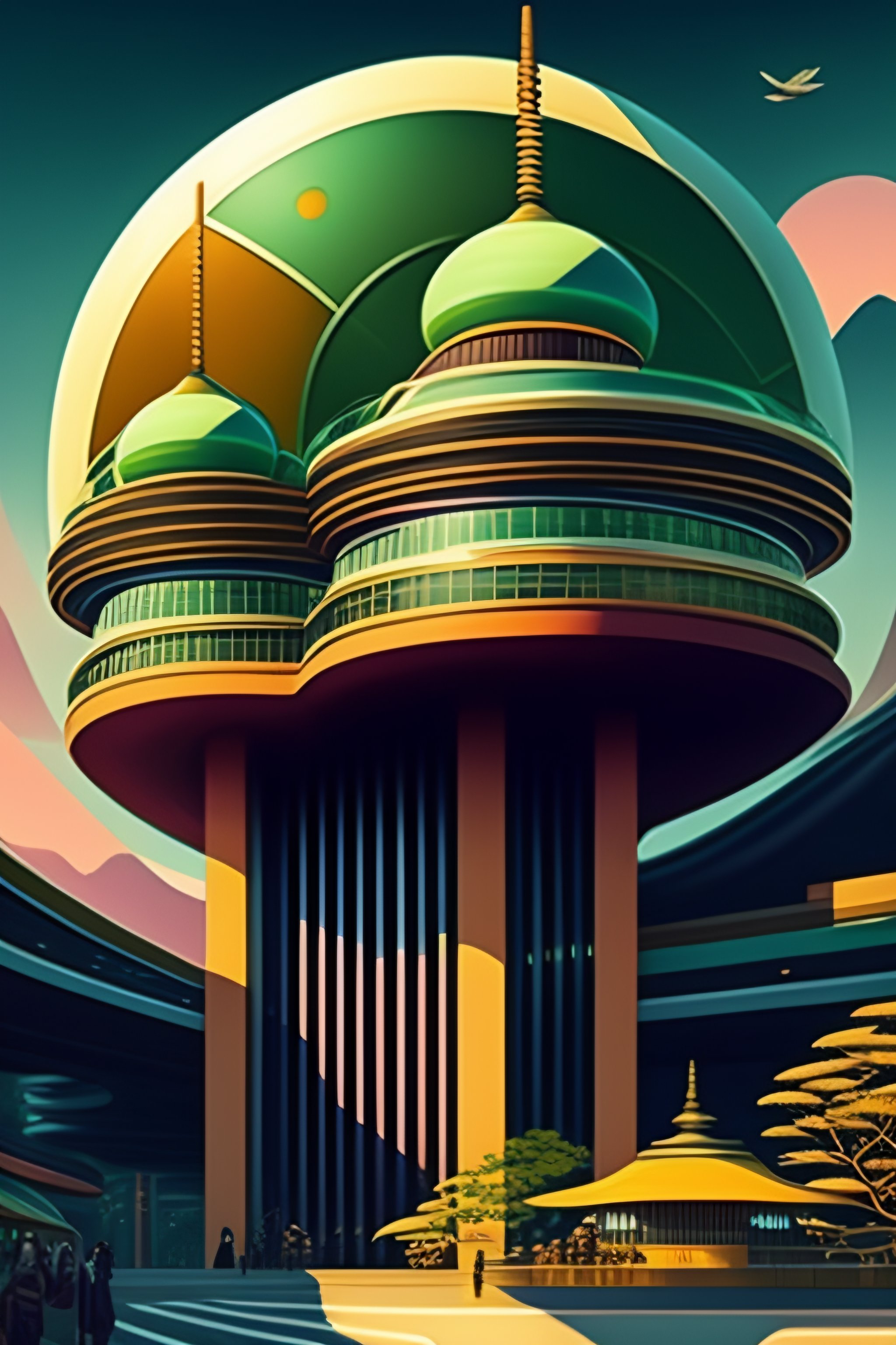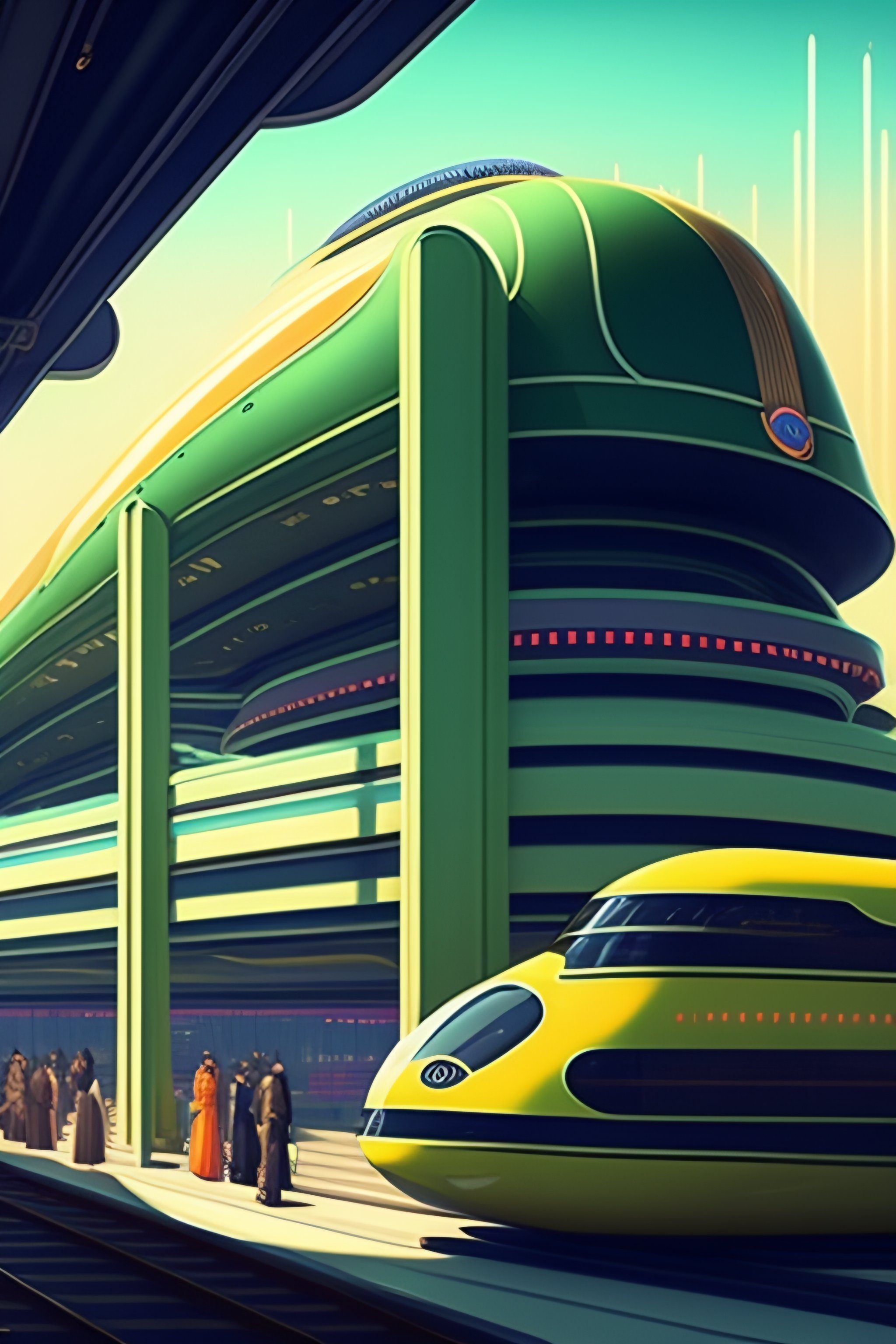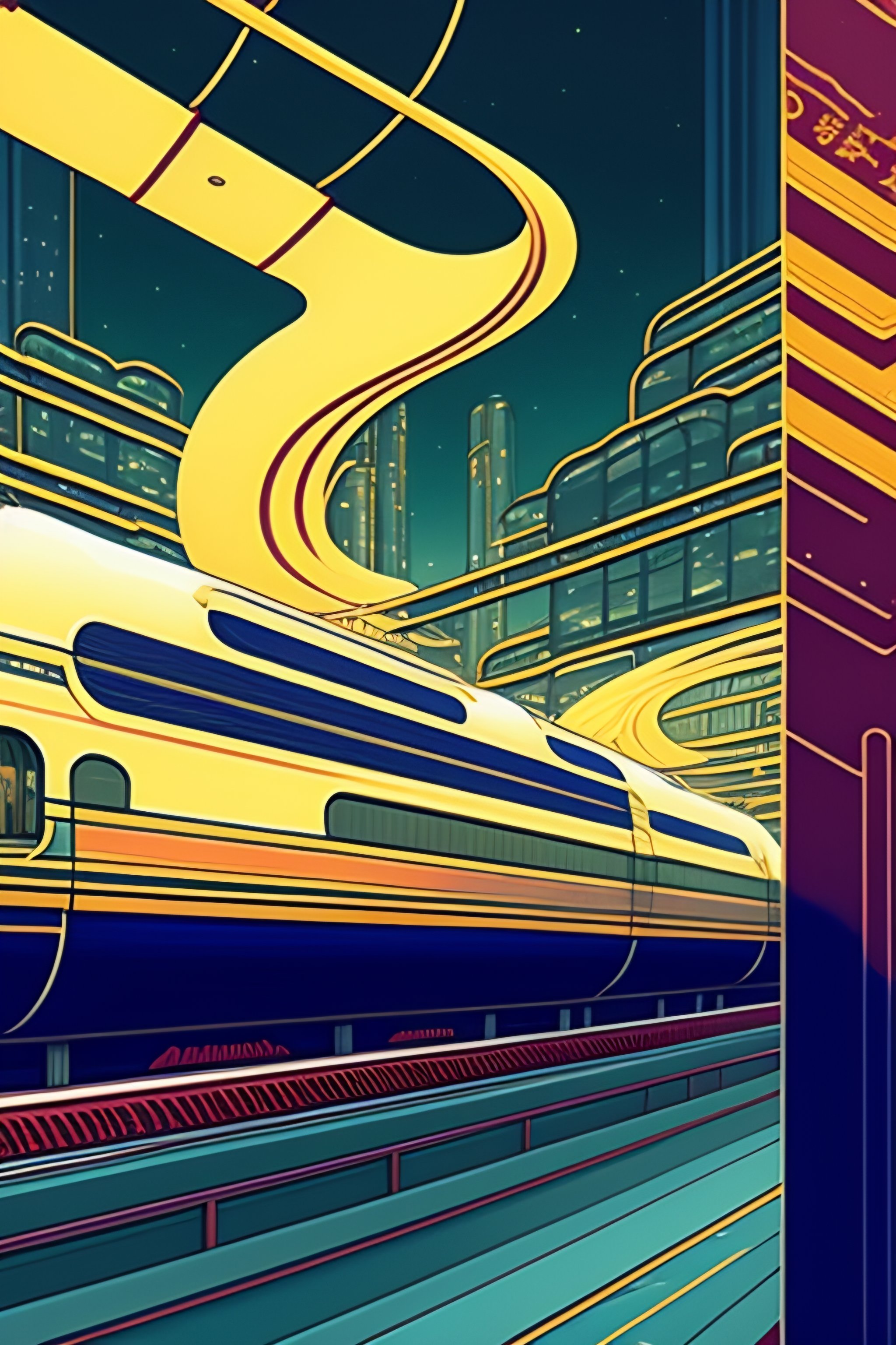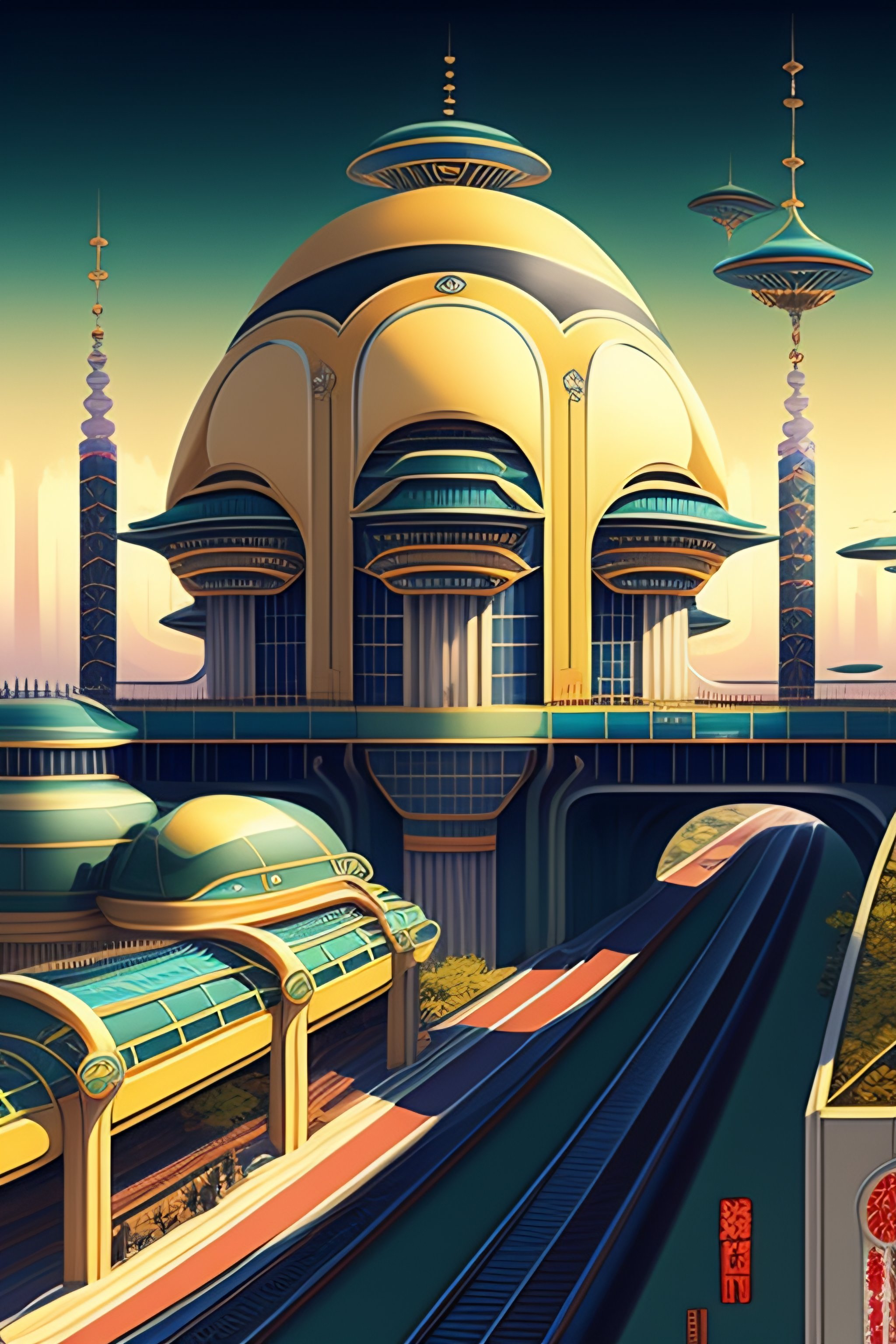 Art deco art nouveau ukiyo-e solarpunk futurisitc city with high speed rail, lots of people and lots of plants